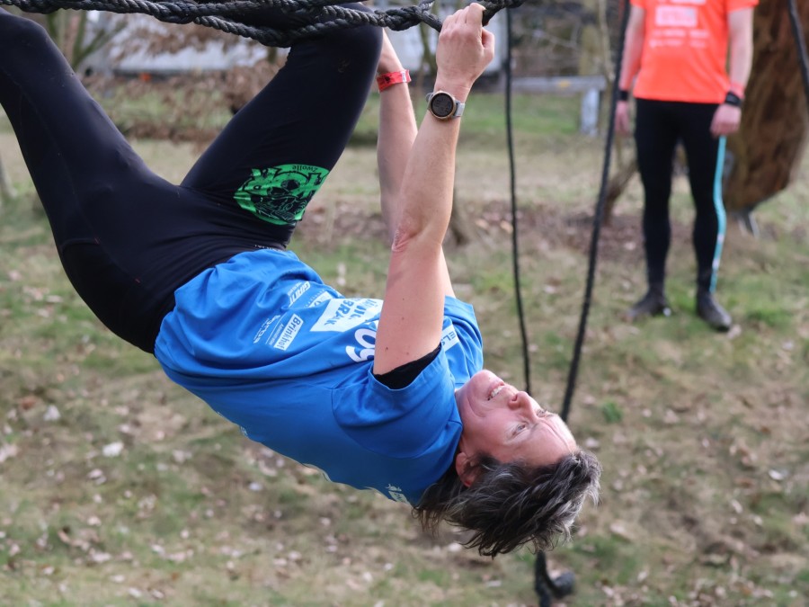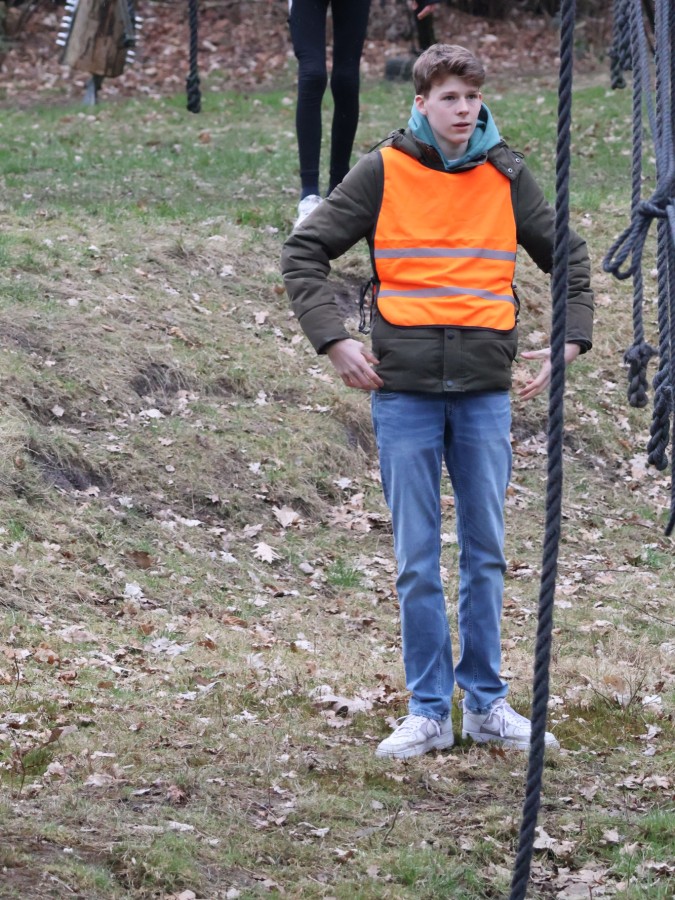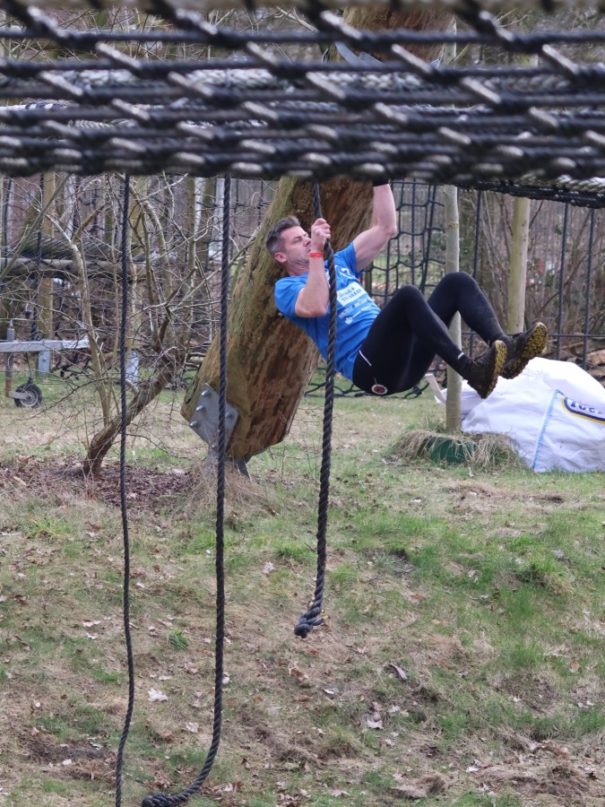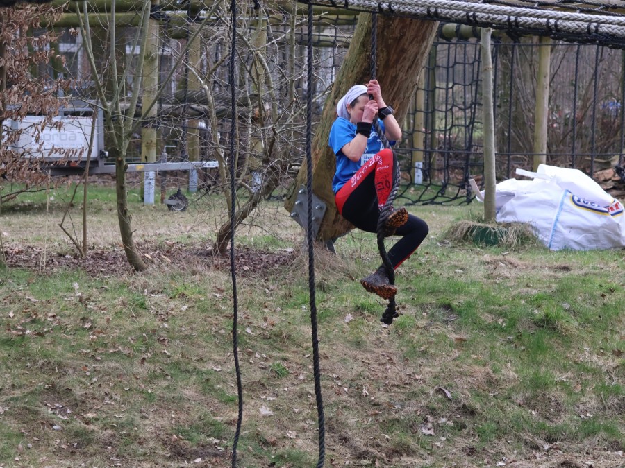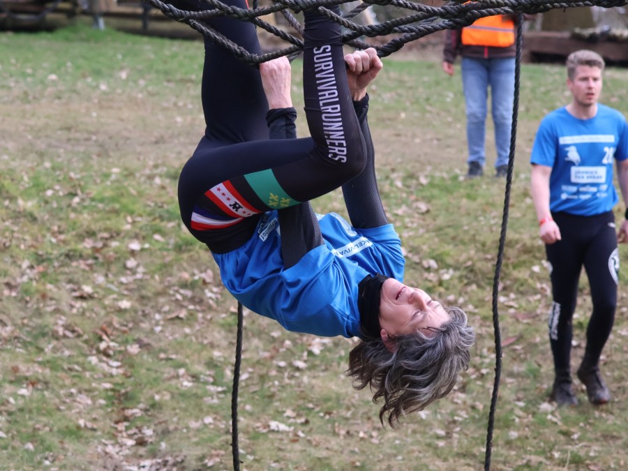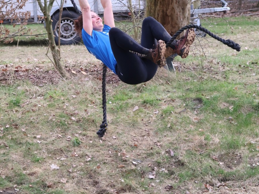 Aangekomen bij de apenhang gaan de deelnemers over in apenhang tot ze bij het uitklimtouw komen.