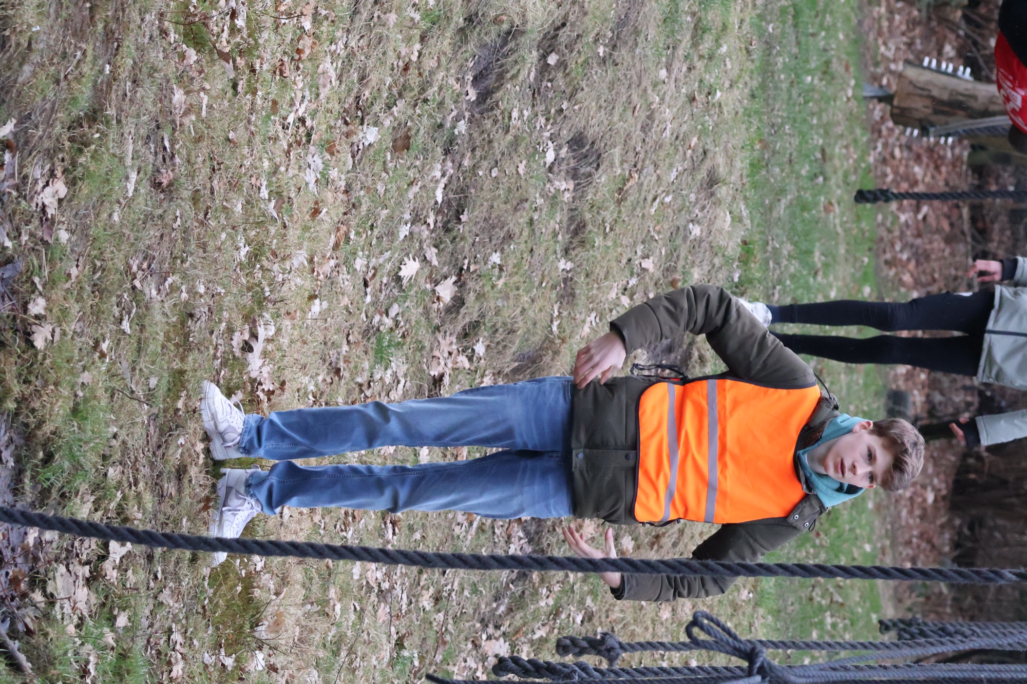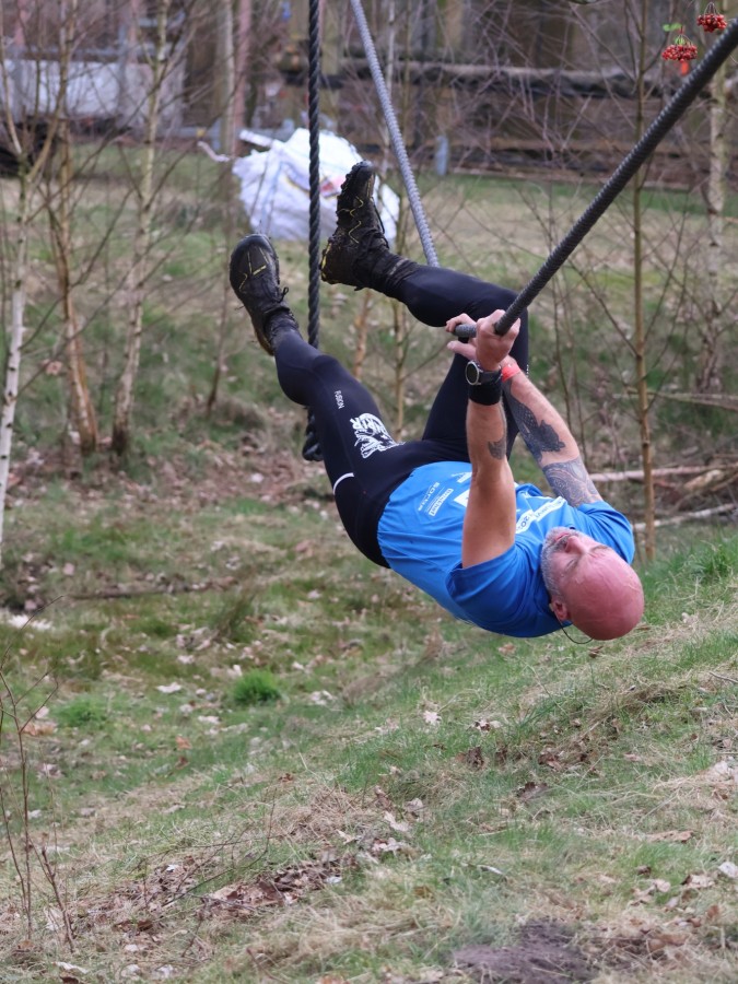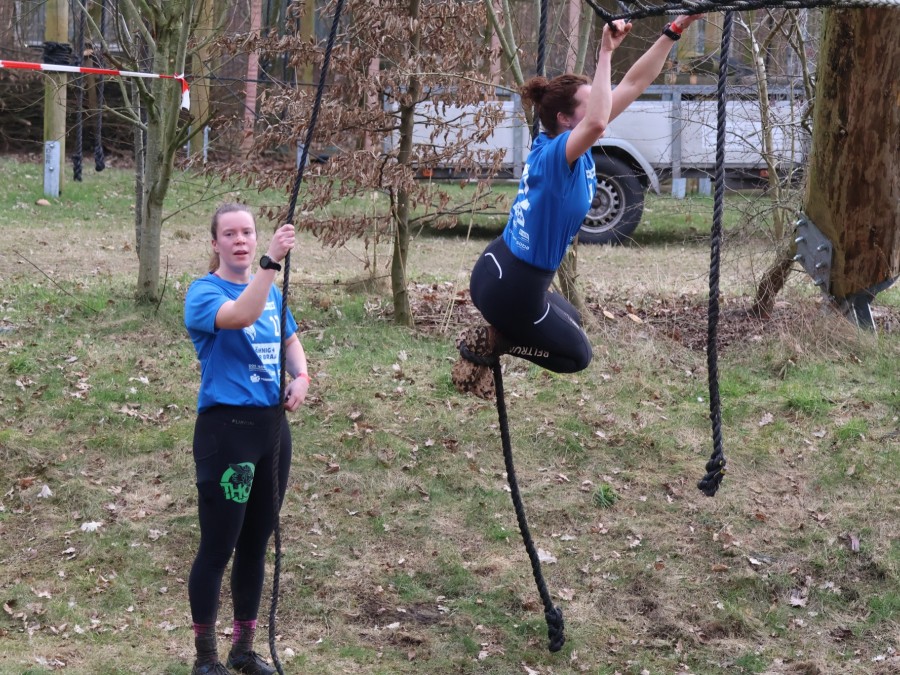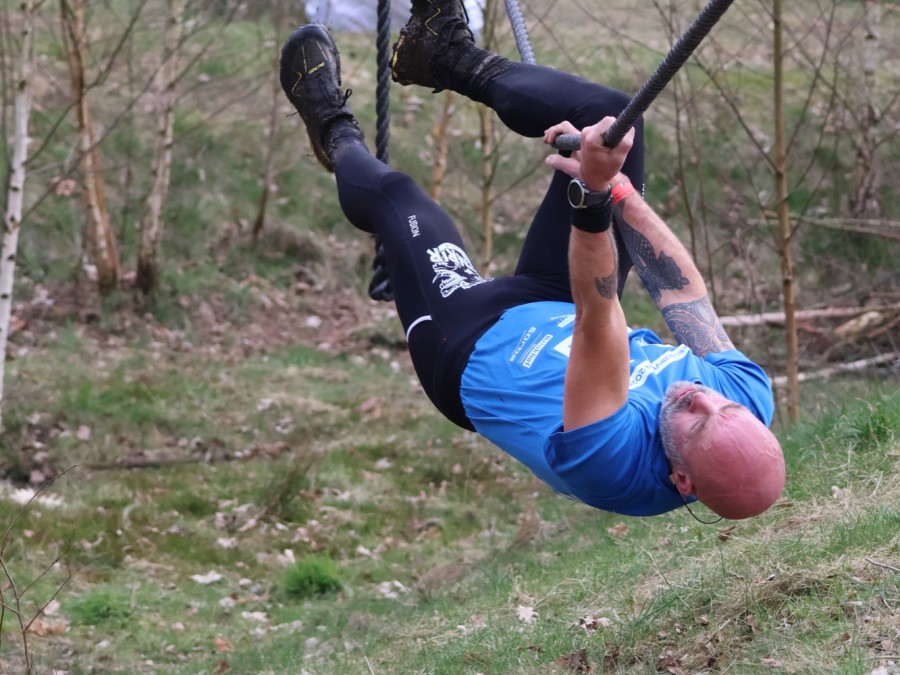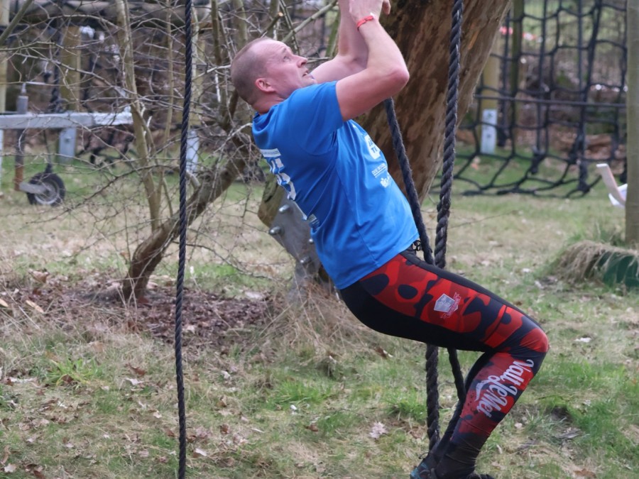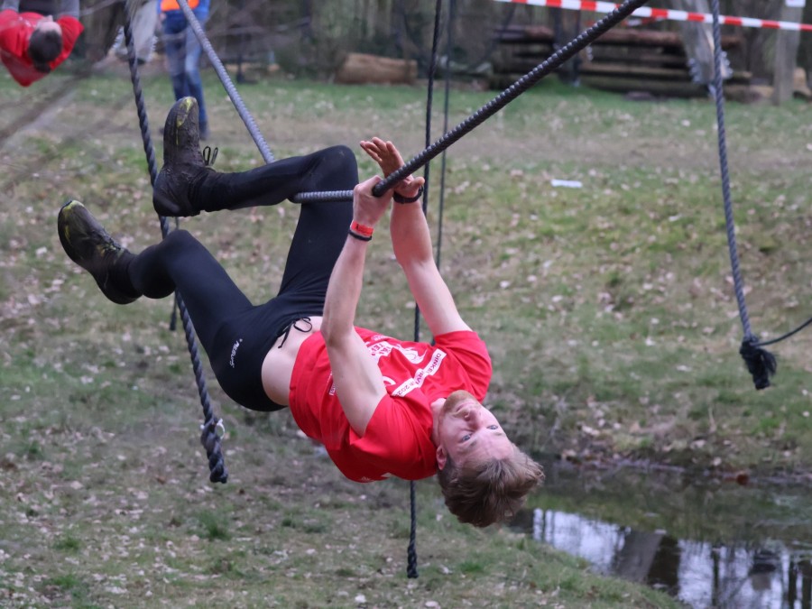 Aangekomen bij de apenhang gaan de deelnemers over in apenhang tot ze bij het uitklimtouw komen.