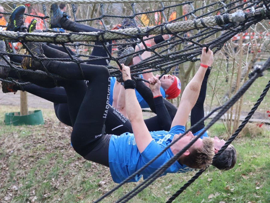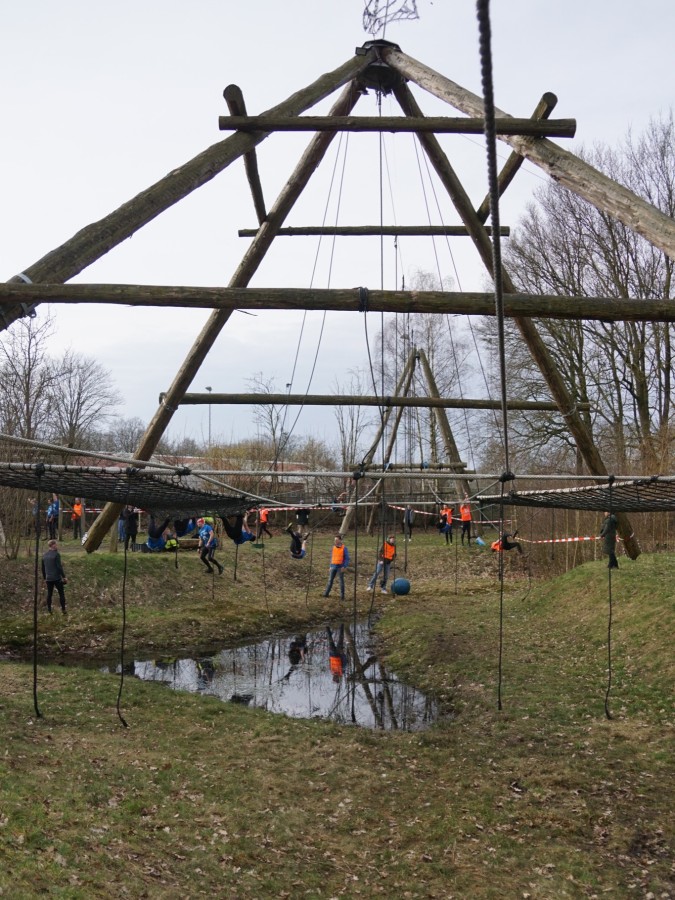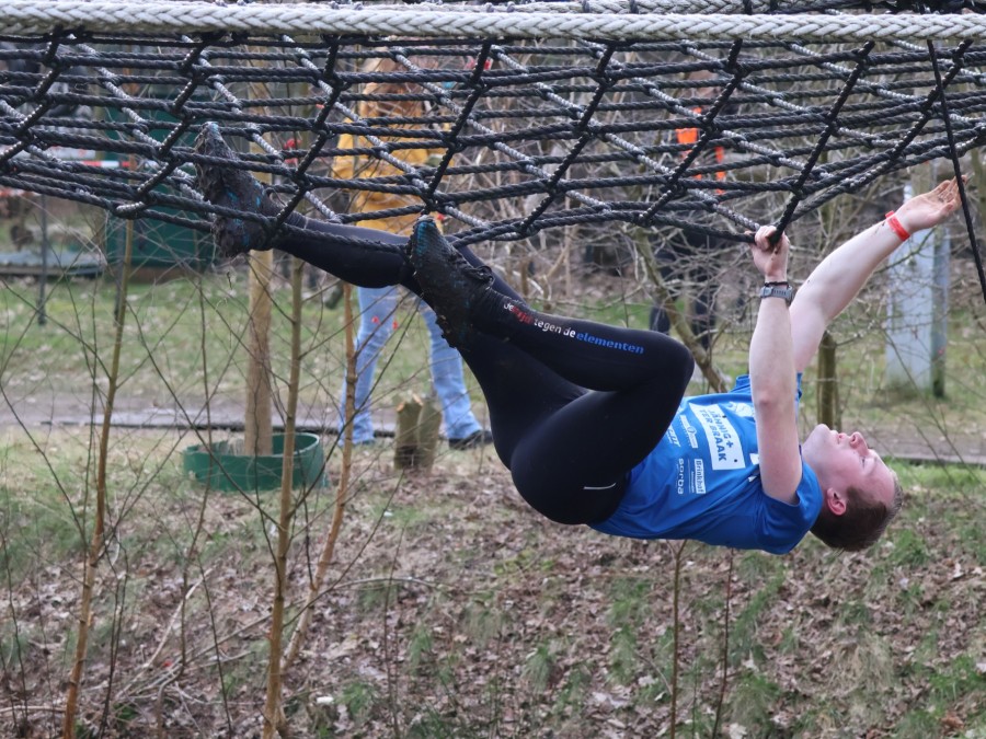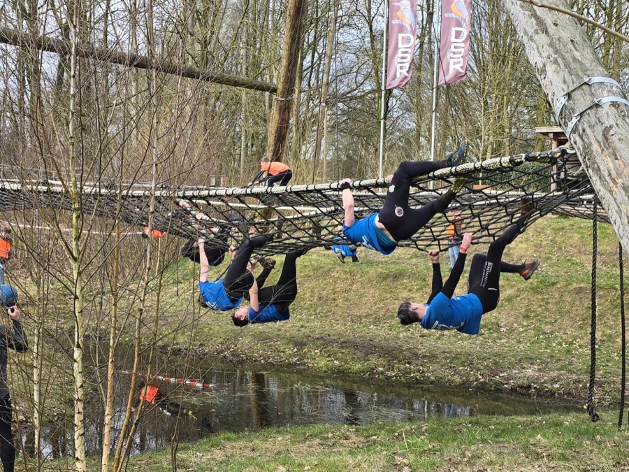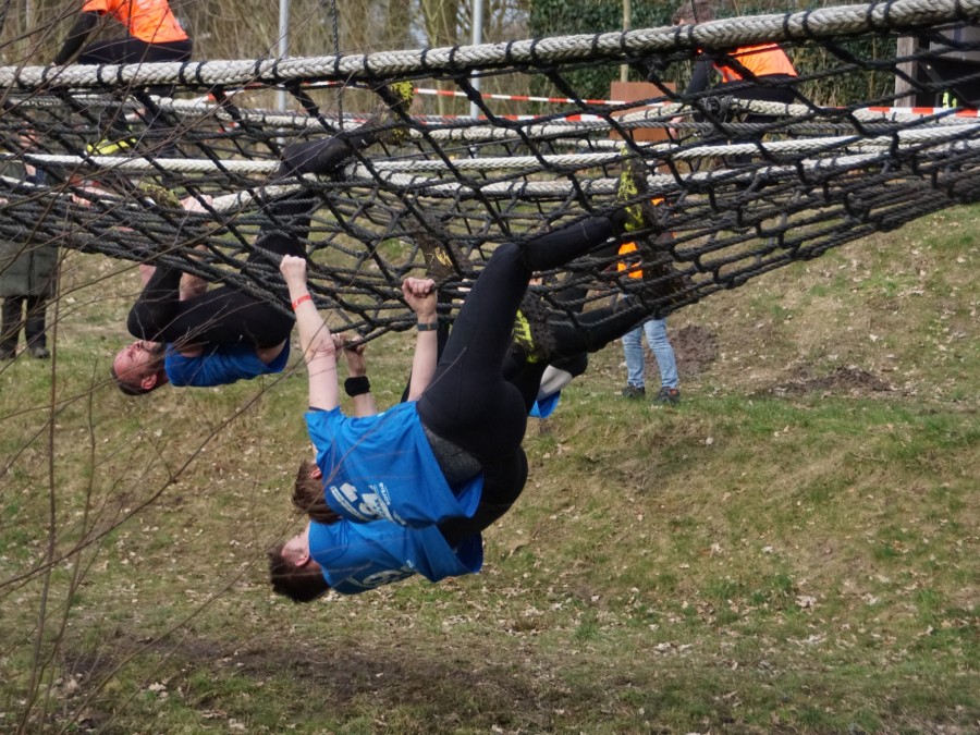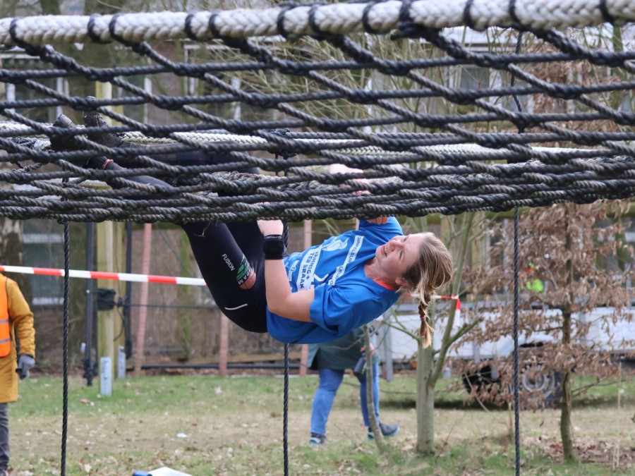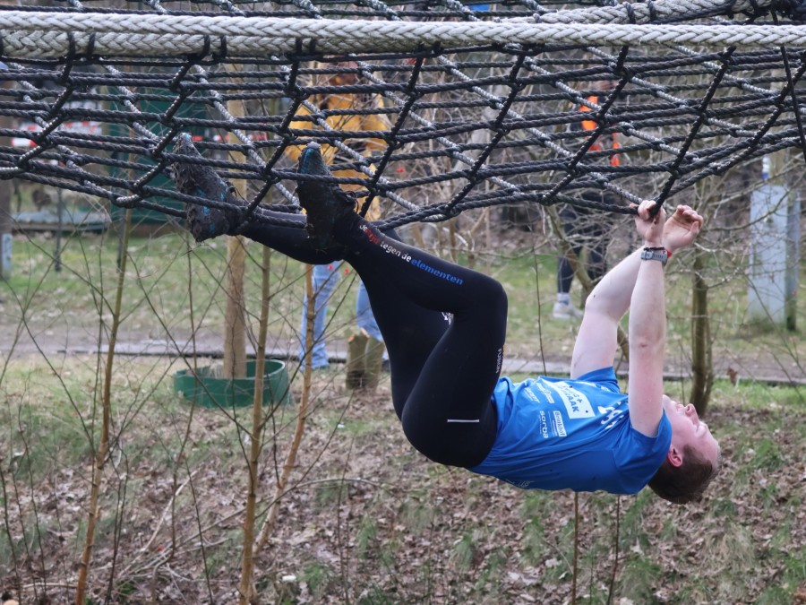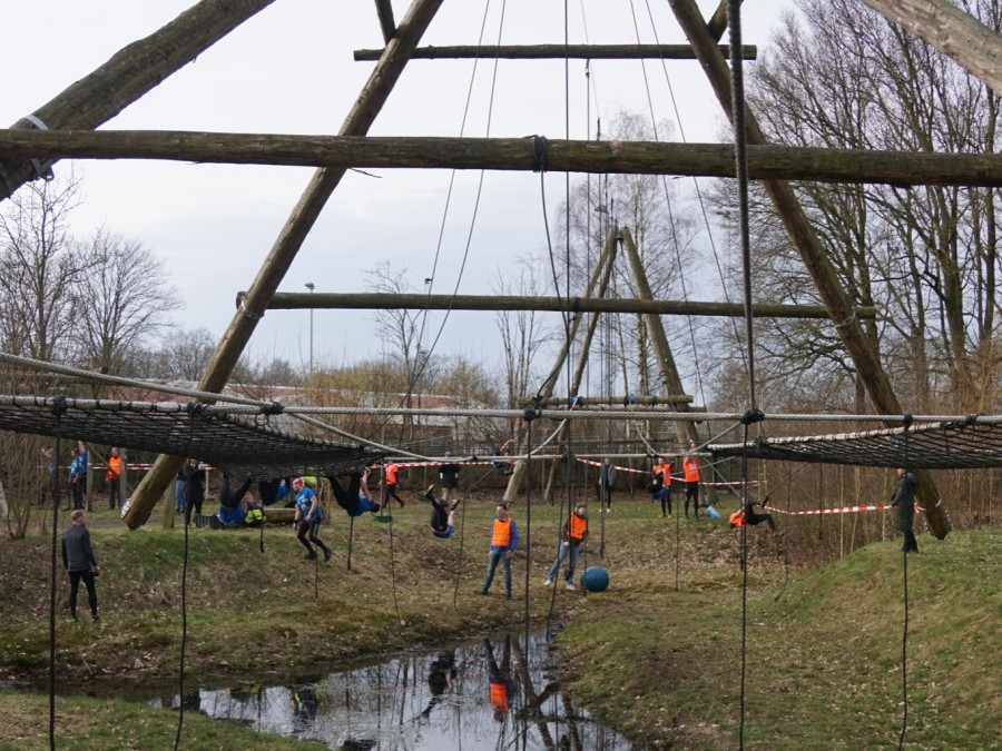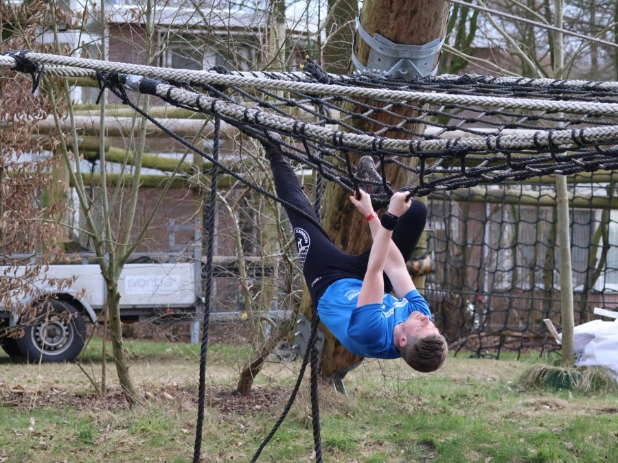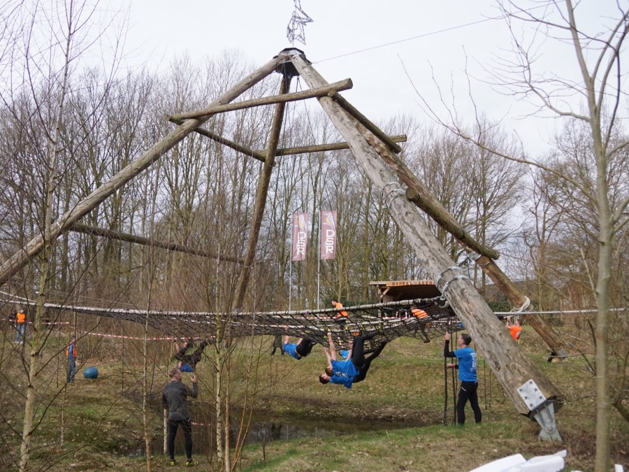 Deelnemers klimmen via het inklimtouw in het horizontale net. het gehele net klimmen ze onderlangs.