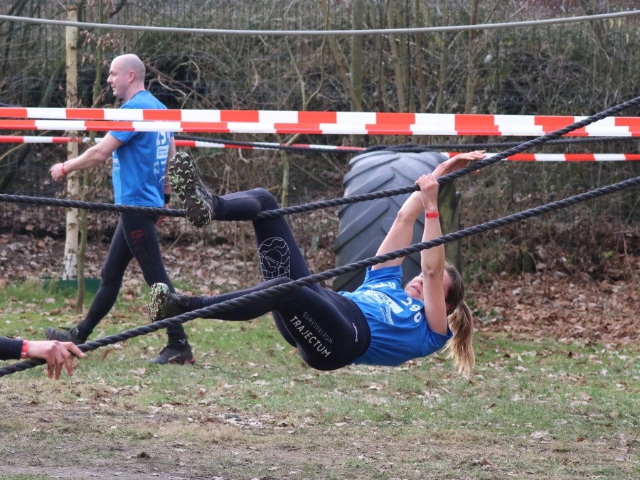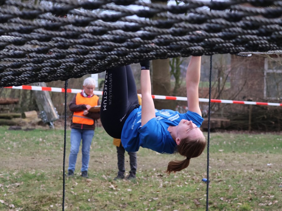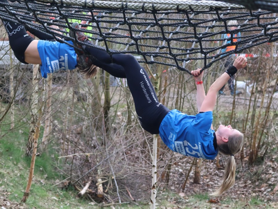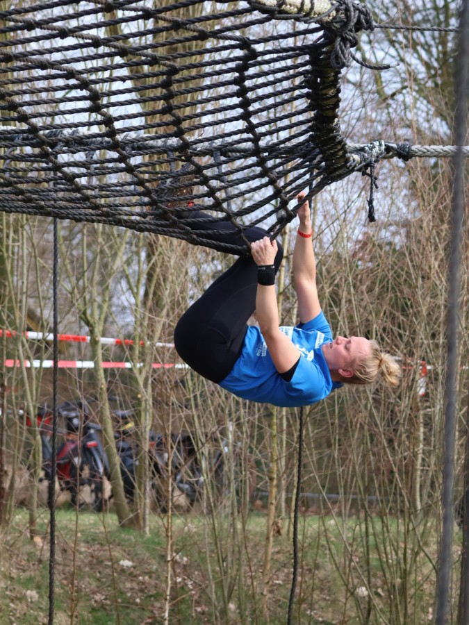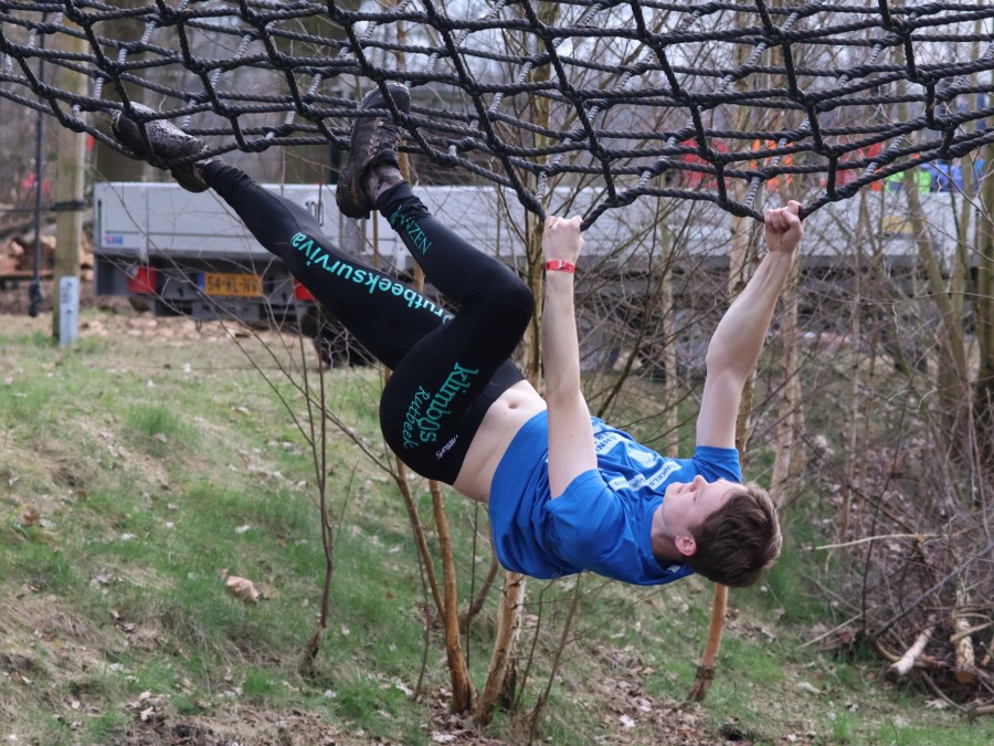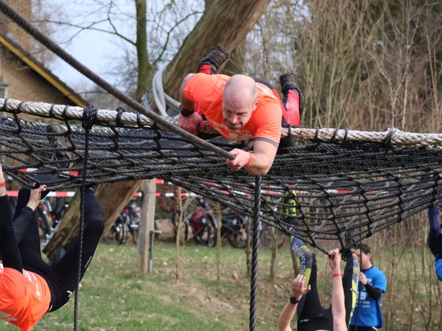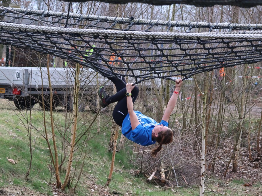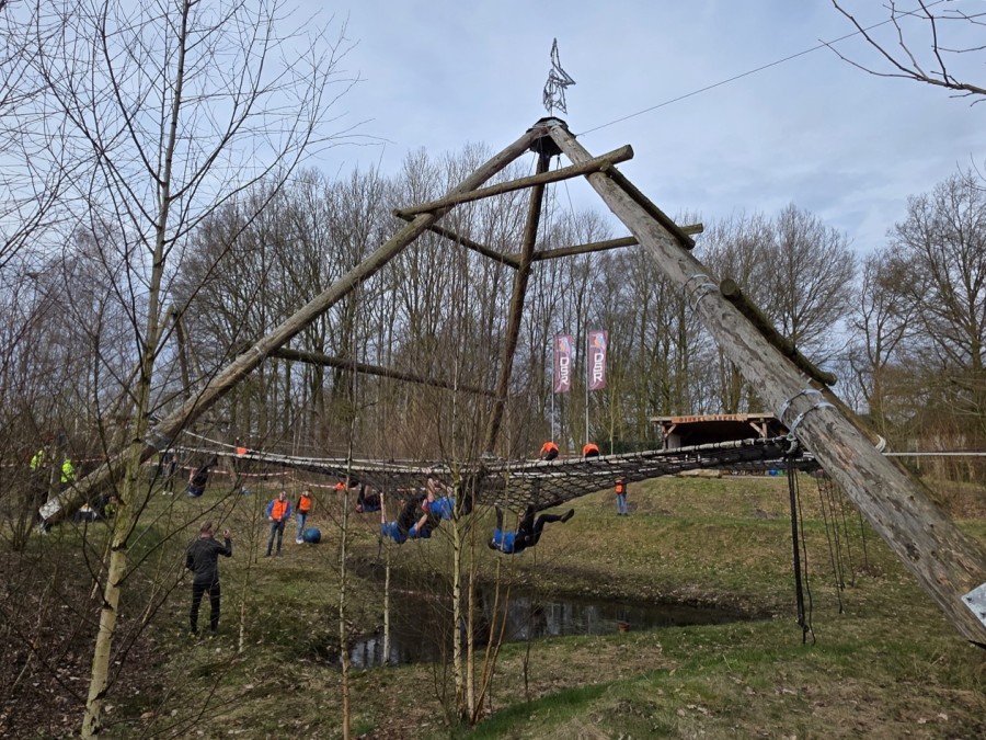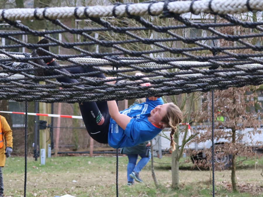 Deelnemers klimmen via het inklimtouw in het horizontale net. het gehele net klimmen ze onderlangs.