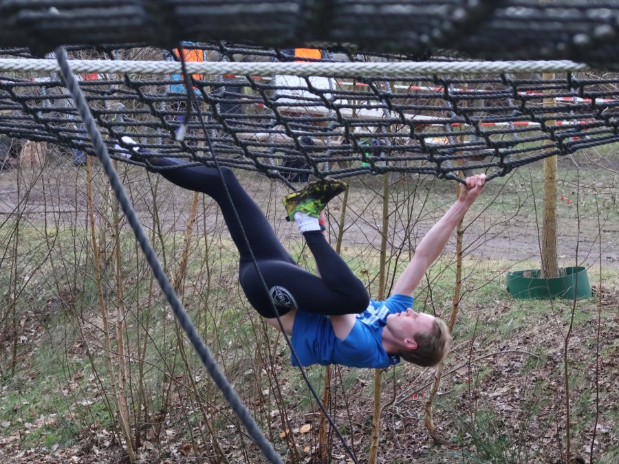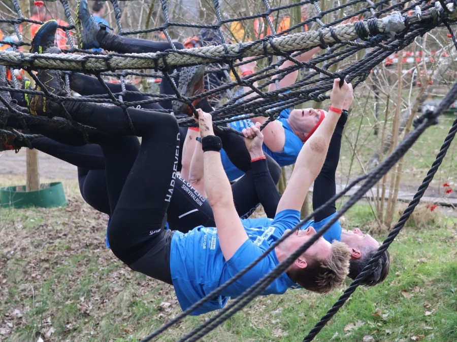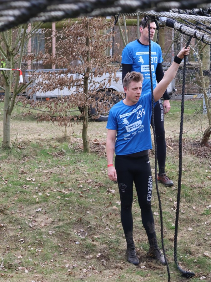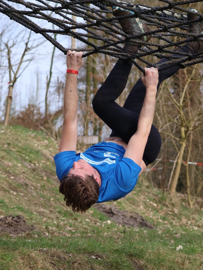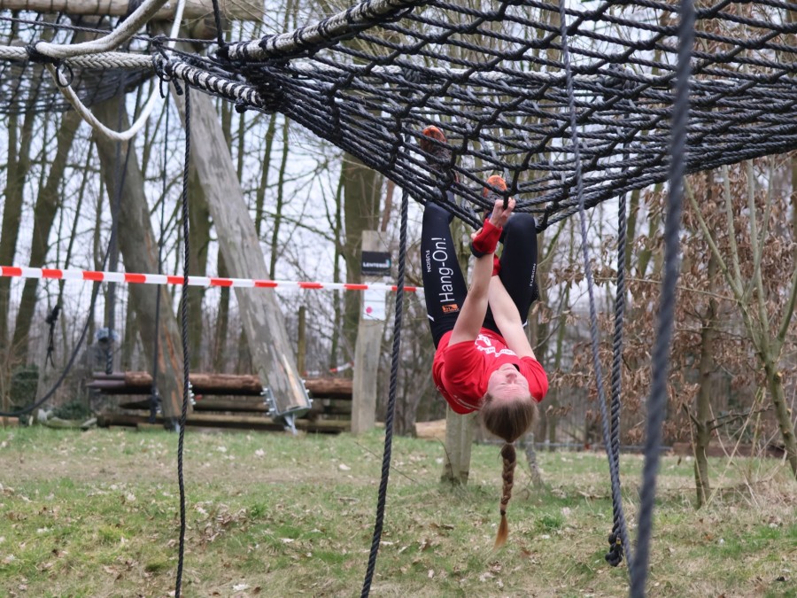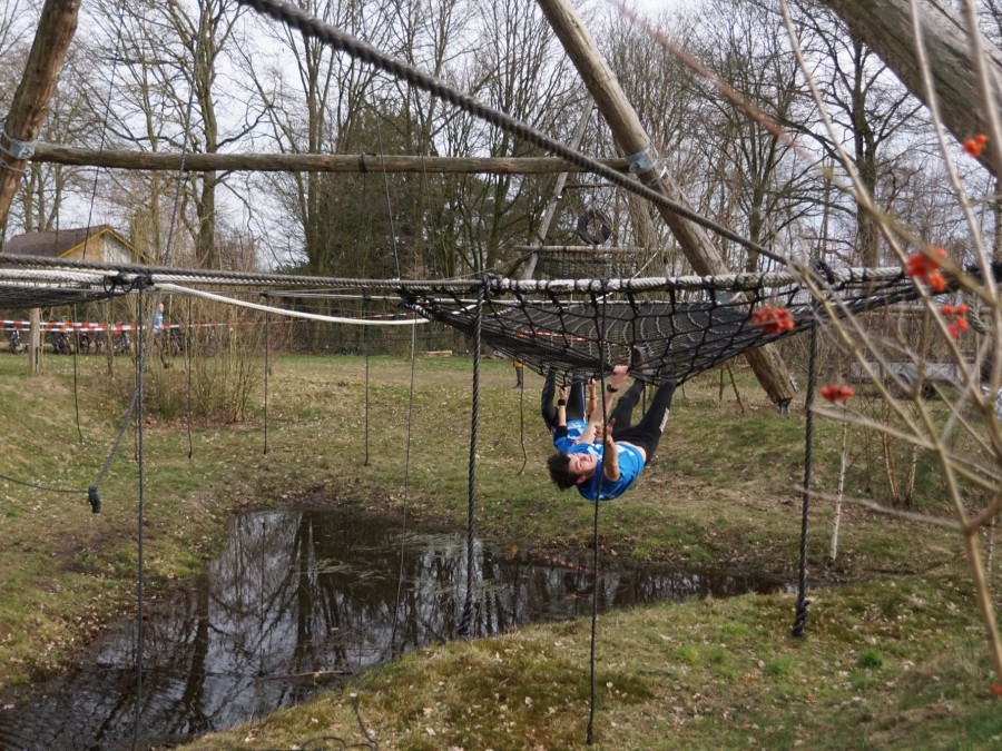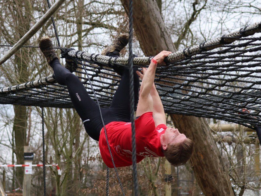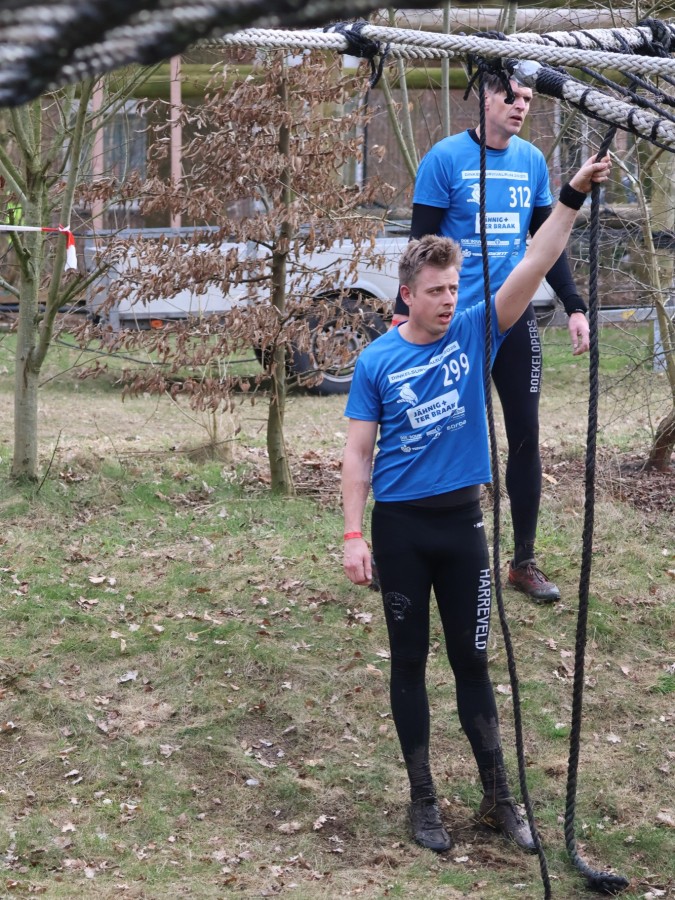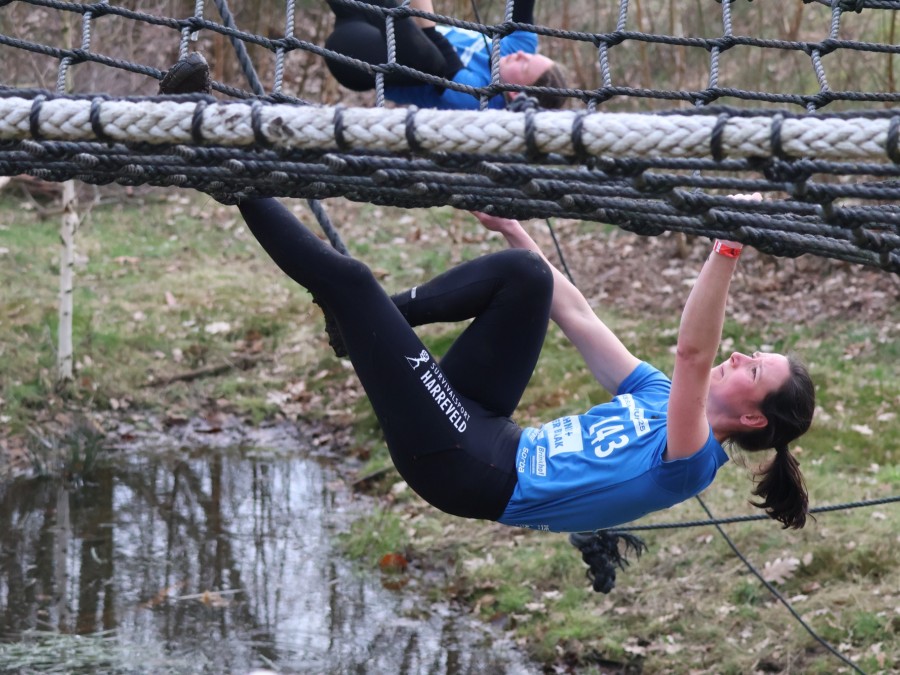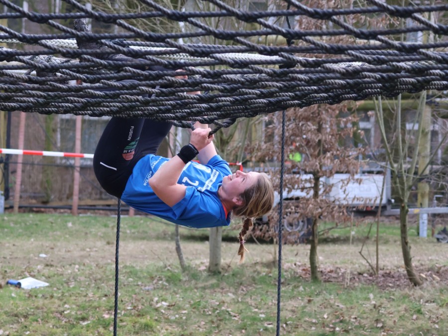 Deelnemers klimmen via het inklimtouw in het horizontale net. het gehele net klimmen ze onderlangs.