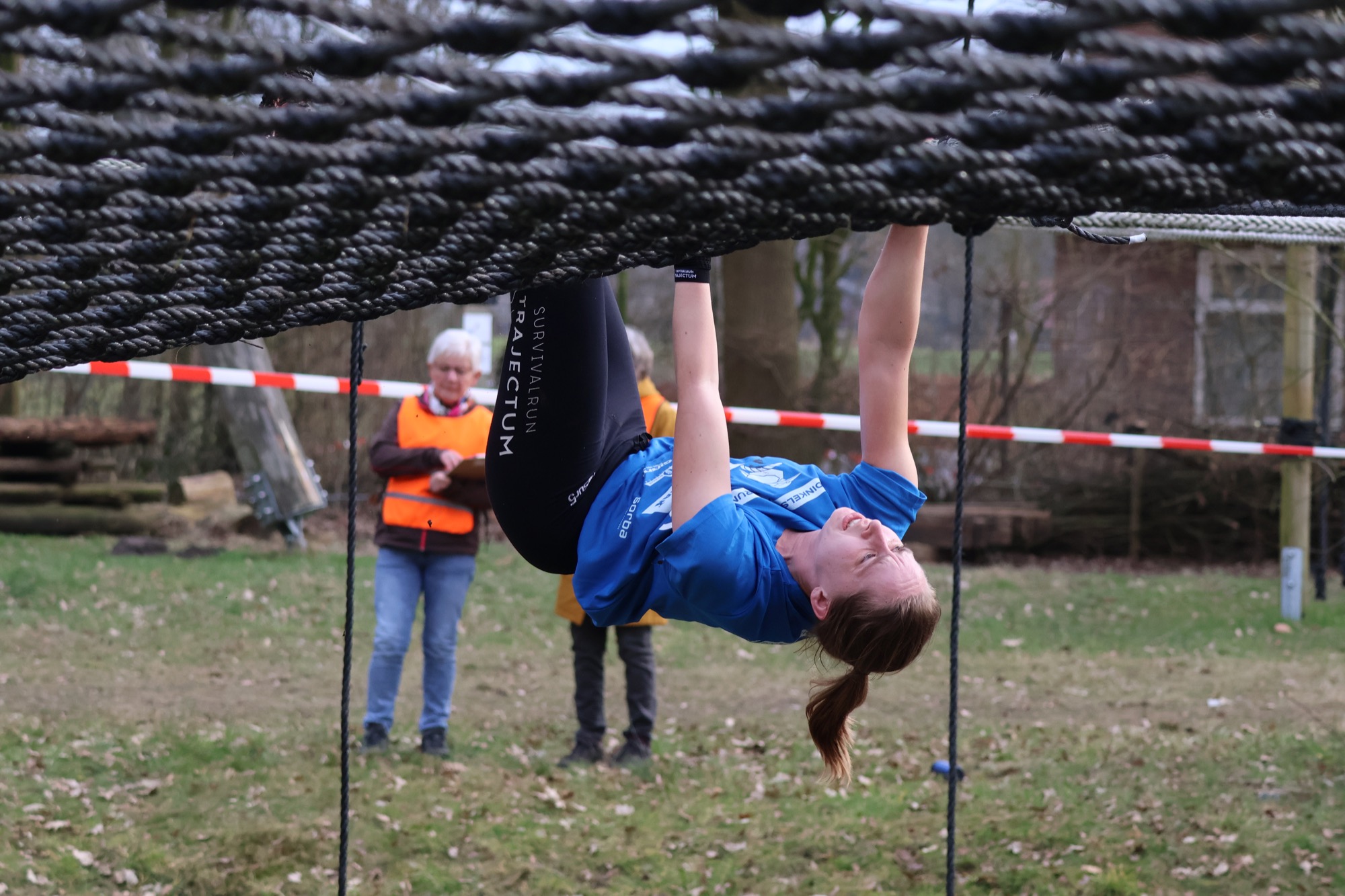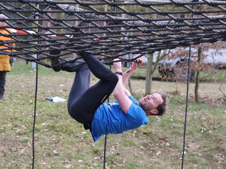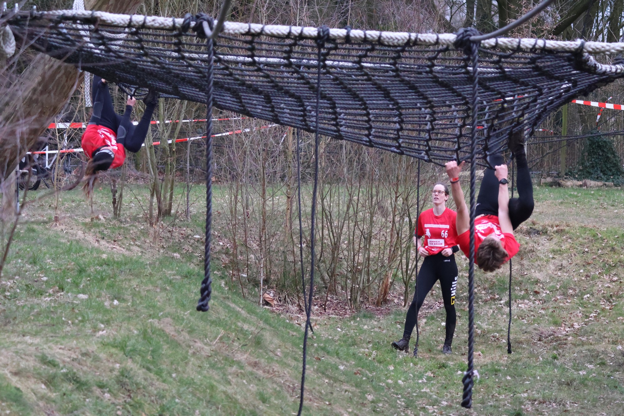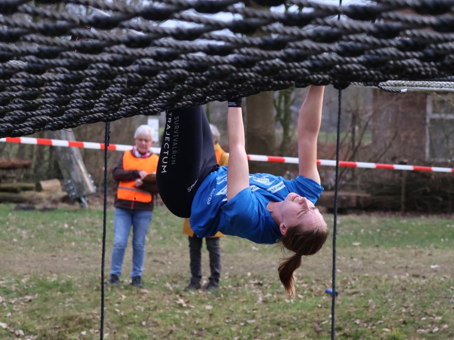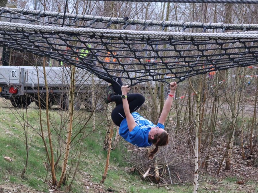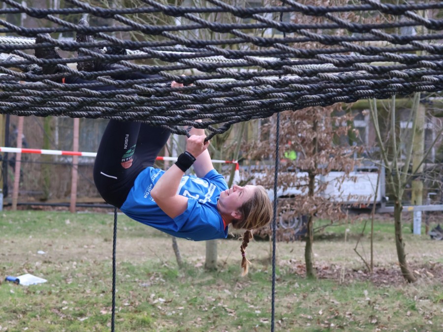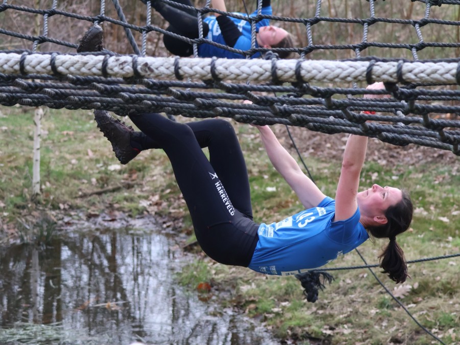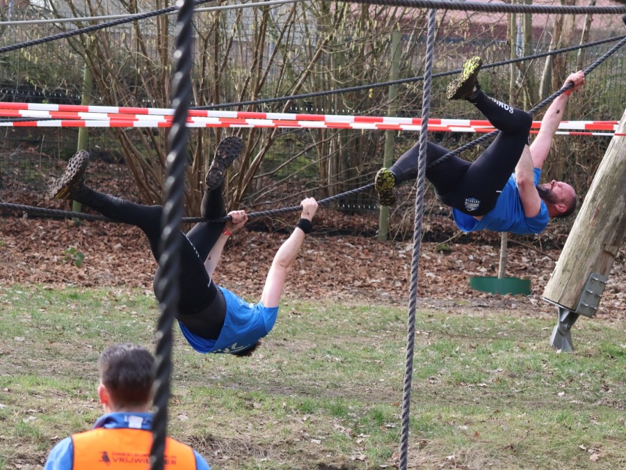 Deelnemers klimmen via het inklimtouw in het horizontale net. het gehele net klimmen ze onderlangs.