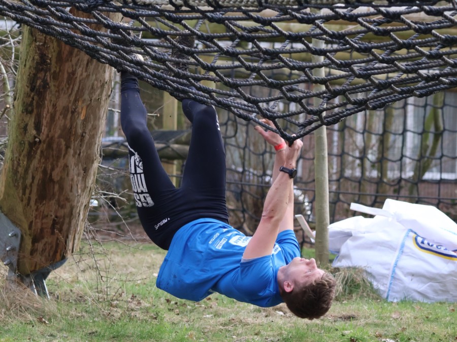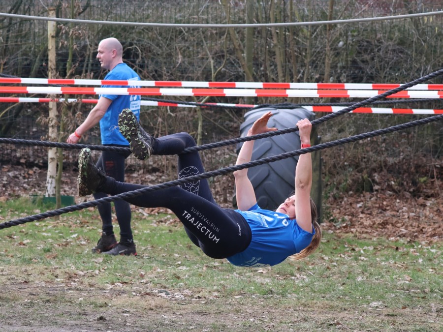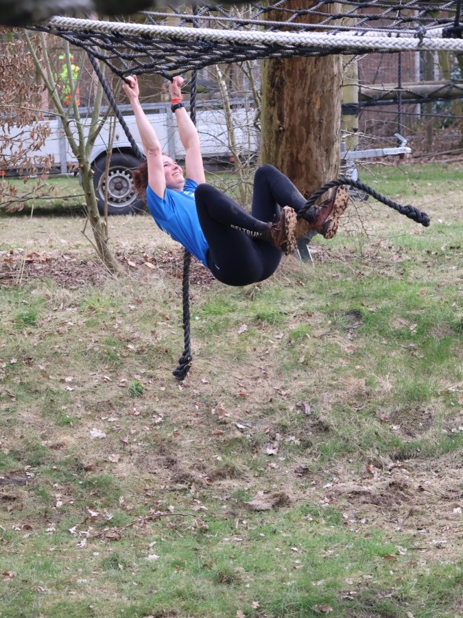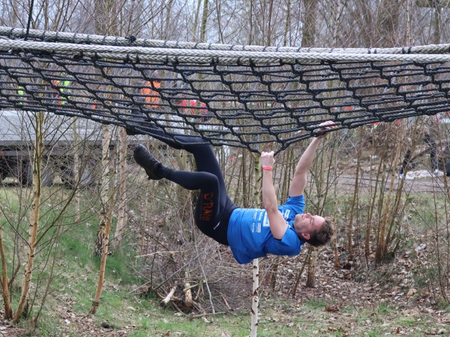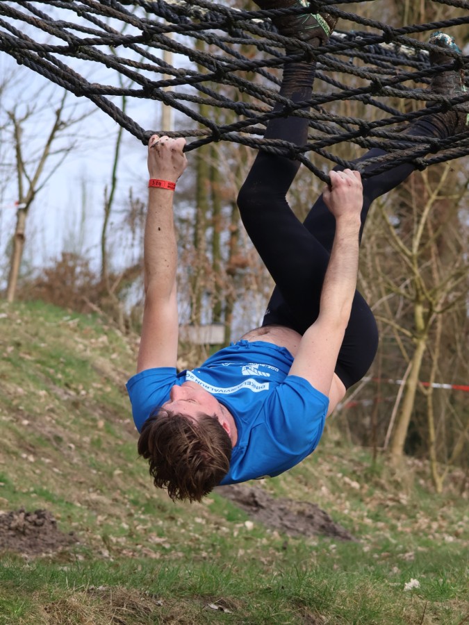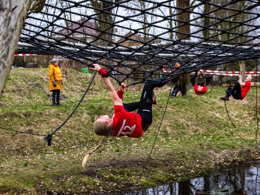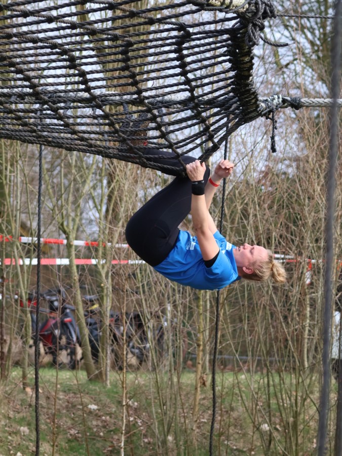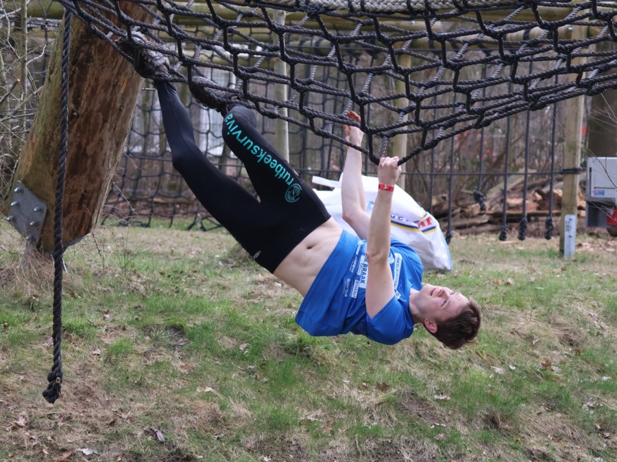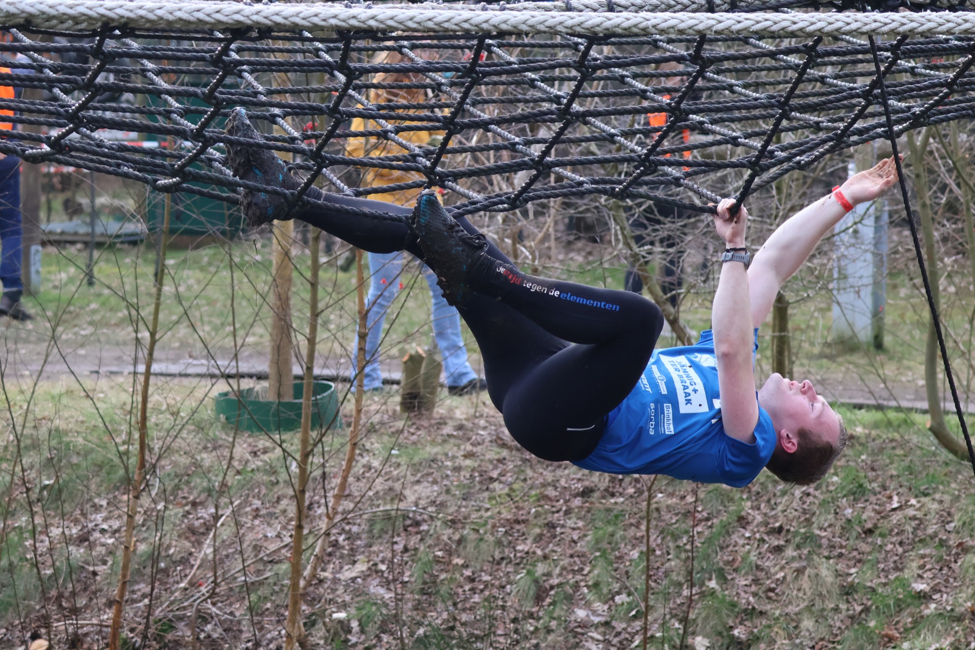 Deelnemers klimmen via het inklimtouw in het horizontale net. het gehele net klimmen ze onderlangs.