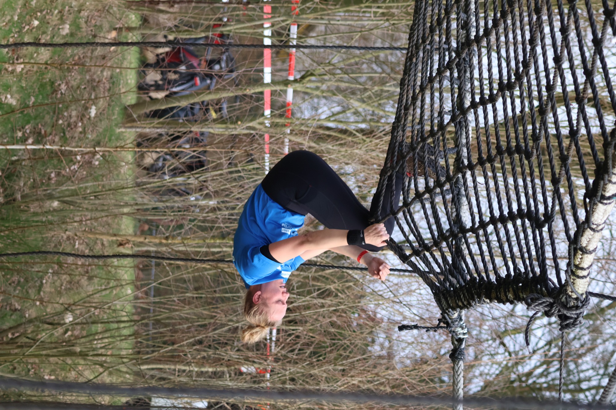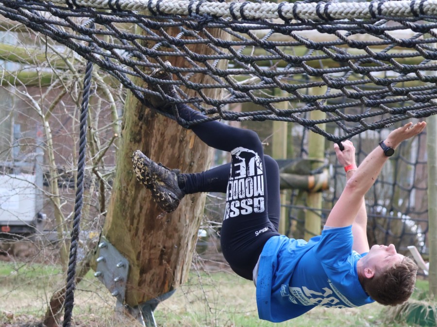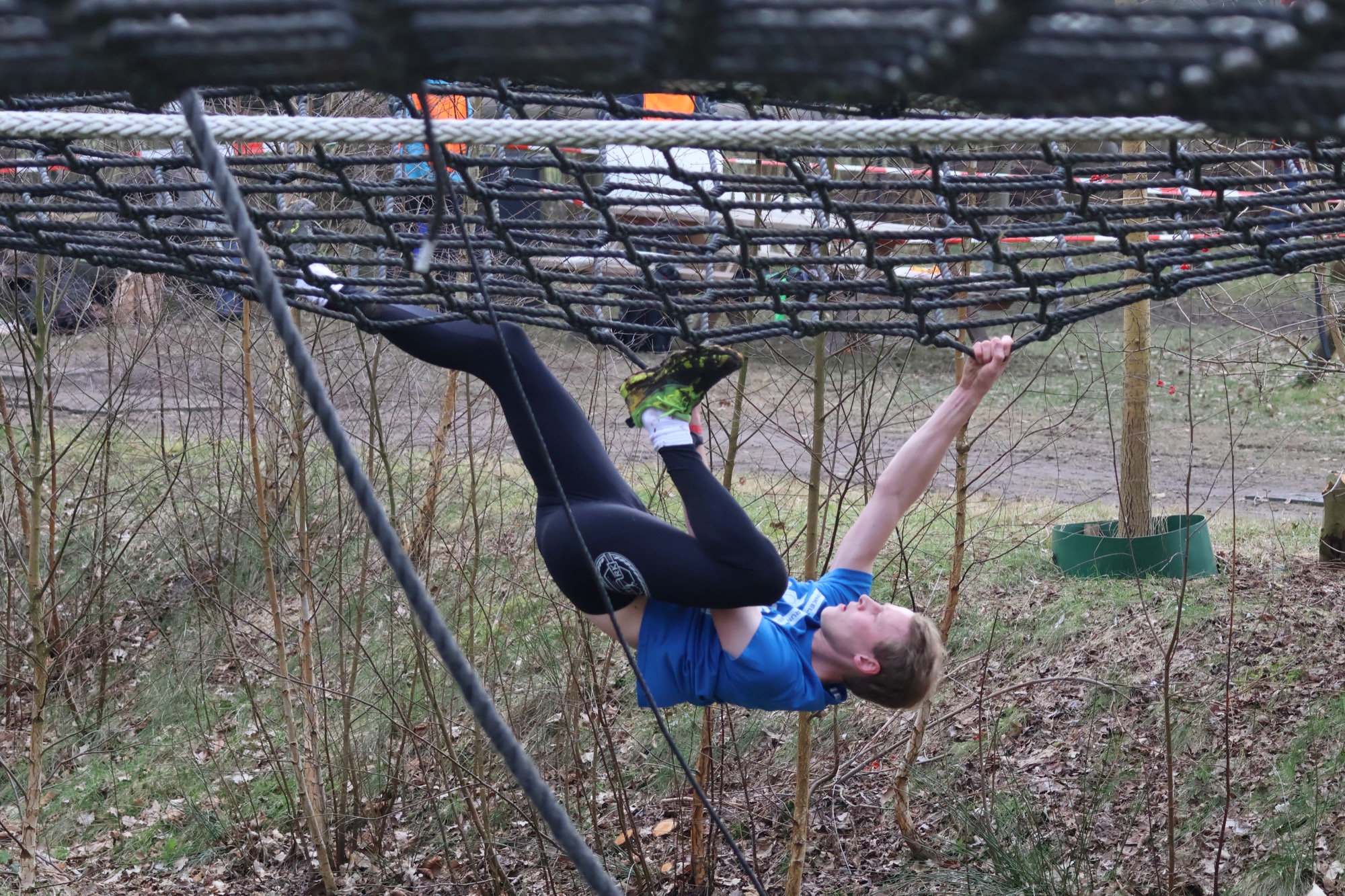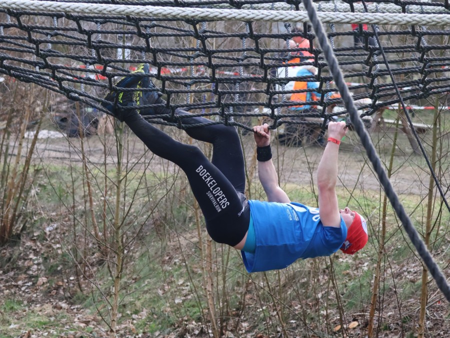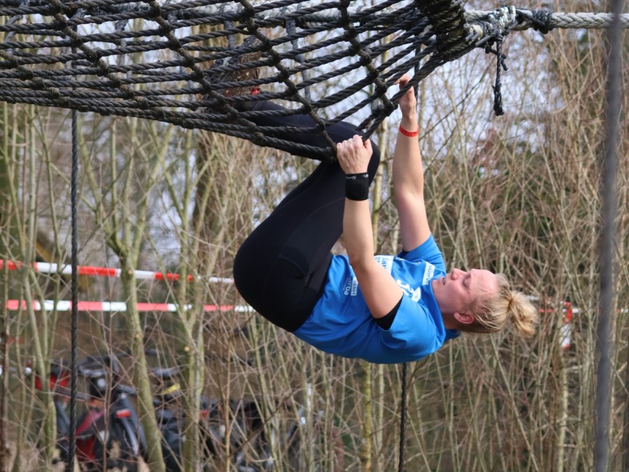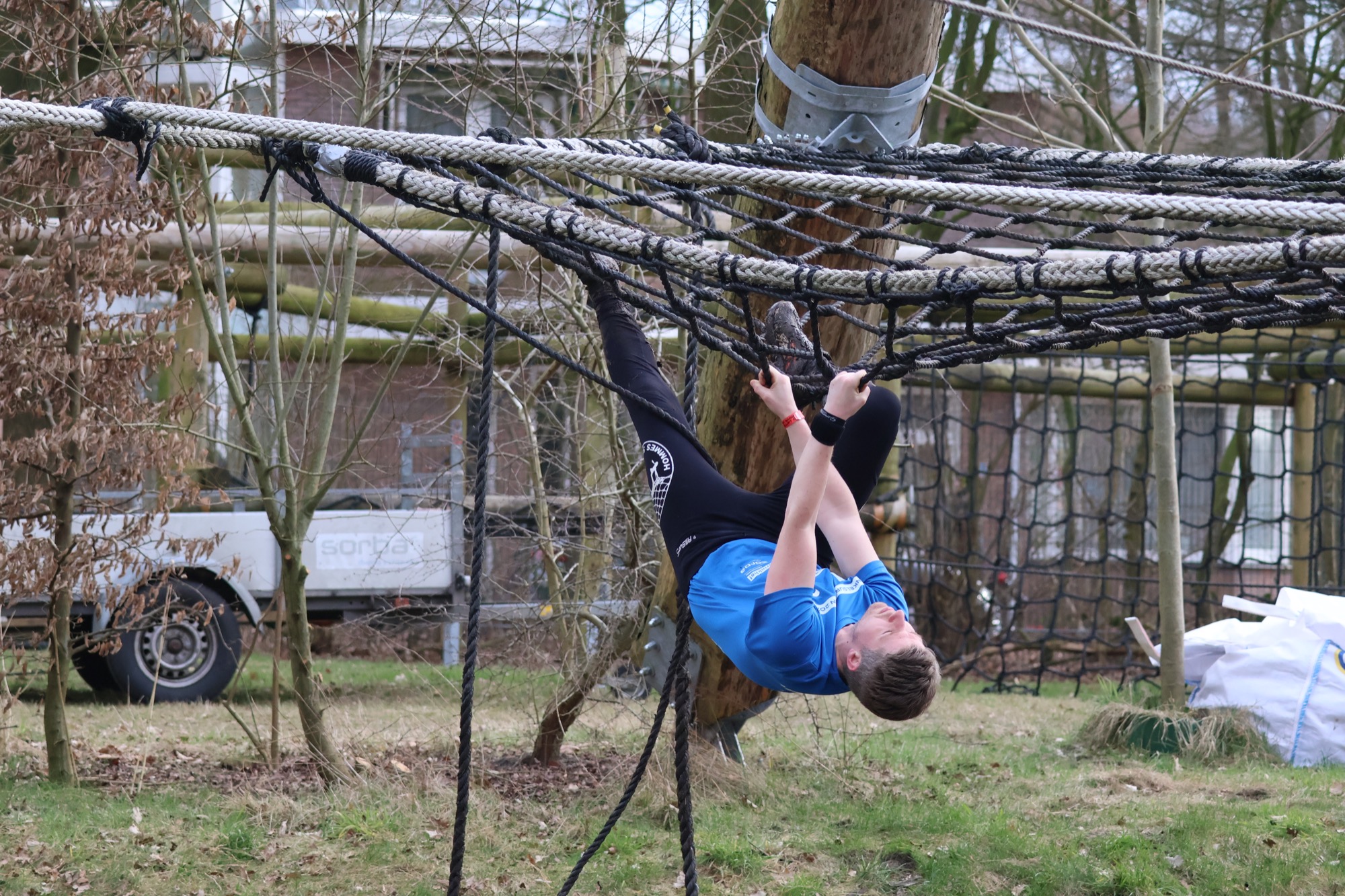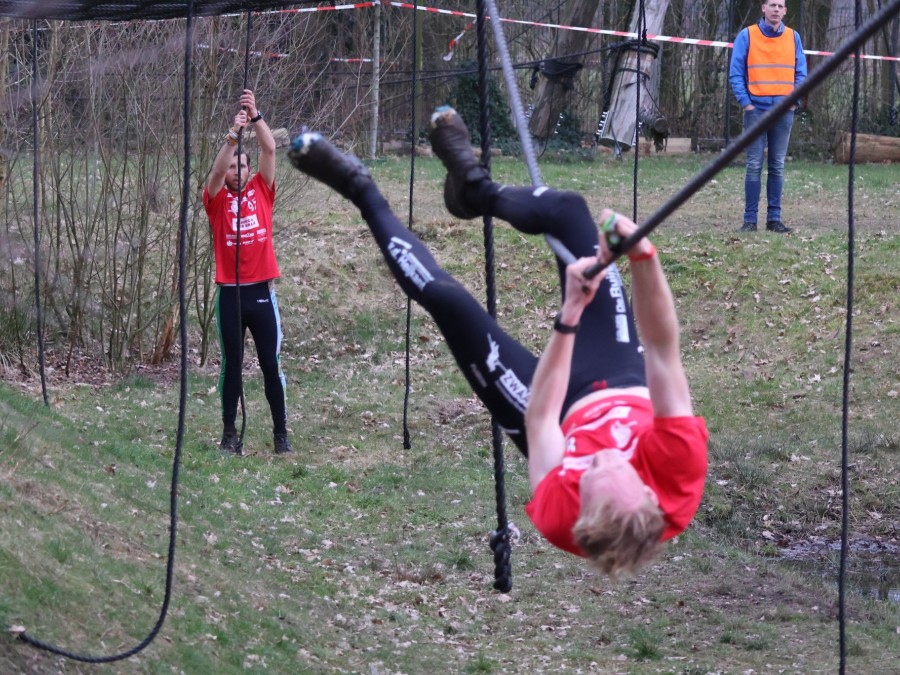 Deelnemers klimmen via het inklimtouw in het horizontale net. het gehele net klimmen ze onderlangs.