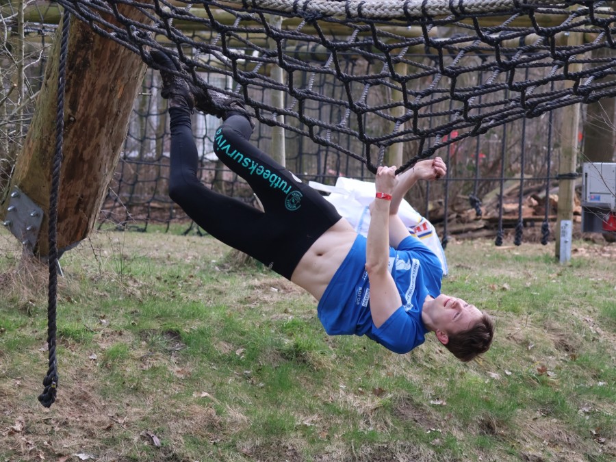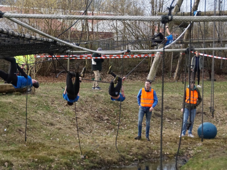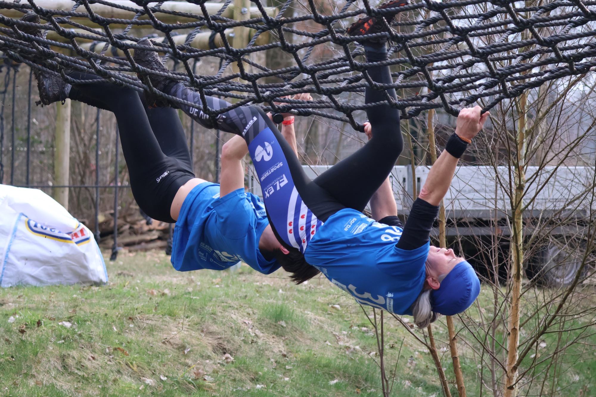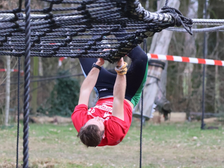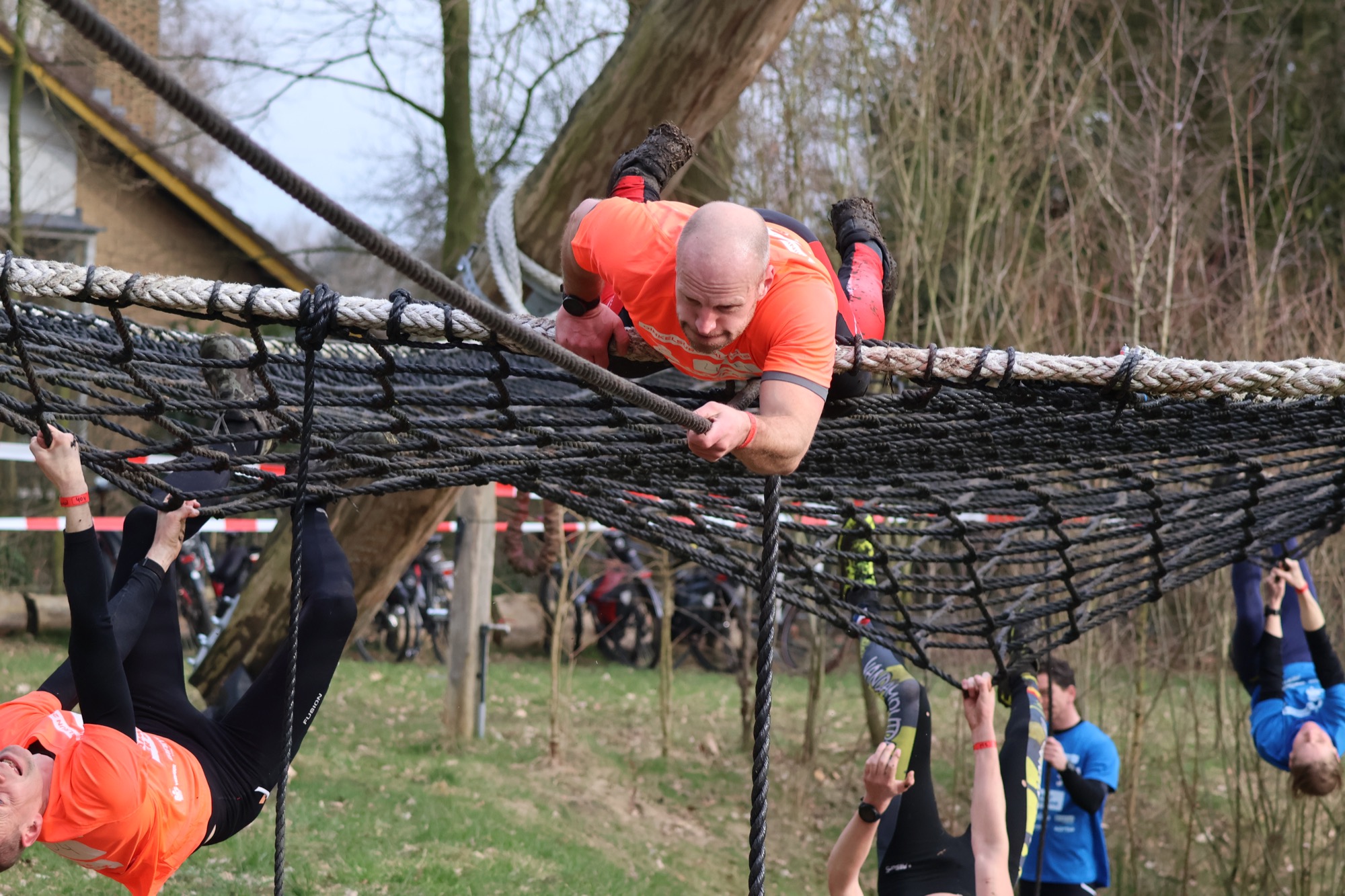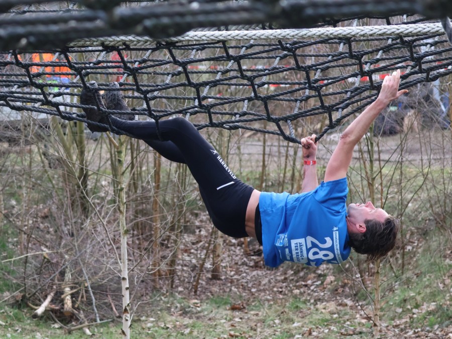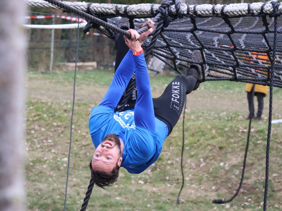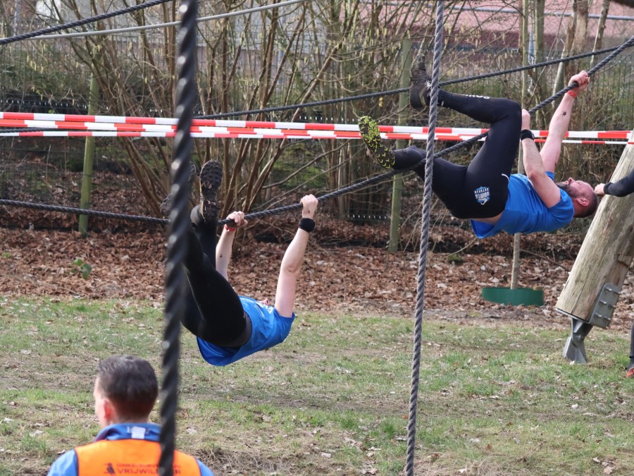 Deelnemers klimmen via het inklimtouw in het horizontale net. het gehele net klimmen ze onderlangs.