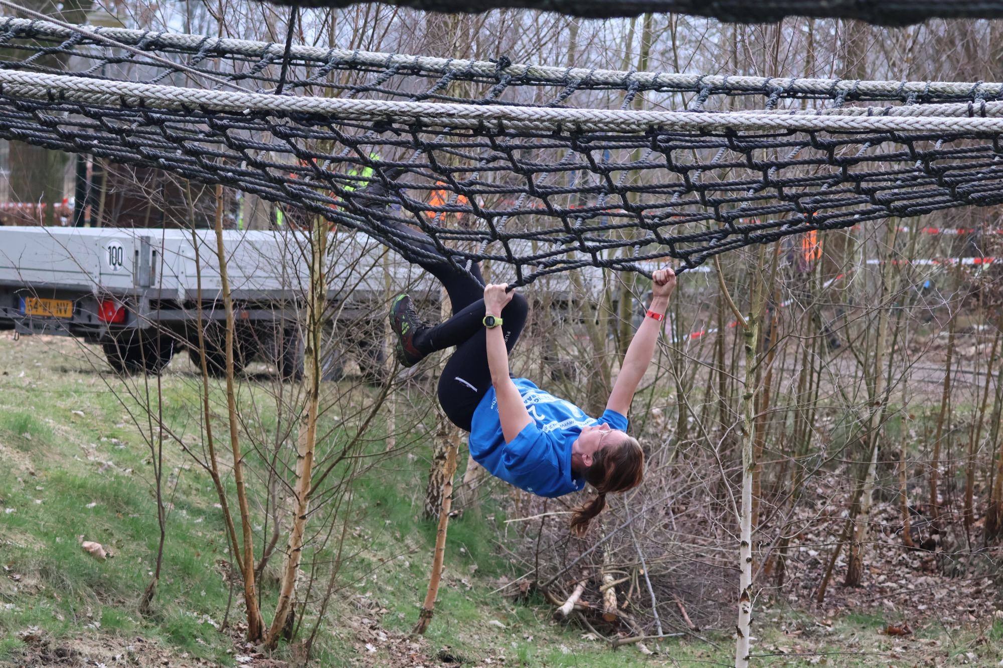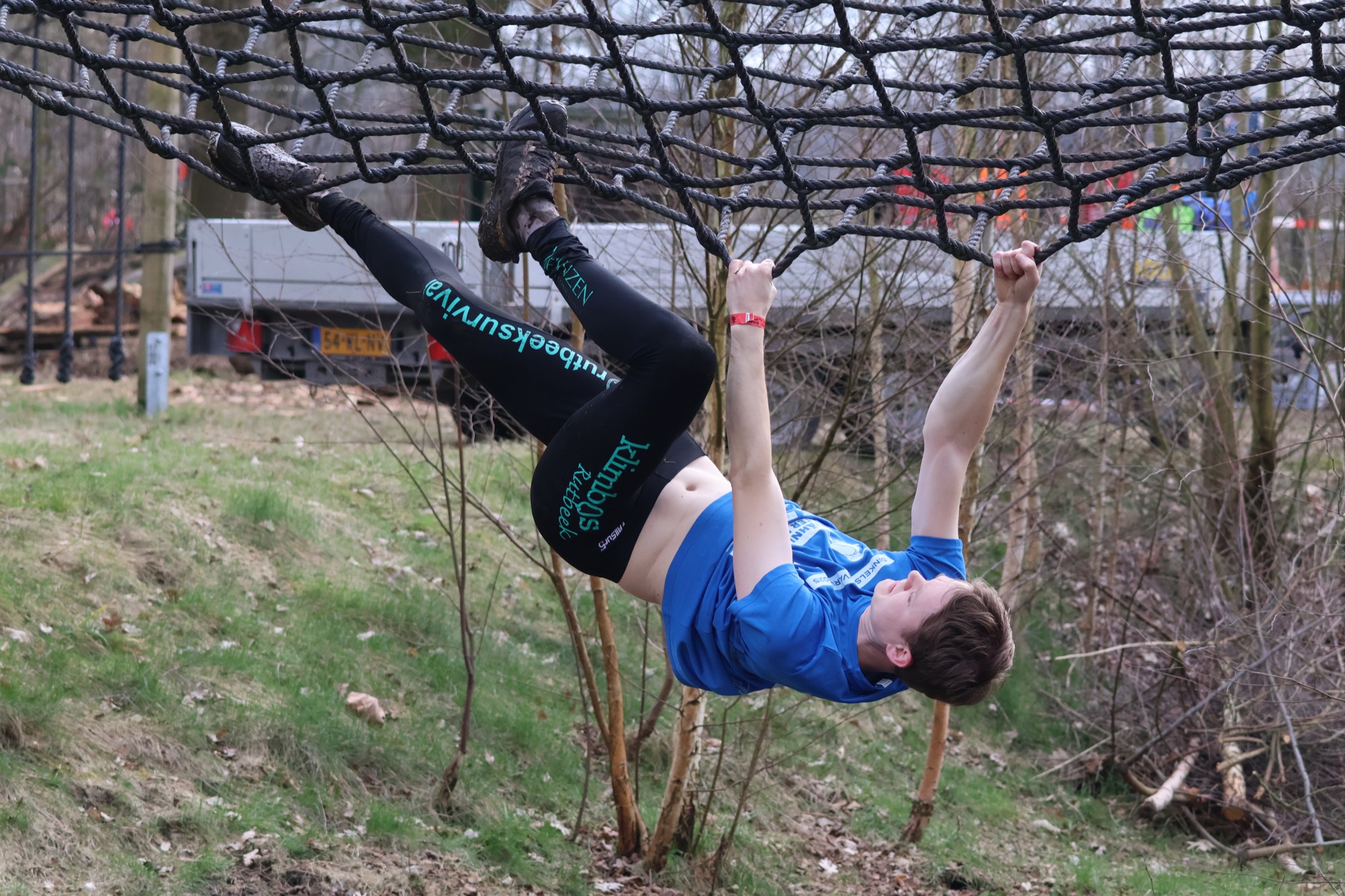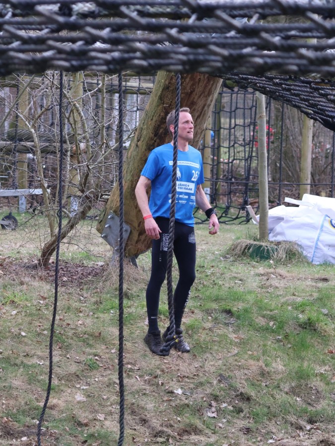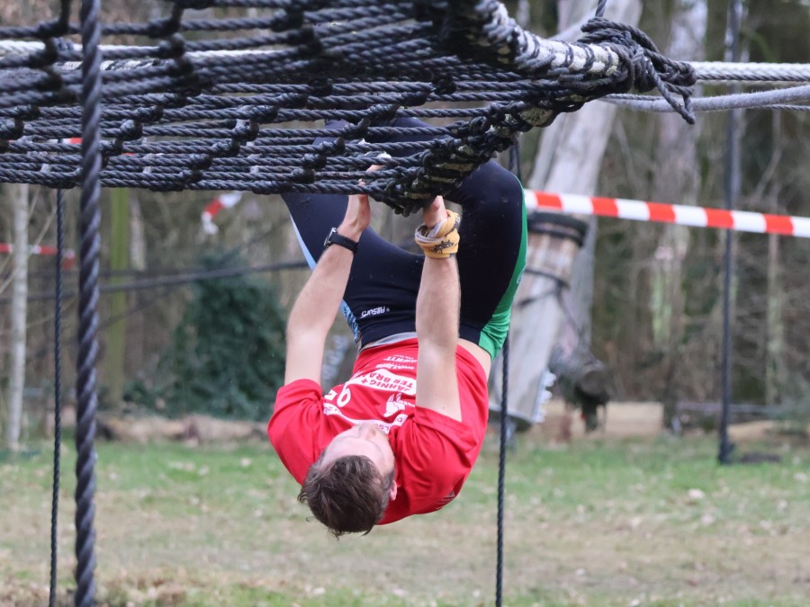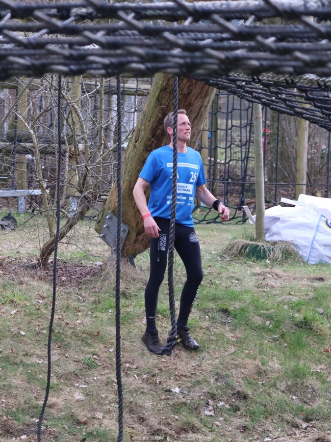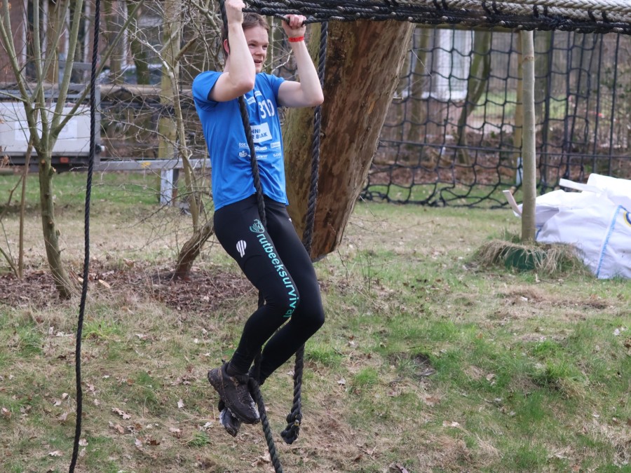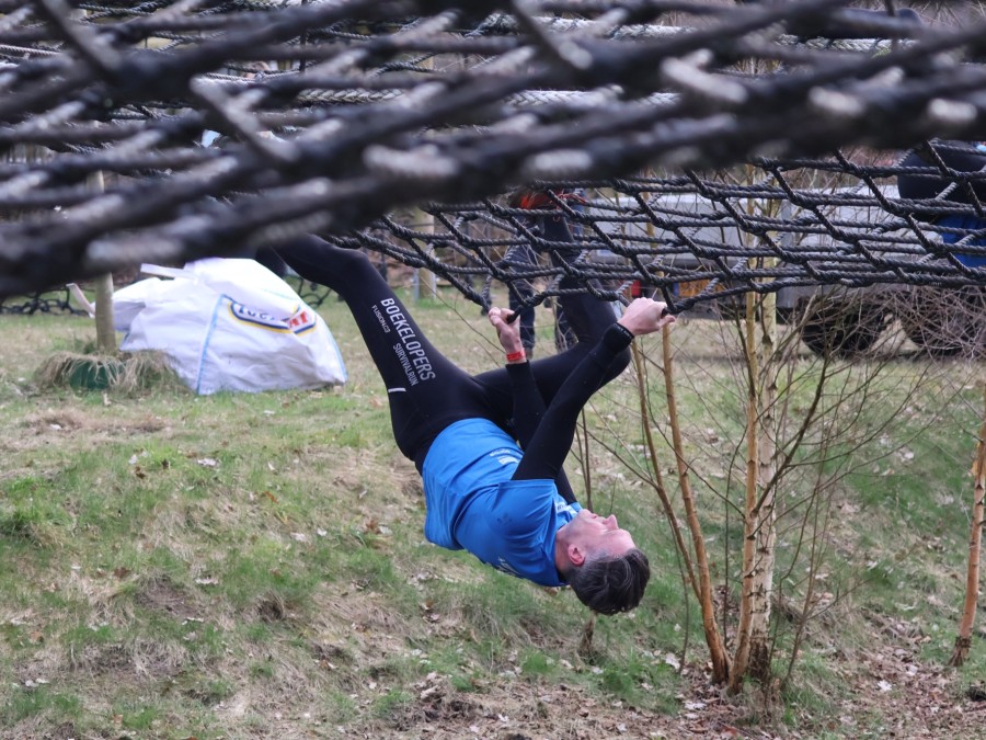 Deelnemers klimmen via het inklimtouw in het horizontale net. het gehele net klimmen ze onderlangs.
