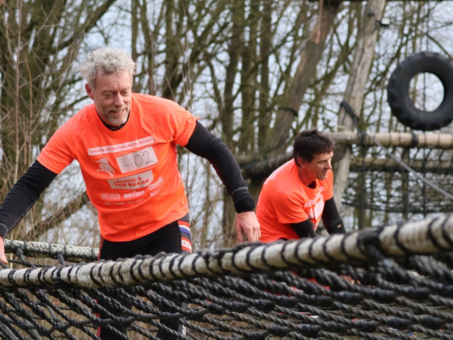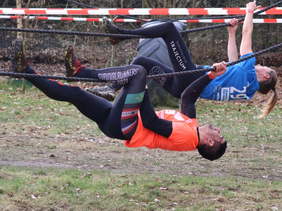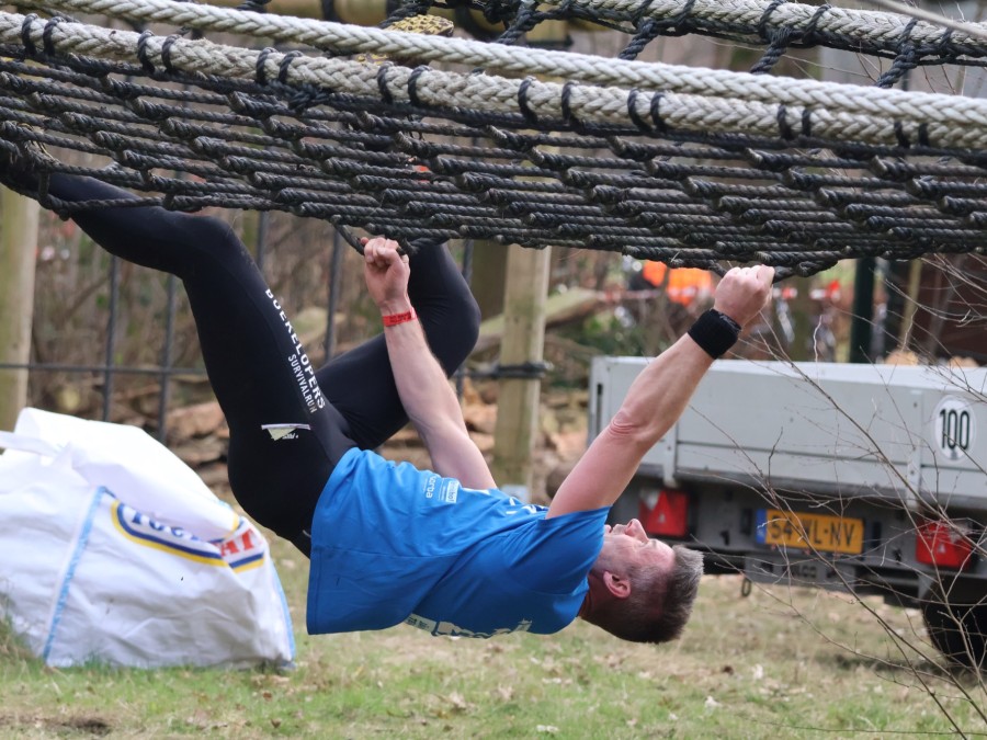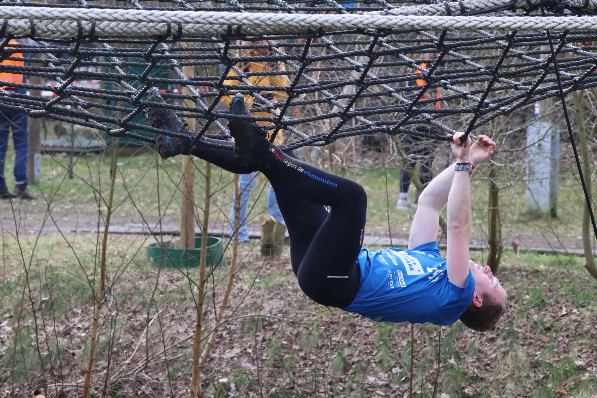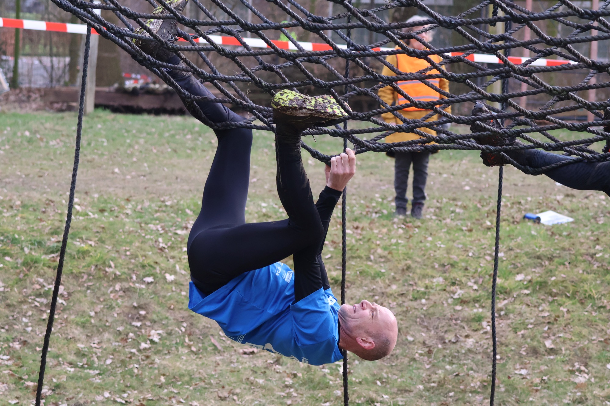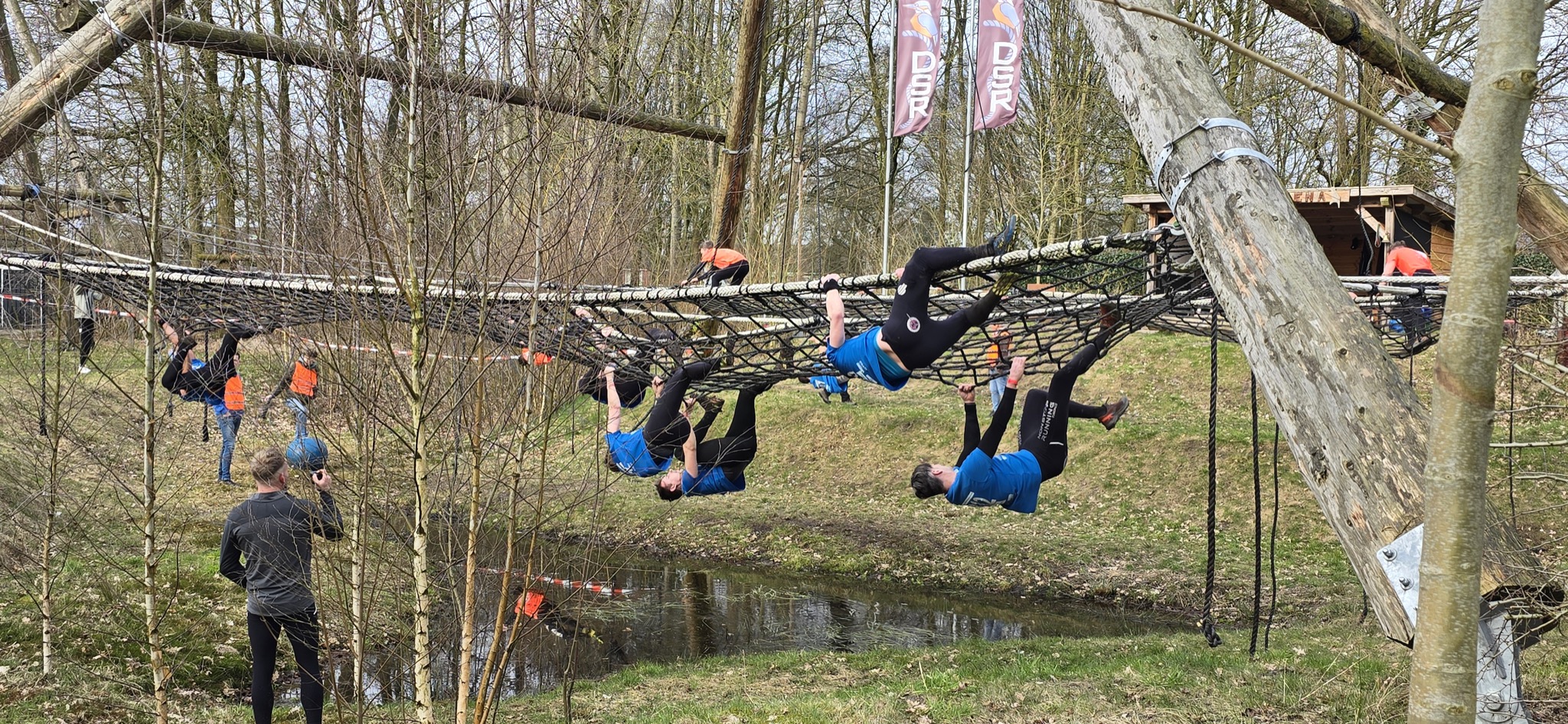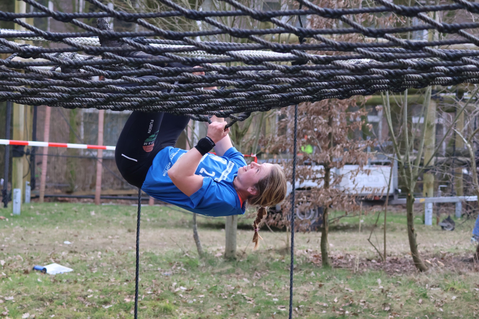 Deelnemers klimmen via het inklimtouw in het horizontale net. het gehele net klimmen ze onderlangs.