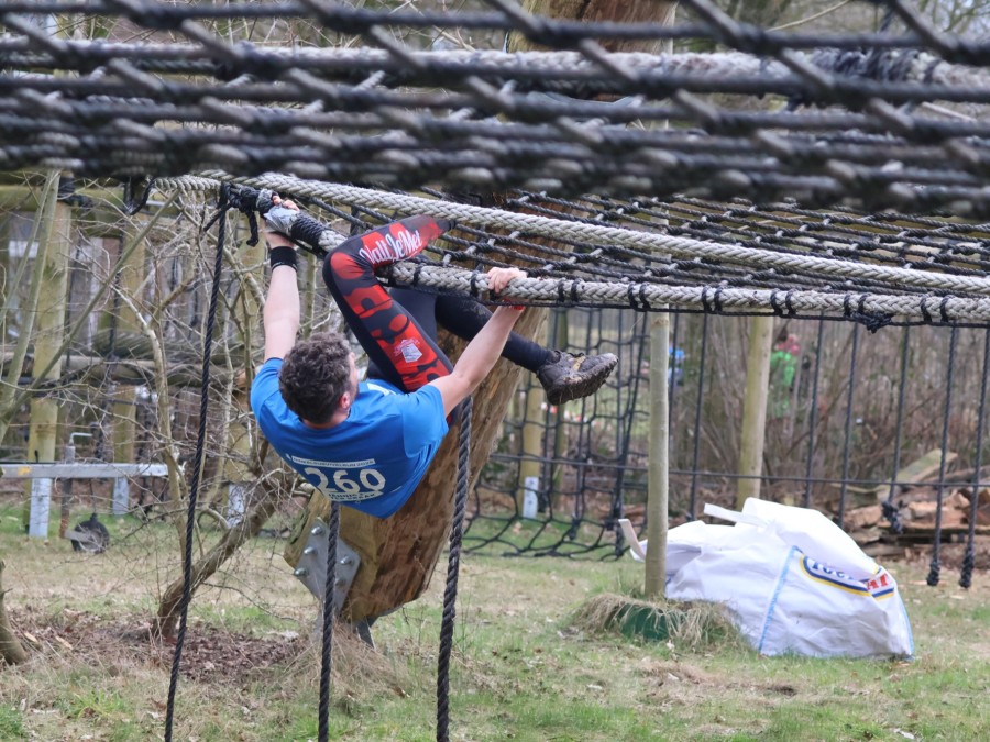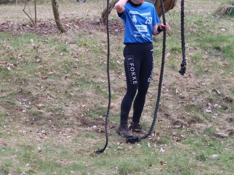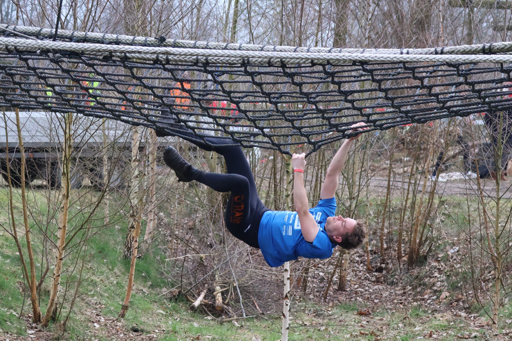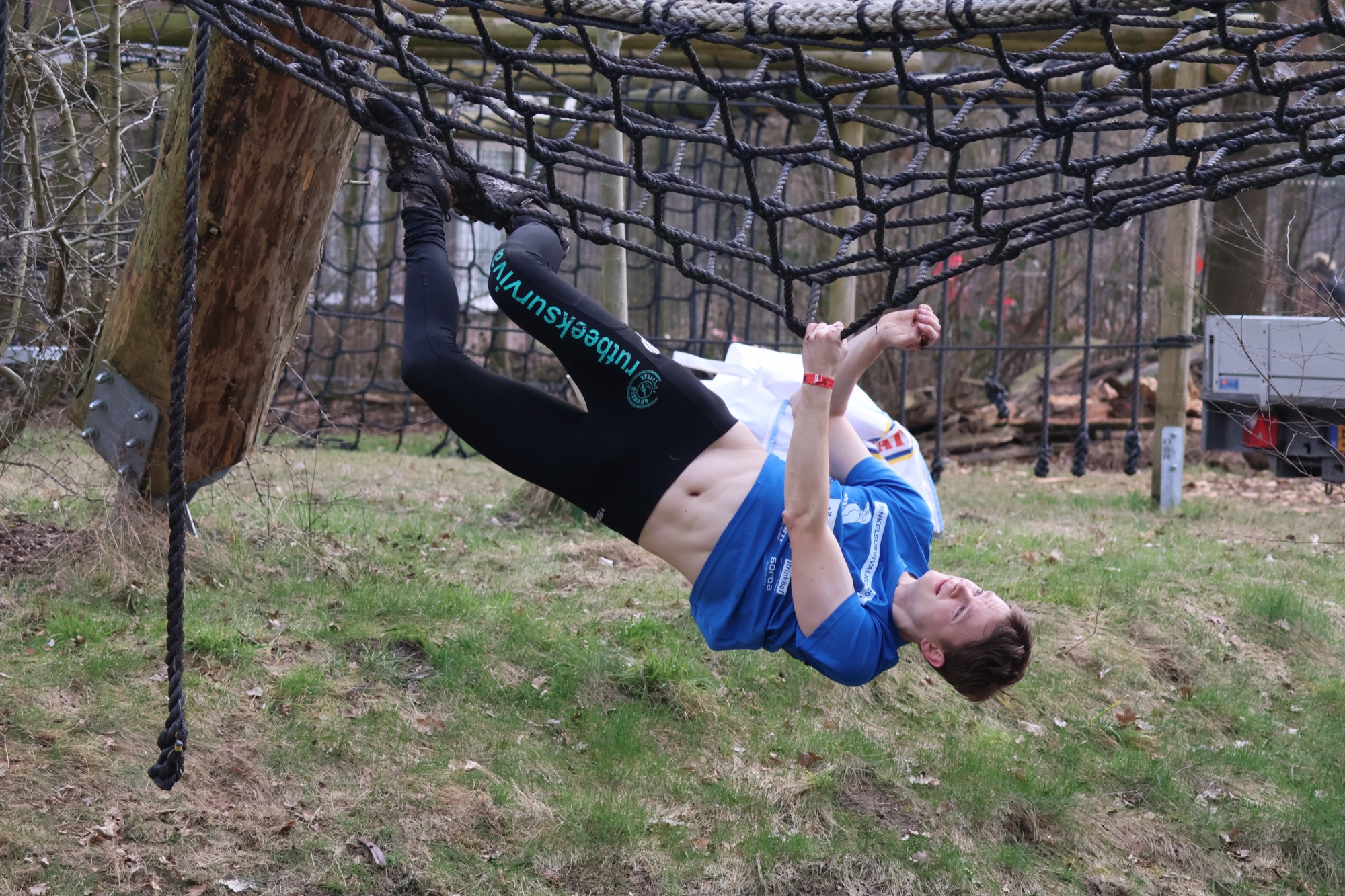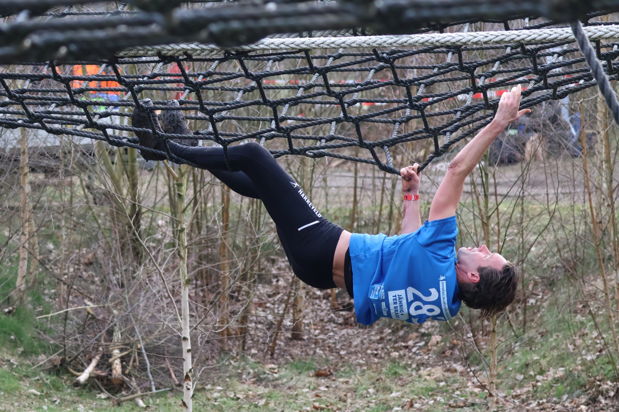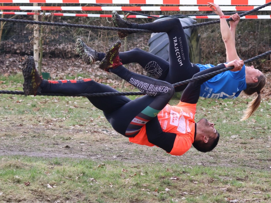 Deelnemers klimmen via het inklimtouw in het horizontale net. het gehele net klimmen ze onderlangs.