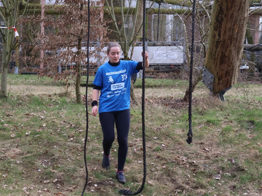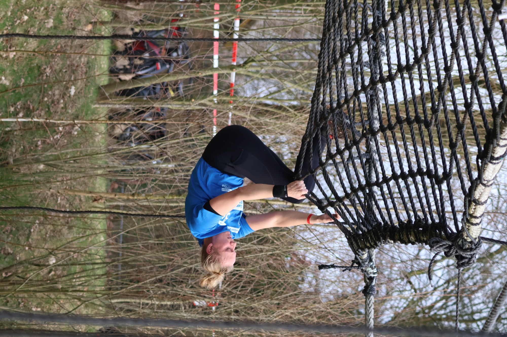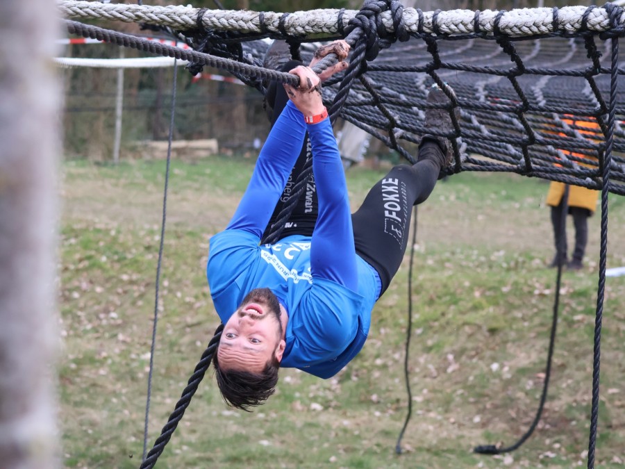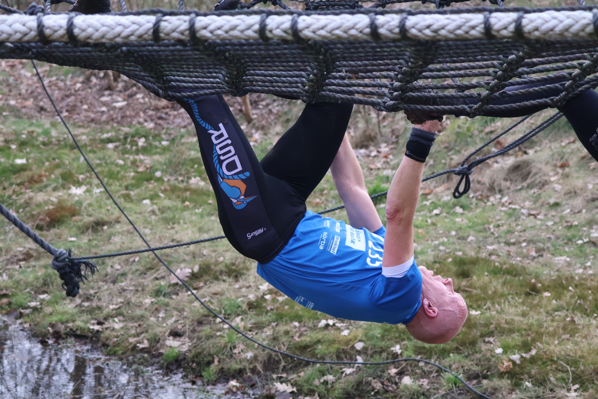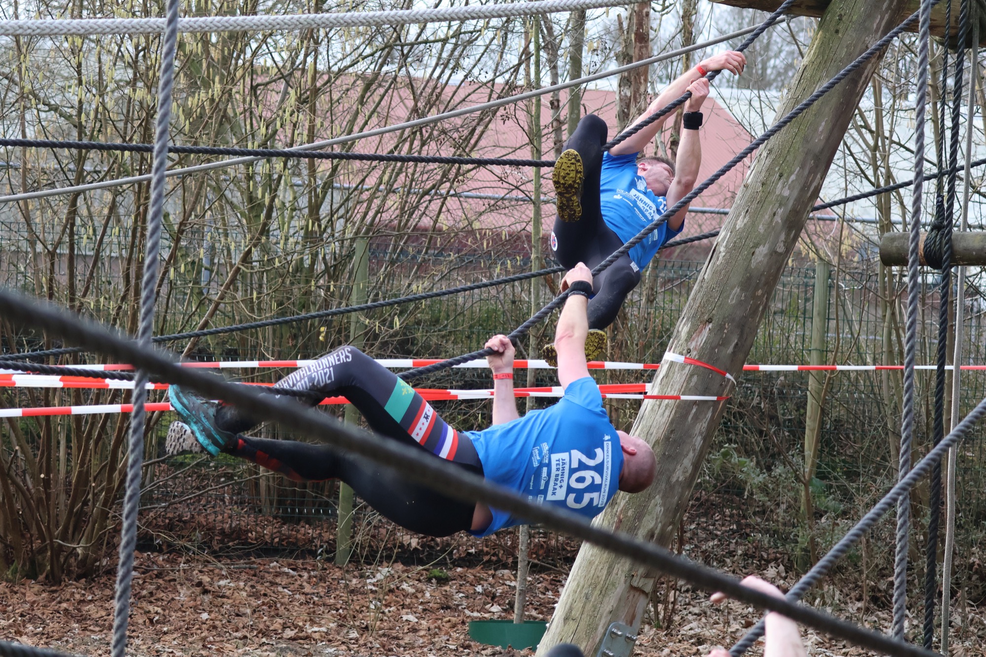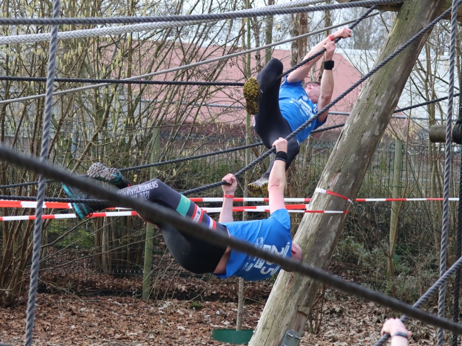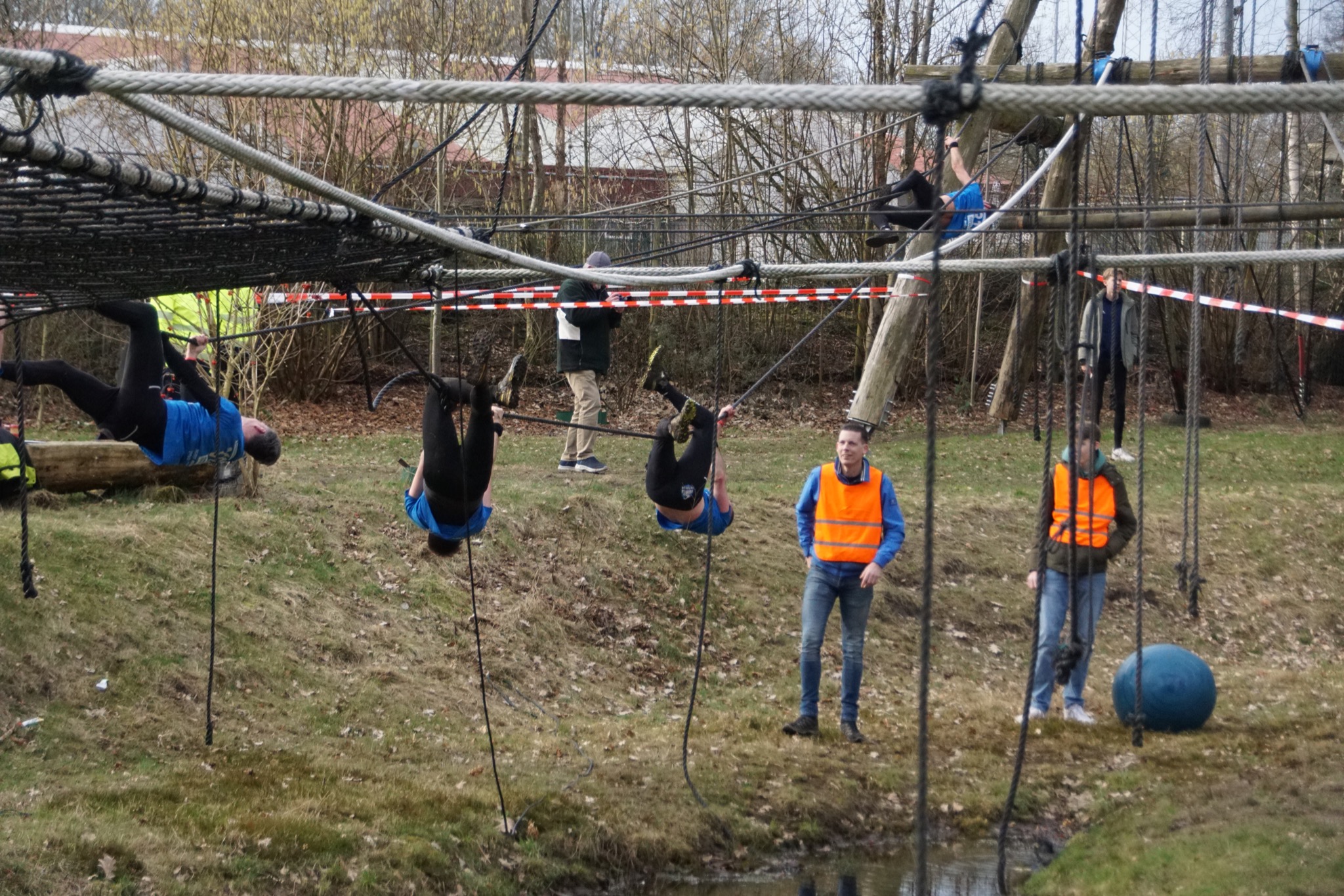 Deelnemers klimmen via het inklimtouw in het horizontale net. het gehele net klimmen ze onderlangs.