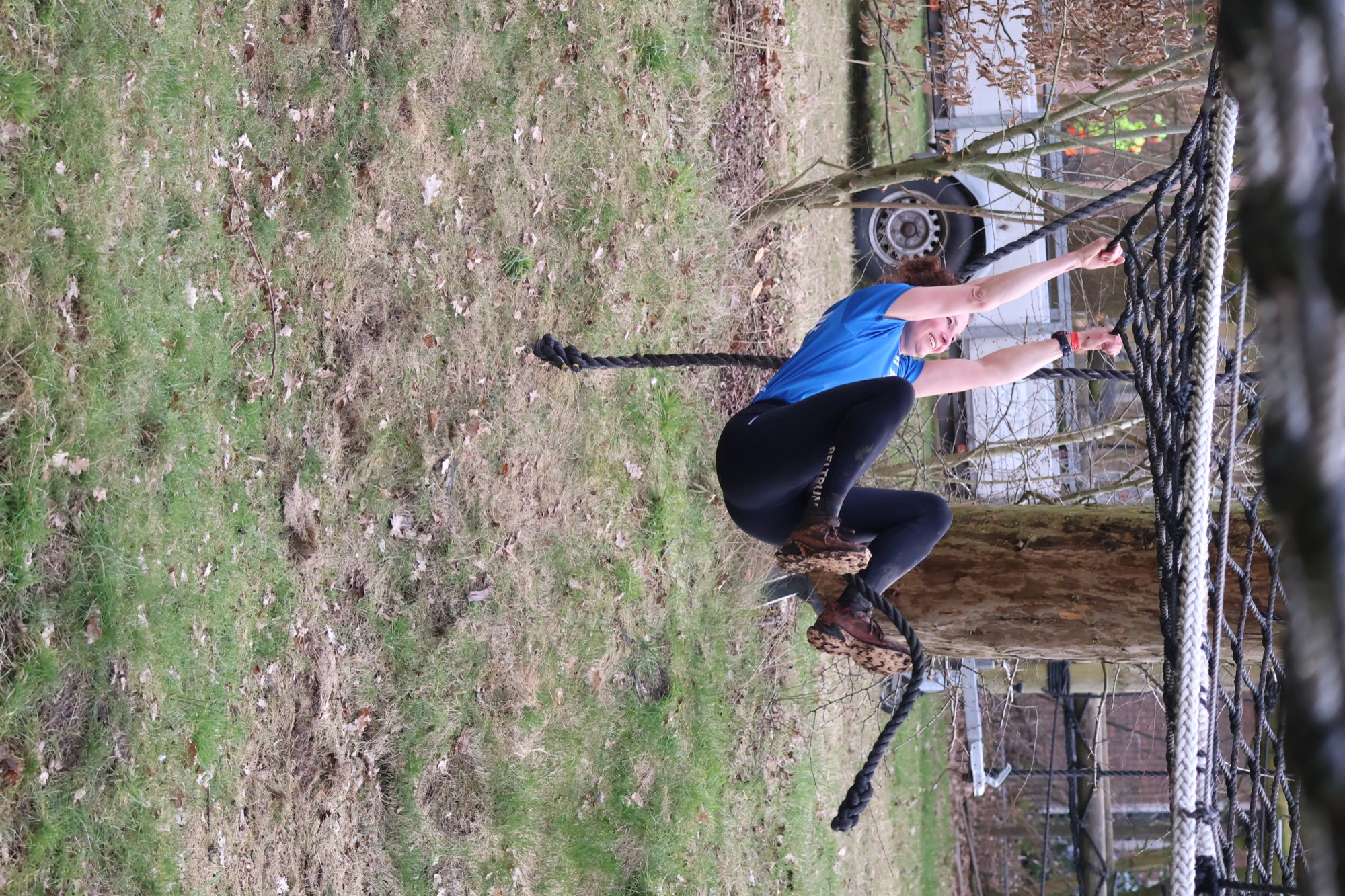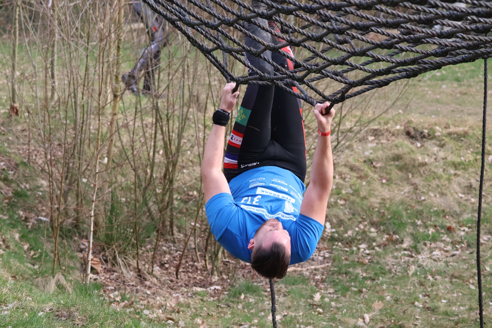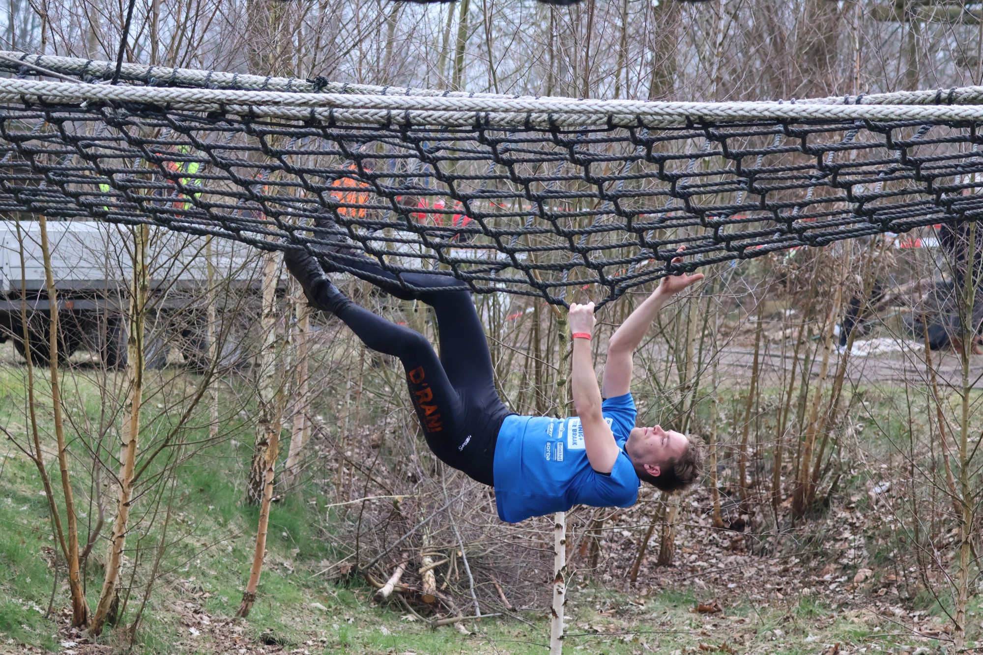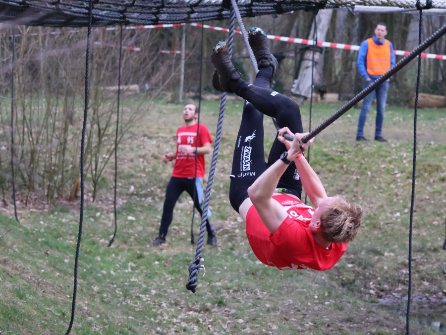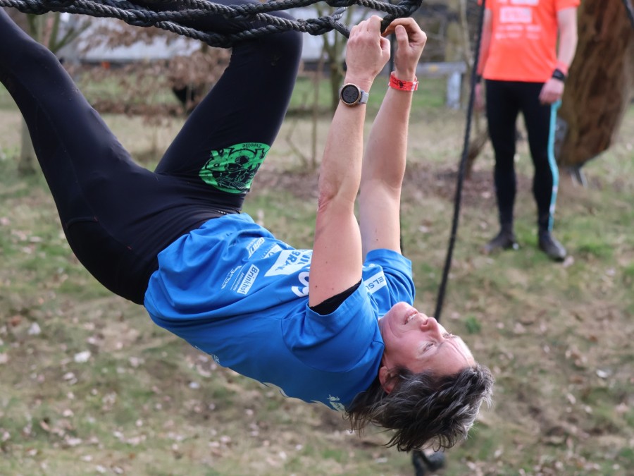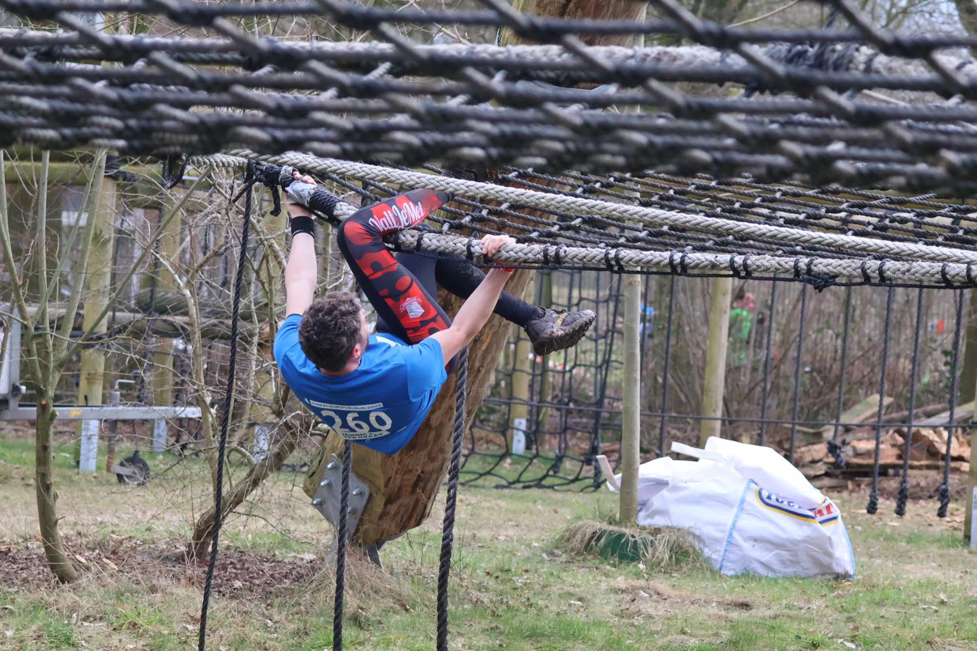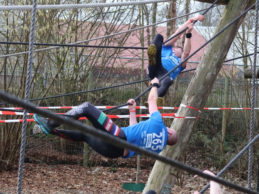 Deelnemers klimmen via het inklimtouw in het horizontale net. het gehele net klimmen ze onderlangs.