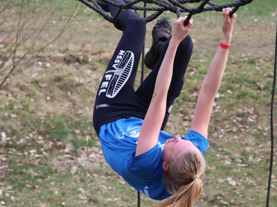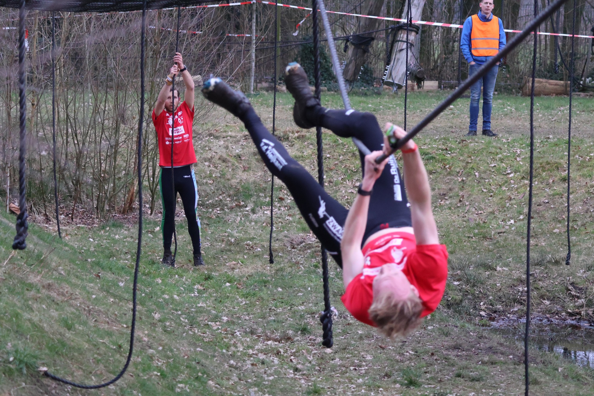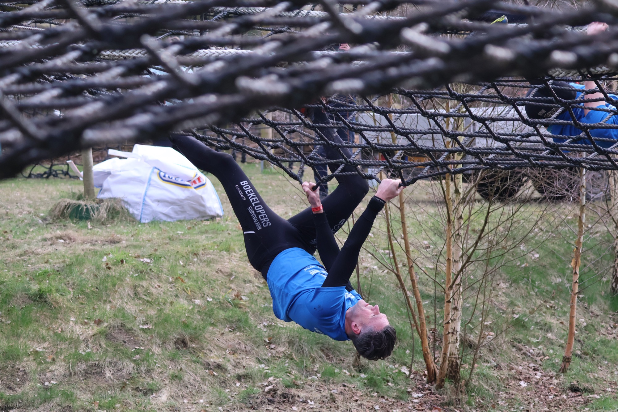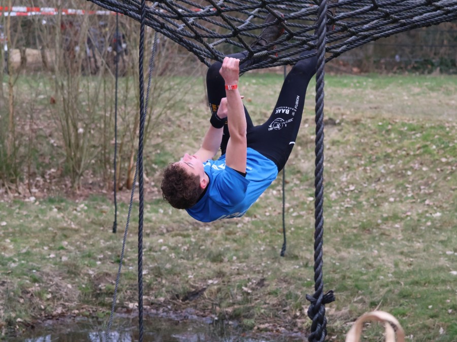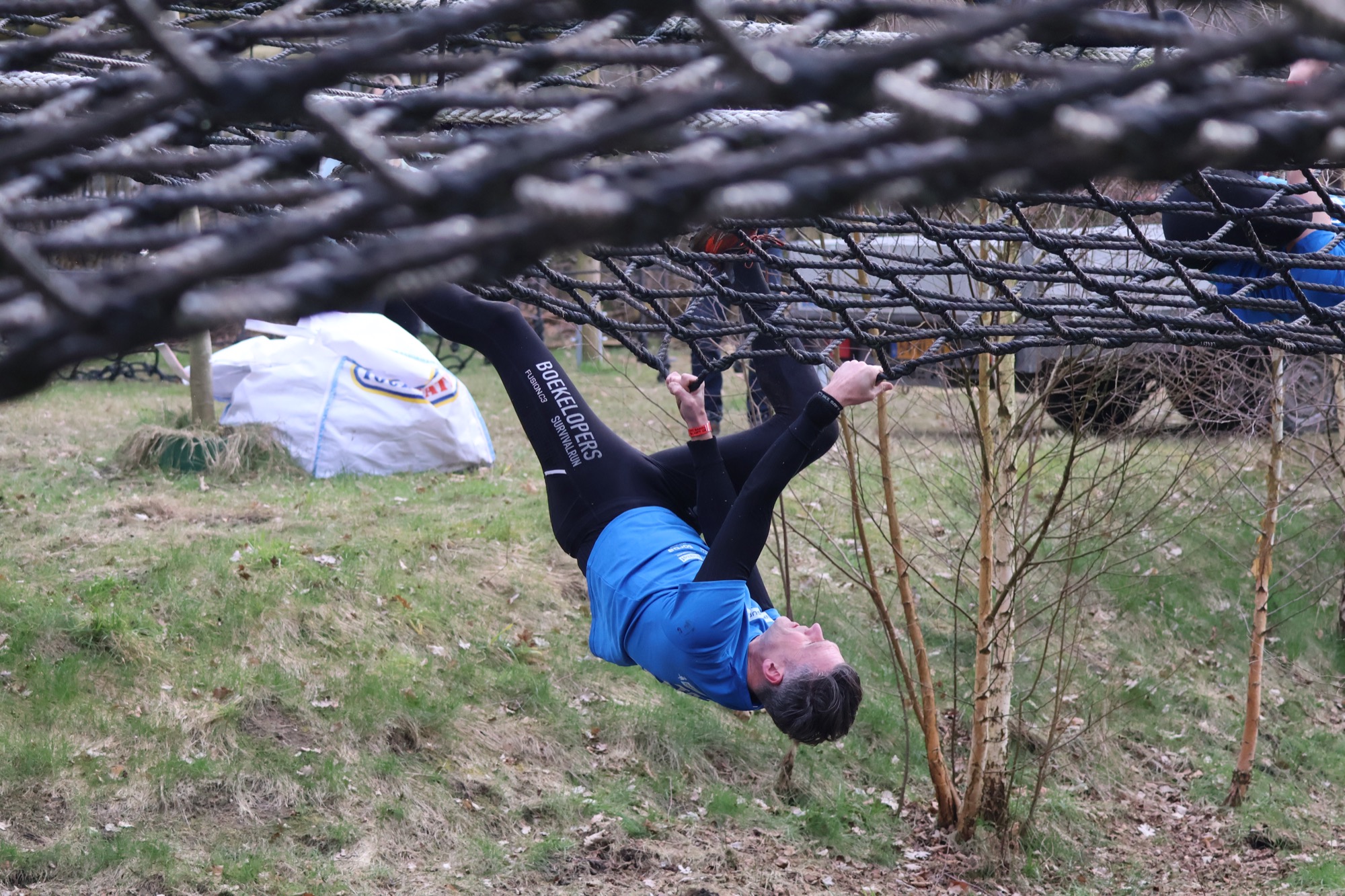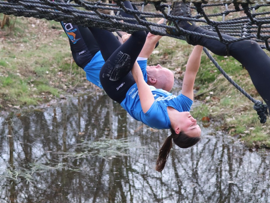 Deelnemers klimmen via het inklimtouw in het horizontale net. het gehele net klimmen ze onderlangs.
