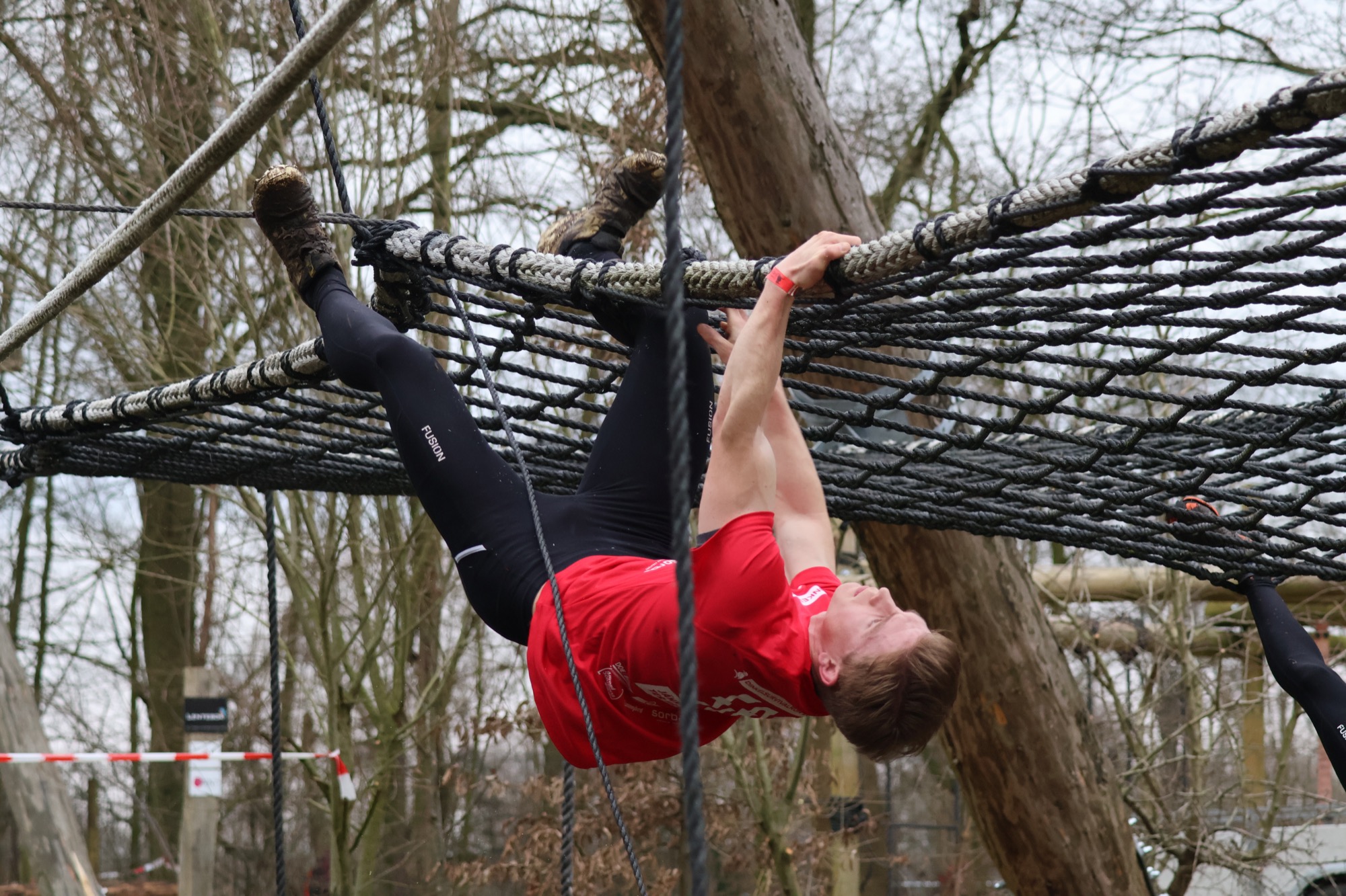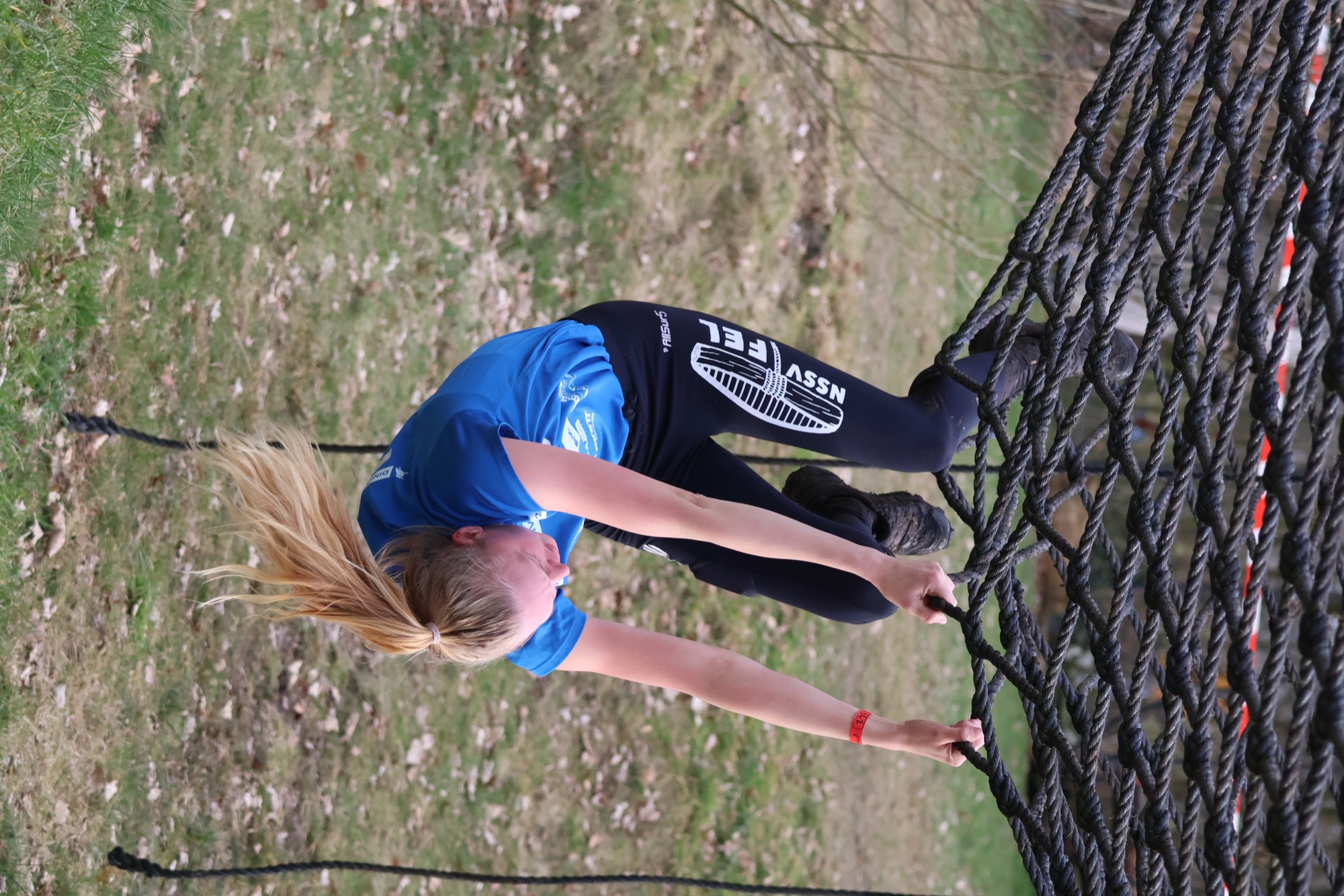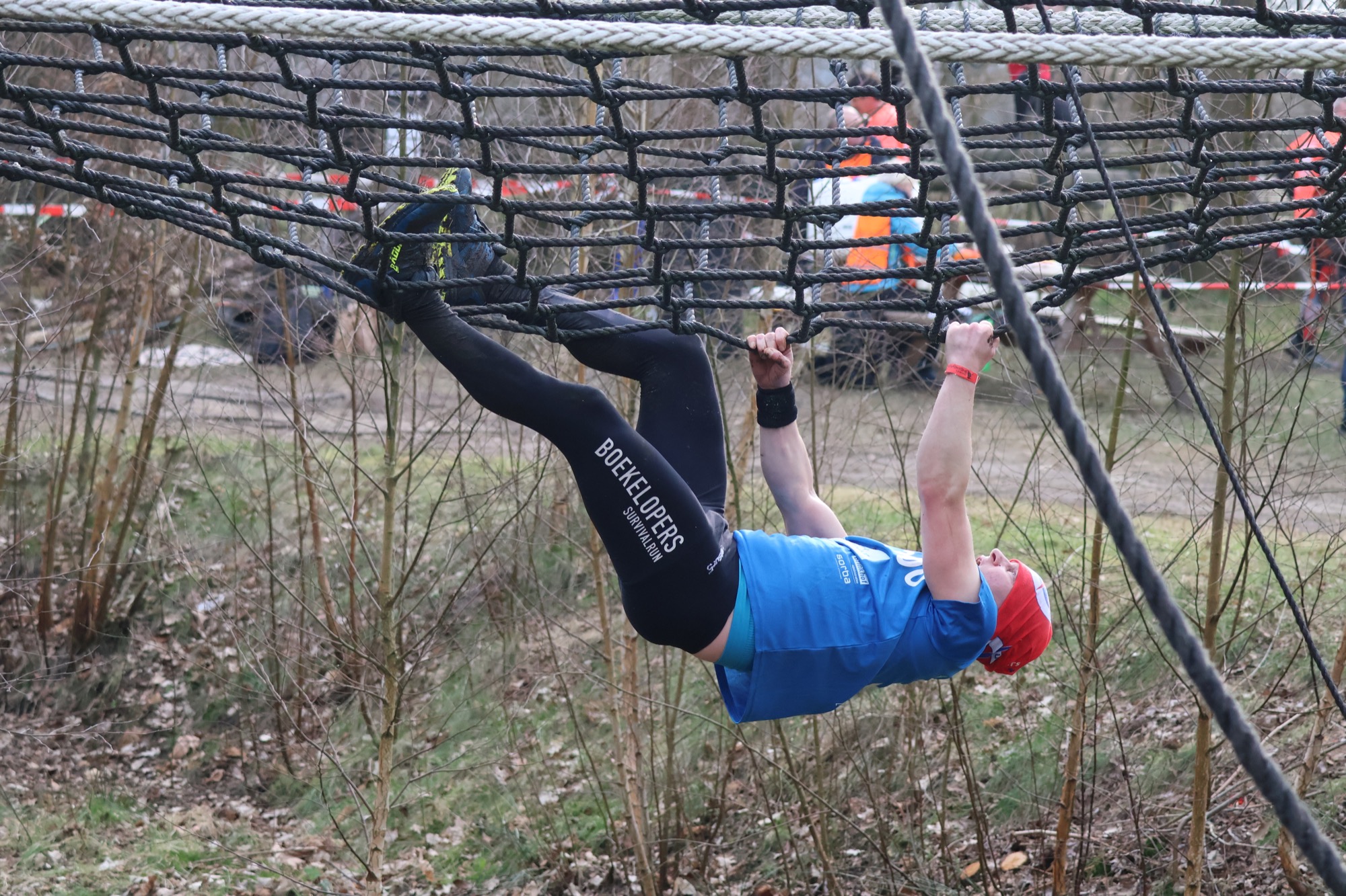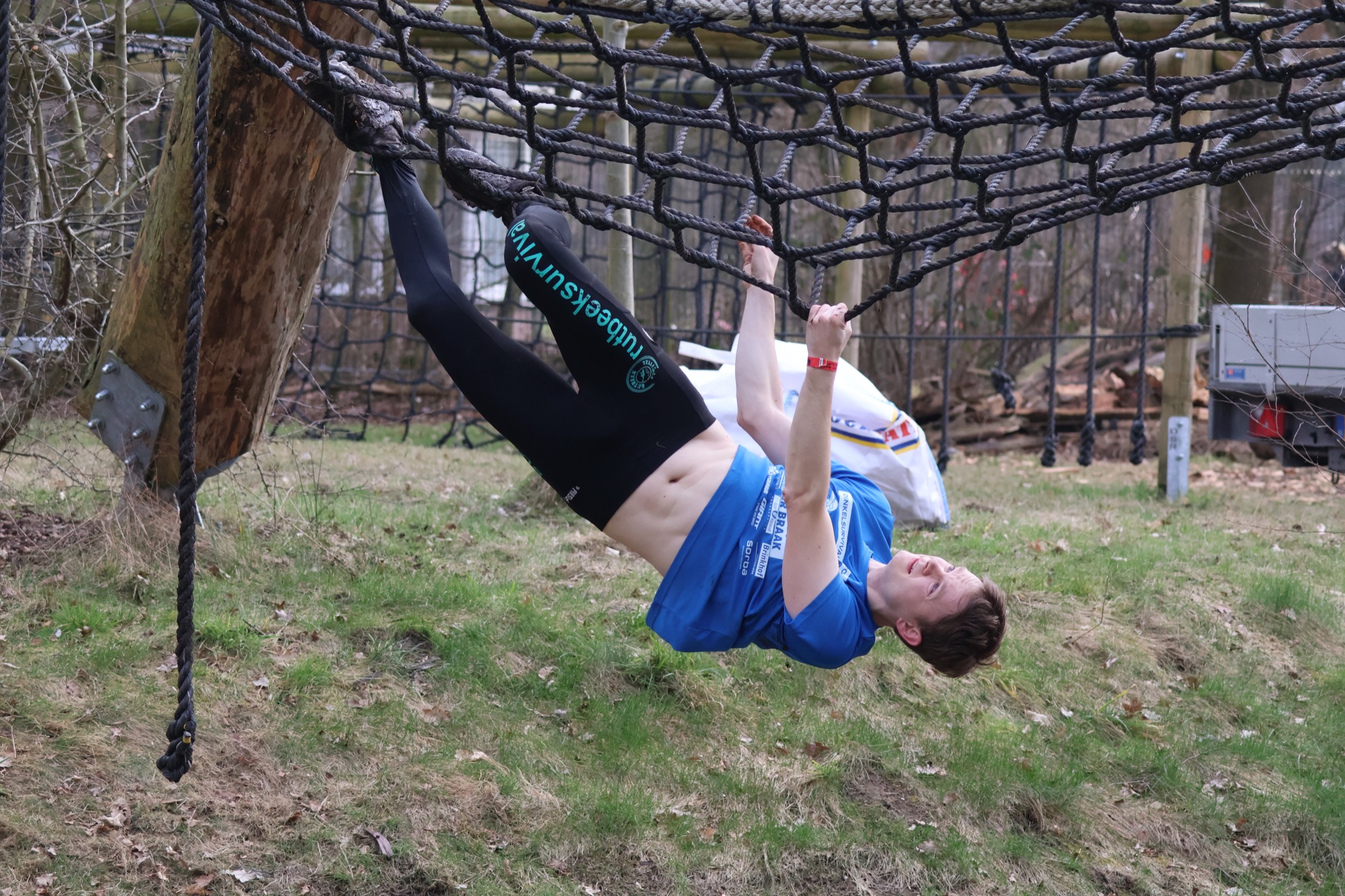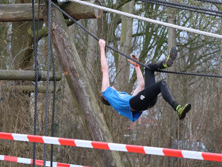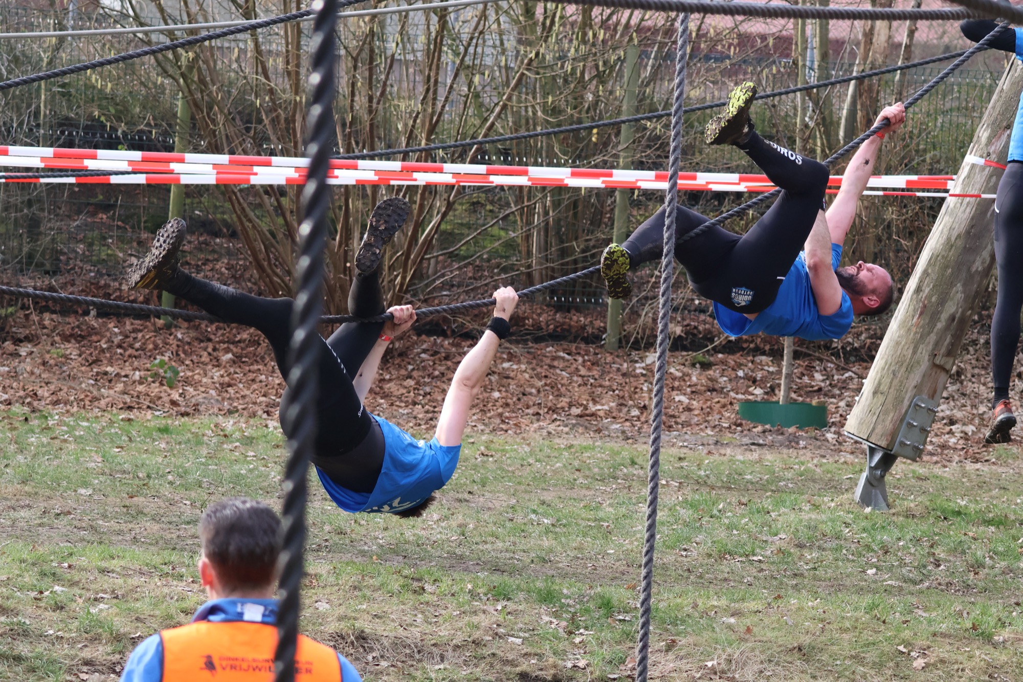 Deelnemers klimmen via het inklimtouw in het horizontale net. het gehele net klimmen ze onderlangs.