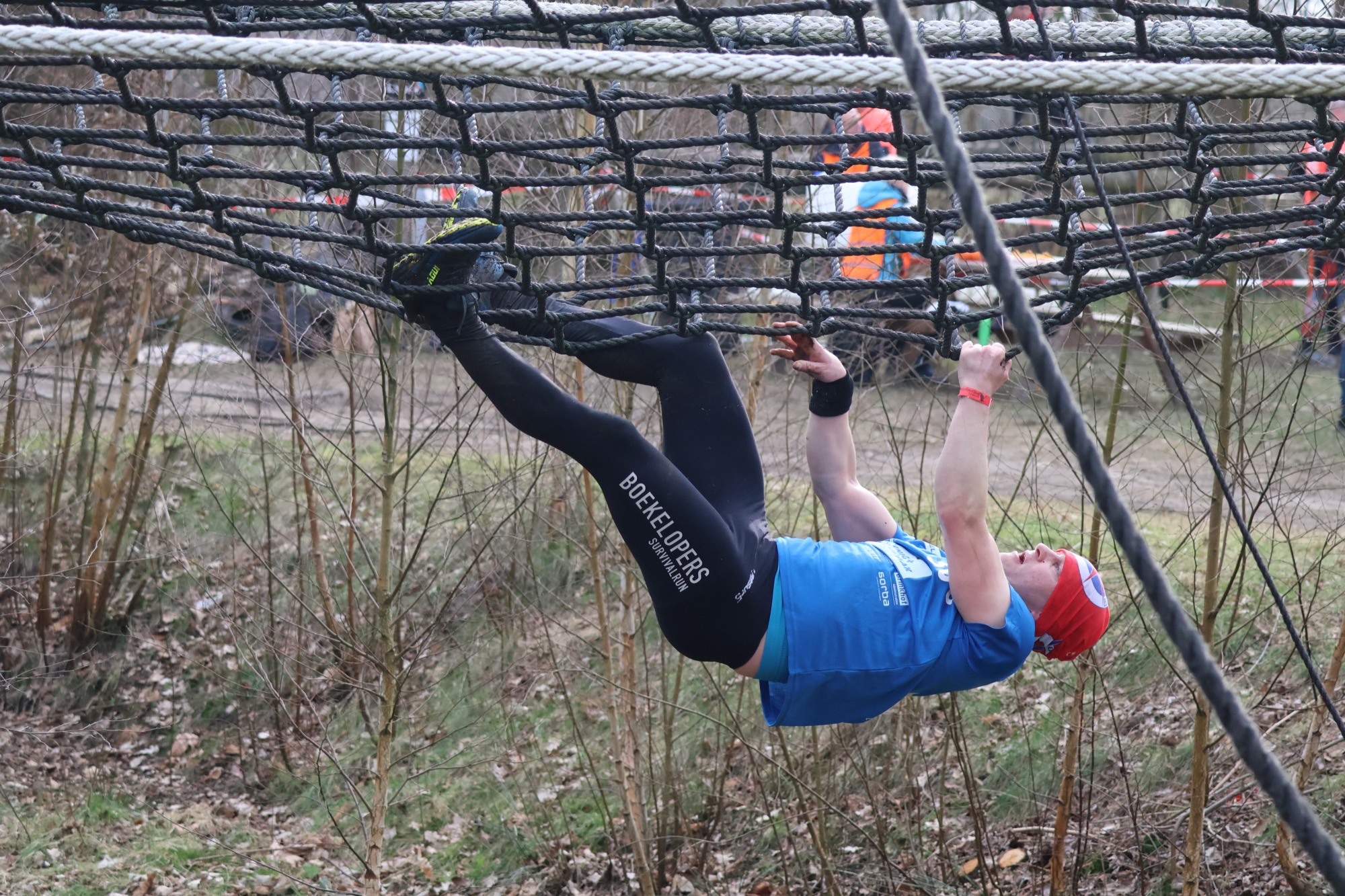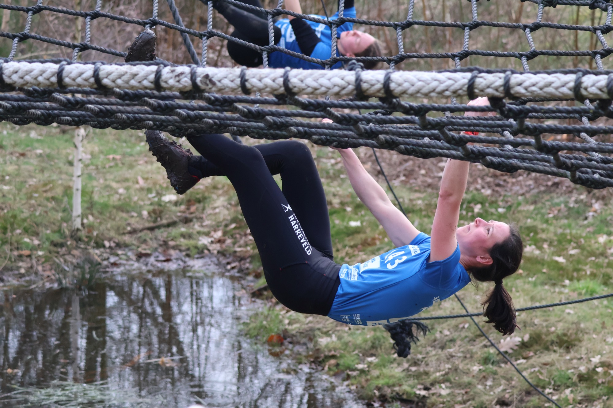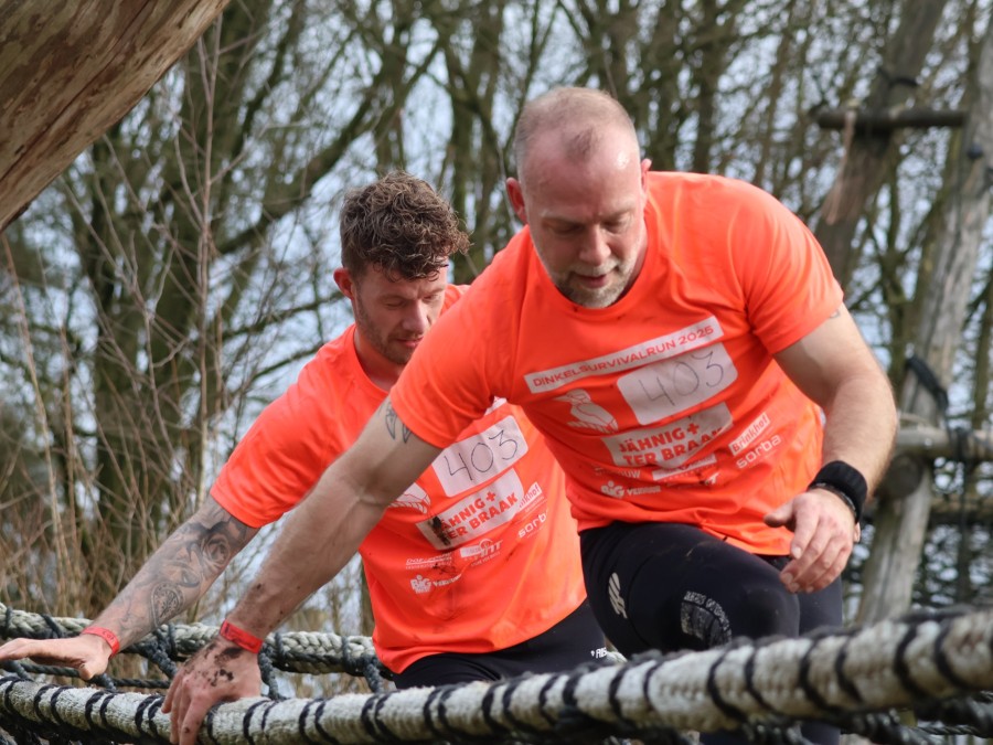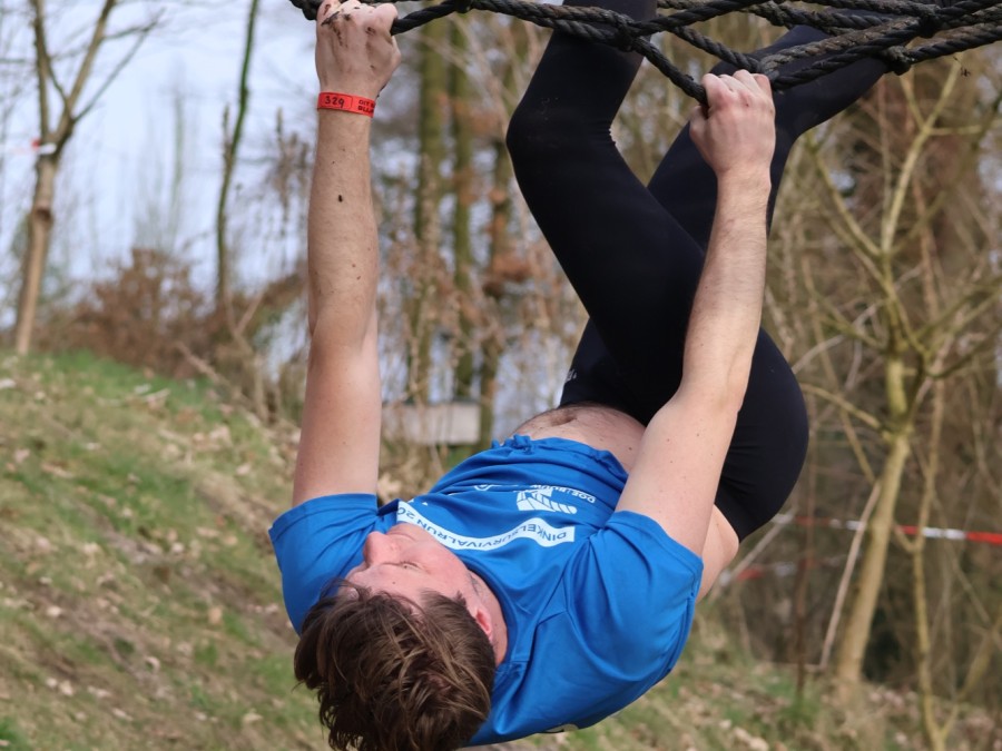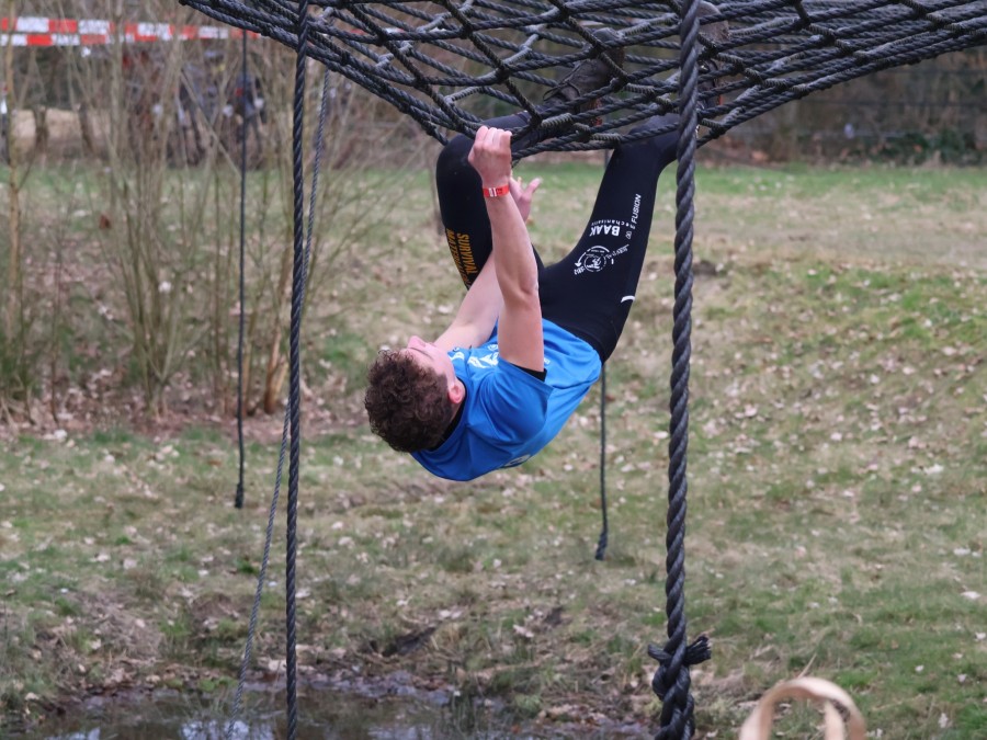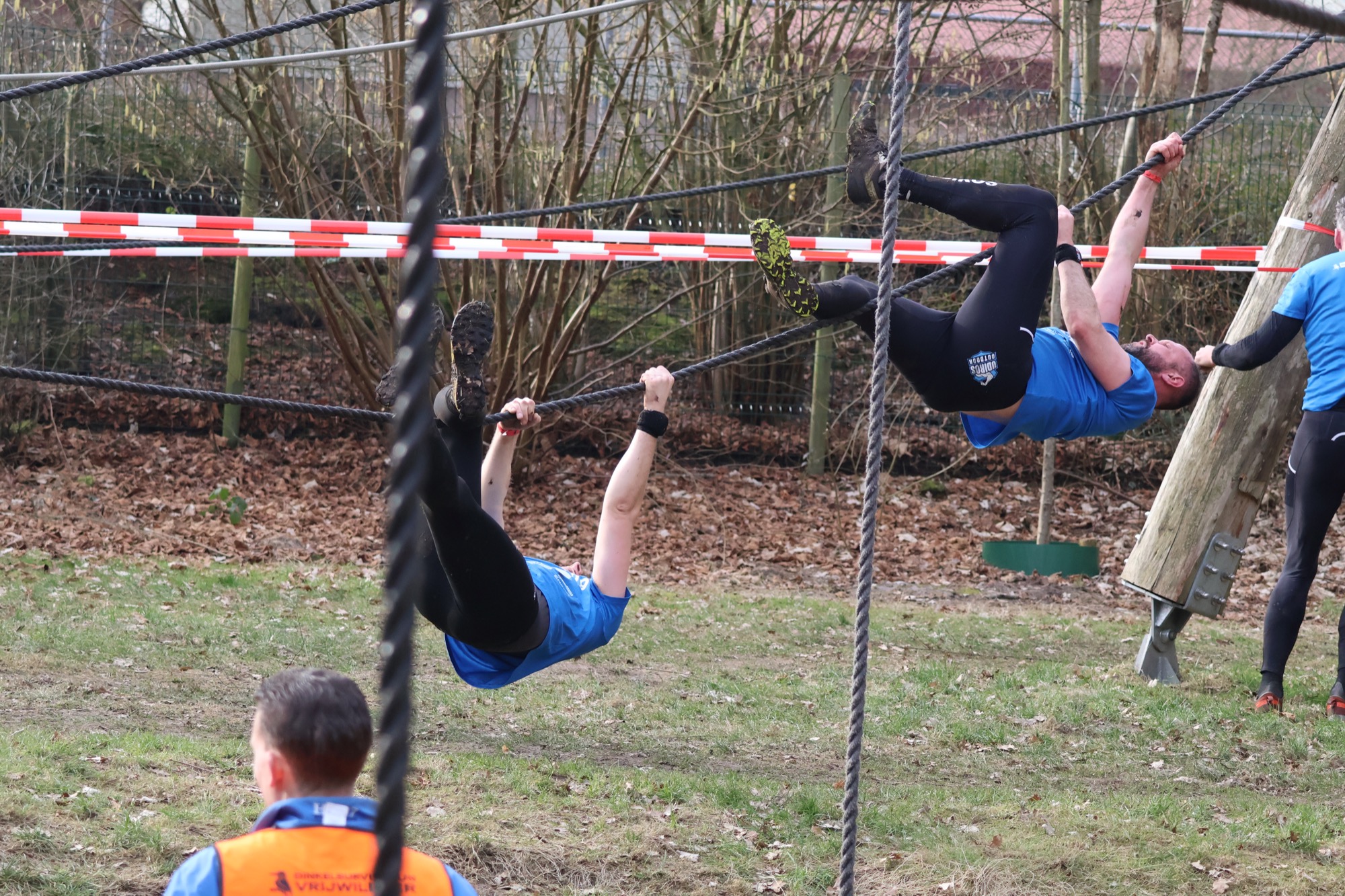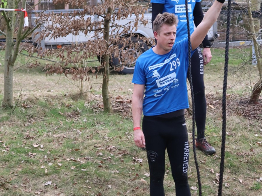 Deelnemers klimmen via het inklimtouw in het horizontale net. het gehele net klimmen ze onderlangs.