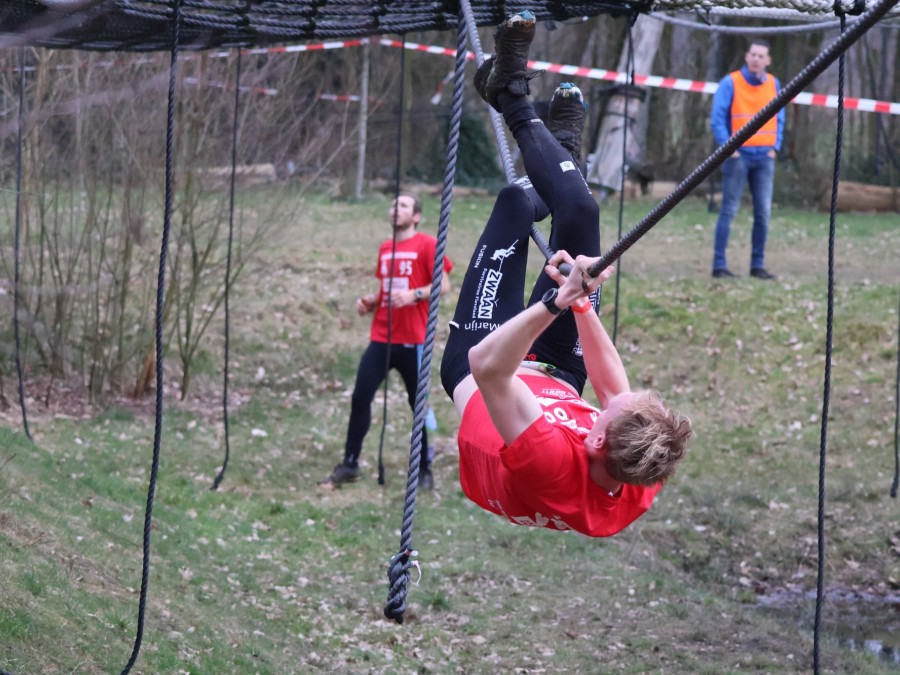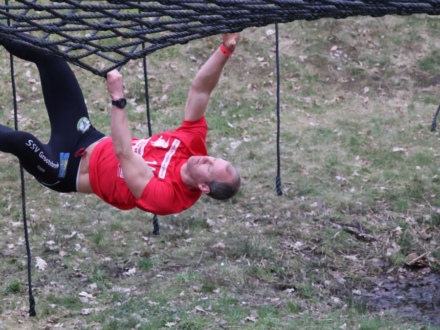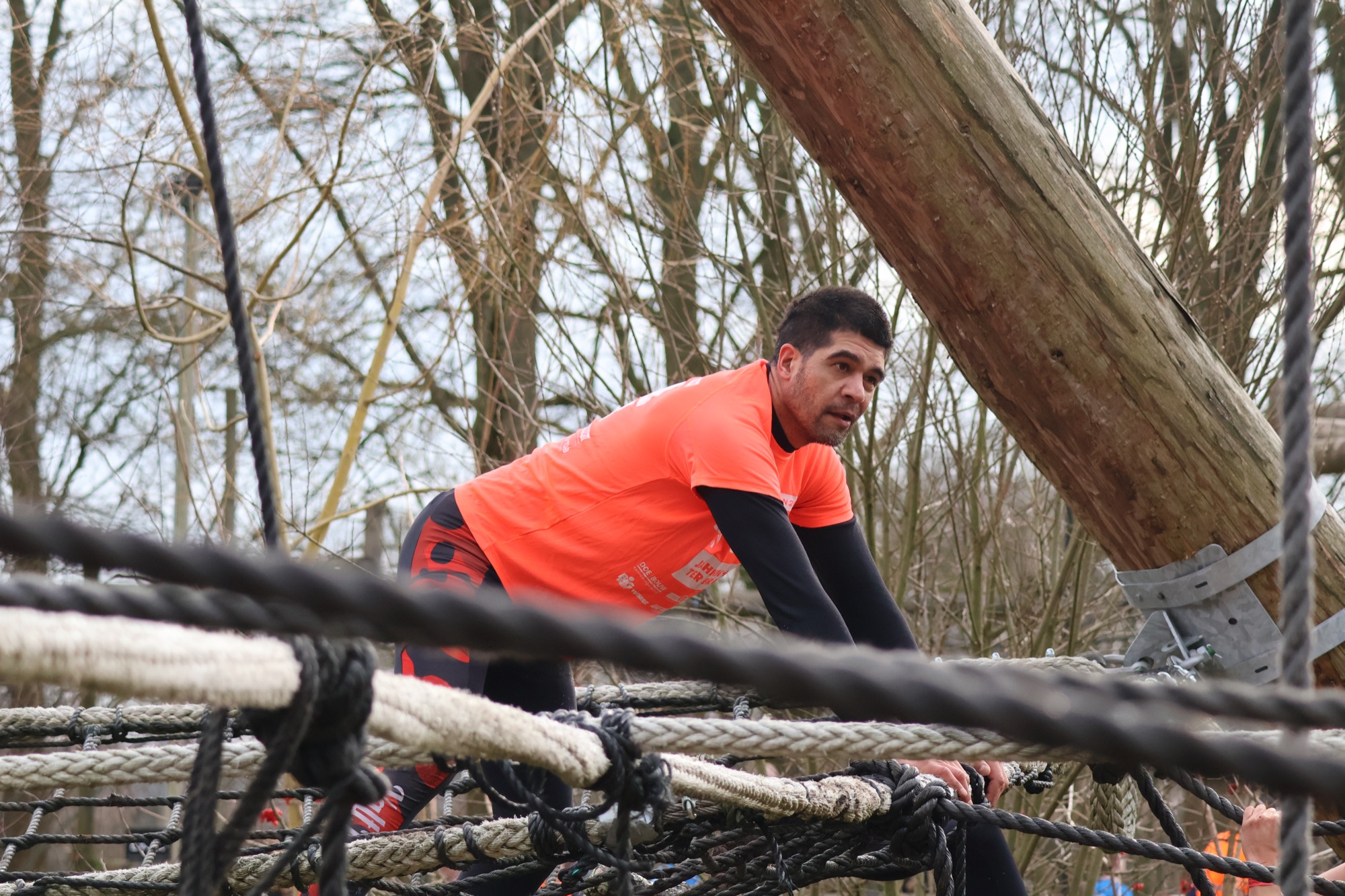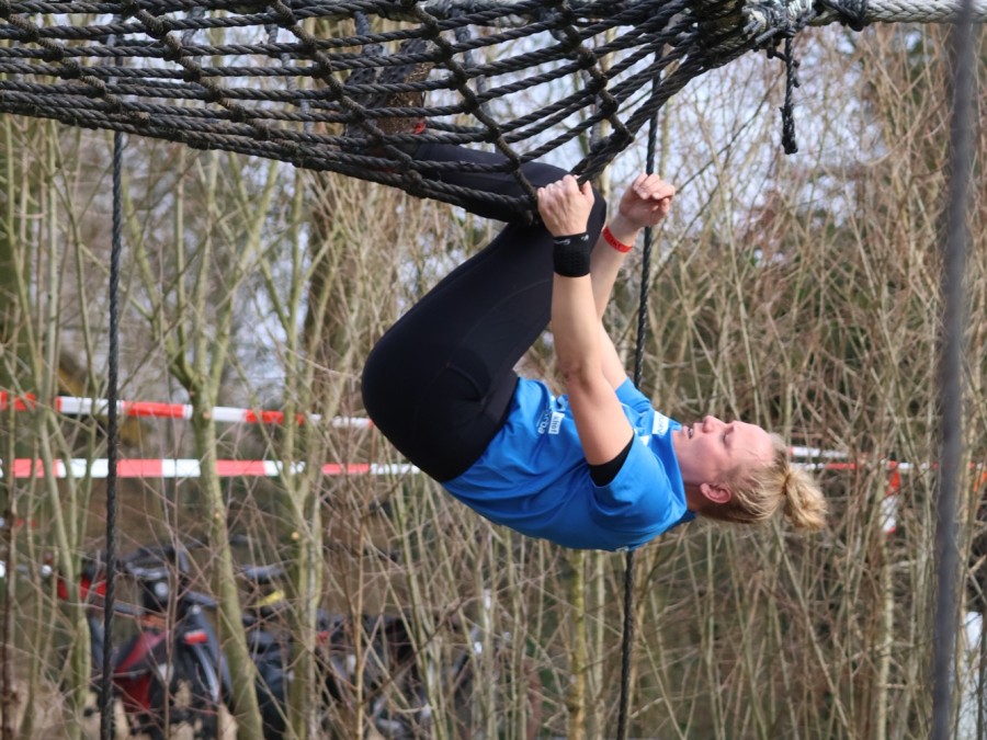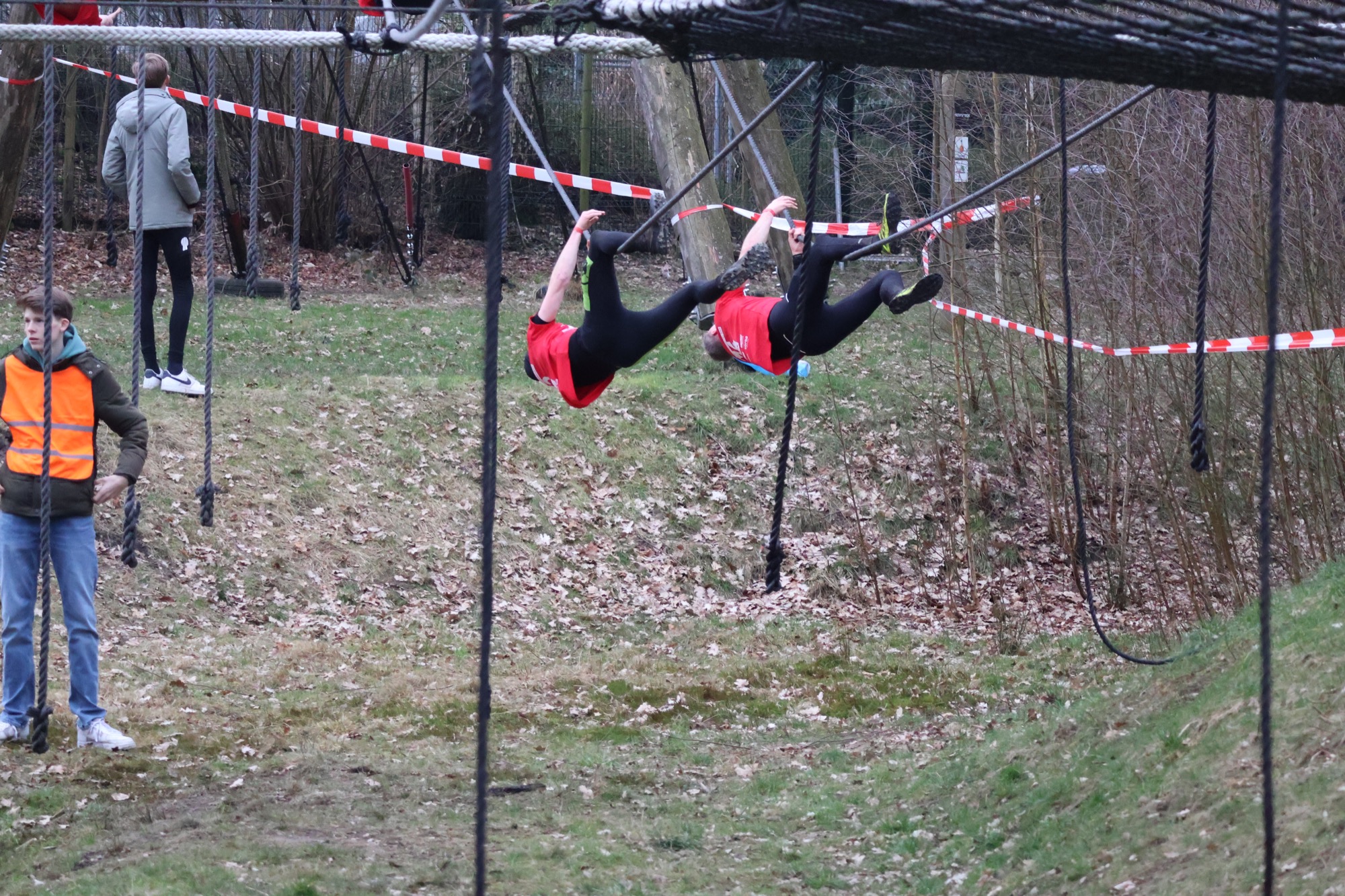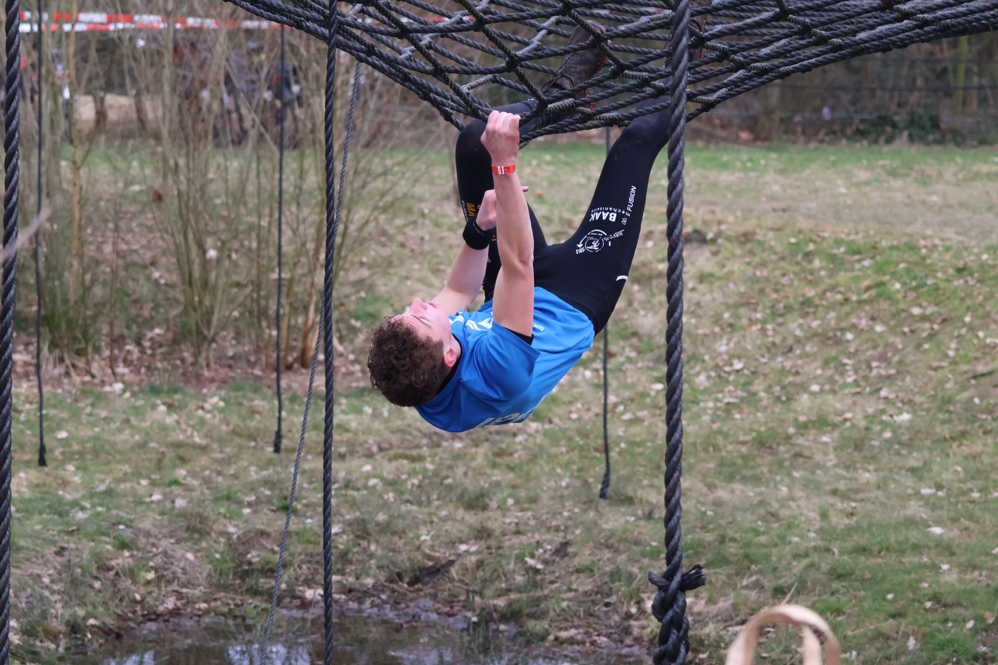 Deelnemers klimmen via het inklimtouw in het horizontale net. het gehele net klimmen ze onderlangs.