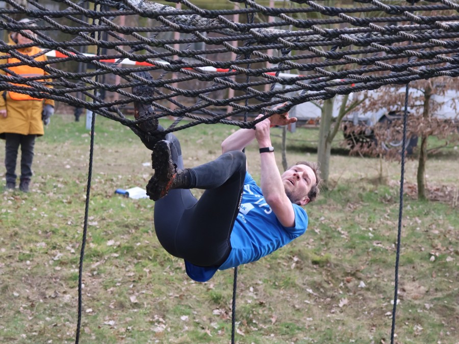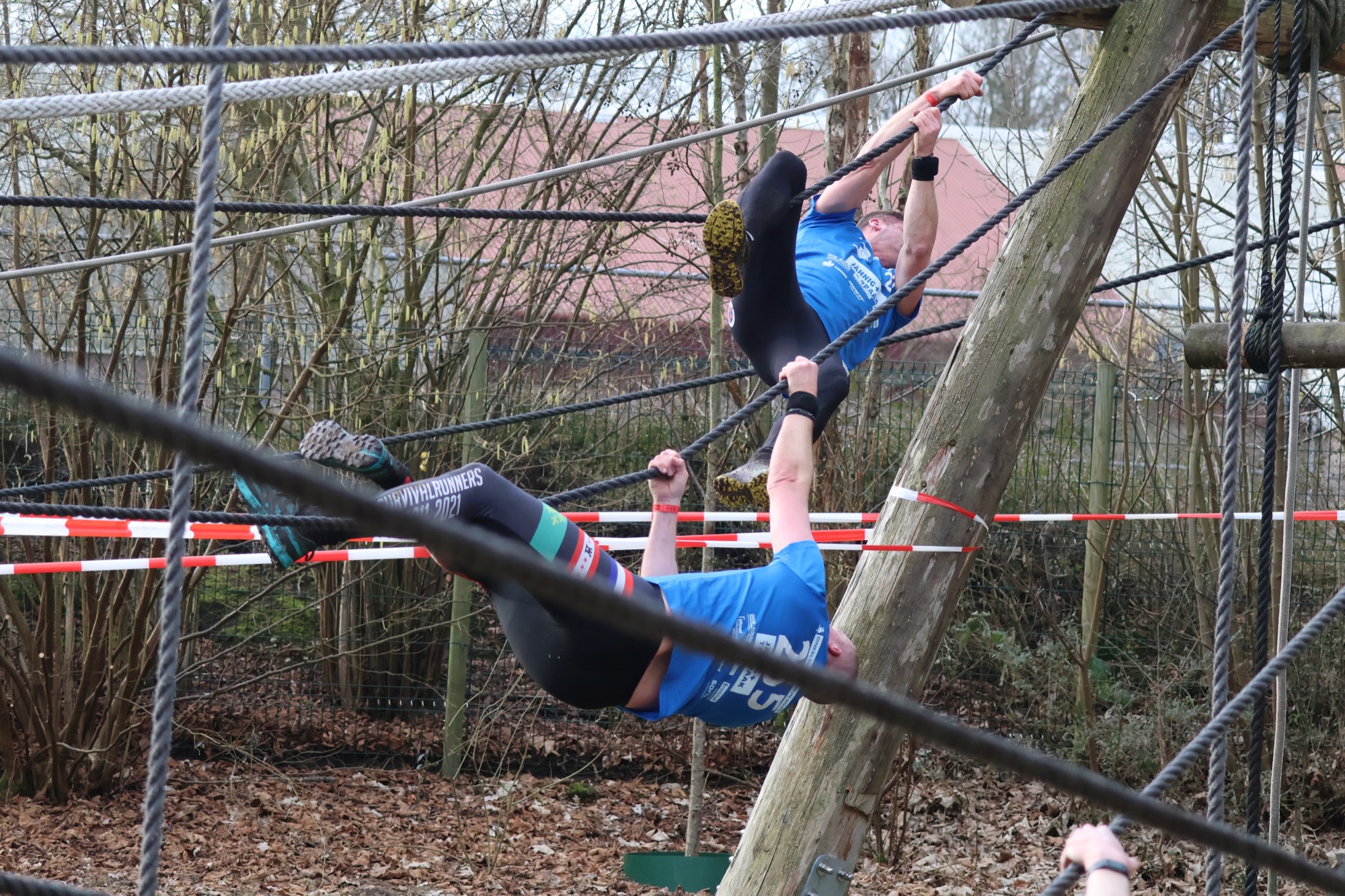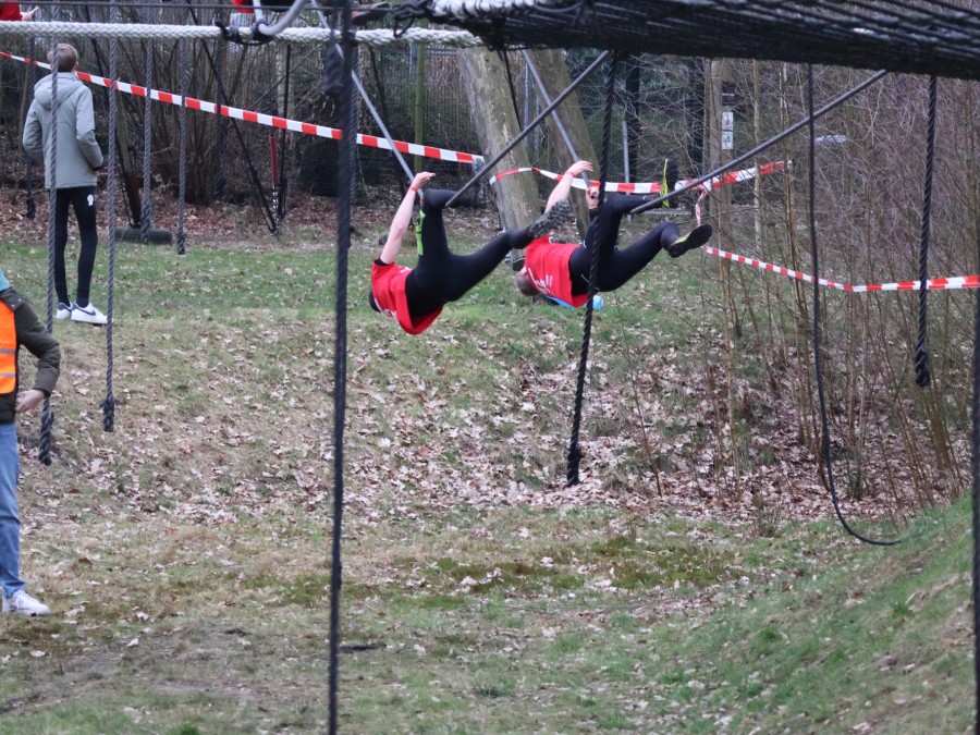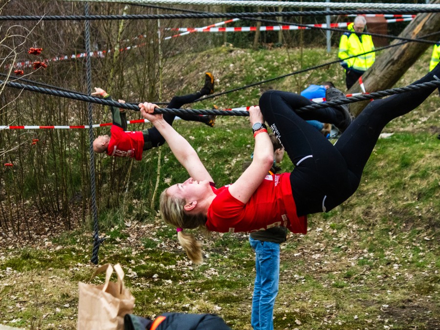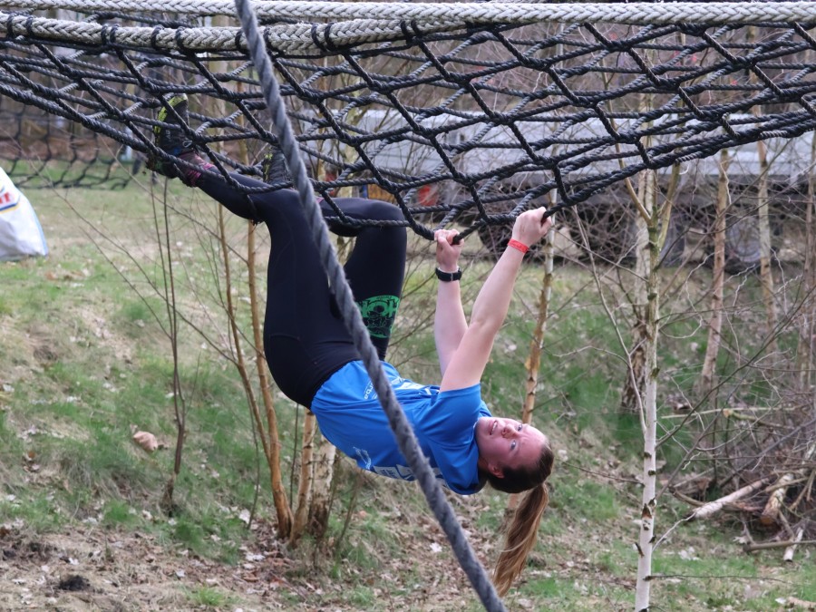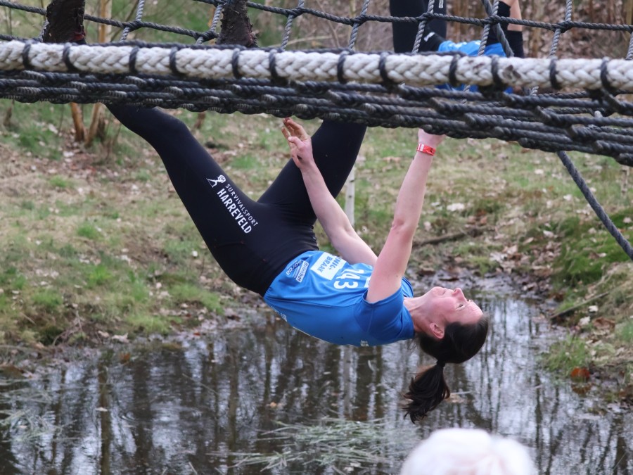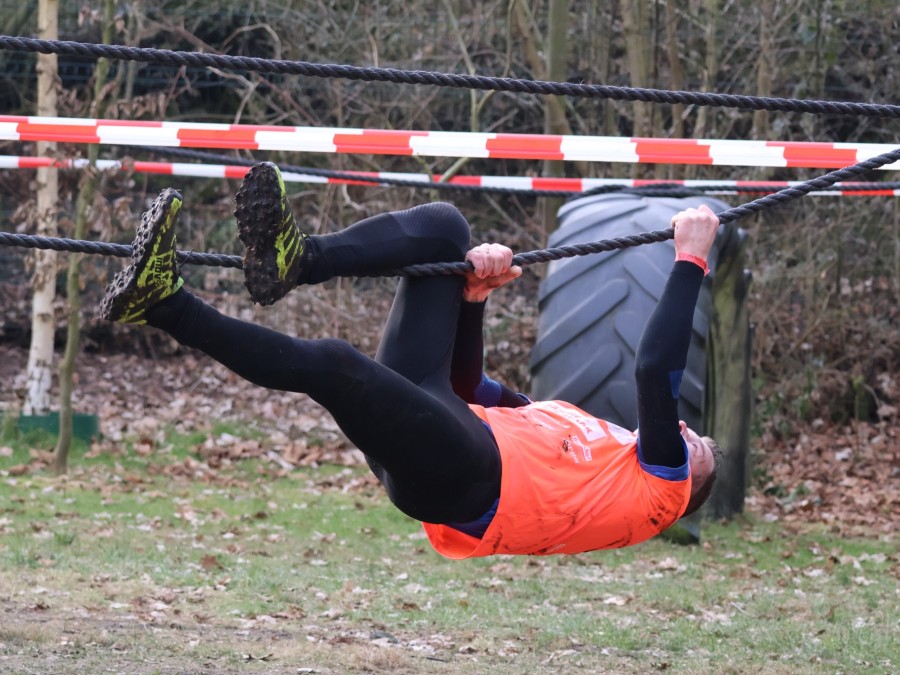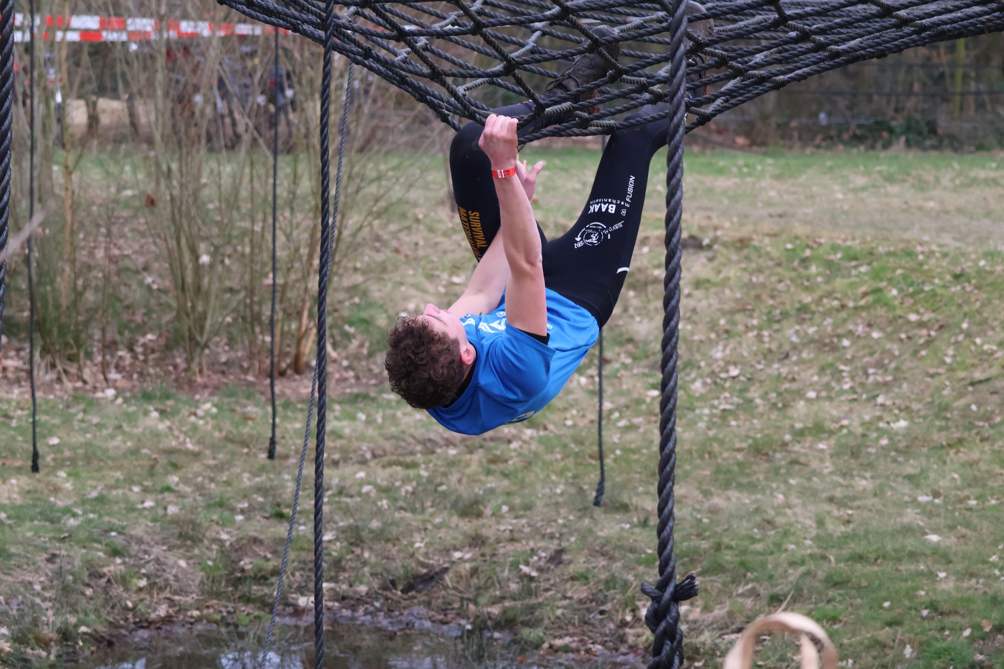Deelnemers klimmen via het inklimtouw in het horizontale net. het gehele net klimmen ze onderlangs.