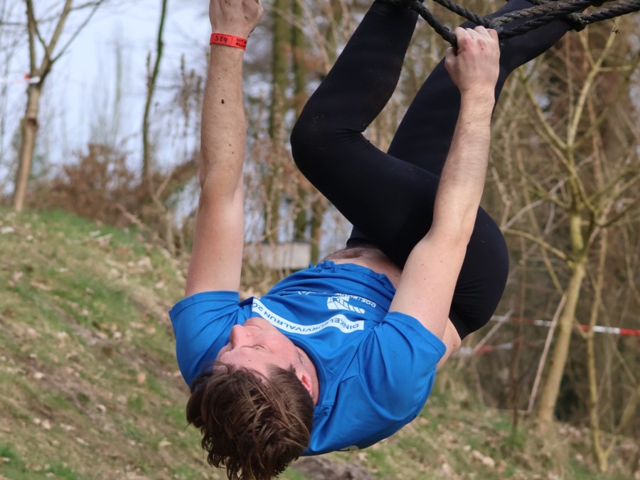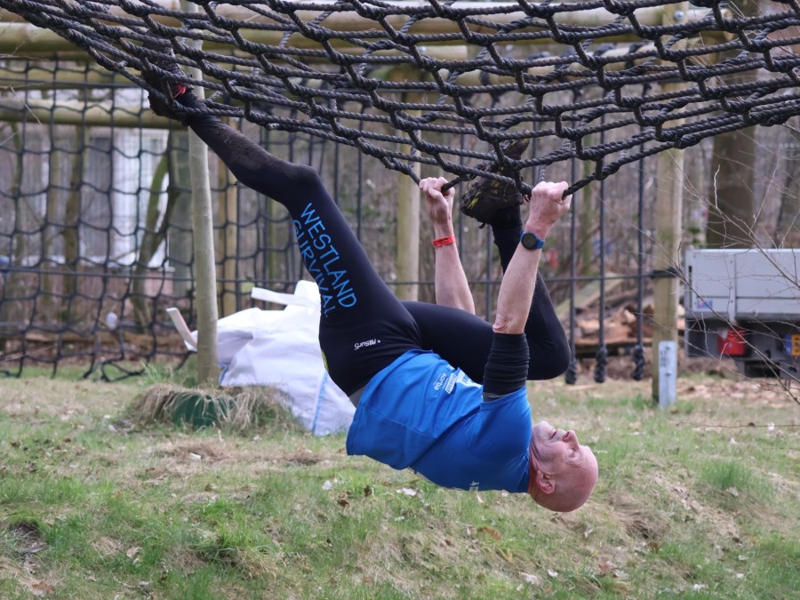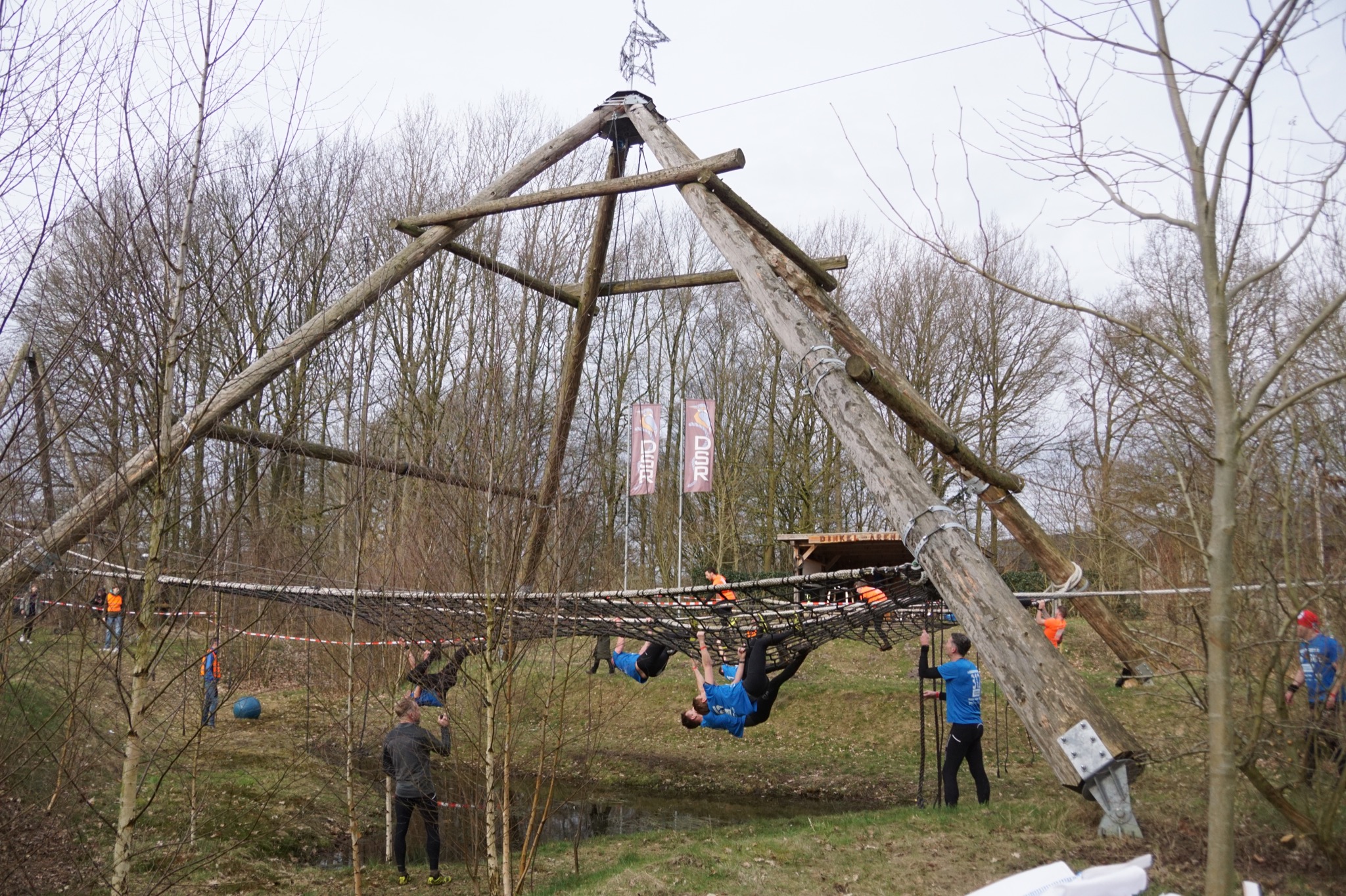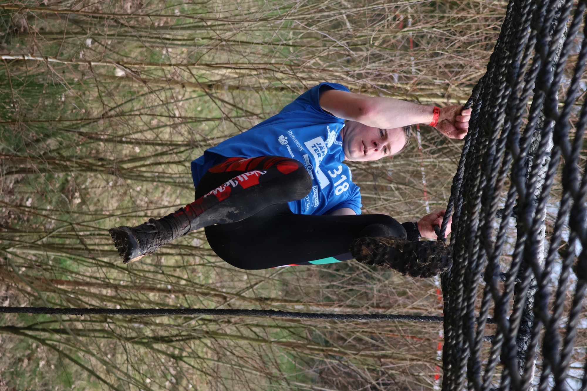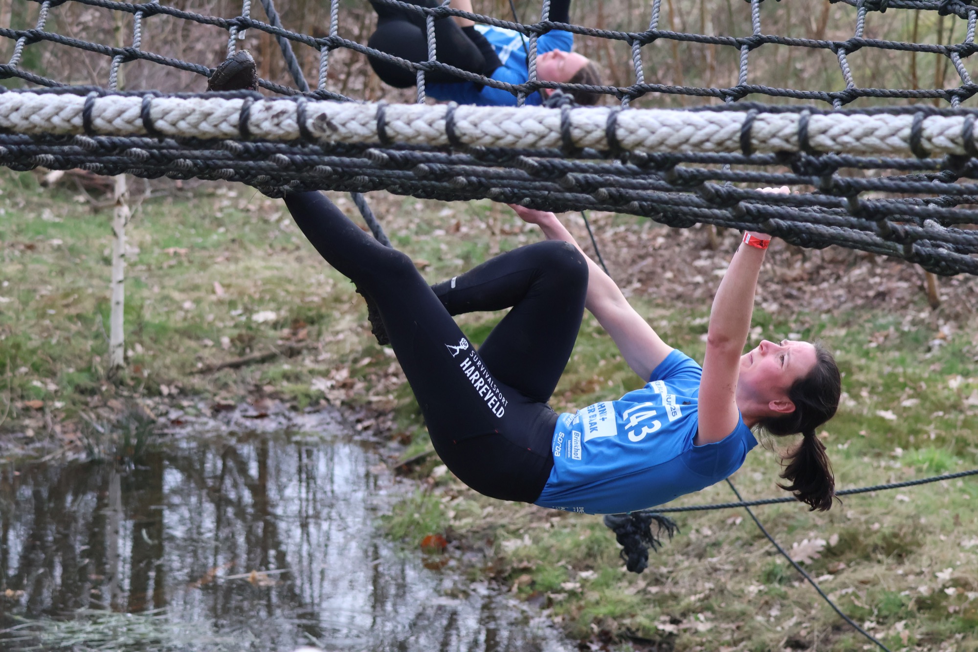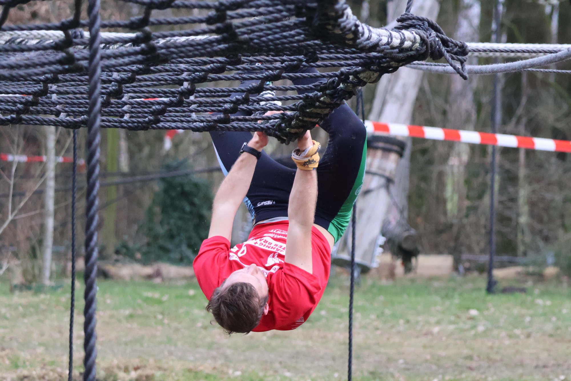 Deelnemers klimmen via het inklimtouw in het horizontale net. het gehele net klimmen ze onderlangs.