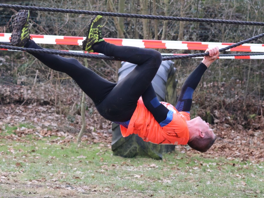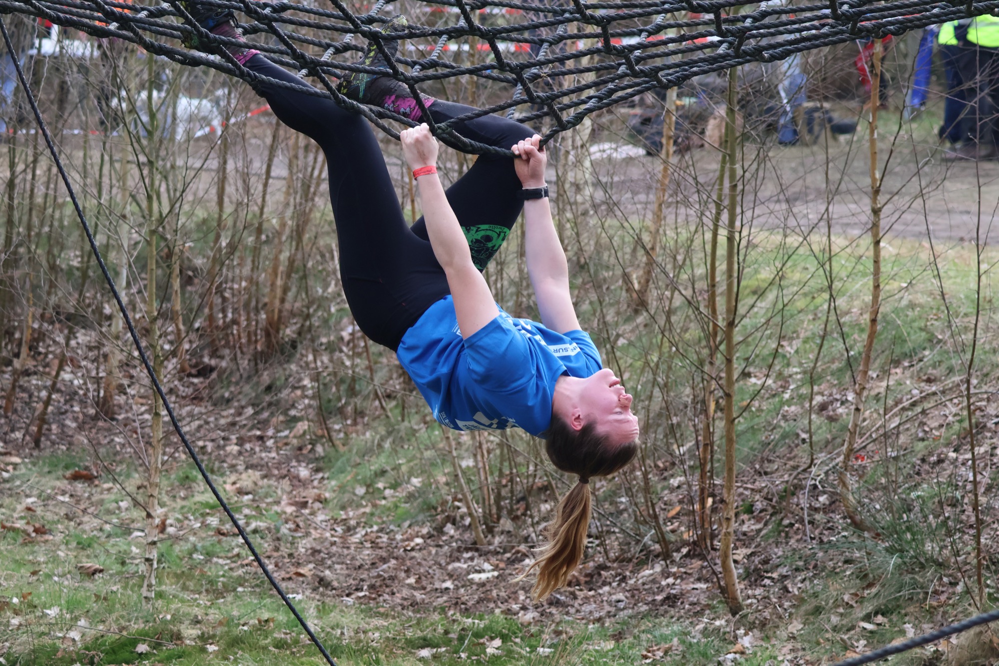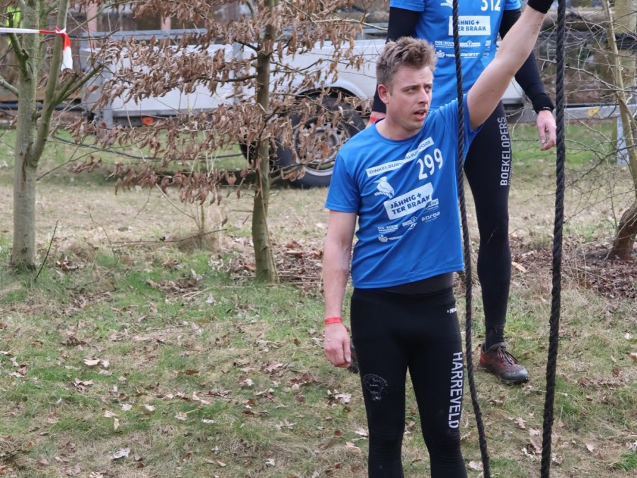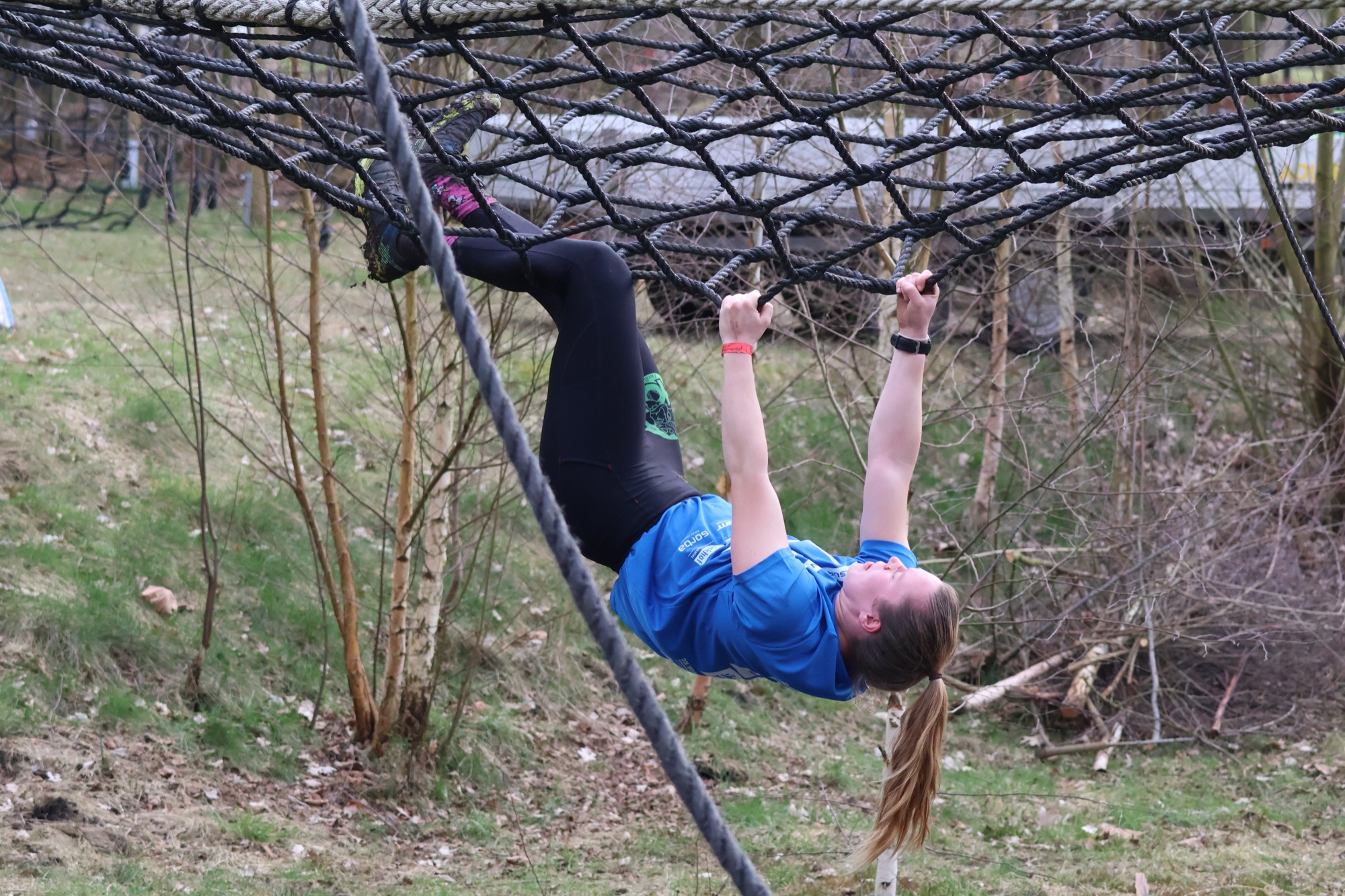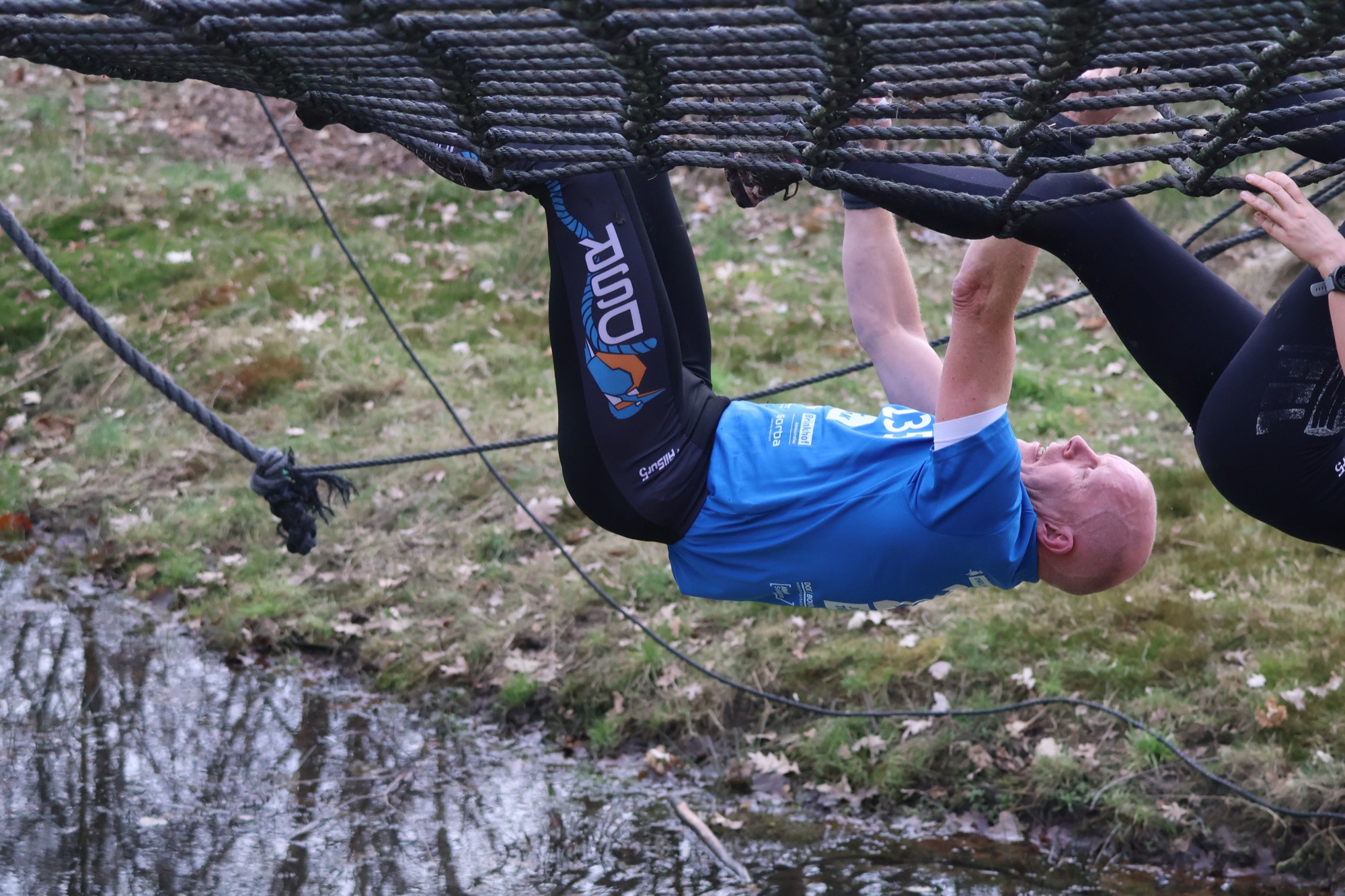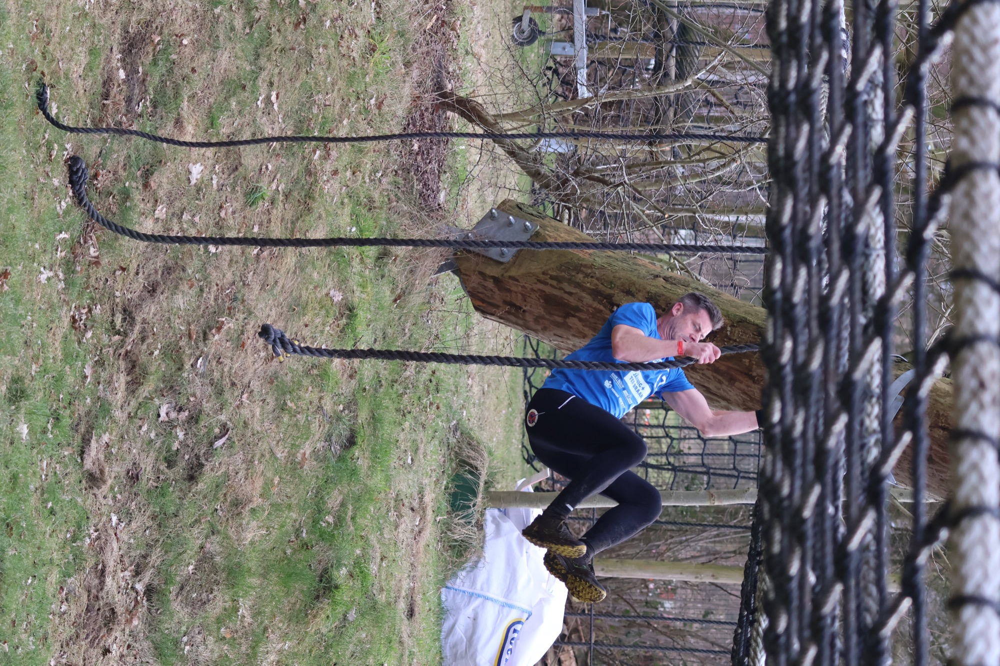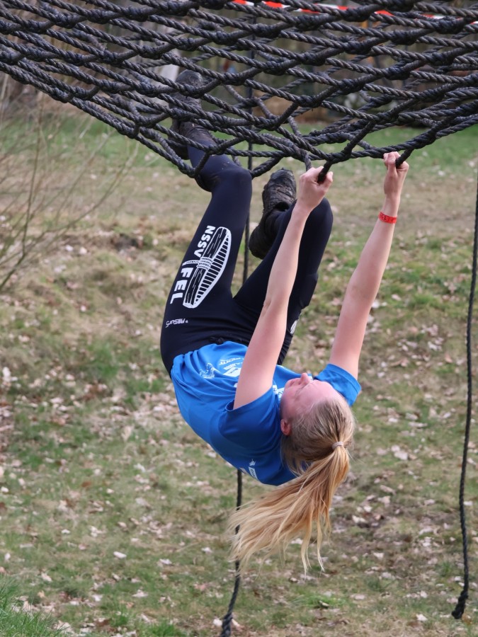 Deelnemers klimmen via het inklimtouw in het horizontale net. het gehele net klimmen ze onderlangs.