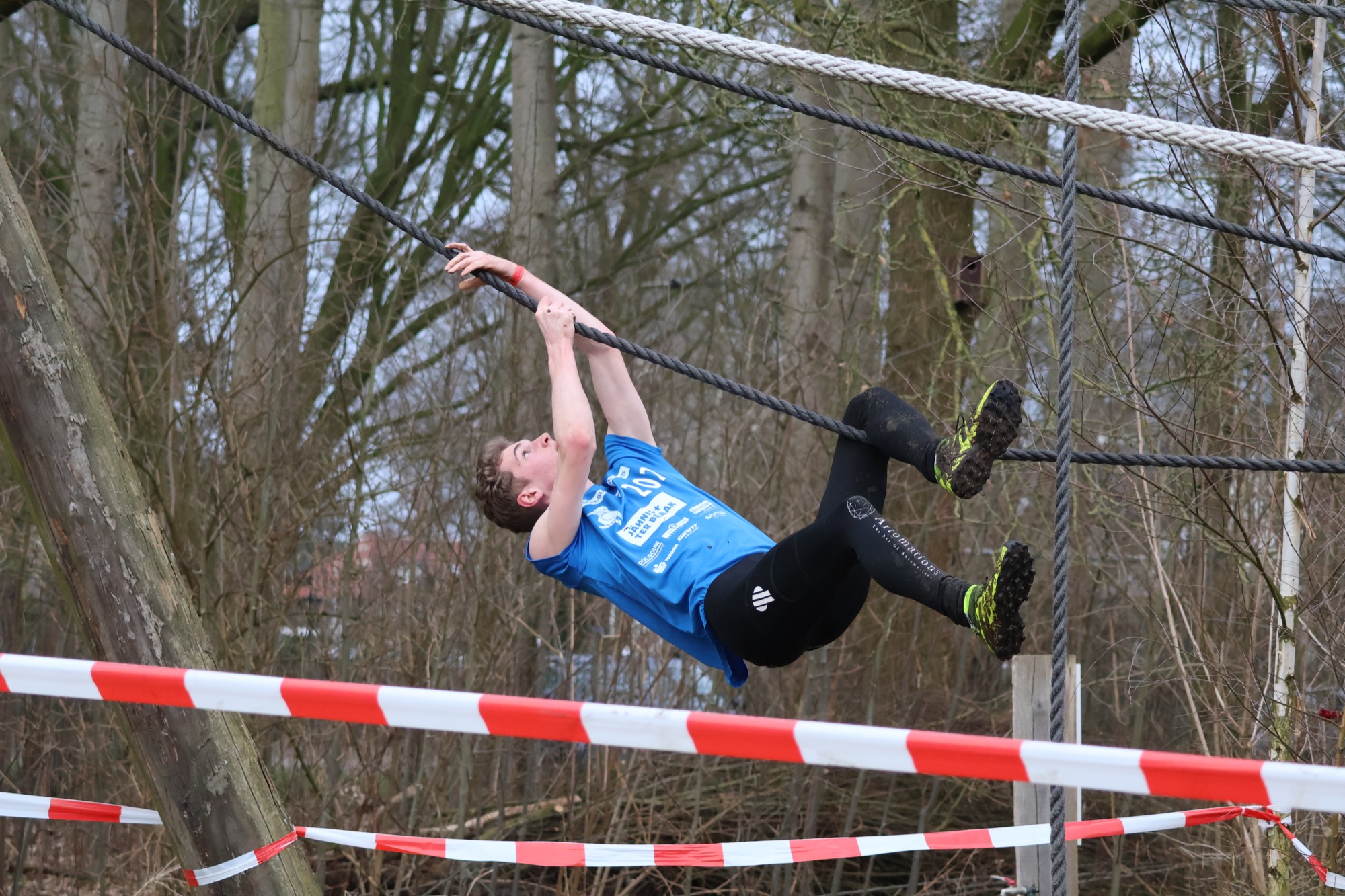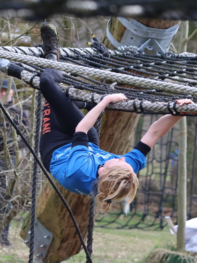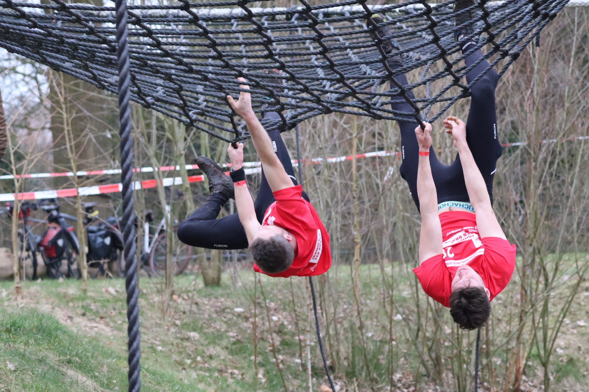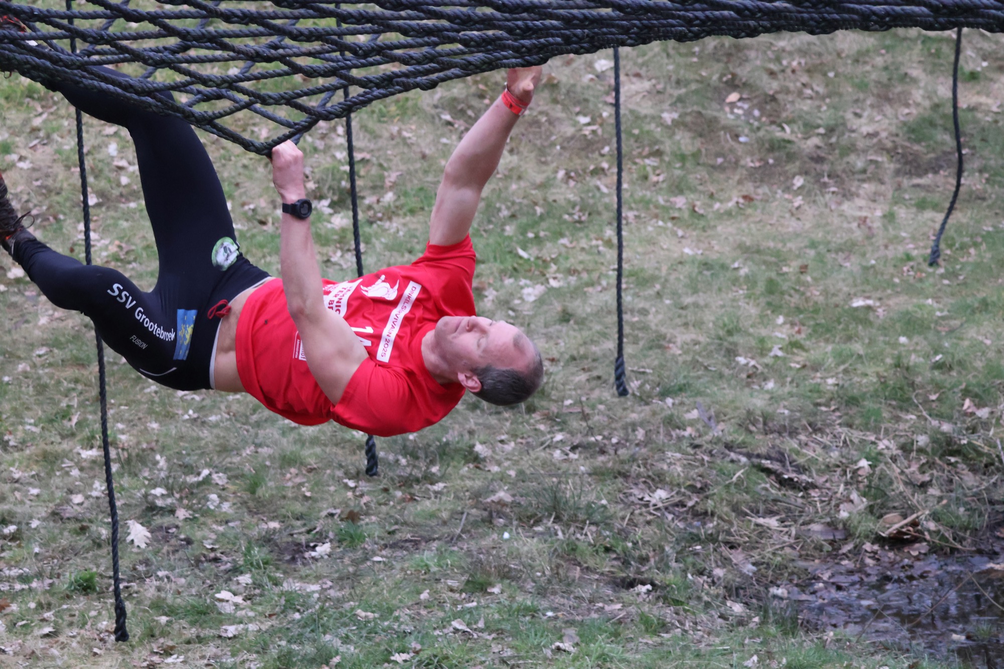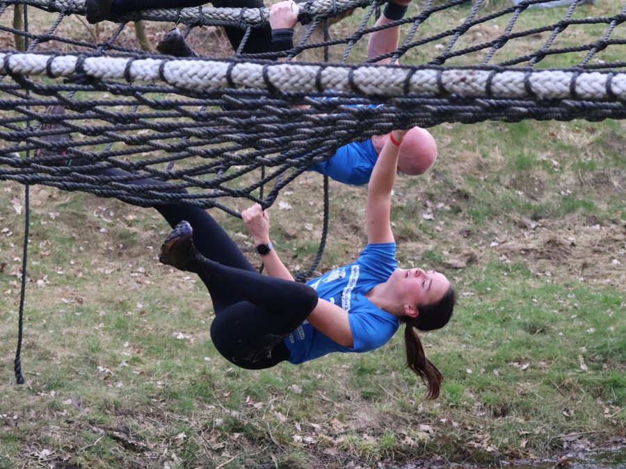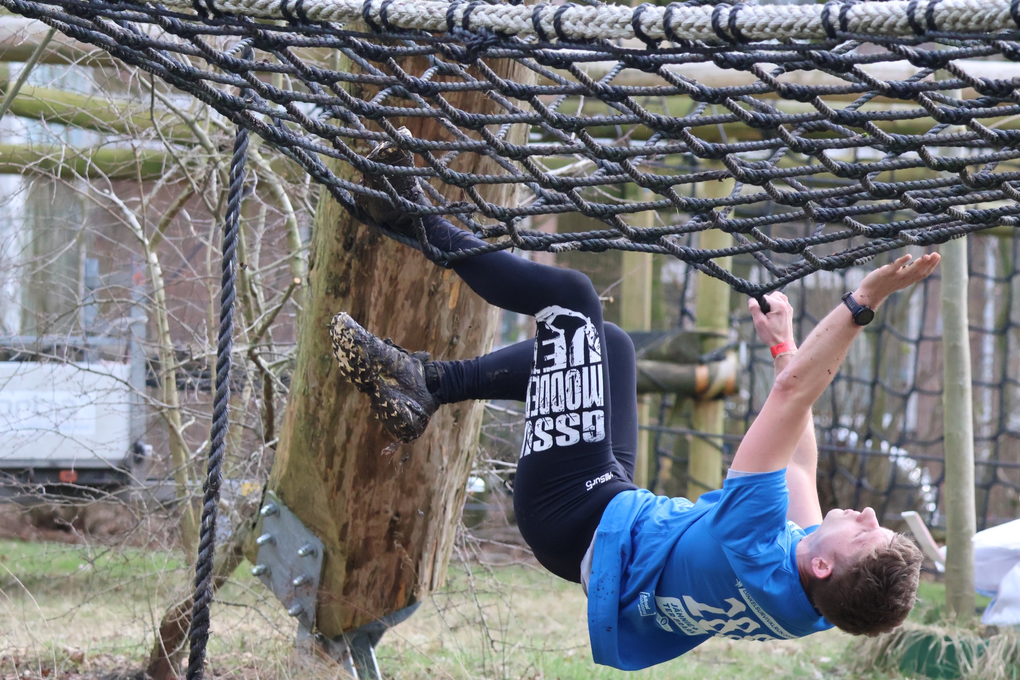 Deelnemers klimmen via het inklimtouw in het horizontale net. het gehele net klimmen ze onderlangs.