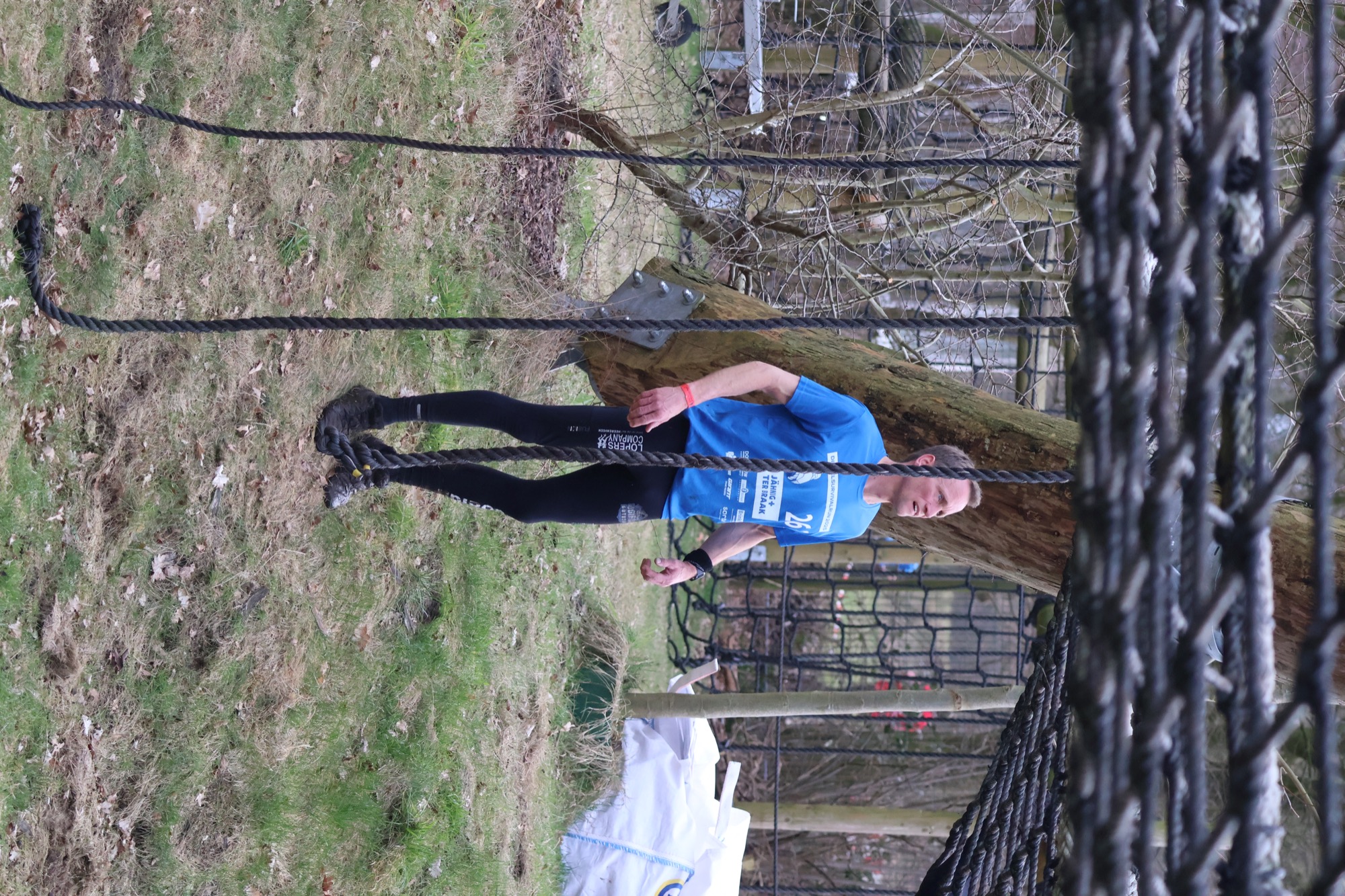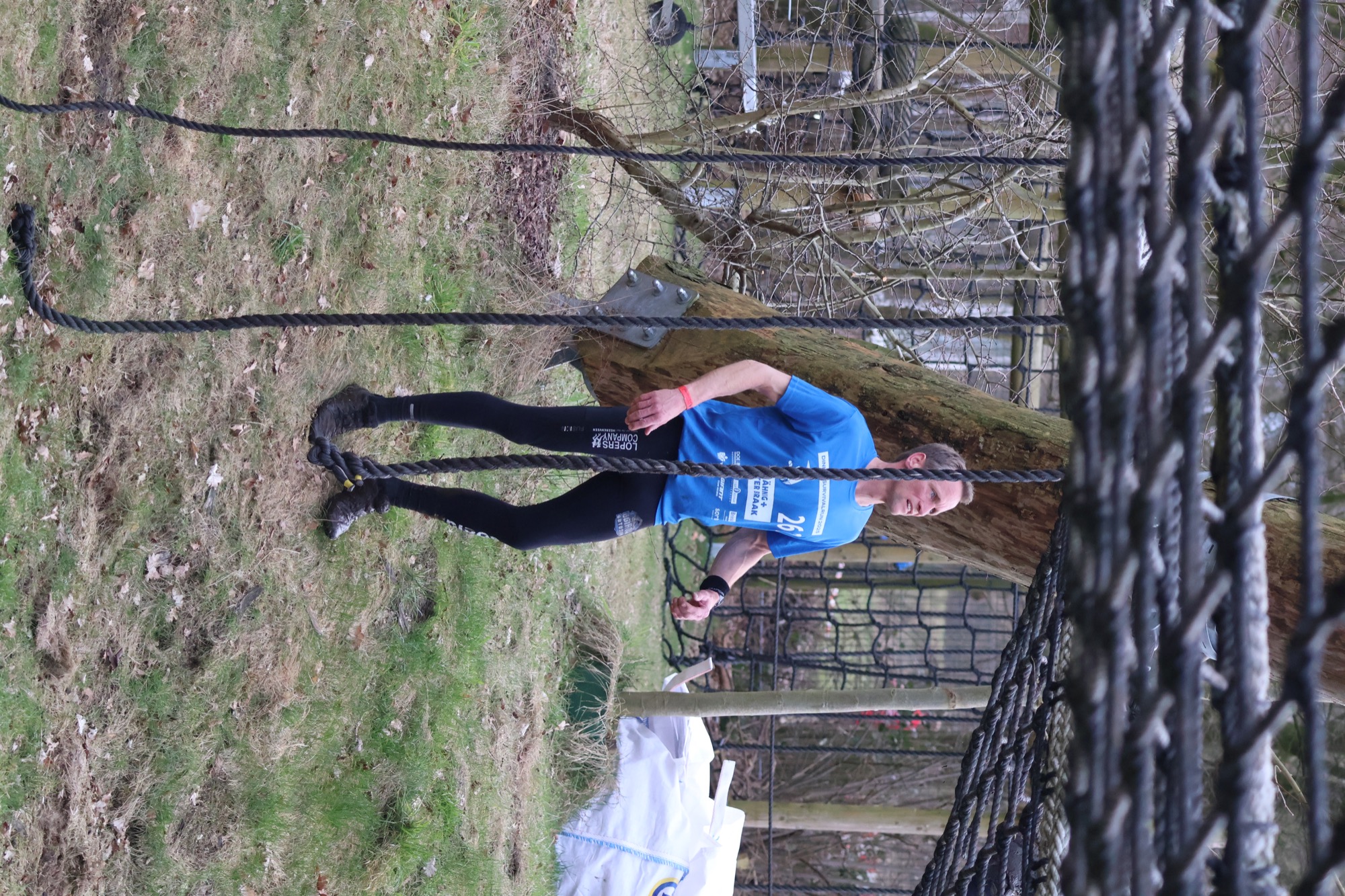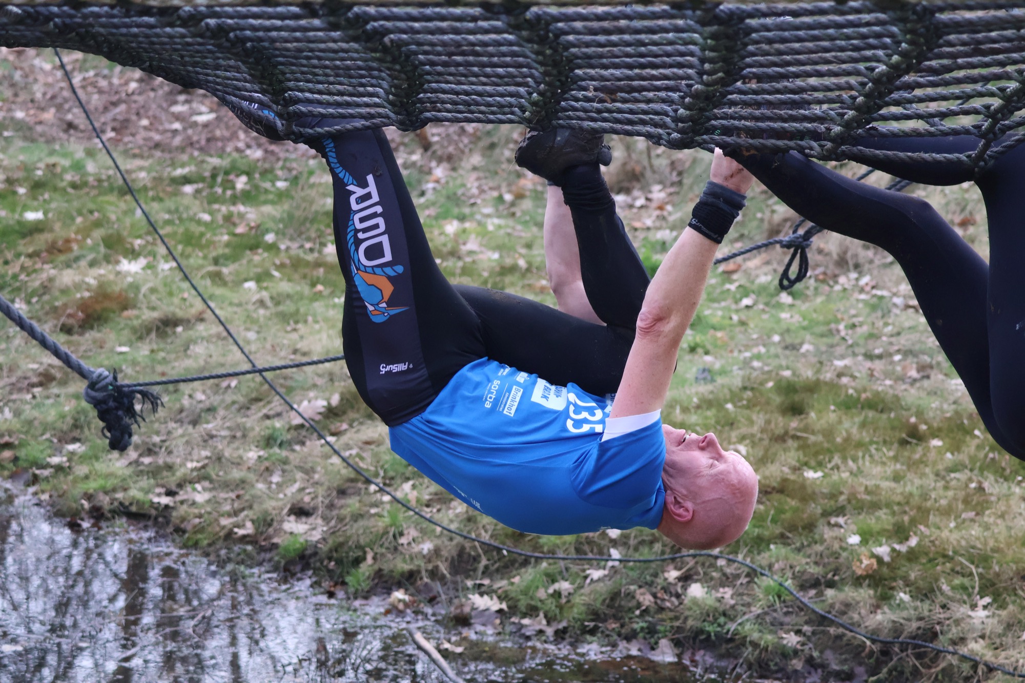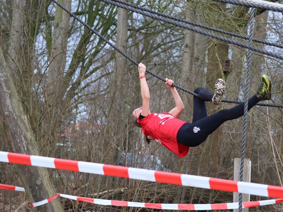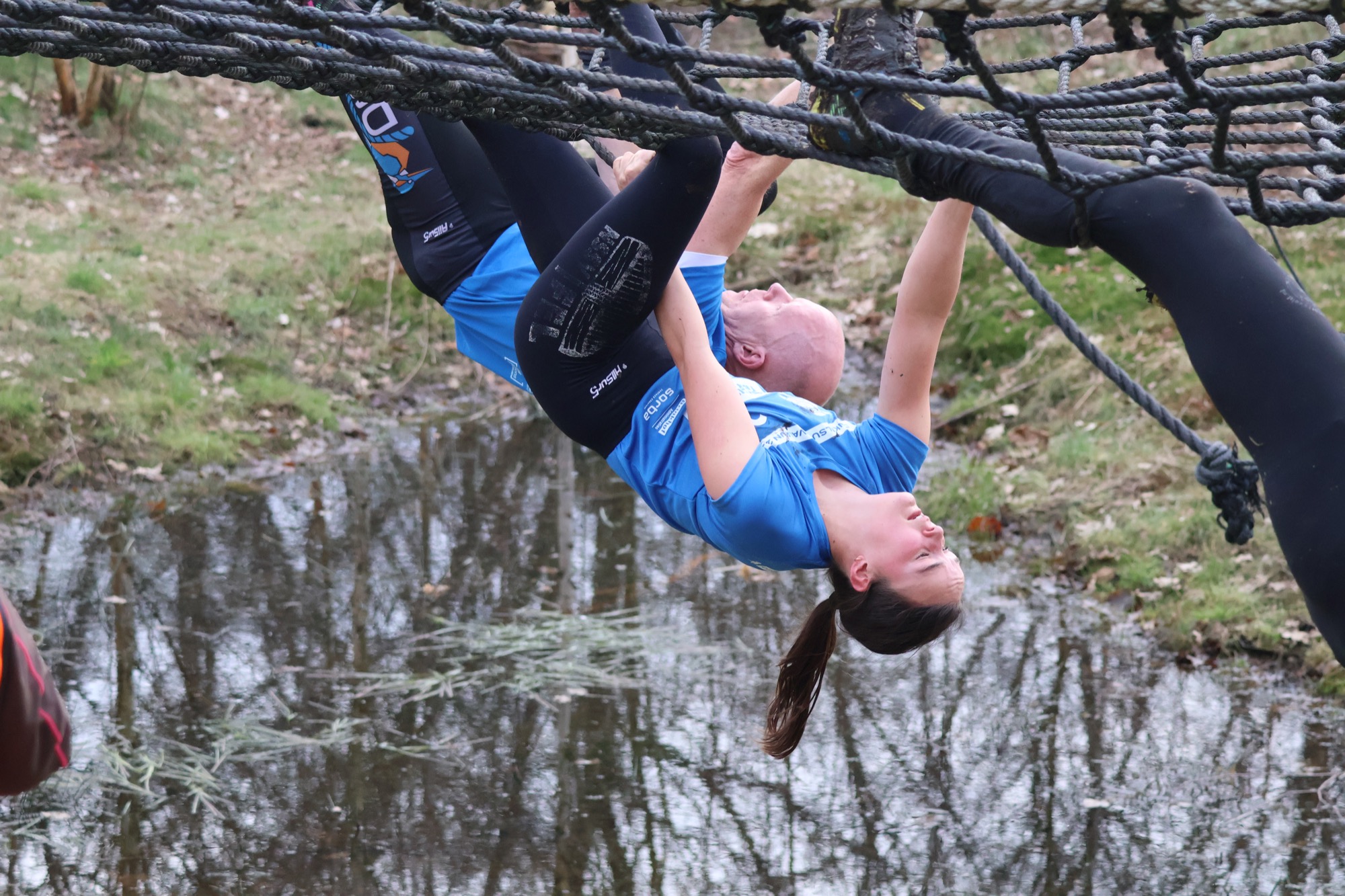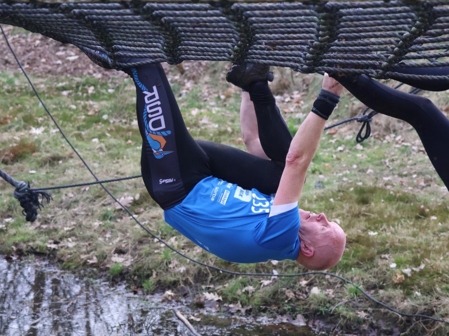 Deelnemers klimmen via het inklimtouw in het horizontale net. het gehele net klimmen ze onderlangs.