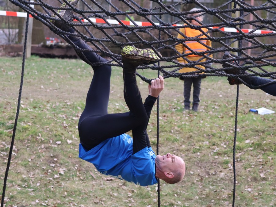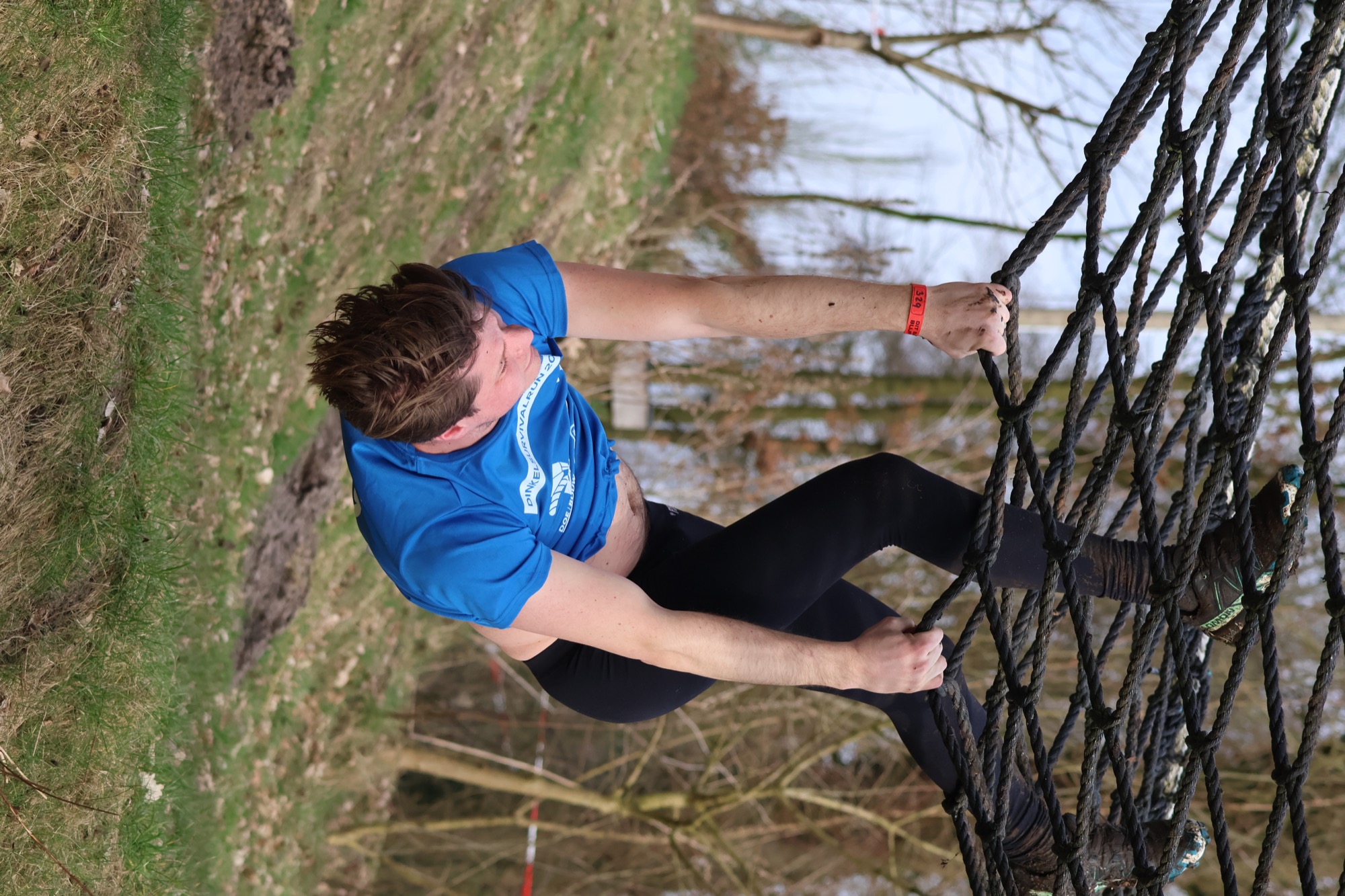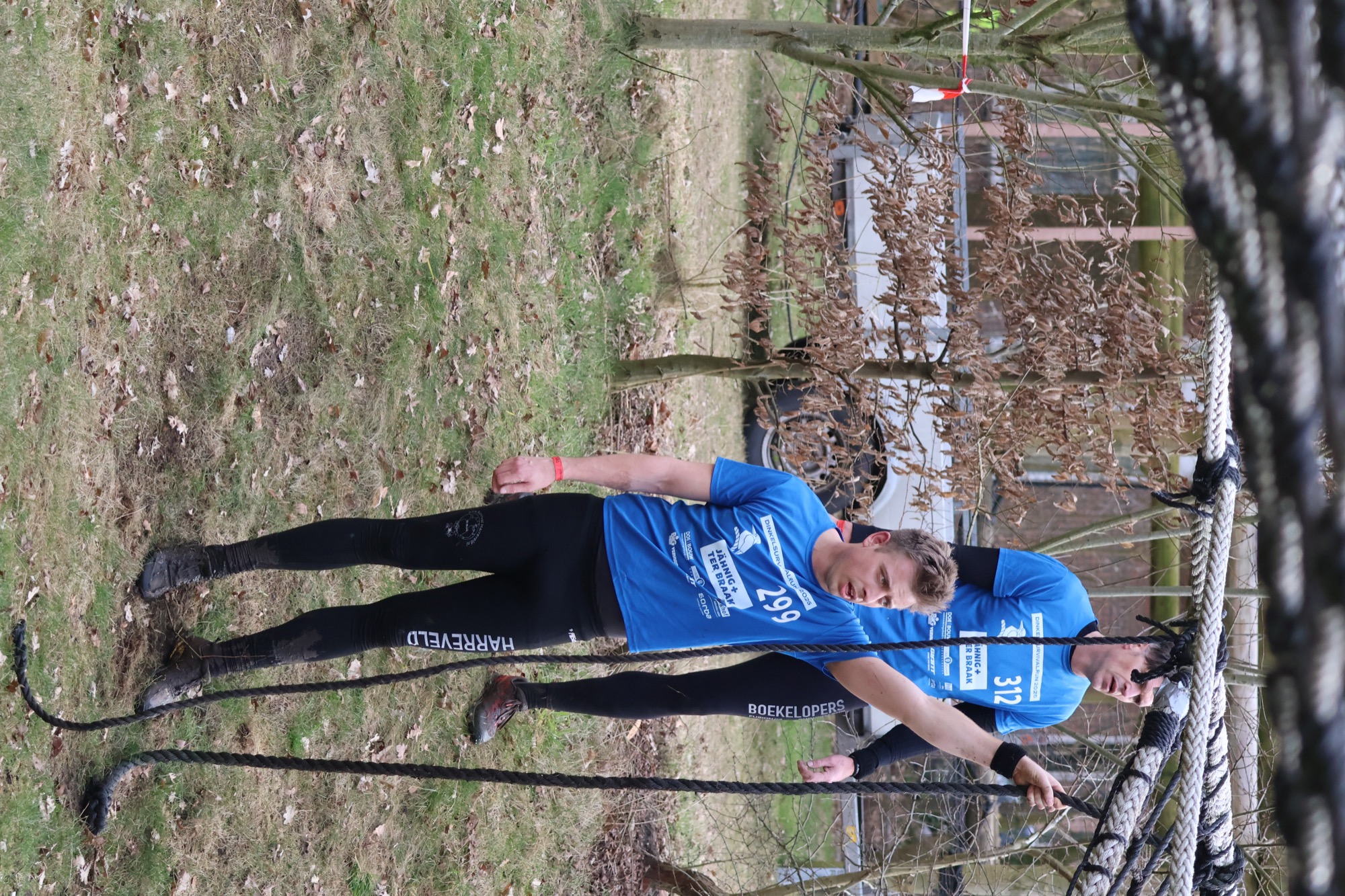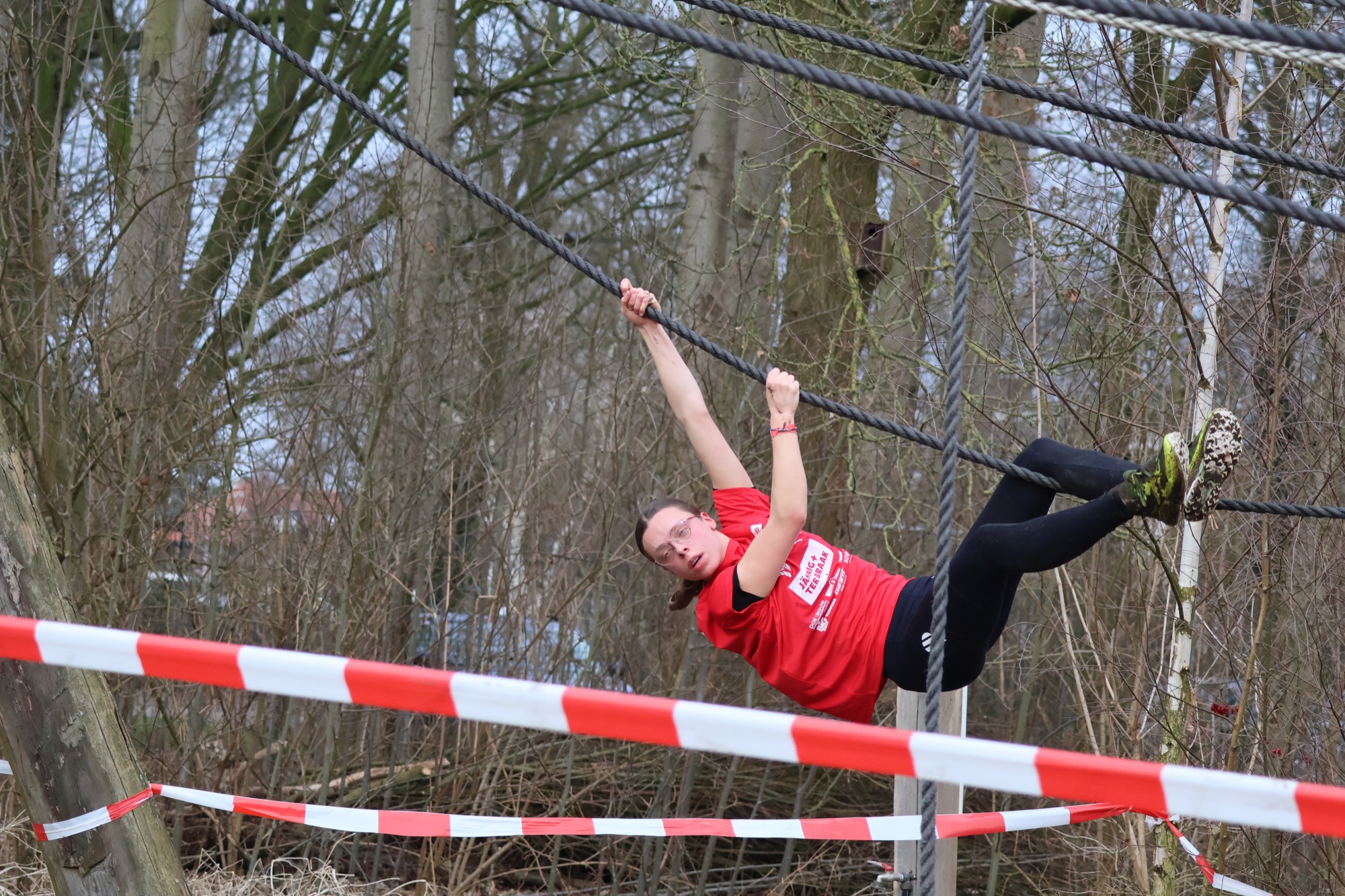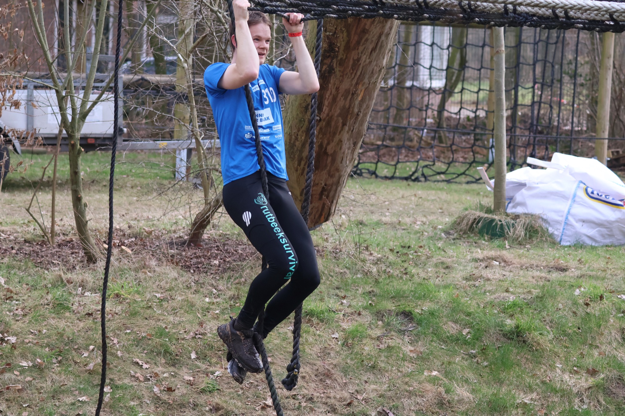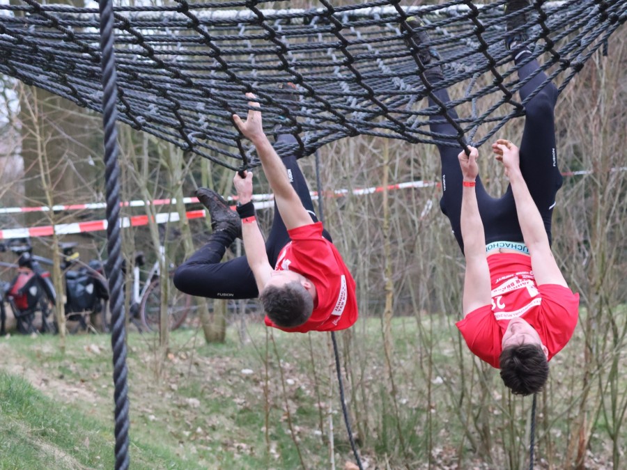 Deelnemers klimmen via het inklimtouw in het horizontale net. het gehele net klimmen ze onderlangs.
