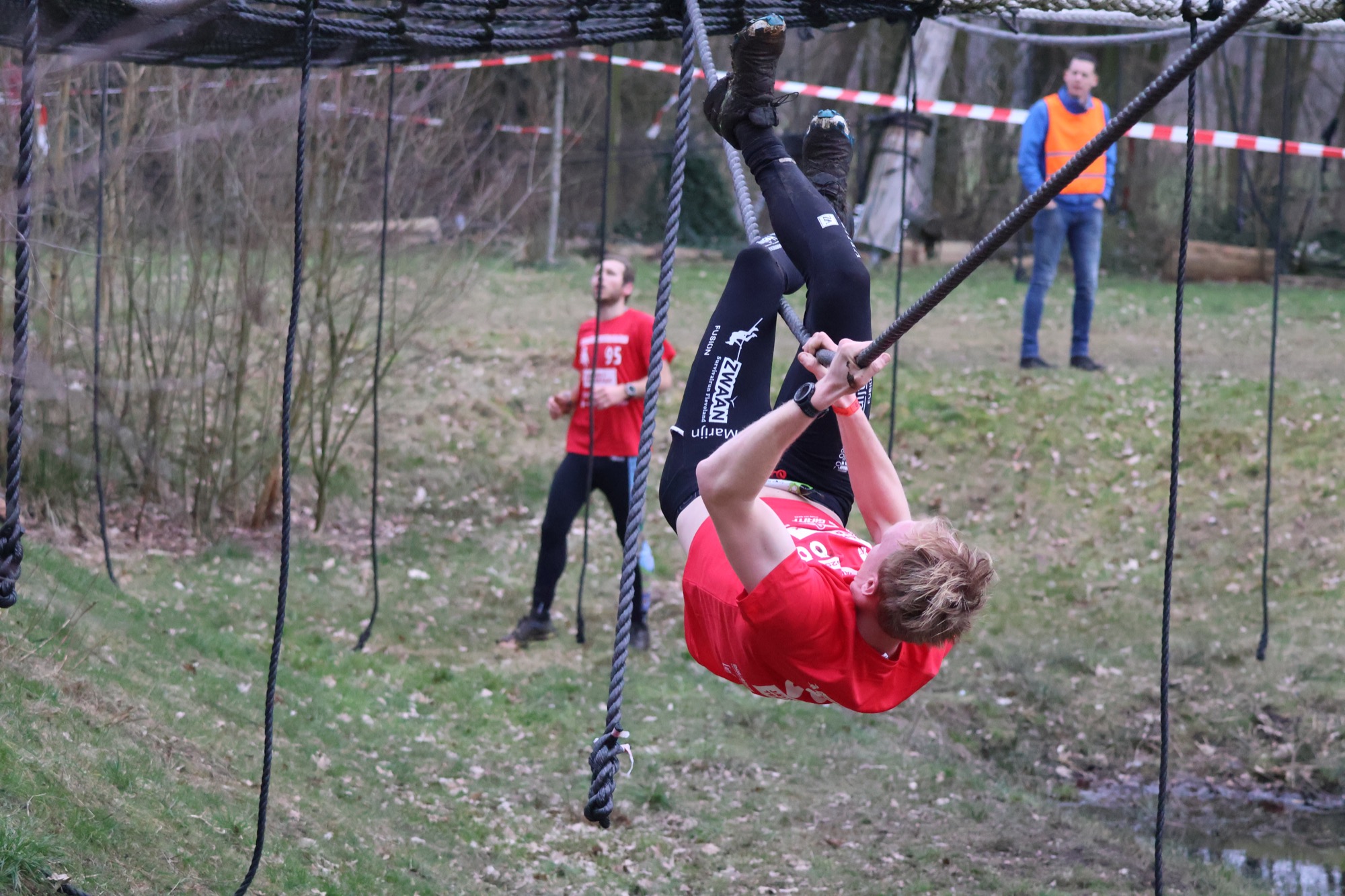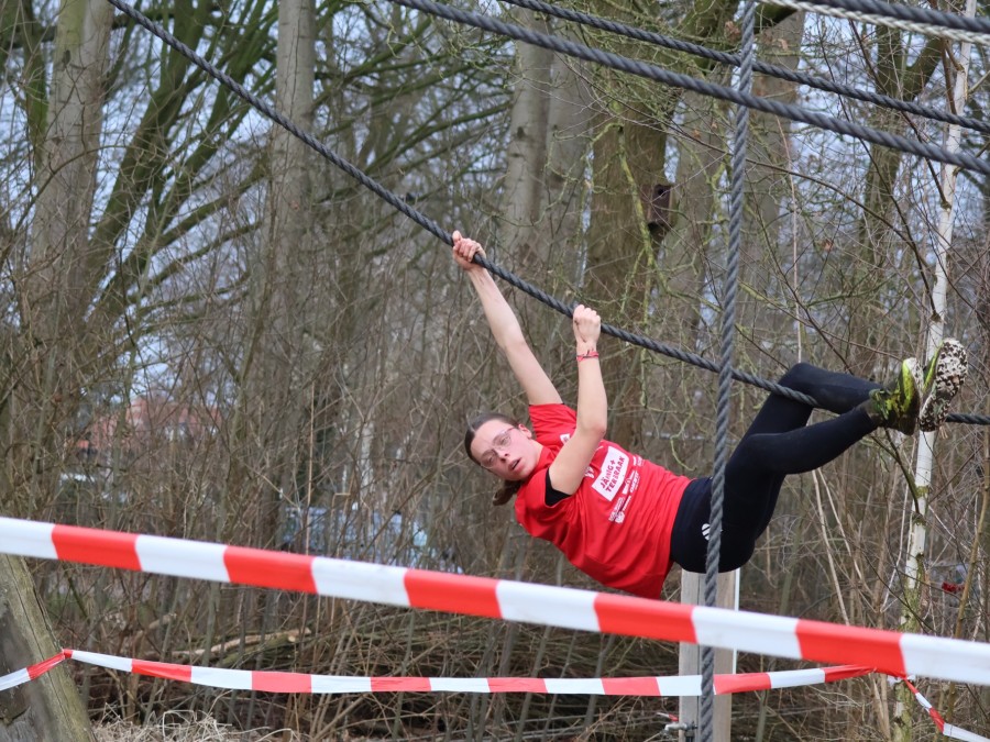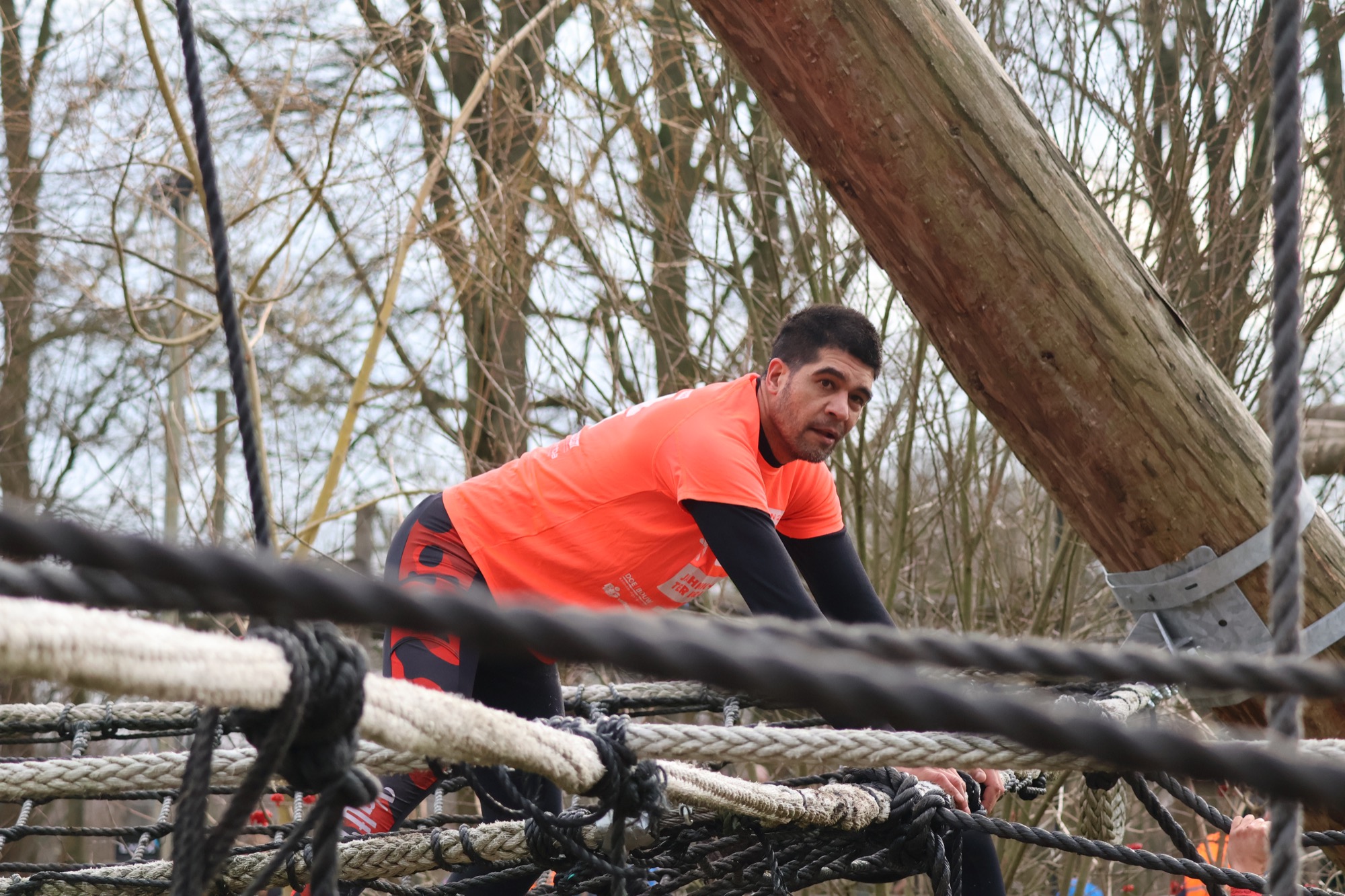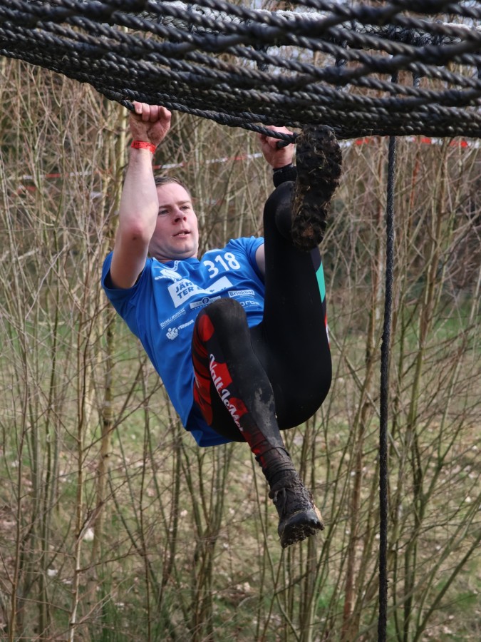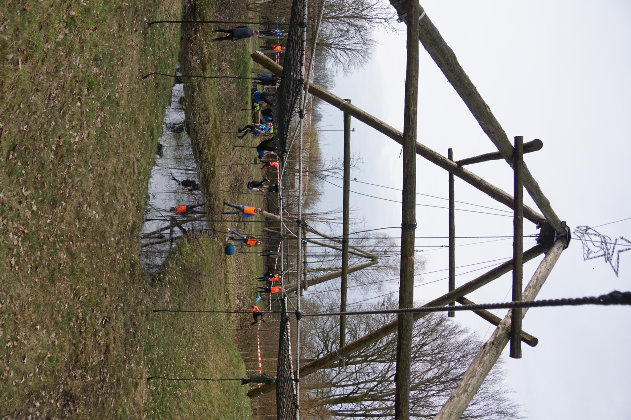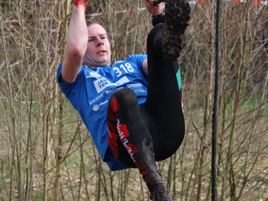 Deelnemers klimmen via het inklimtouw in het horizontale net. het gehele net klimmen ze onderlangs.