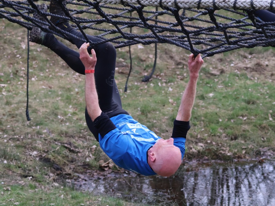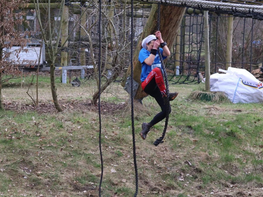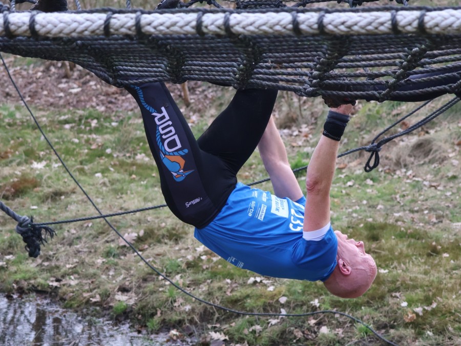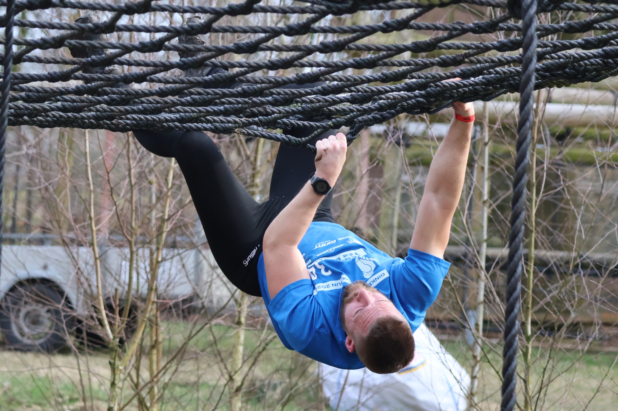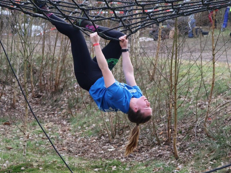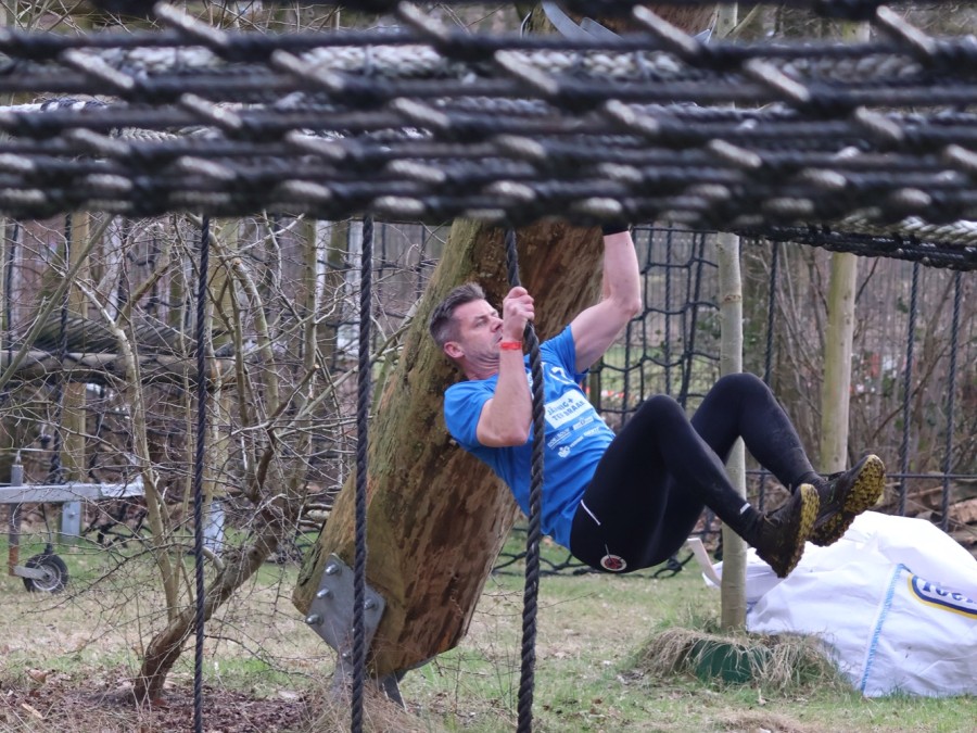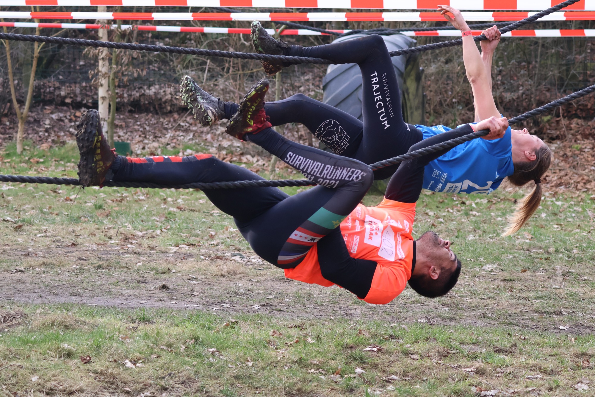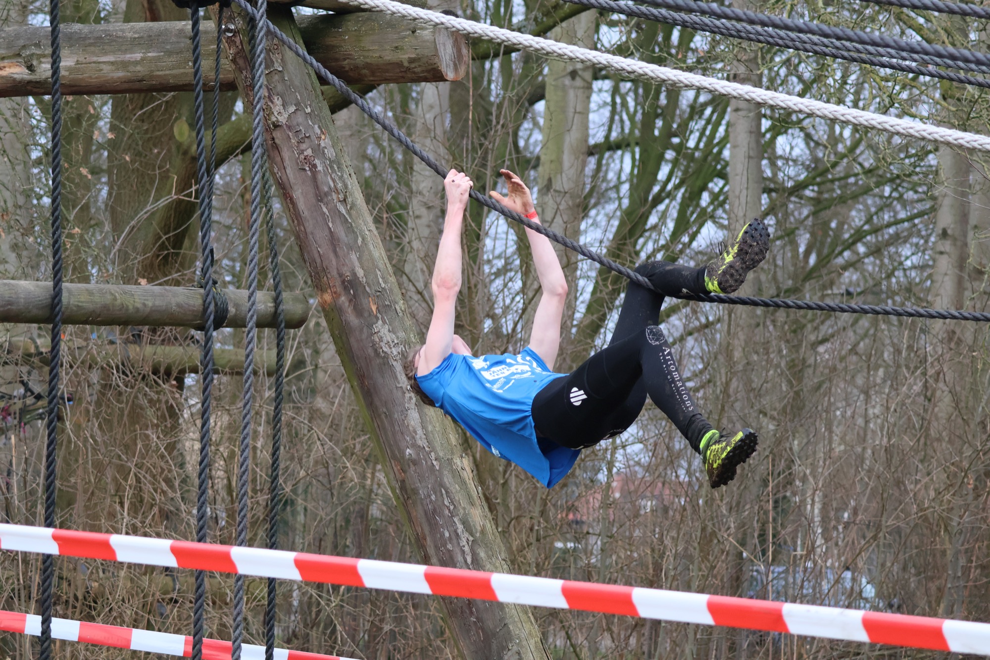 Deelnemers klimmen via het inklimtouw in het horizontale net. het gehele net klimmen ze onderlangs.