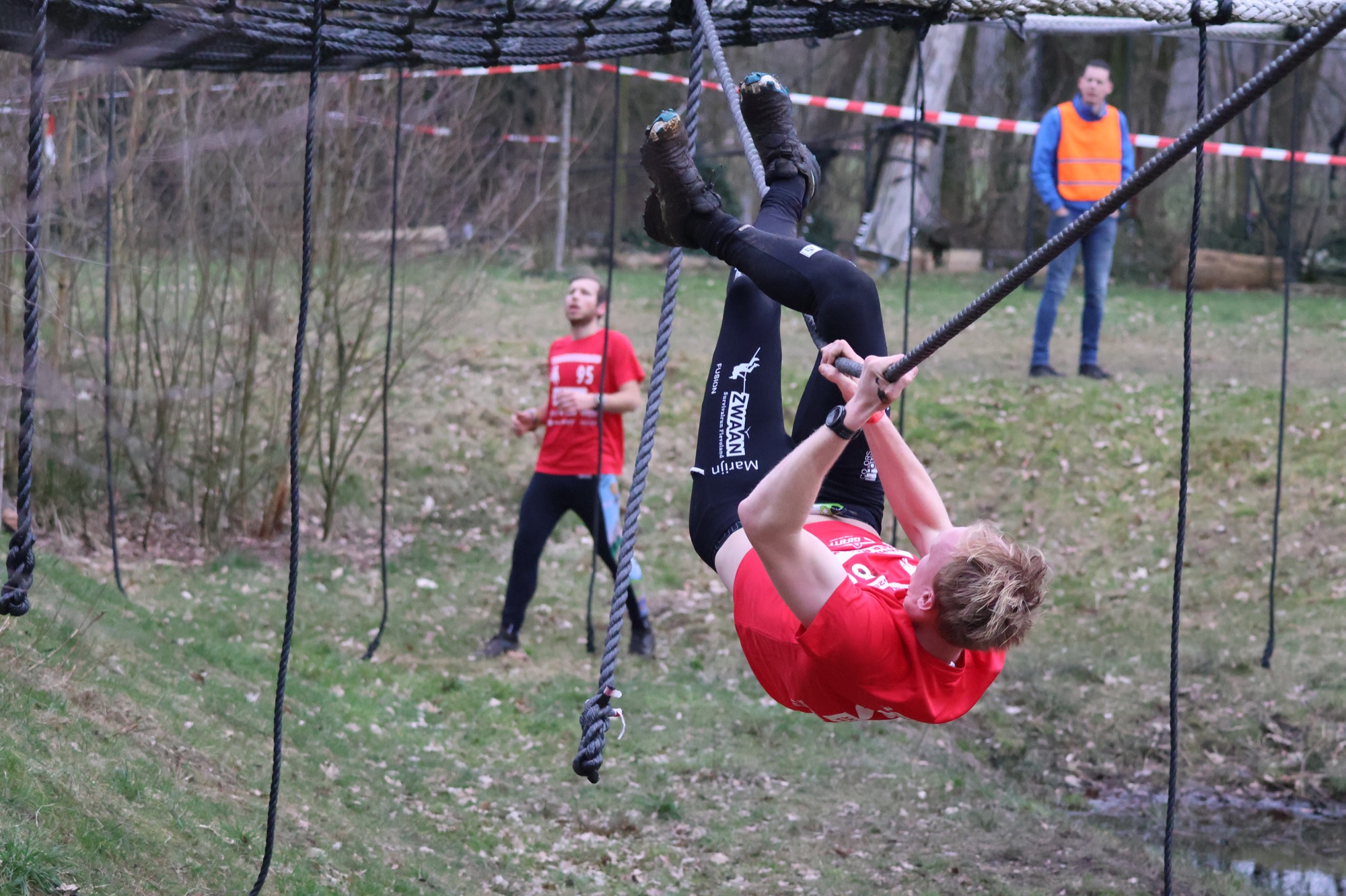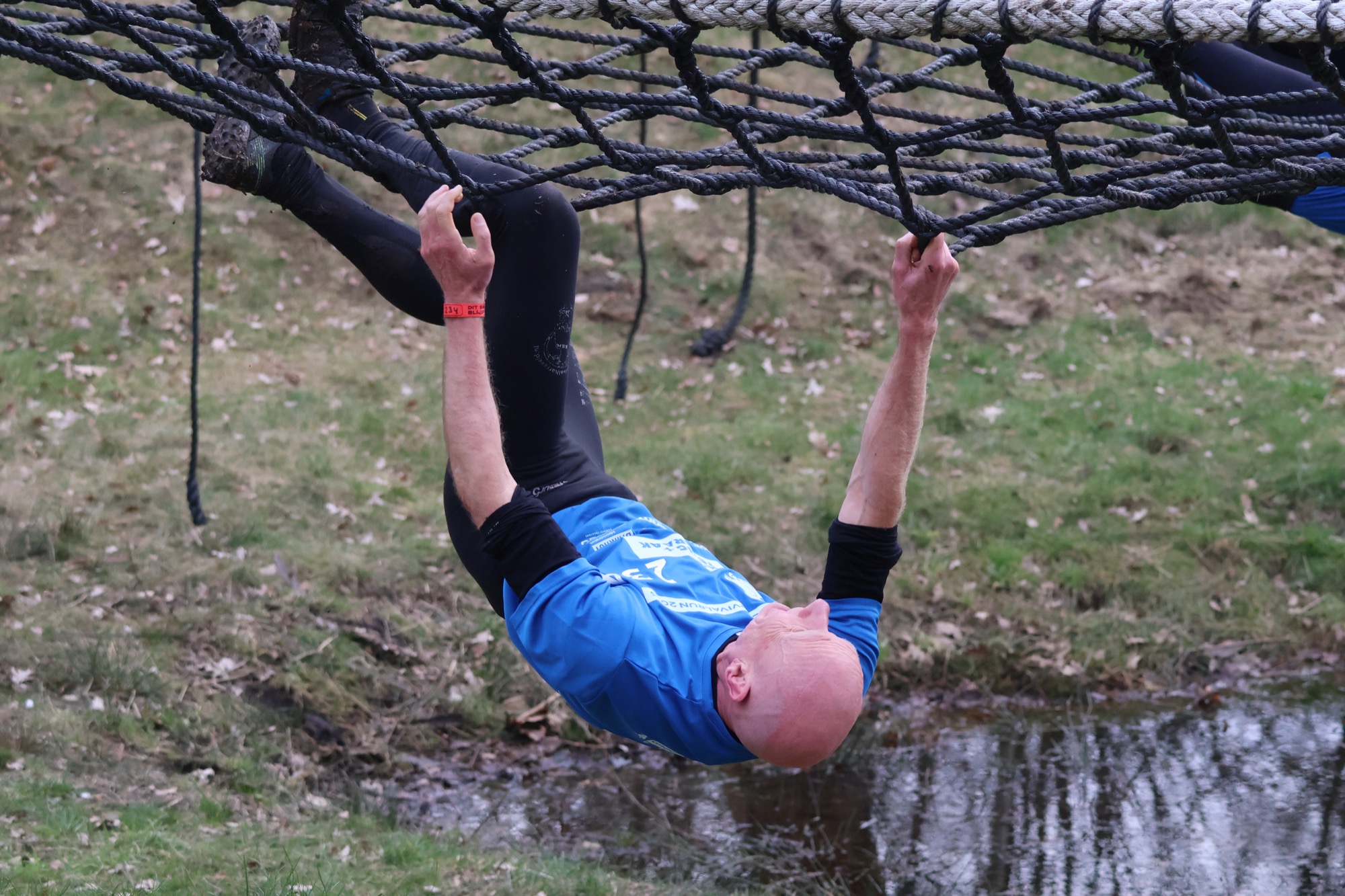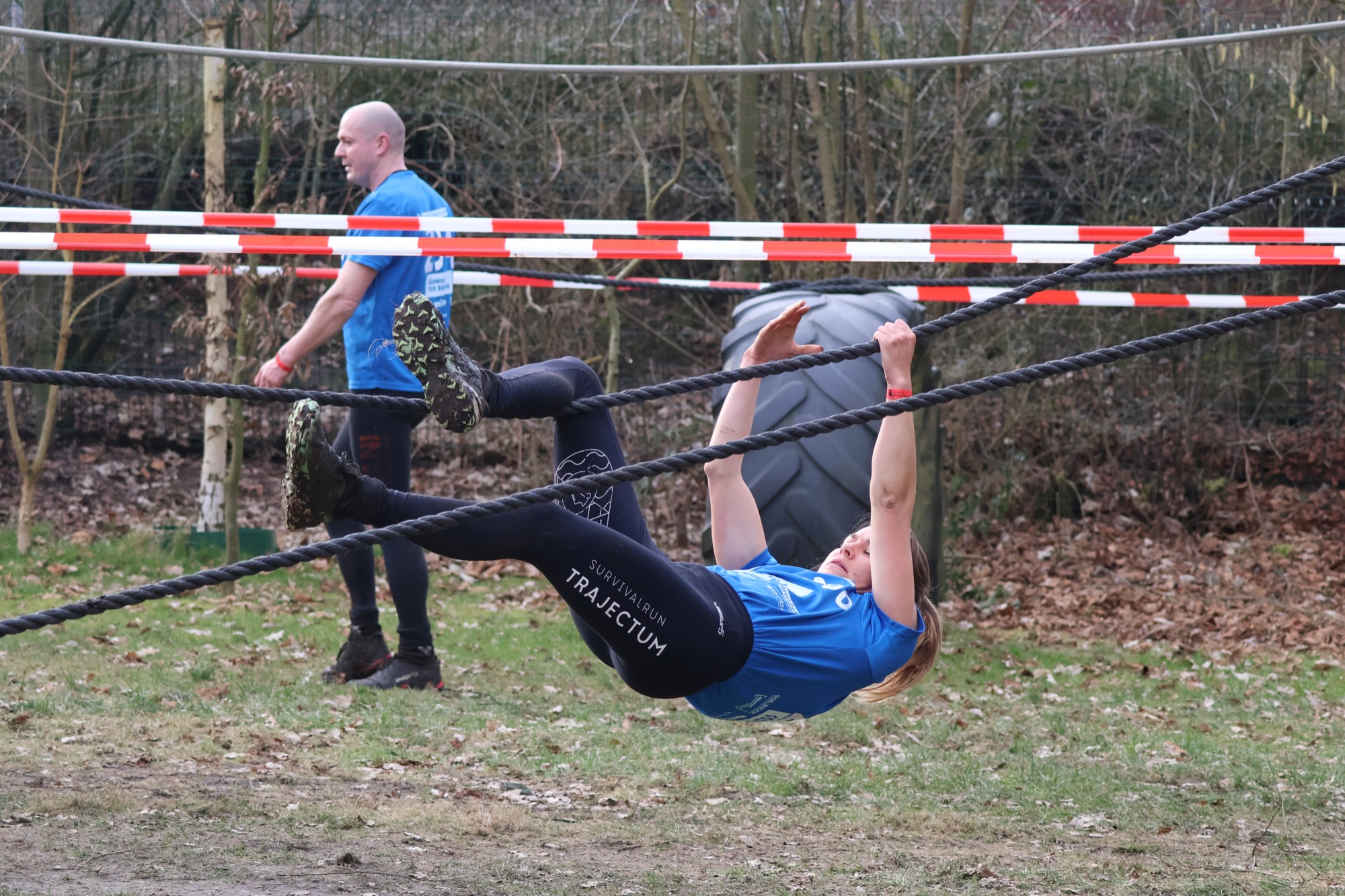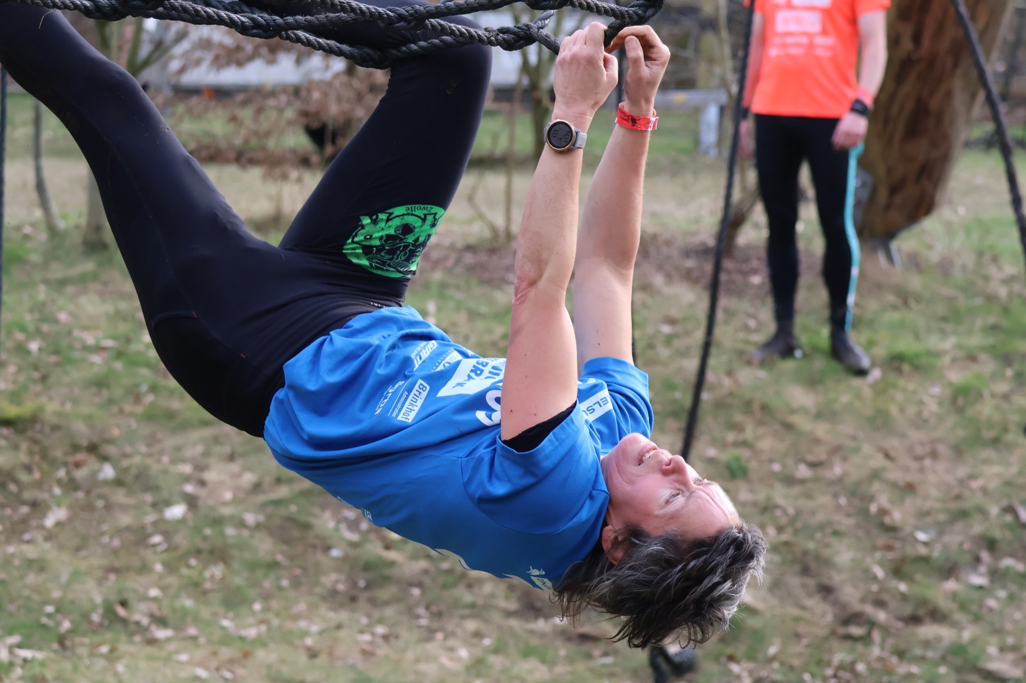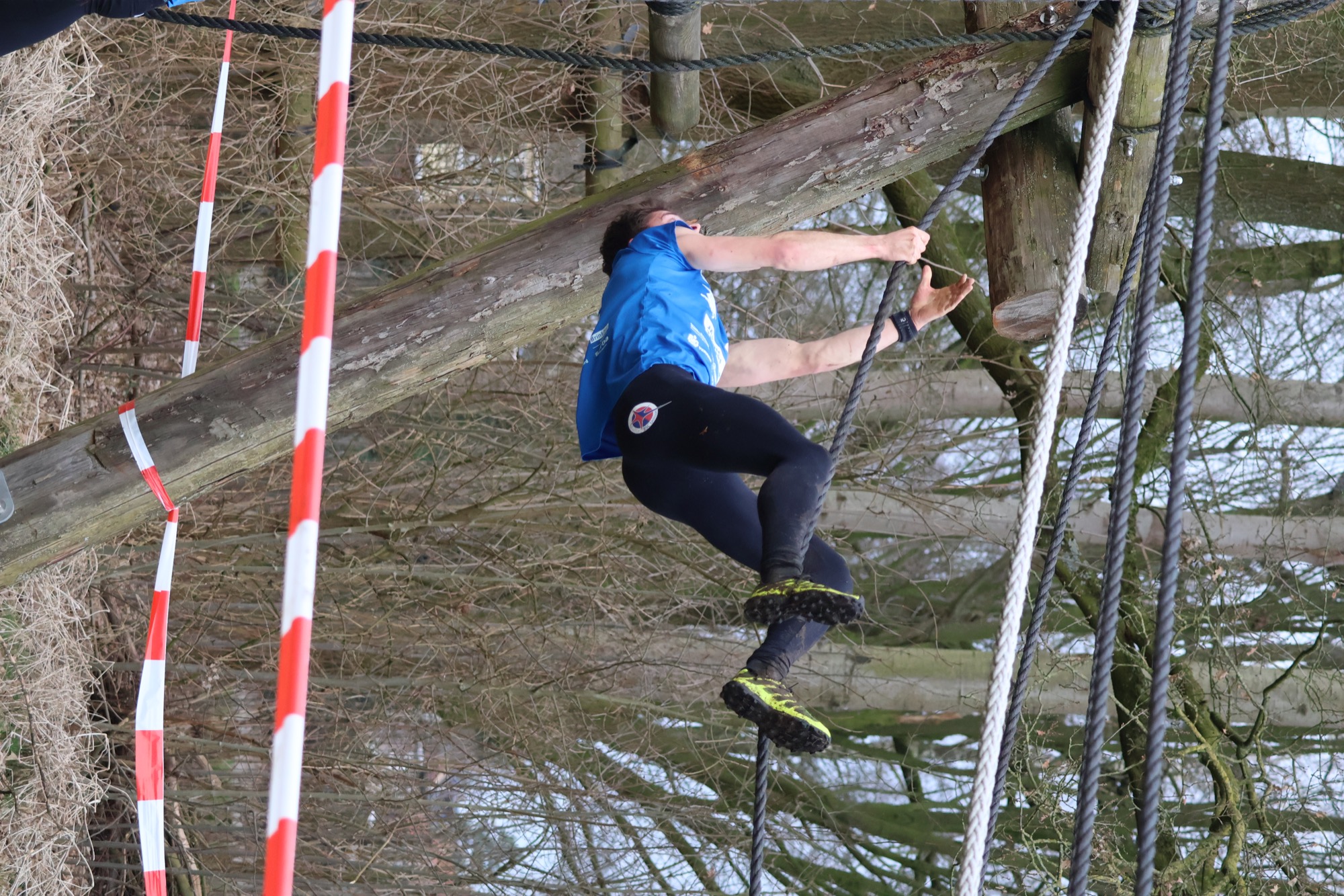 Deelnemers klimmen via het inklimtouw in het horizontale net. het gehele net klimmen ze onderlangs.