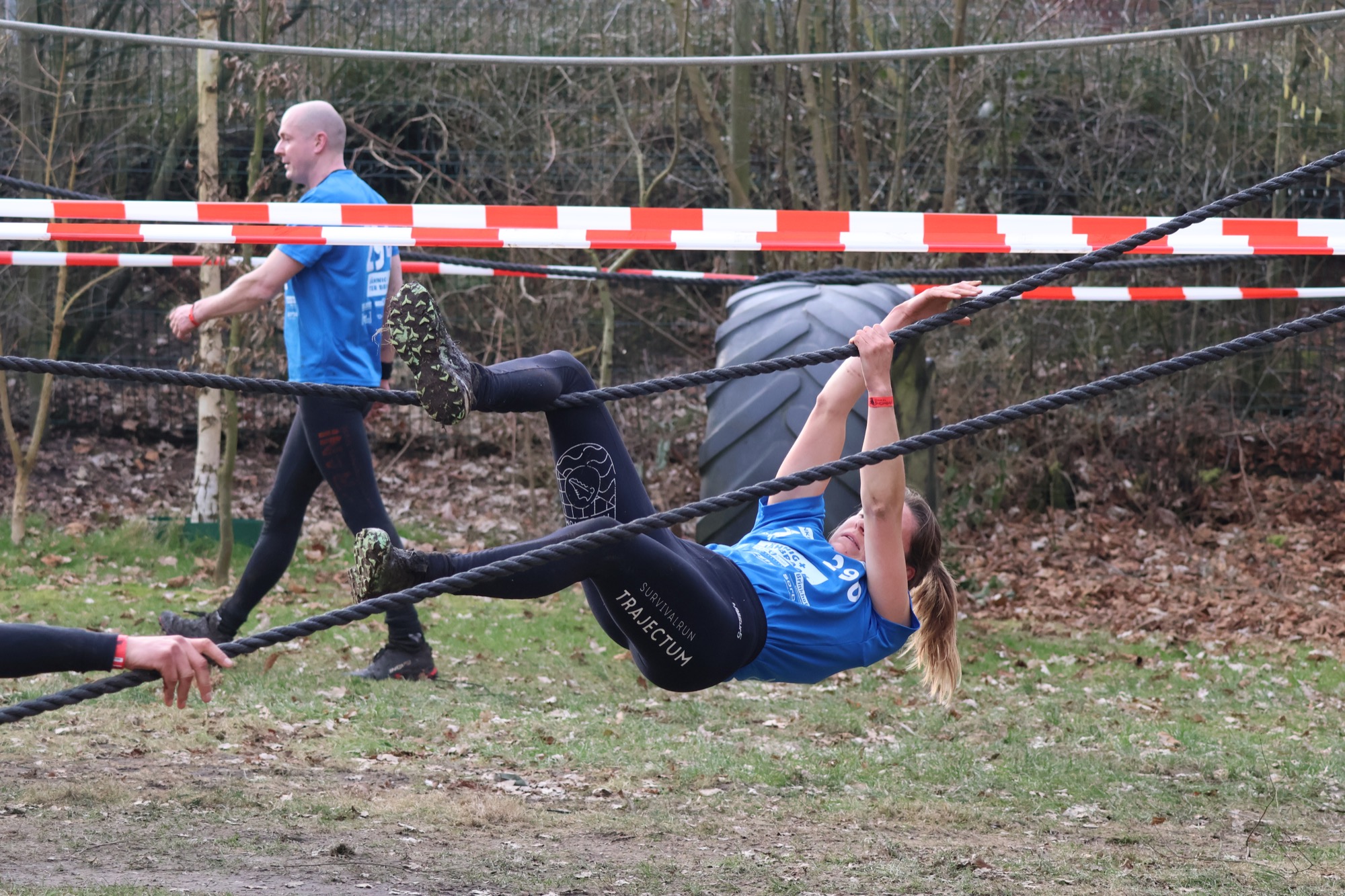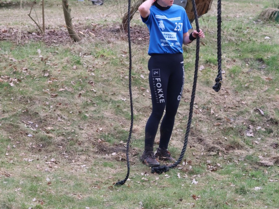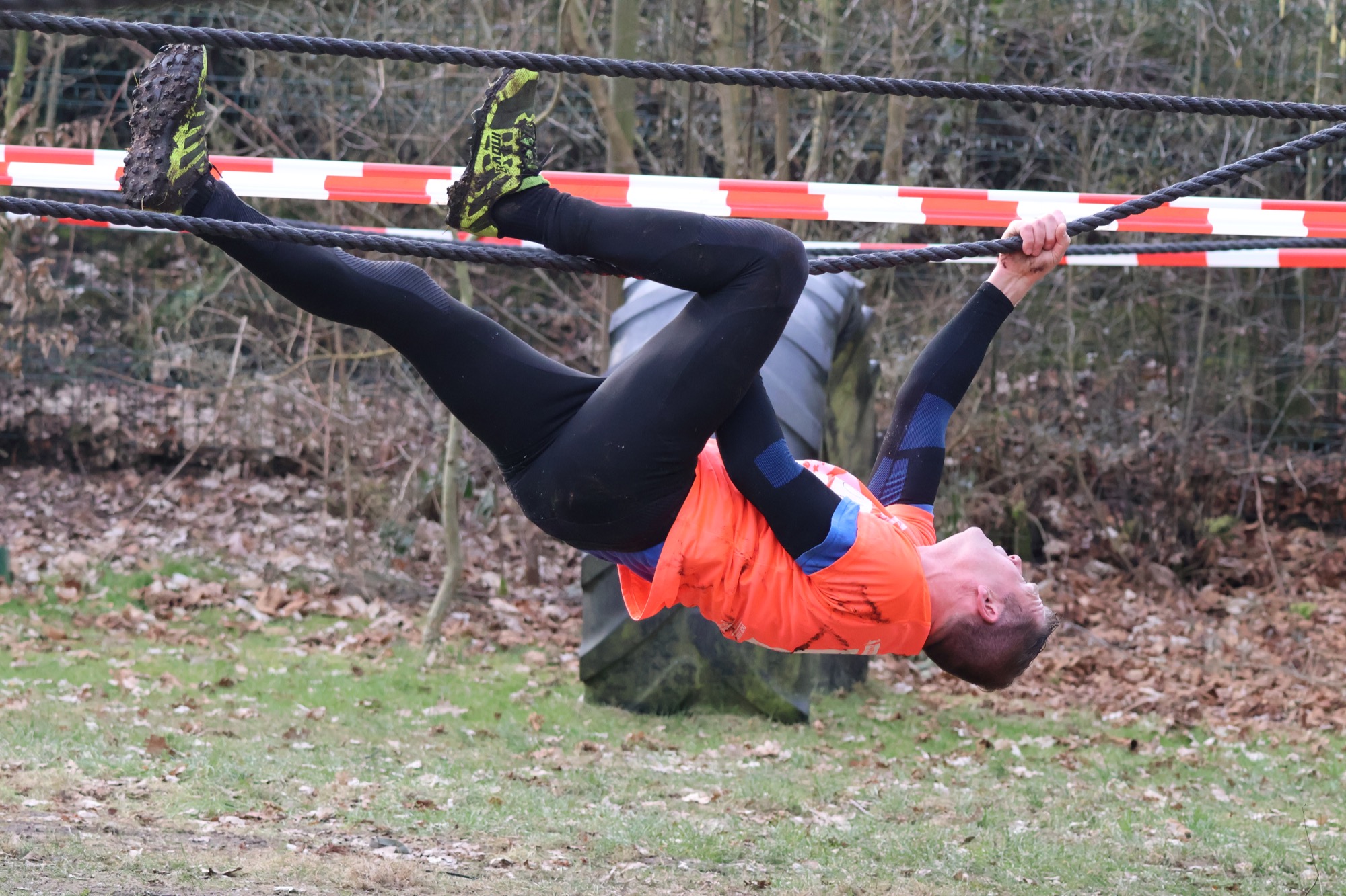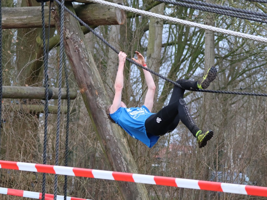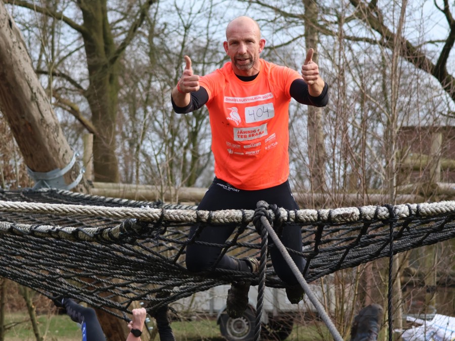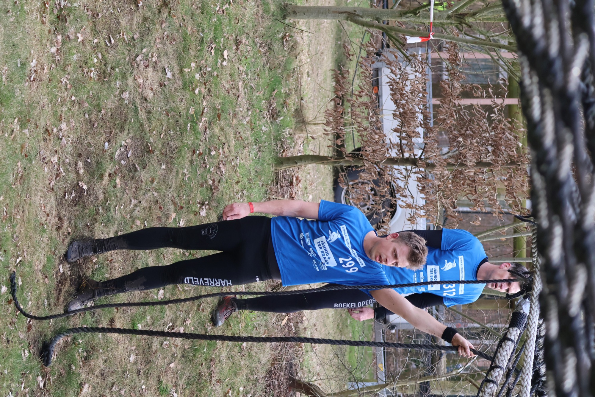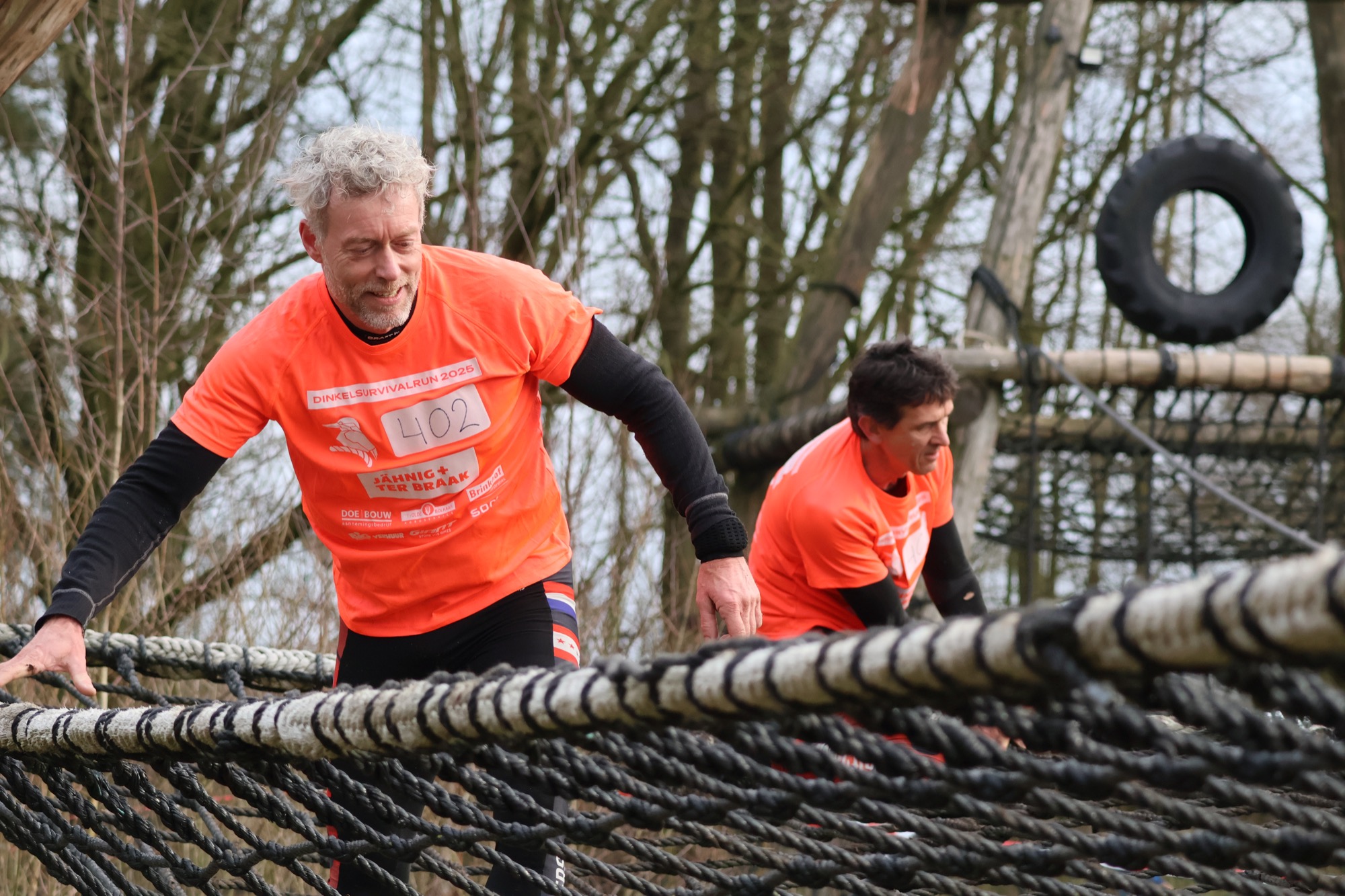 Deelnemers klimmen via het inklimtouw in het horizontale net. het gehele net klimmen ze onderlangs.