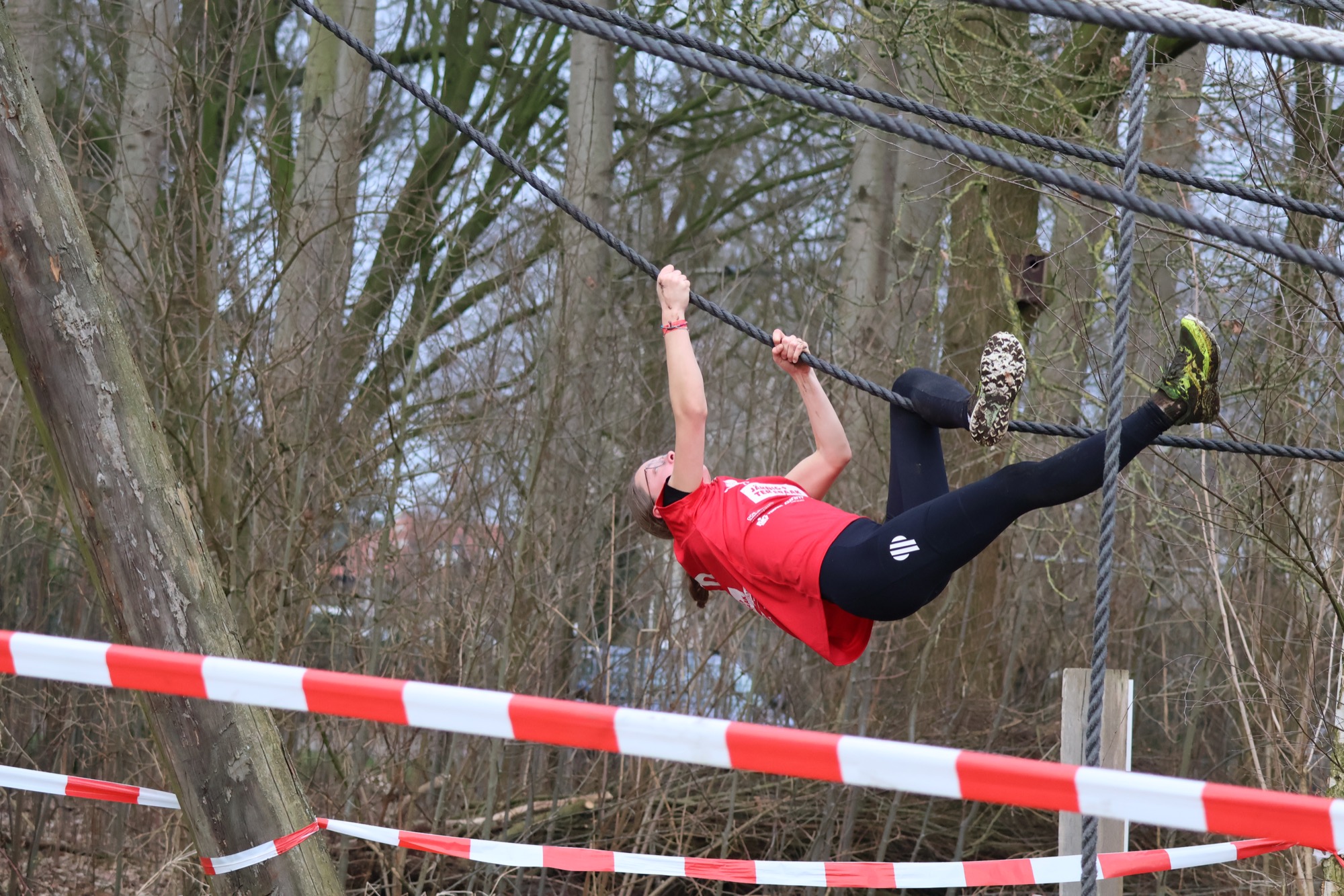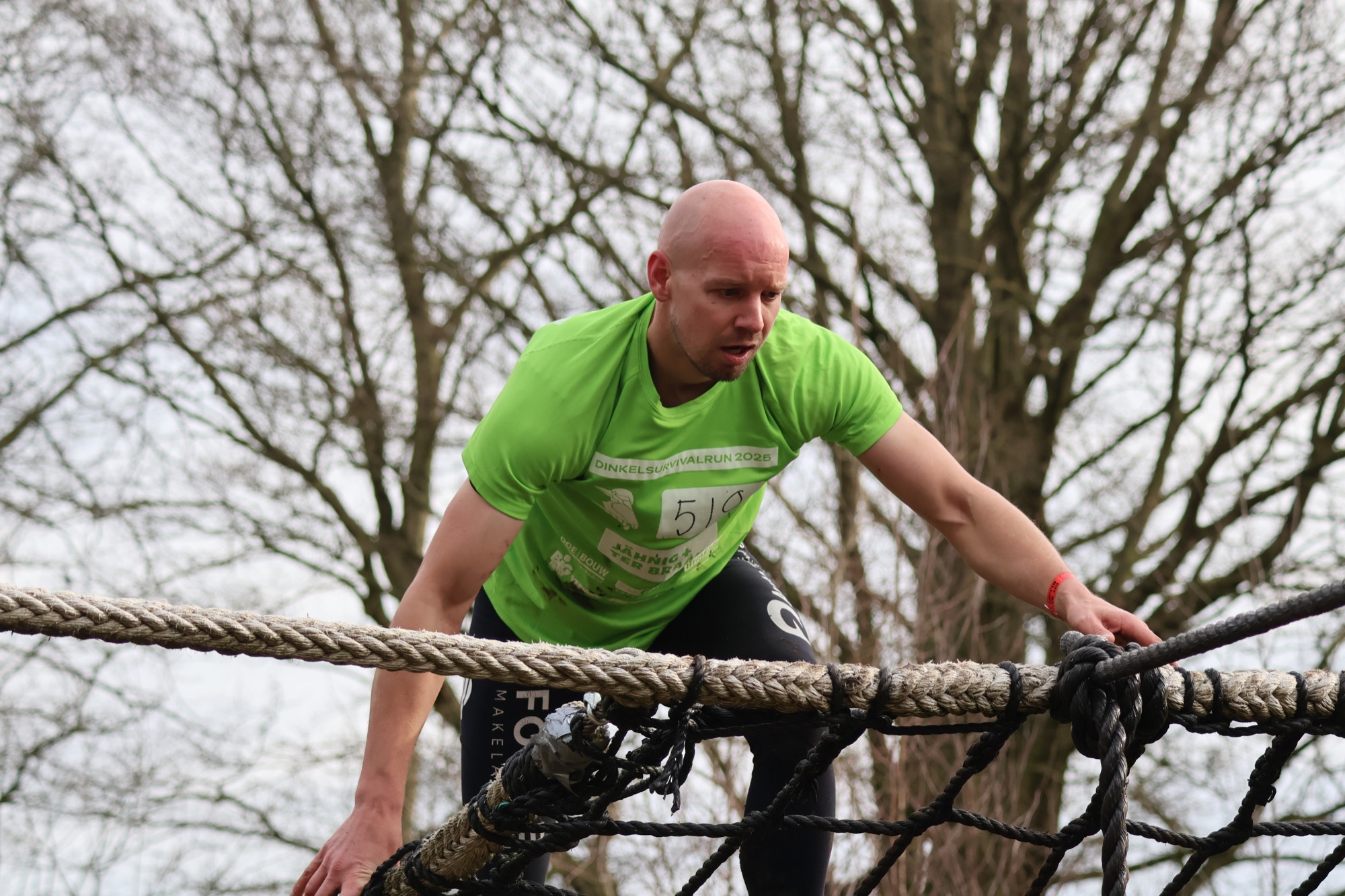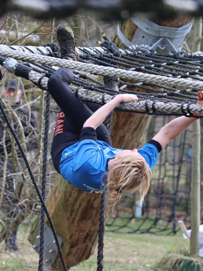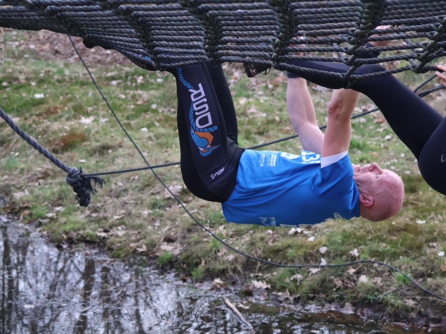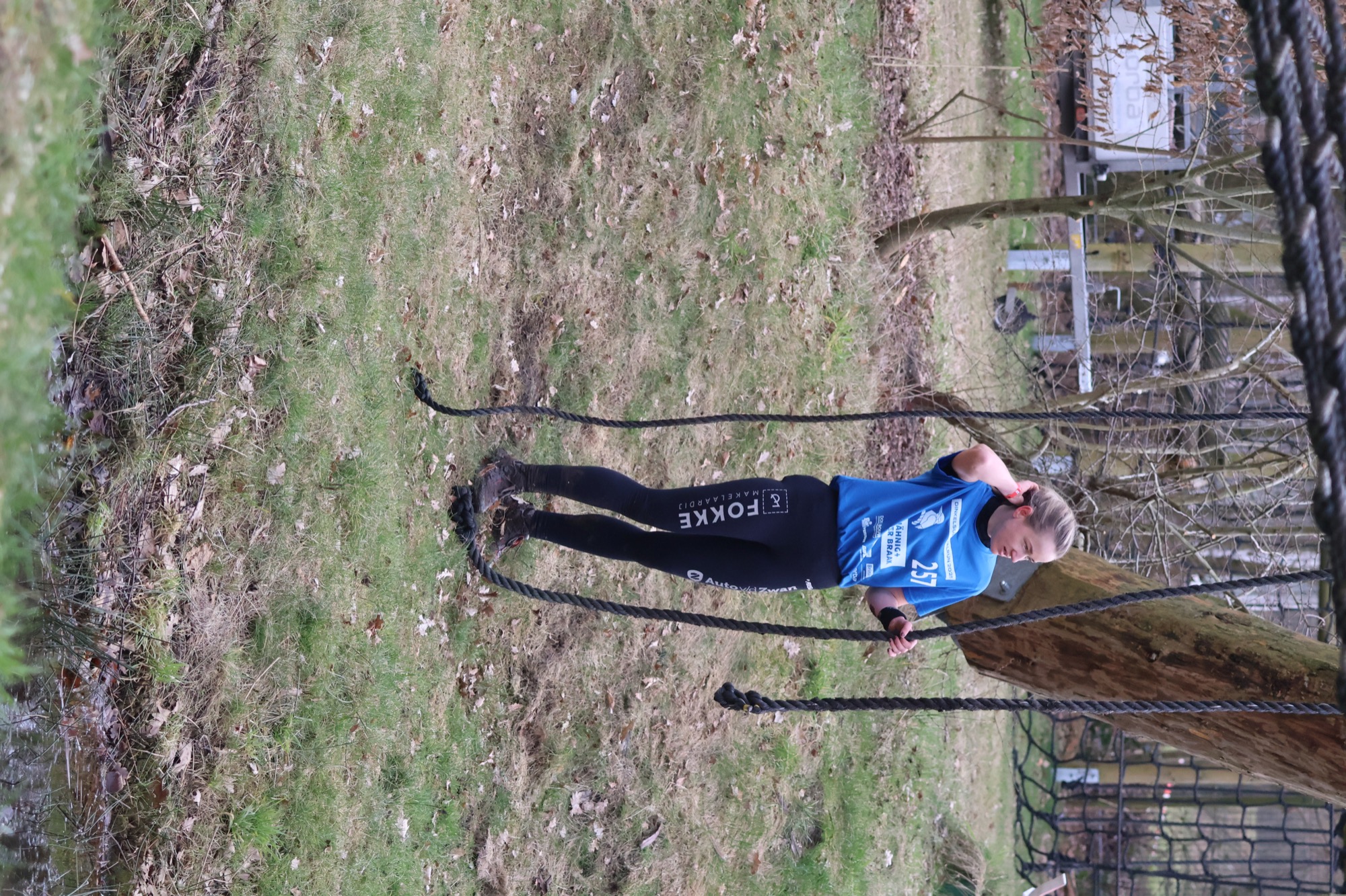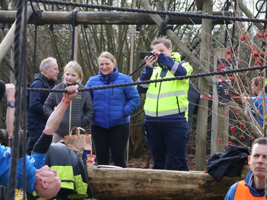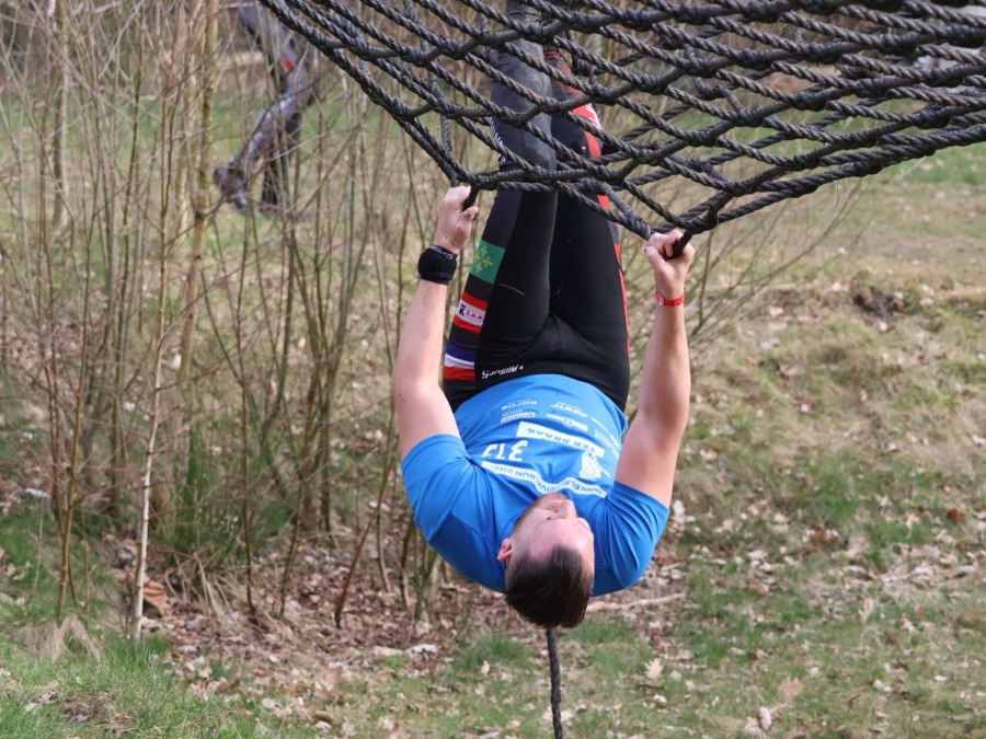 Deelnemers klimmen via het inklimtouw in het horizontale net. het gehele net klimmen ze onderlangs.
