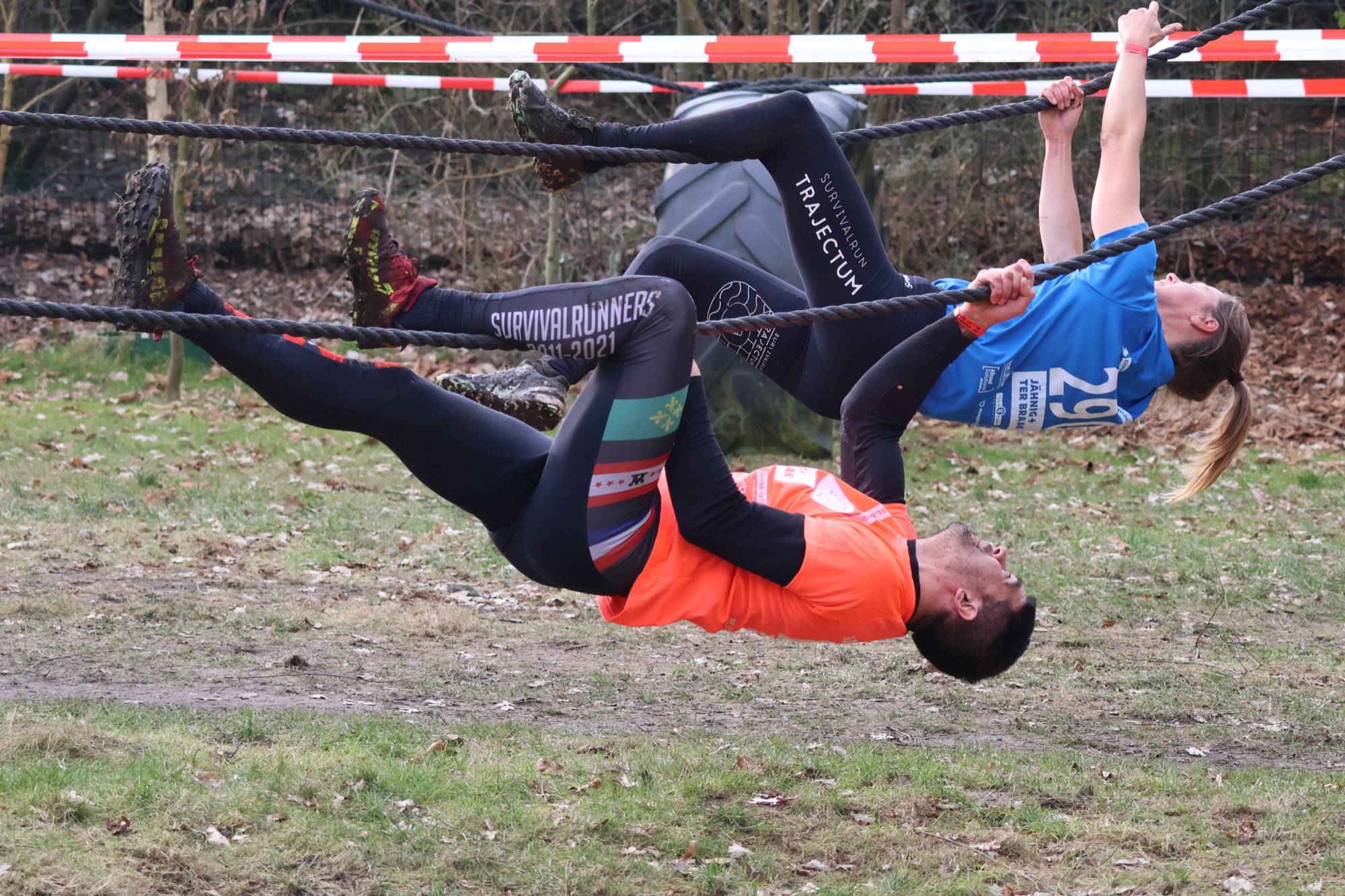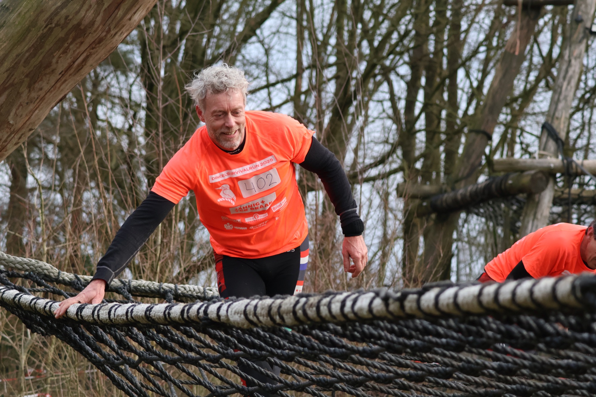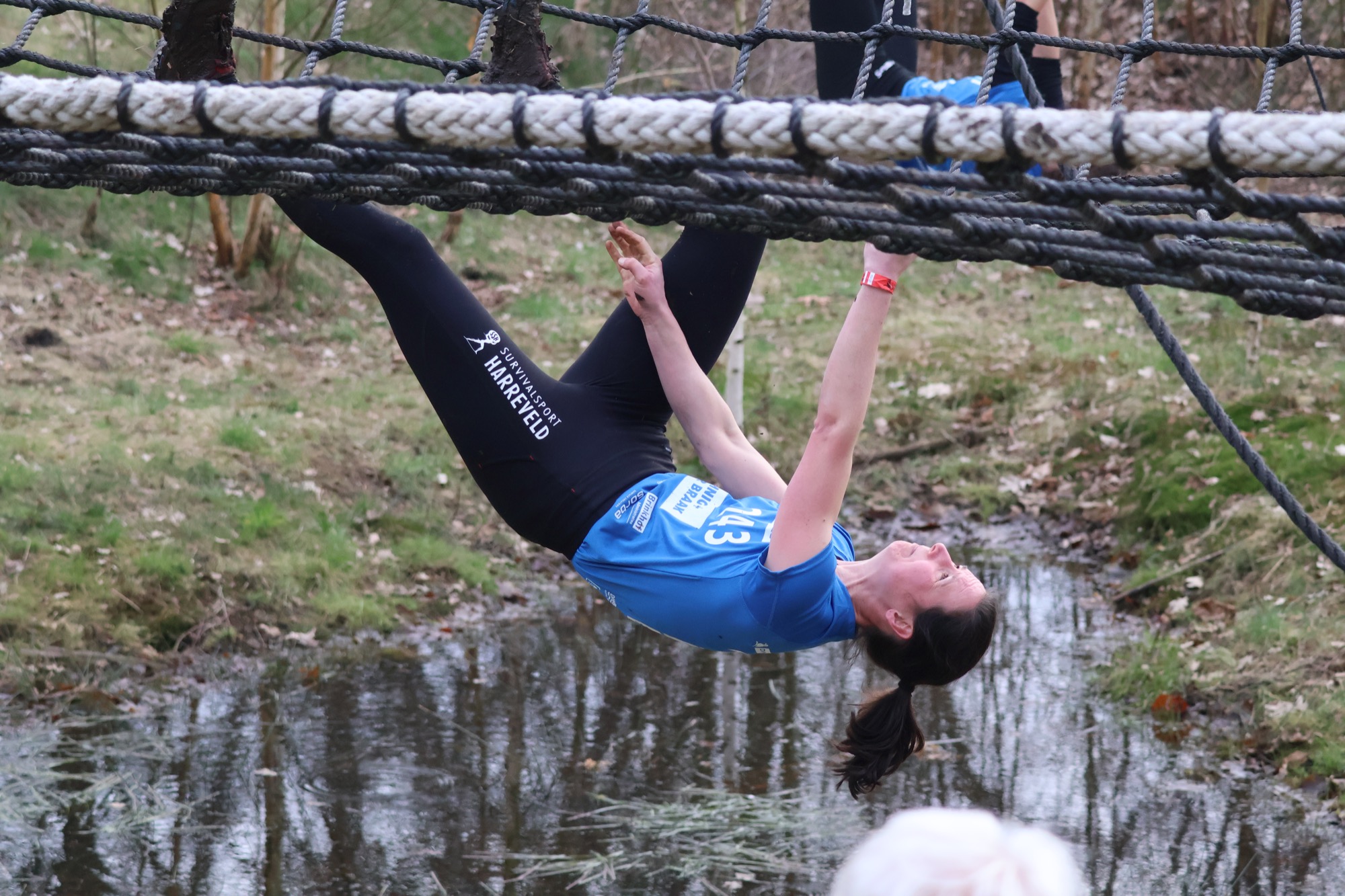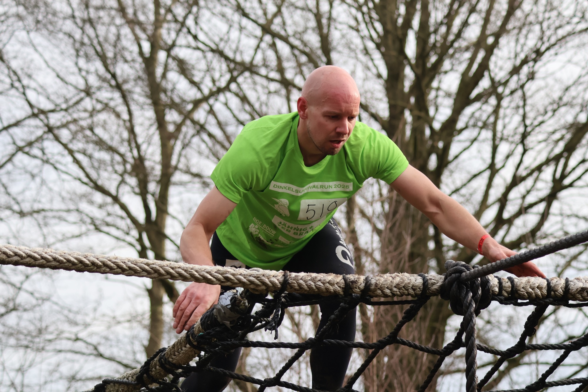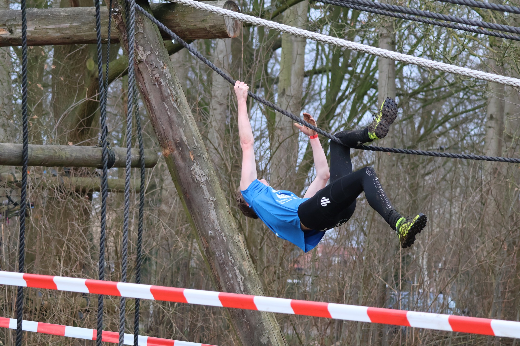 Deelnemers klimmen via het inklimtouw in het horizontale net. het gehele net klimmen ze onderlangs.