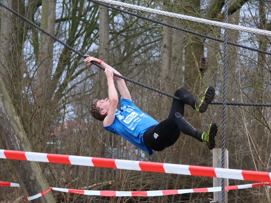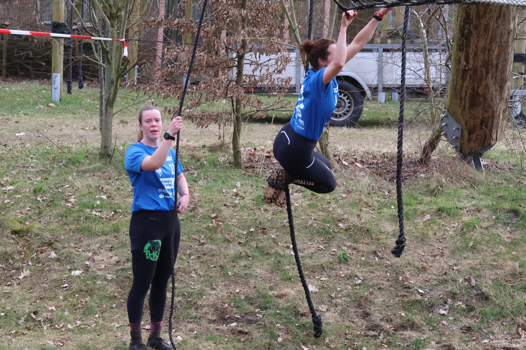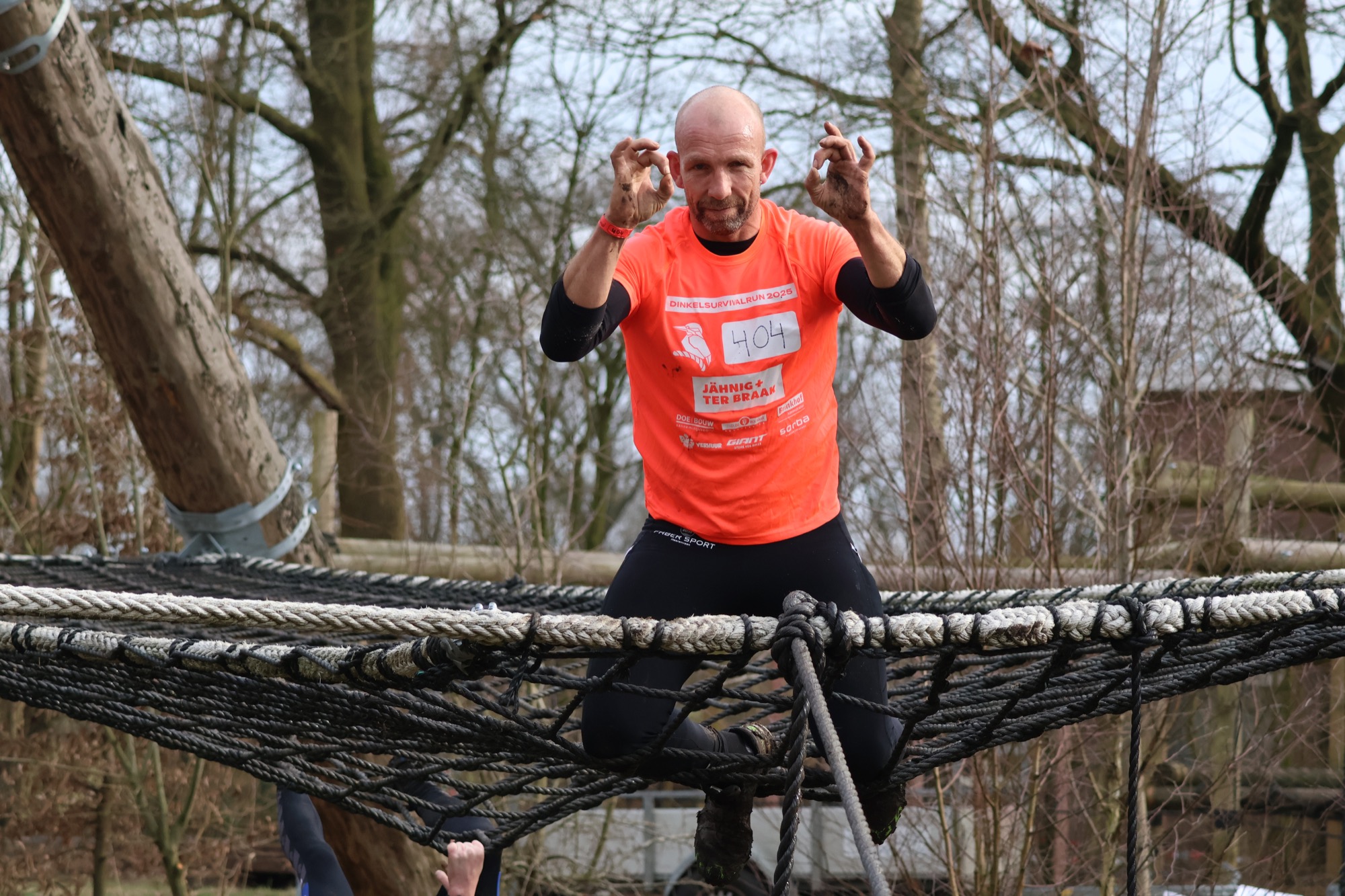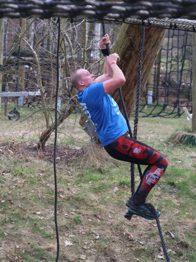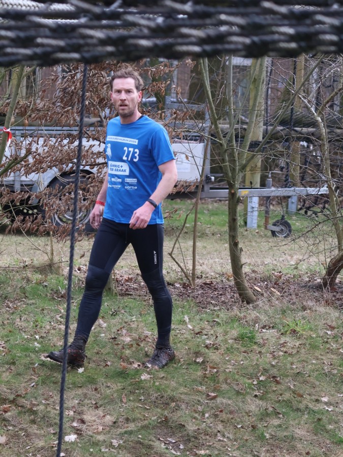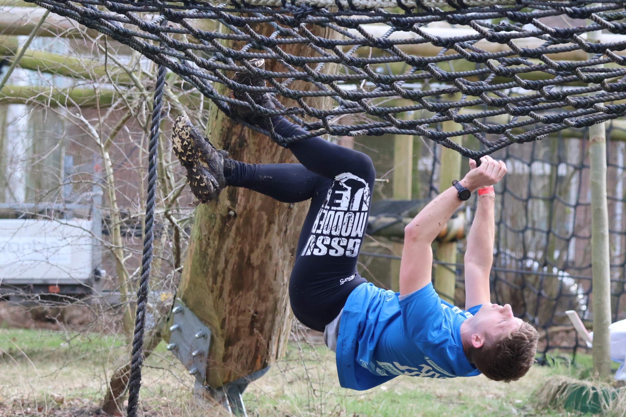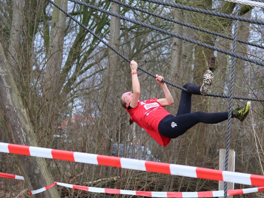 Deelnemers klimmen via het inklimtouw in het horizontale net. het gehele net klimmen ze onderlangs.