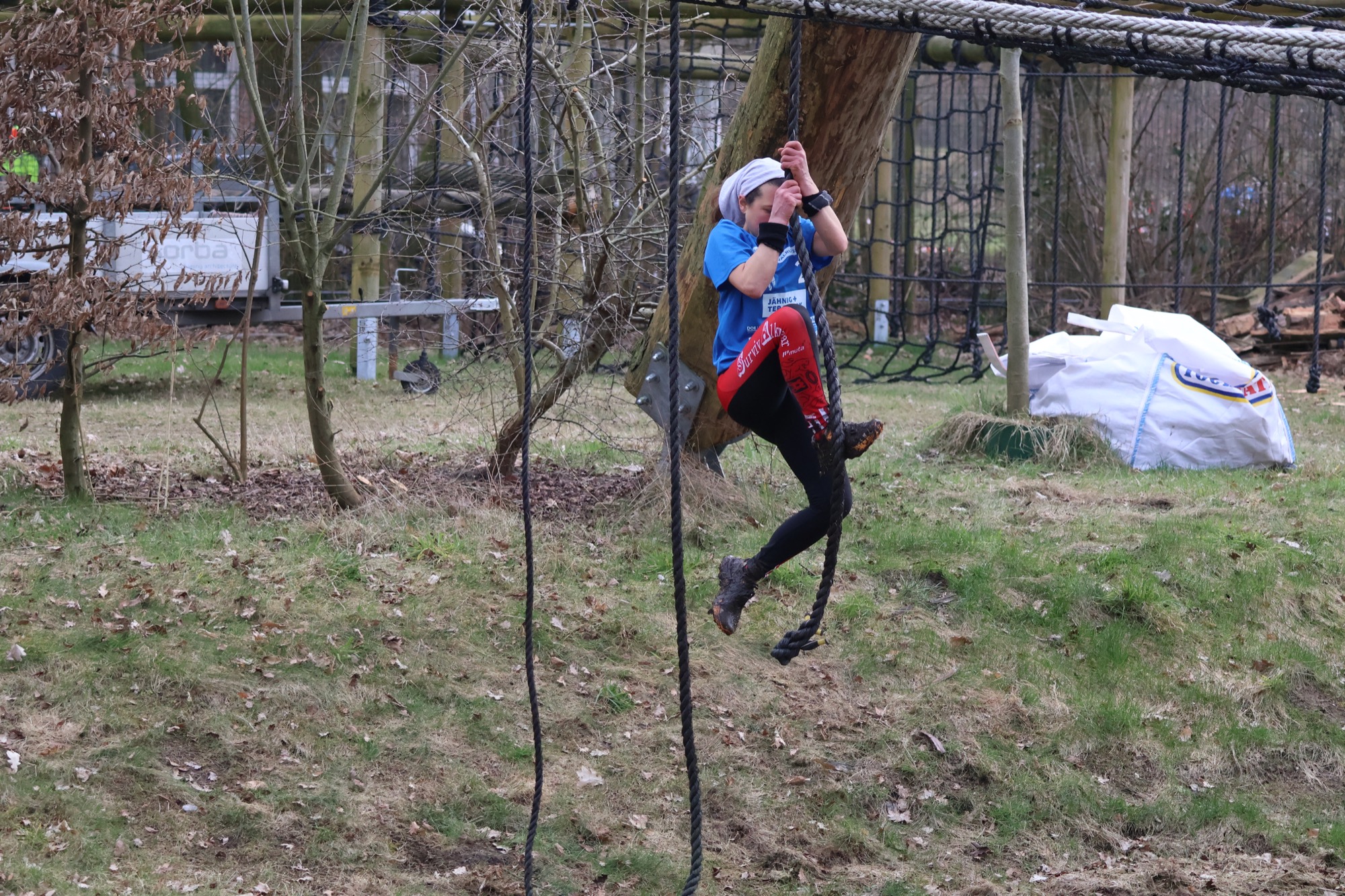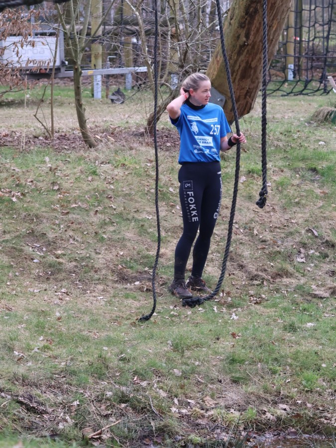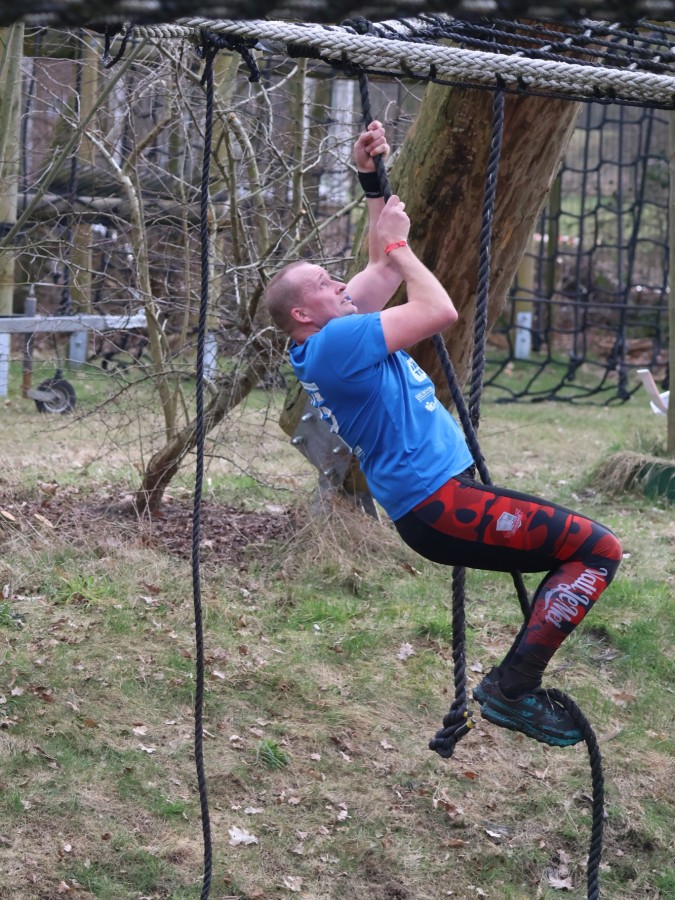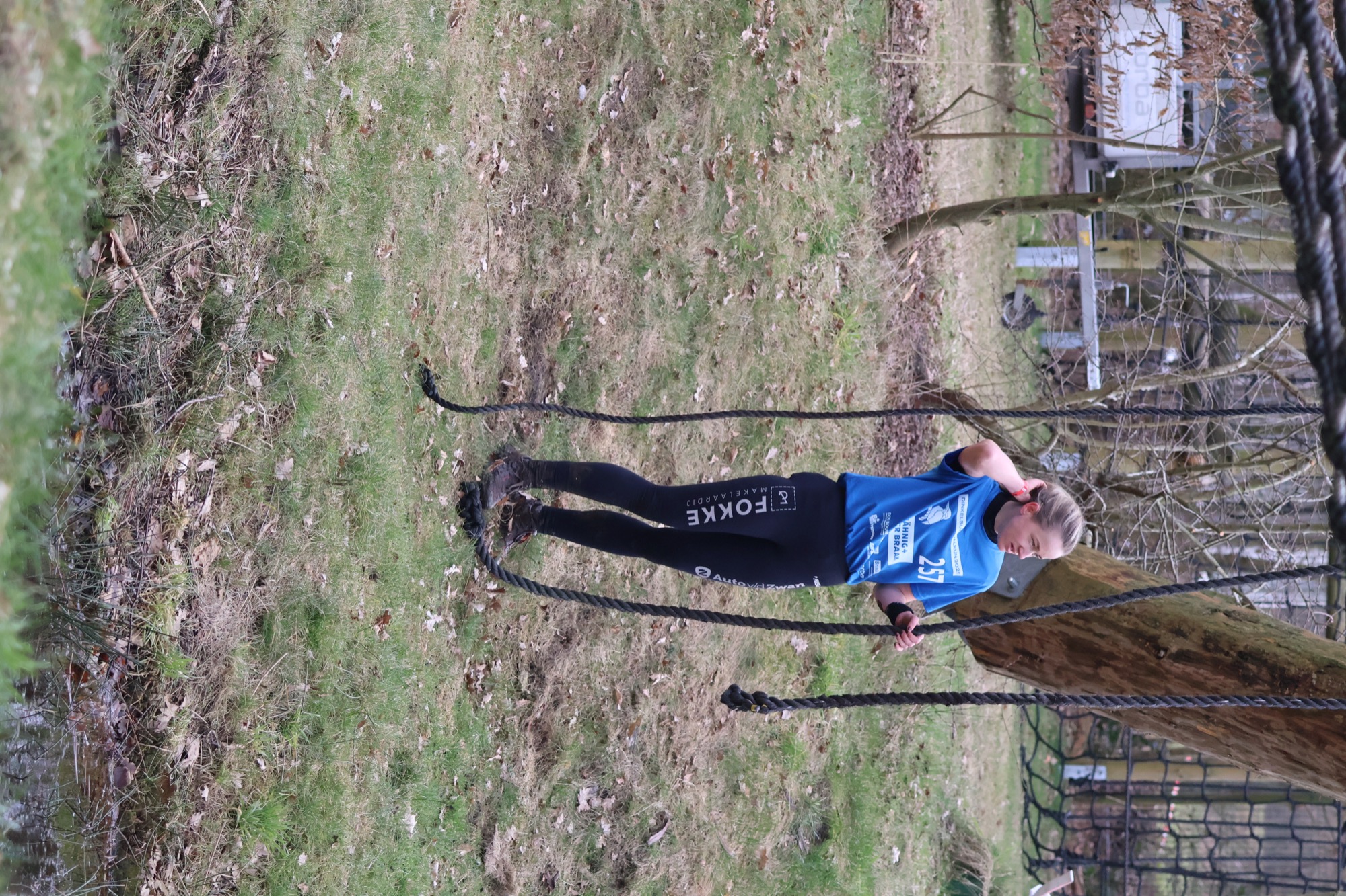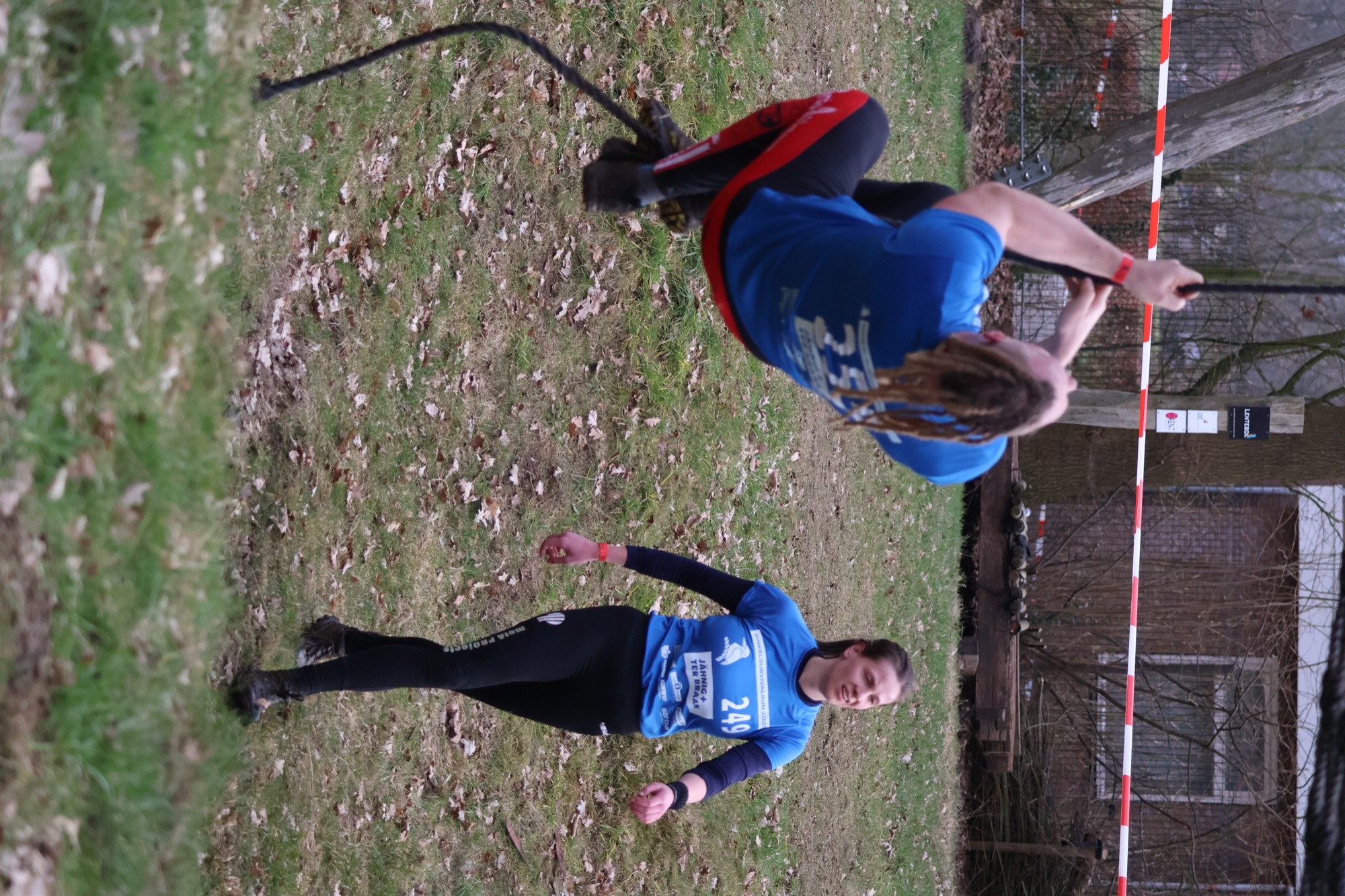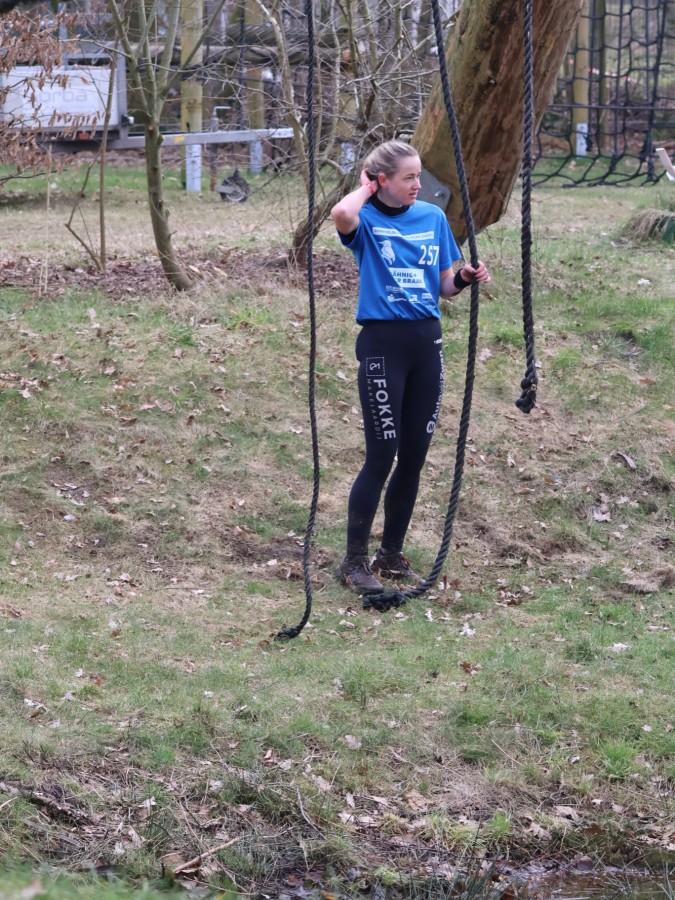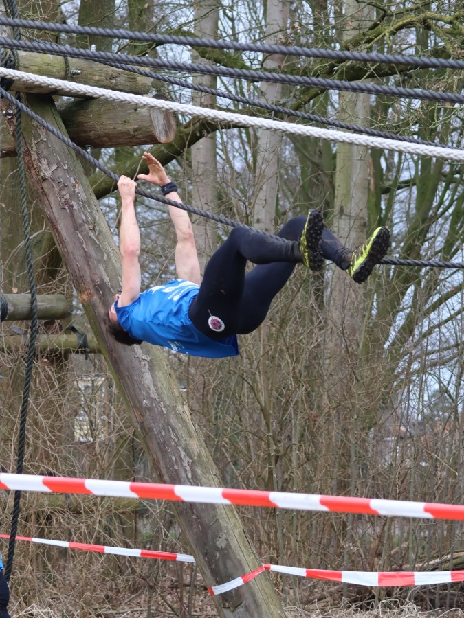 Deelnemers klimmen via het inklimtouw in het horizontale net. het gehele net klimmen ze onderlangs.