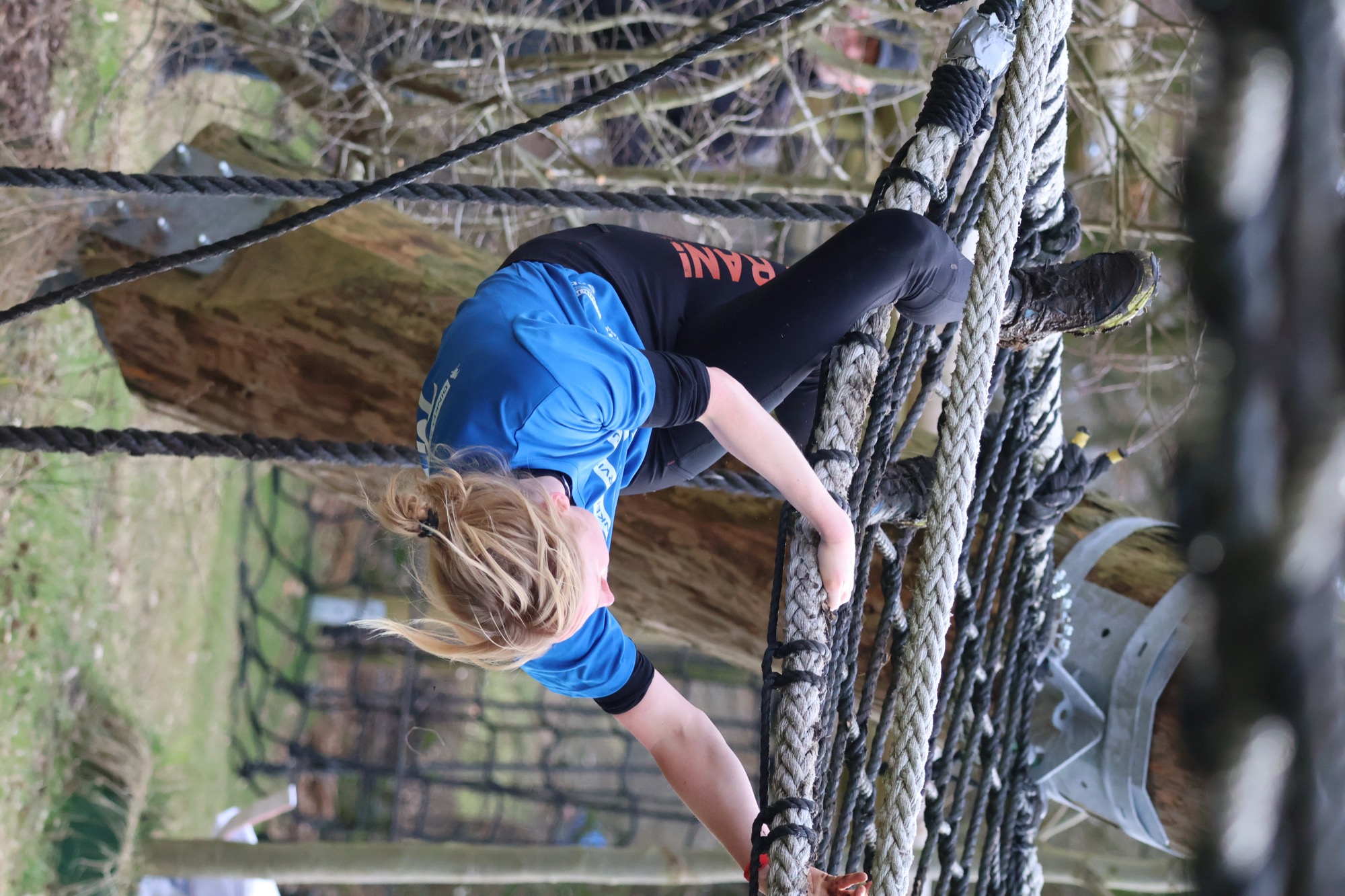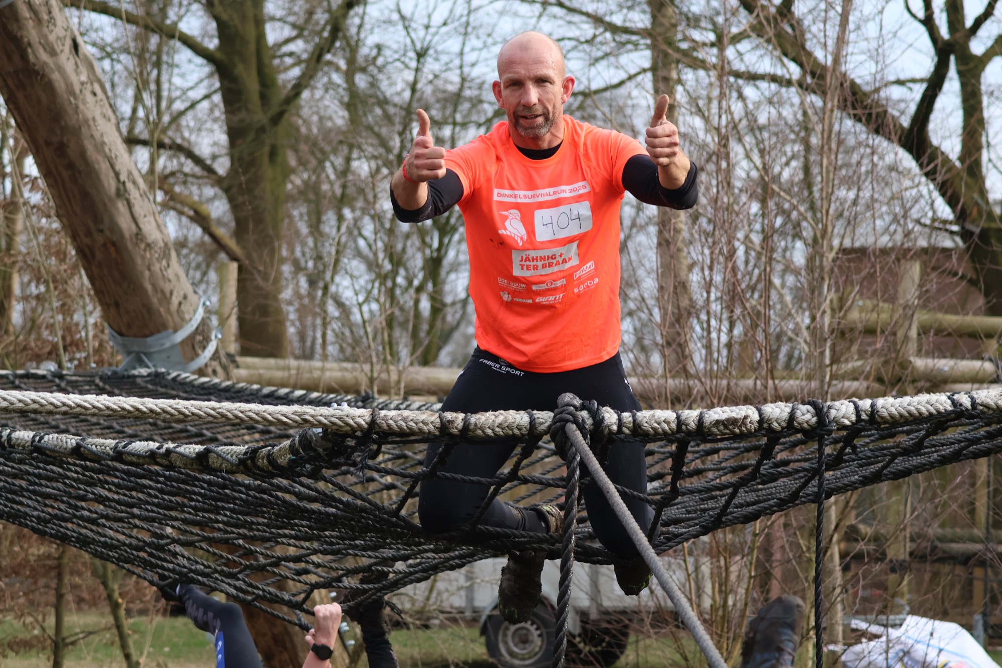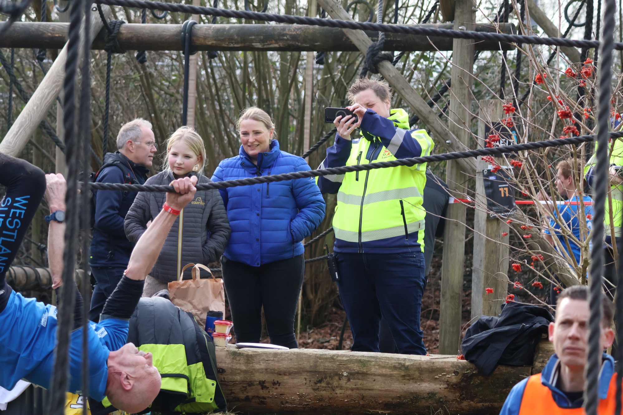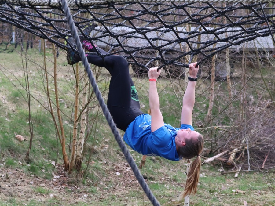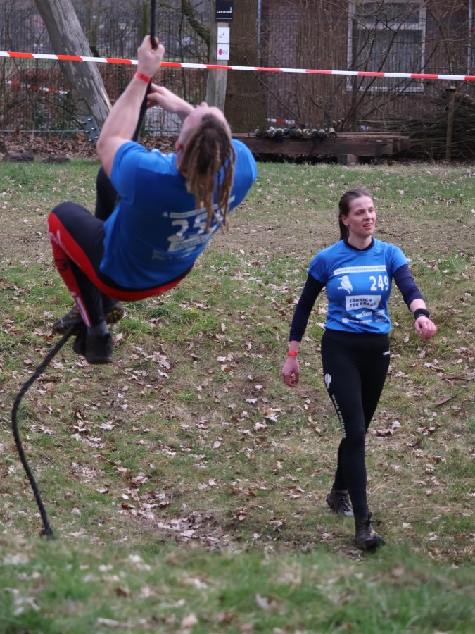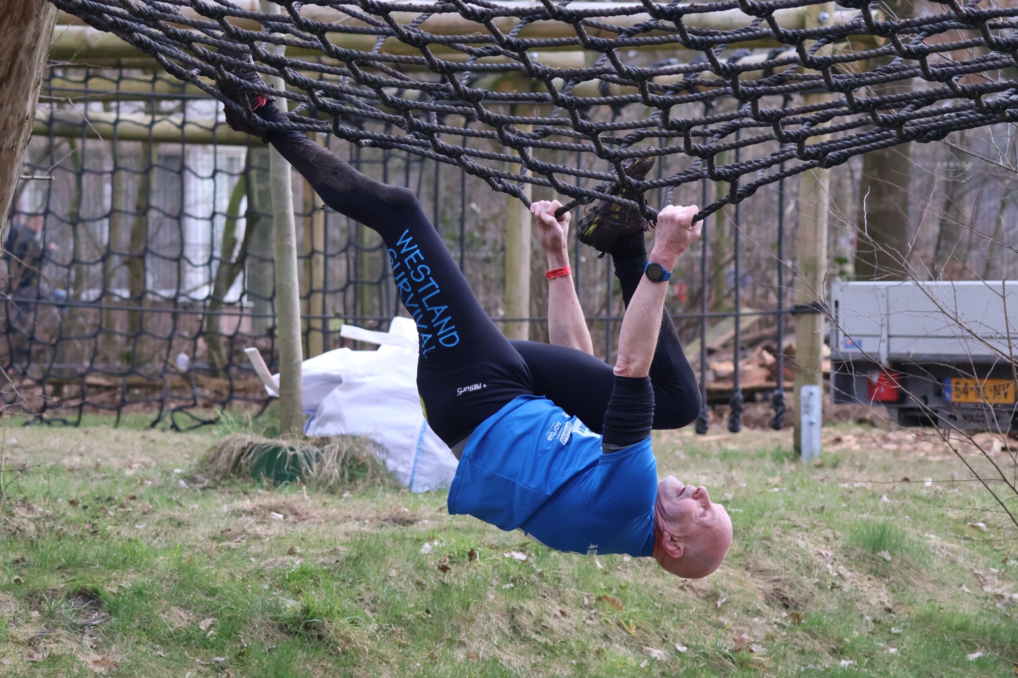 Deelnemers klimmen via het inklimtouw in het horizontale net. het gehele net klimmen ze onderlangs.