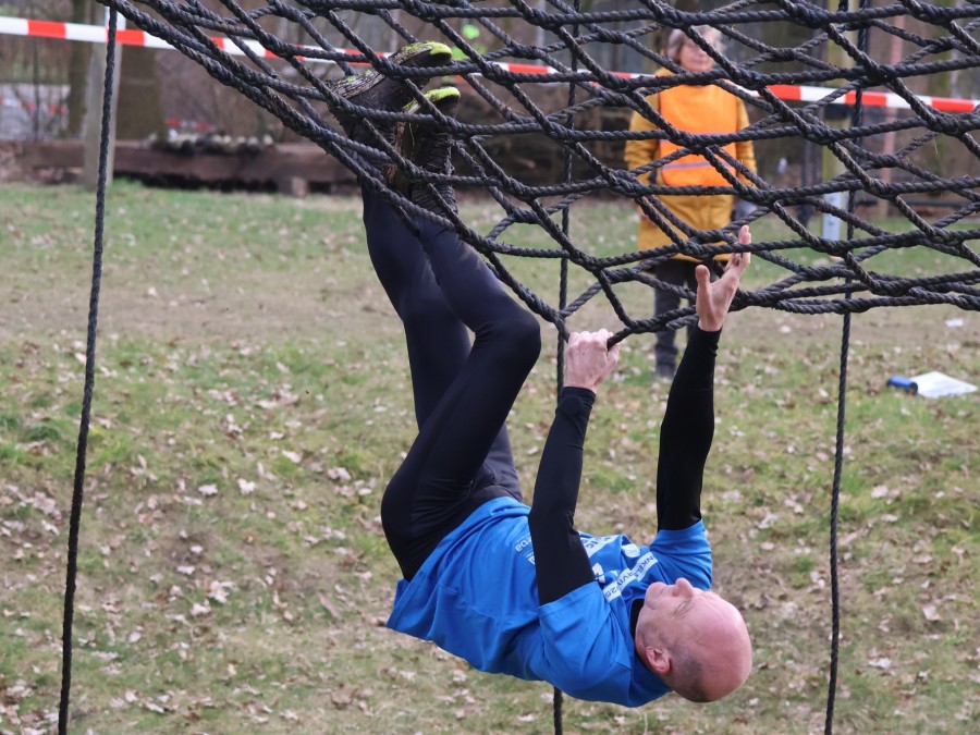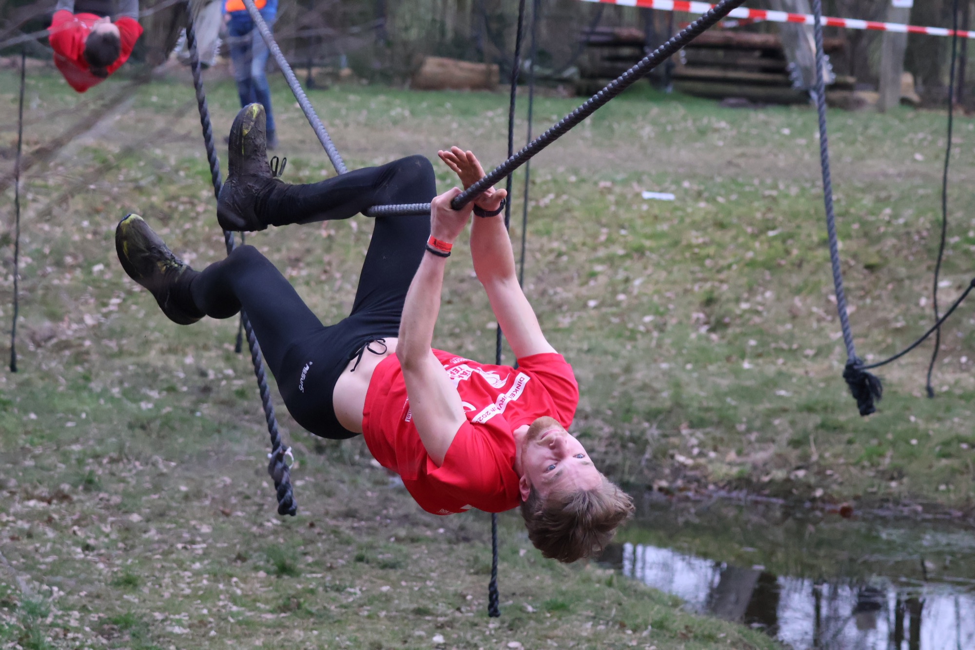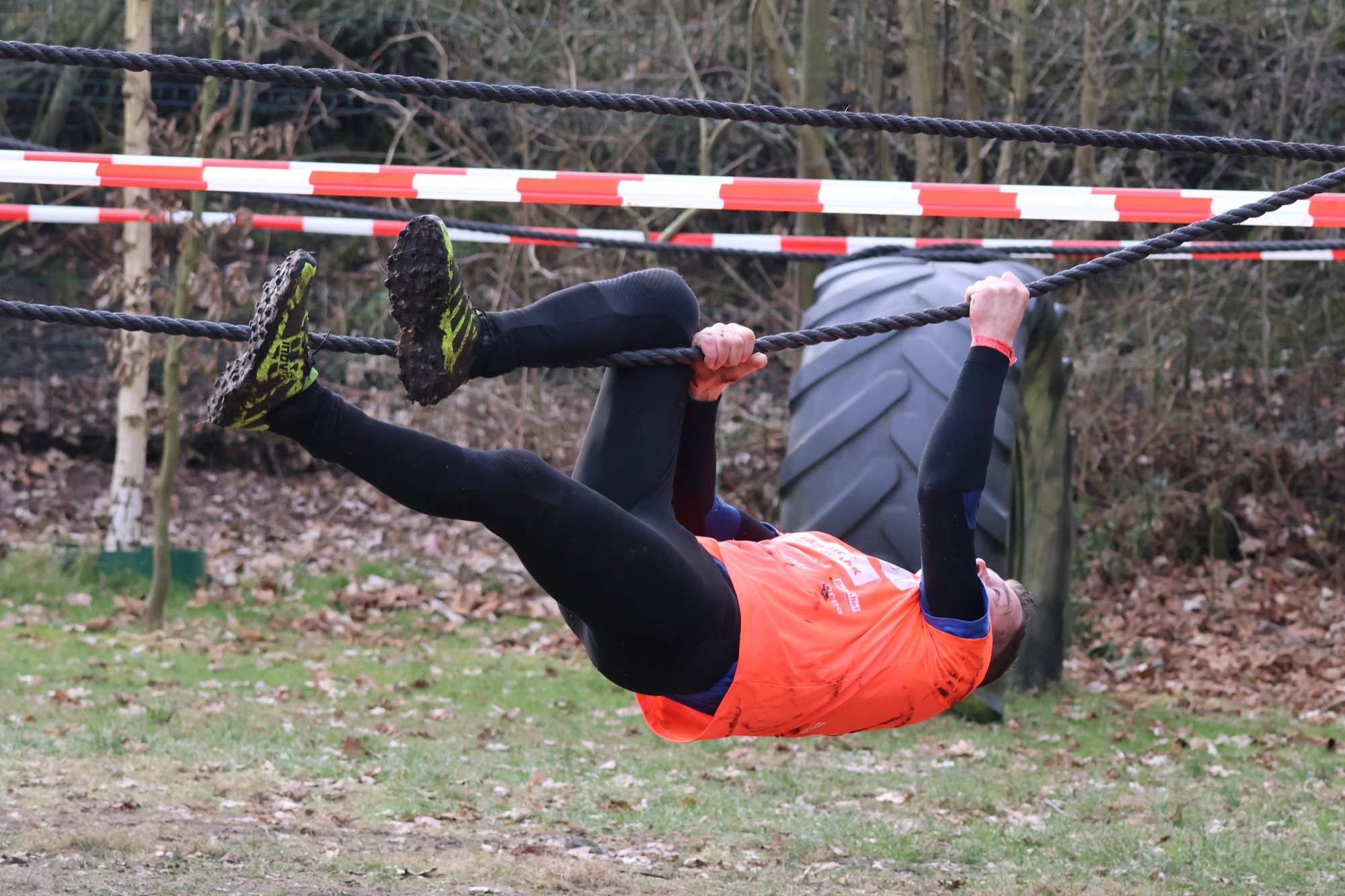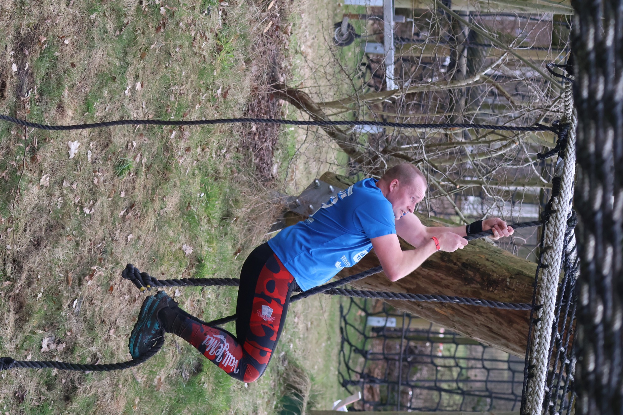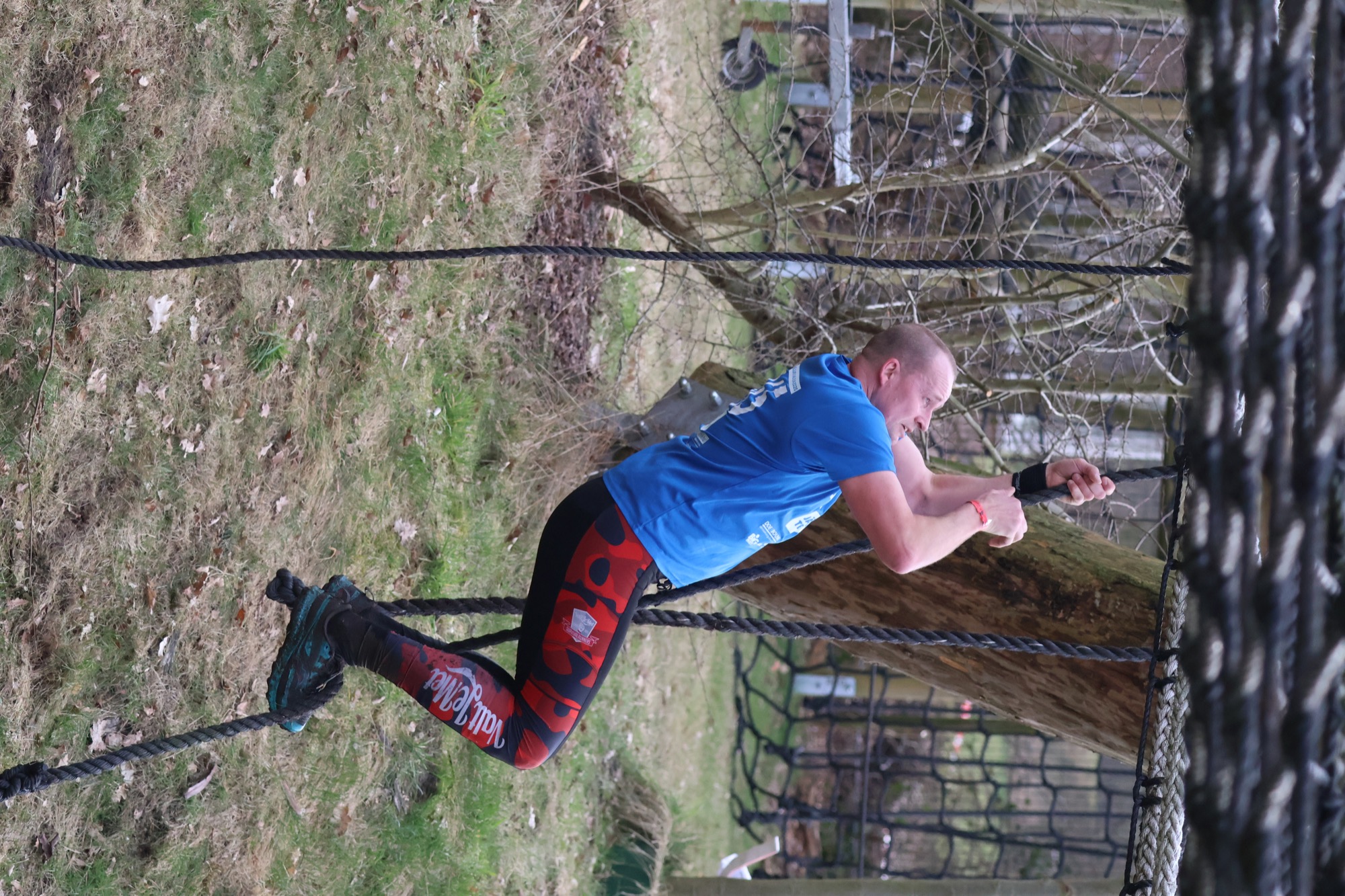 Deelnemers klimmen via het inklimtouw in het horizontale net. het gehele net klimmen ze onderlangs.