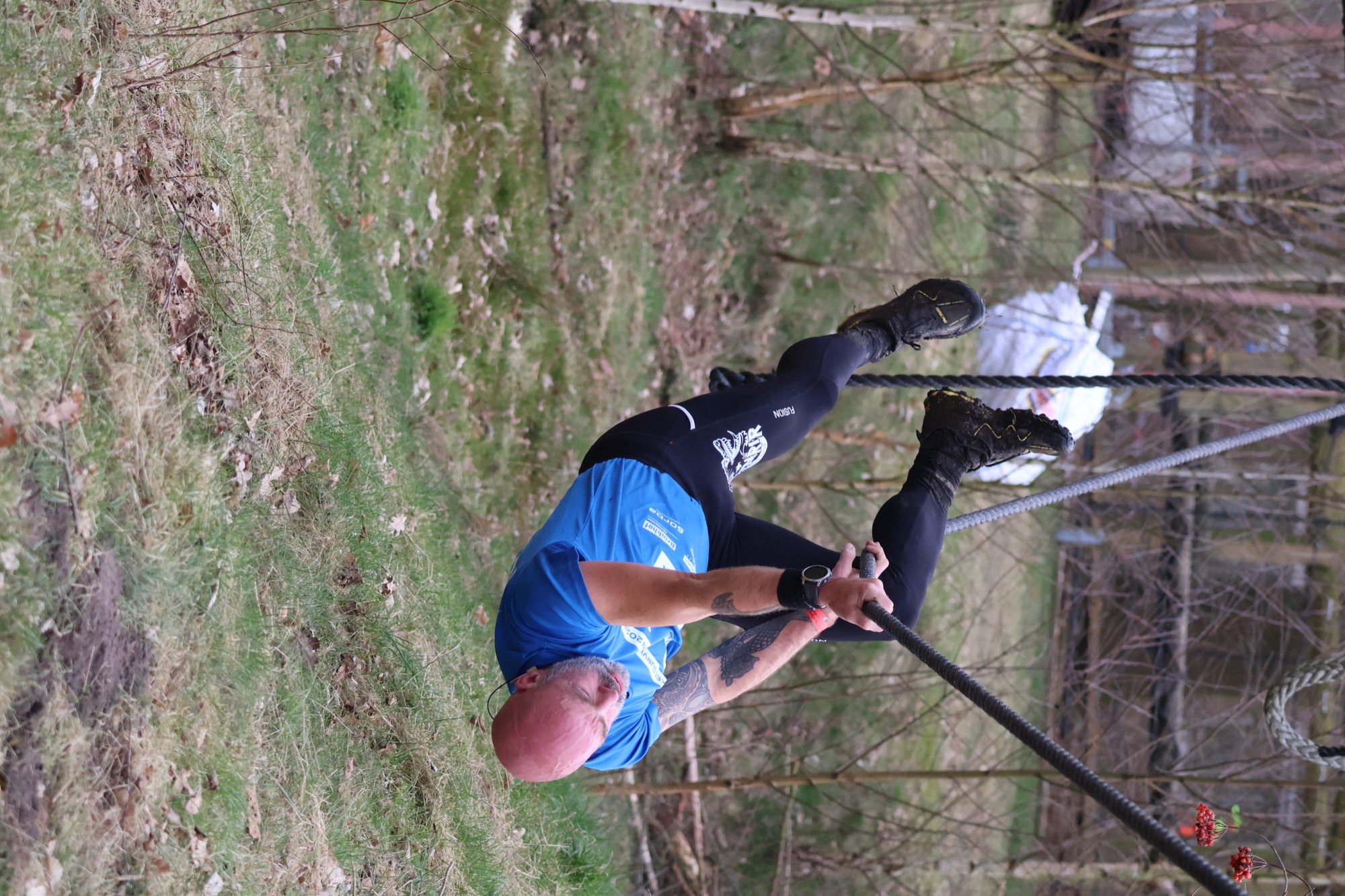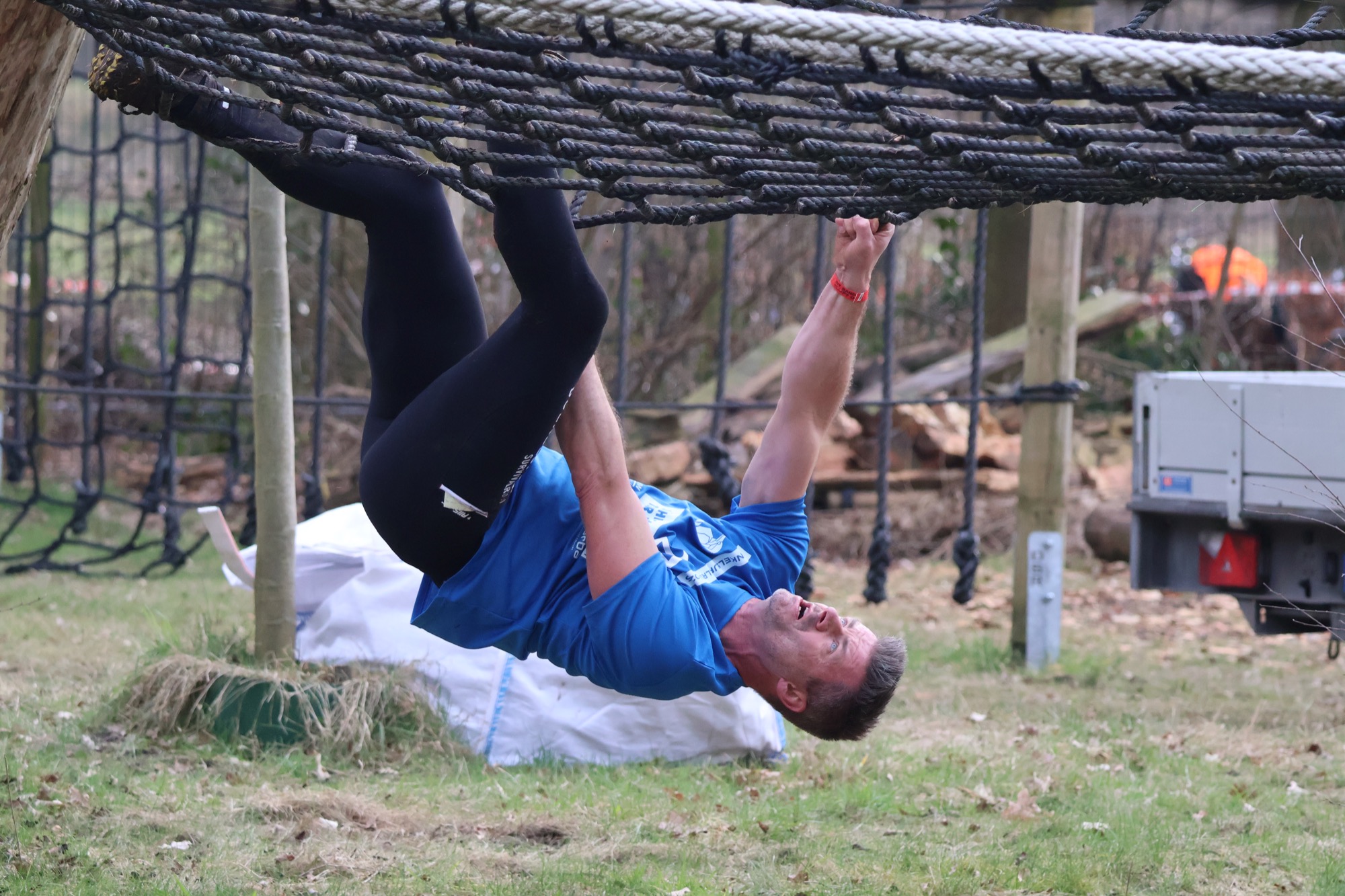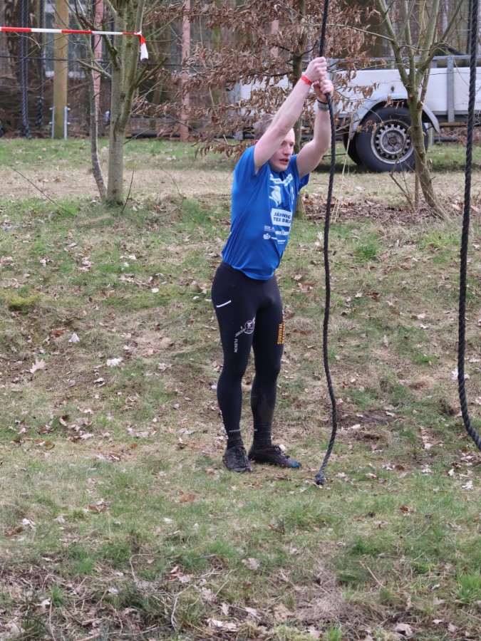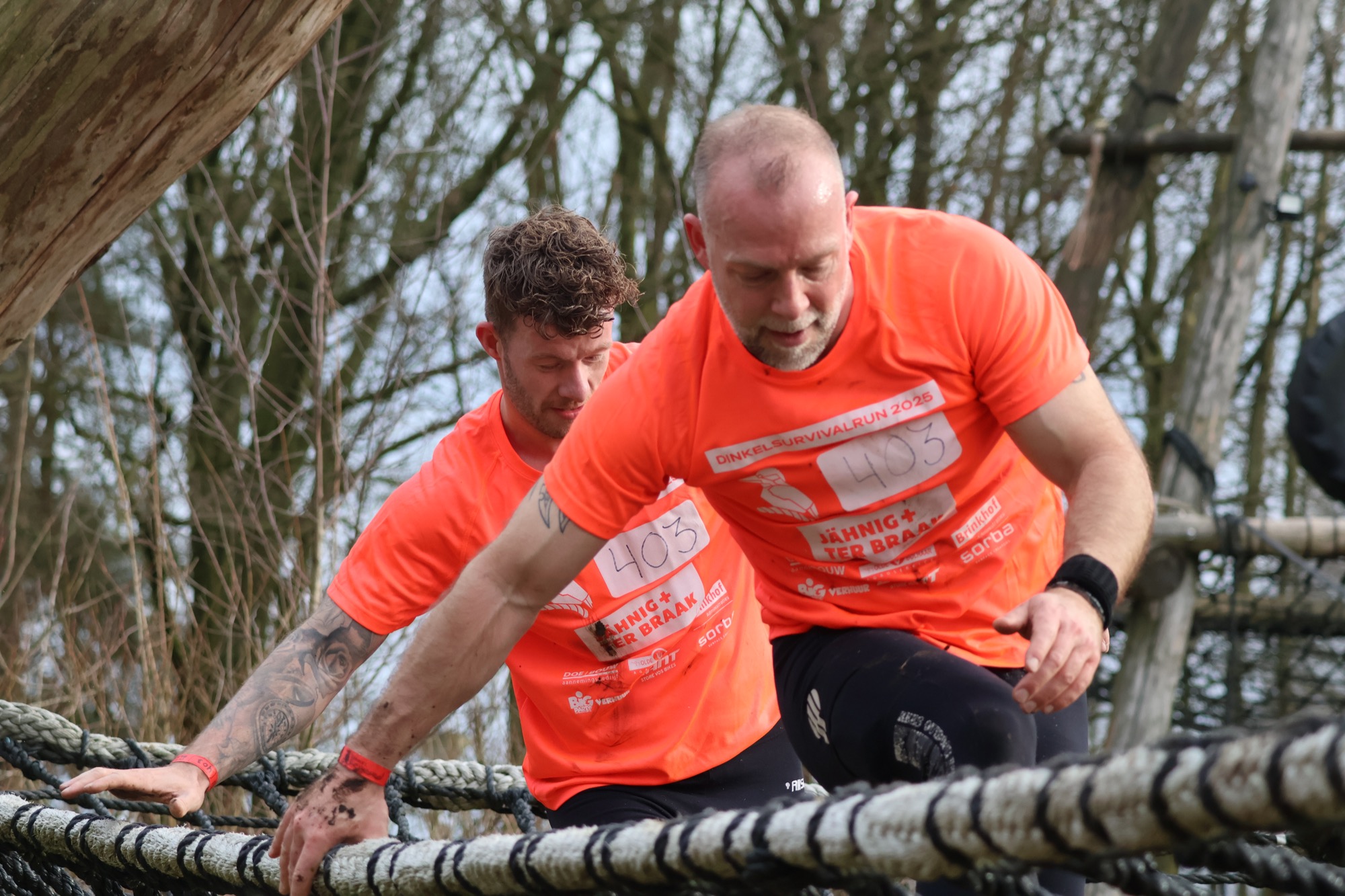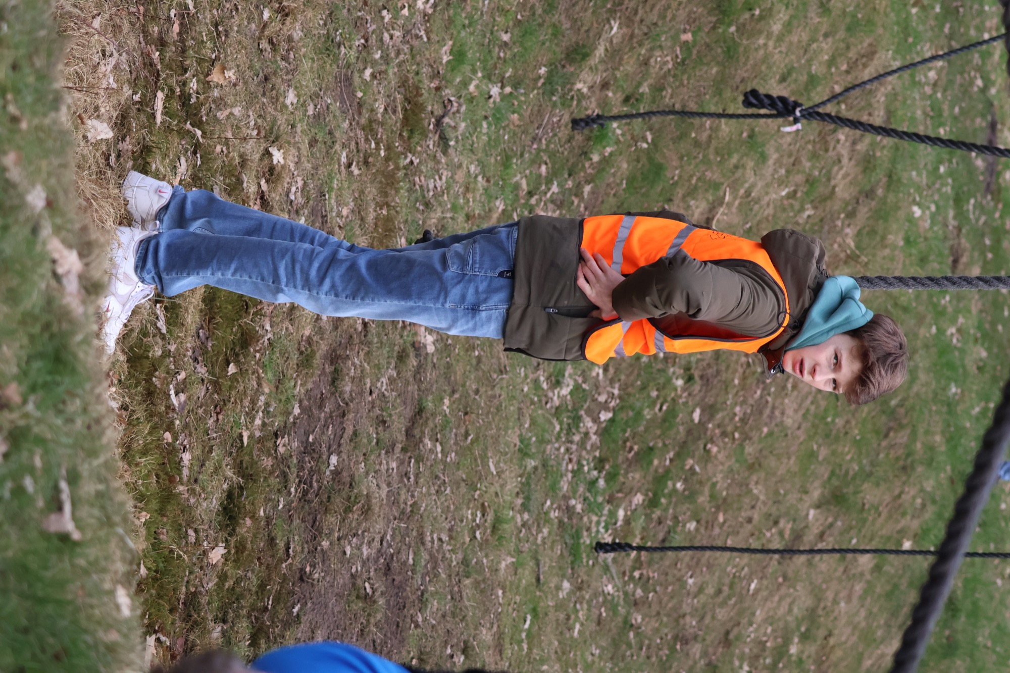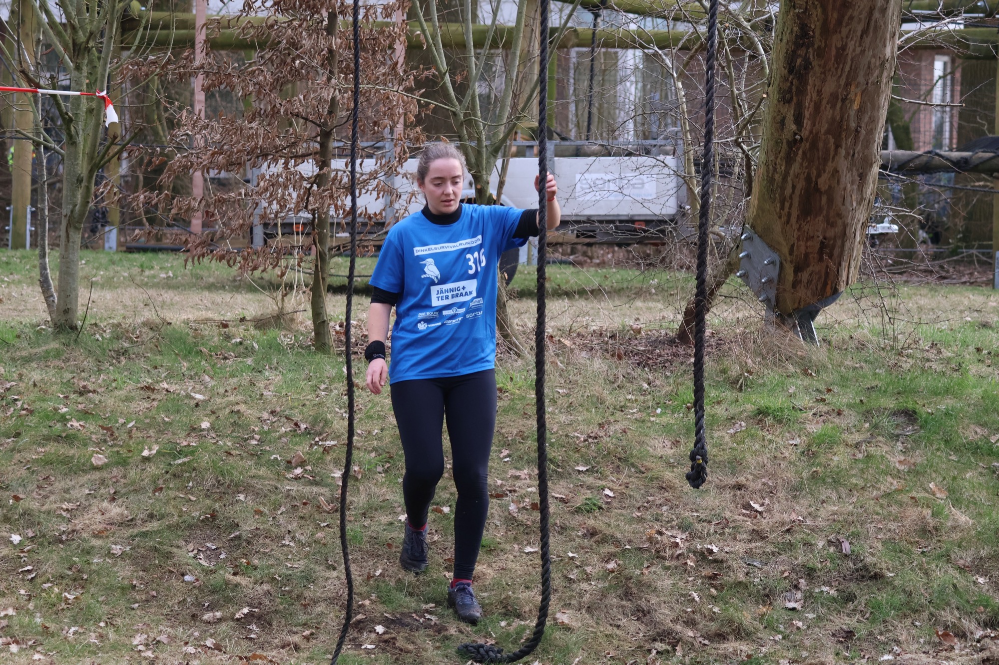 Deelnemers klimmen via het inklimtouw in het horizontale net. het gehele net klimmen ze onderlangs.