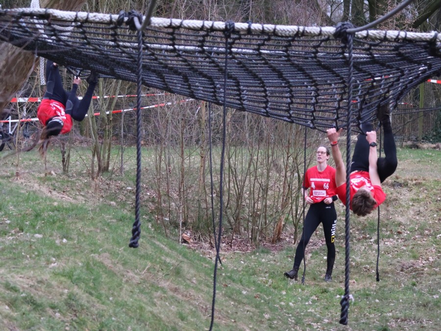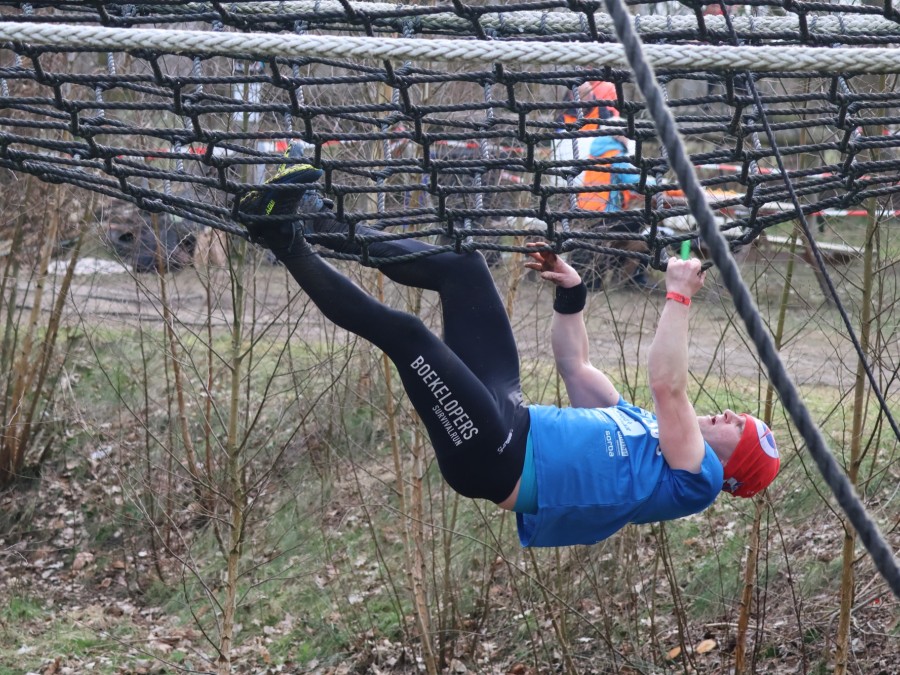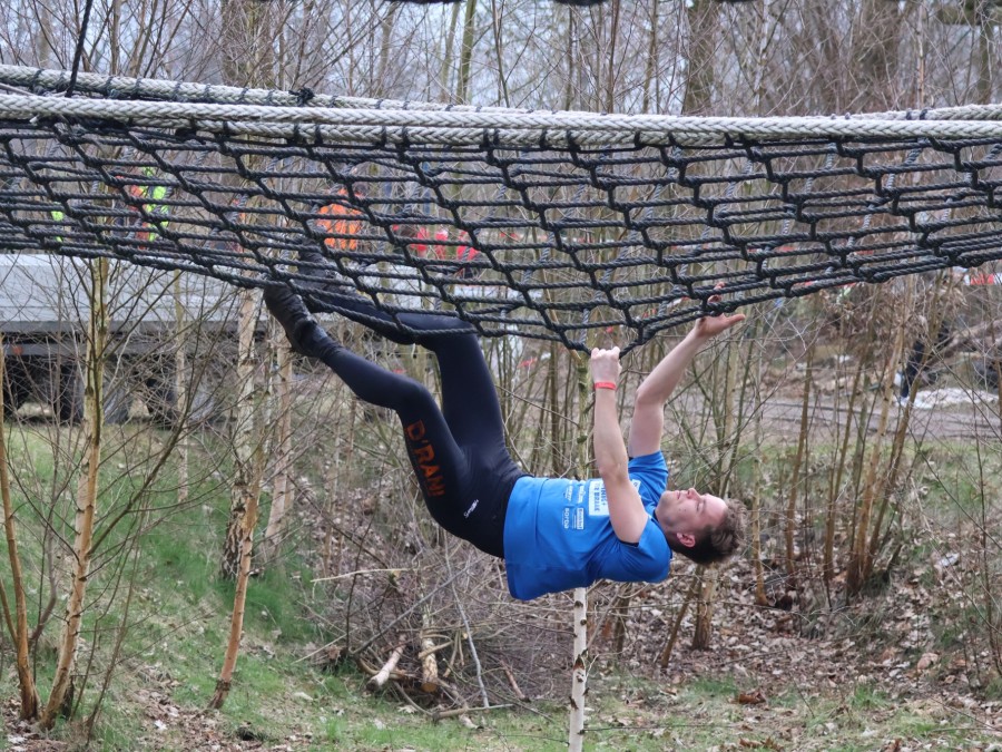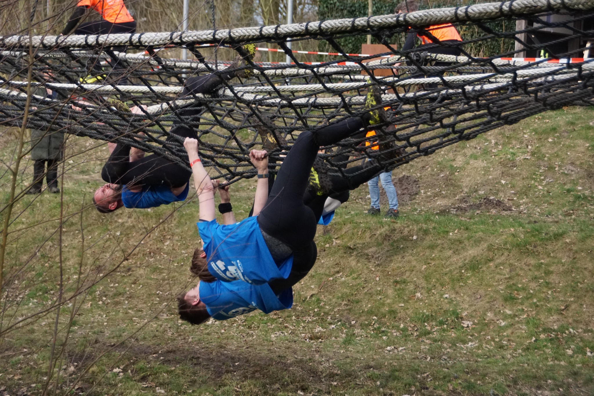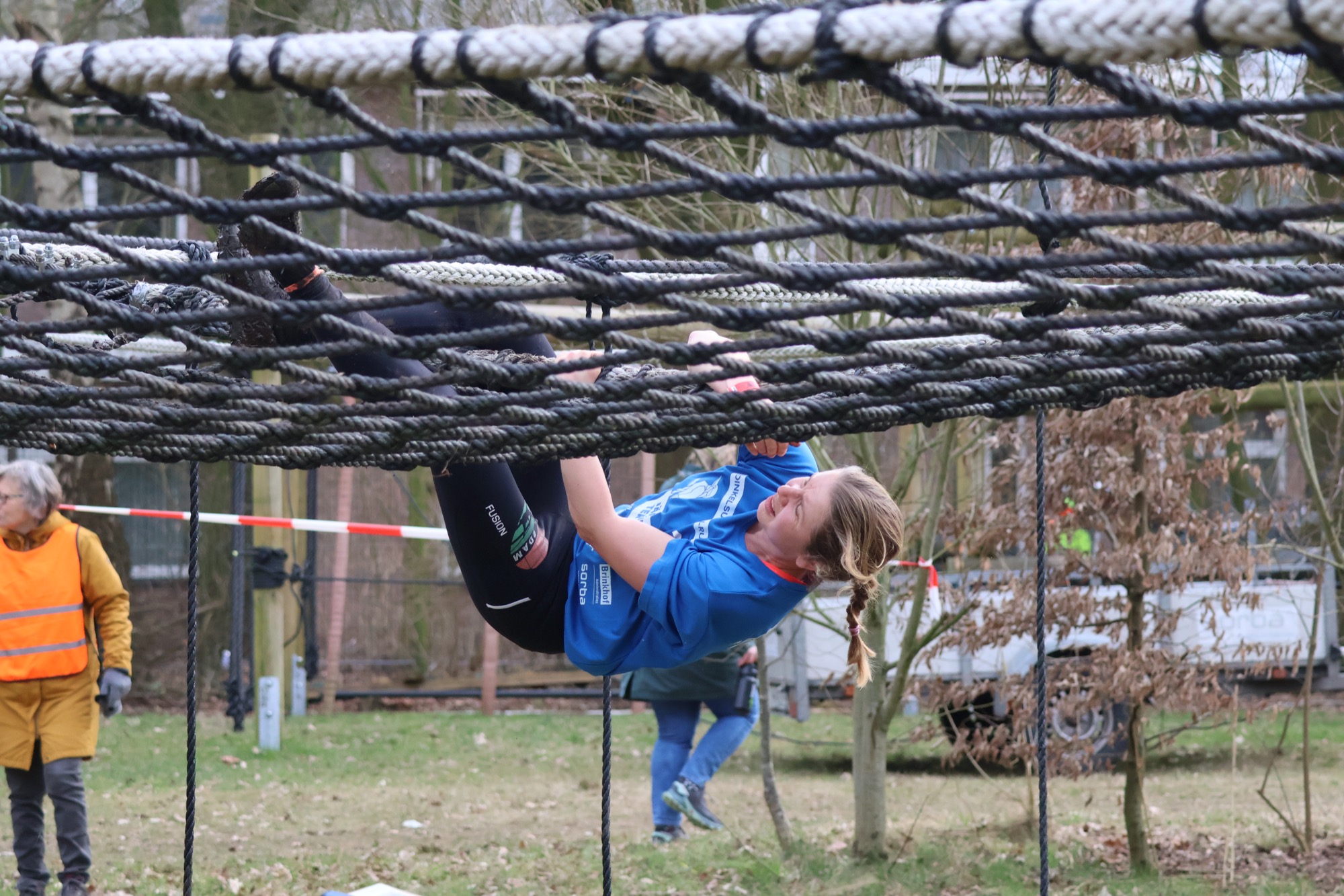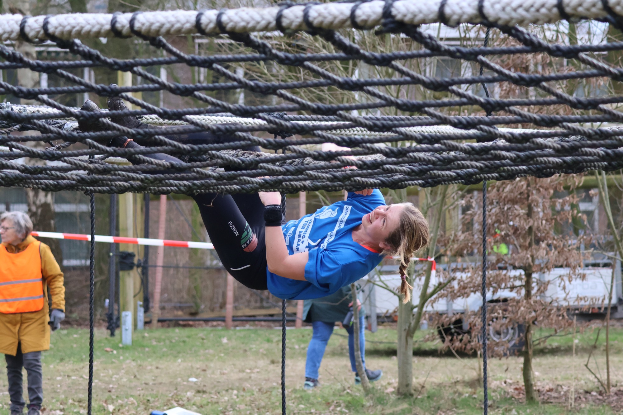 Deelnemers klimmen via het inklimtouw in het horizontale net. Het gehele net klimmen ze bovenlangs.
