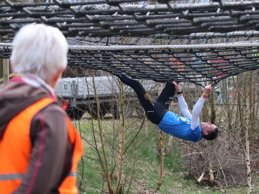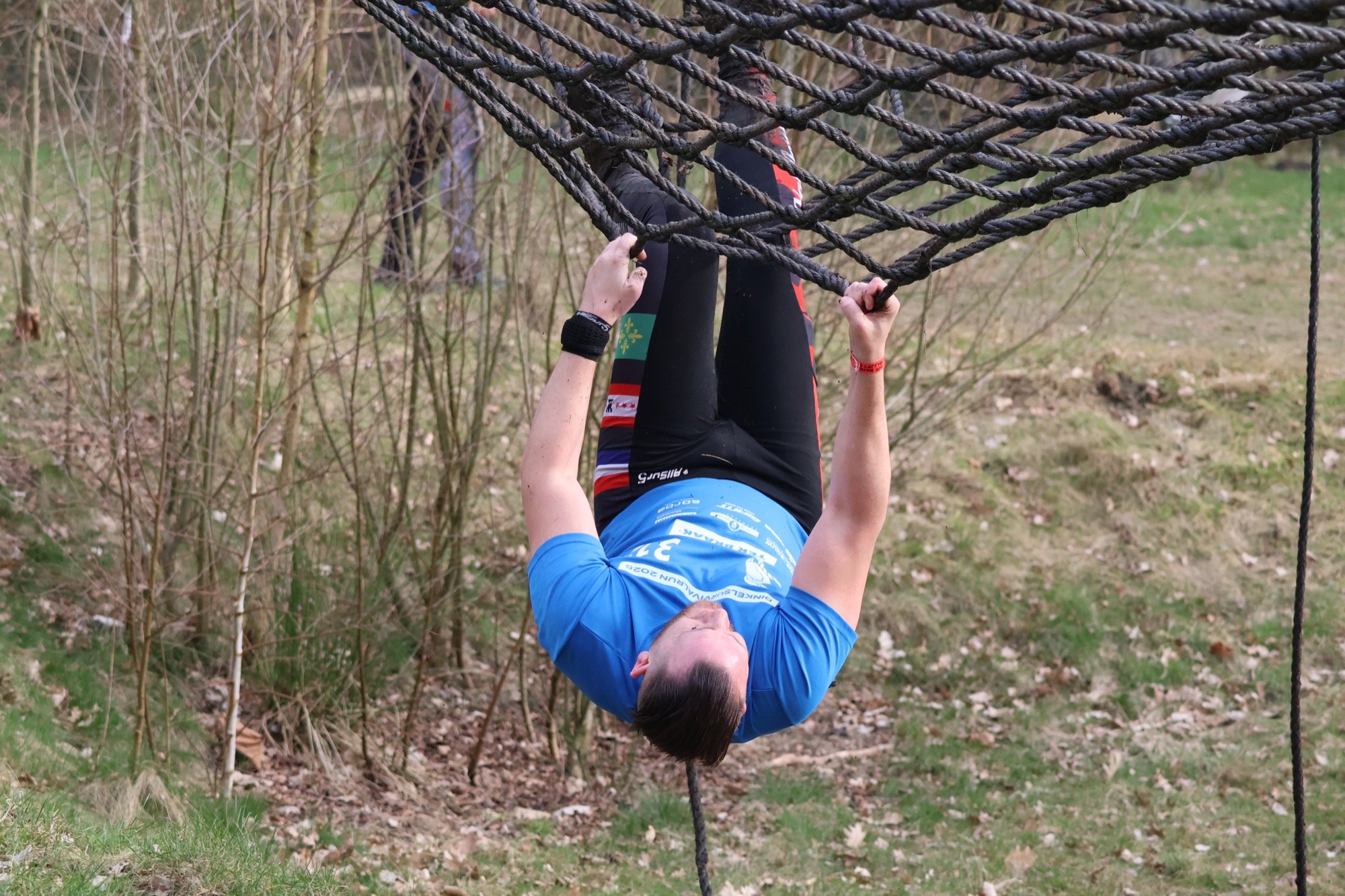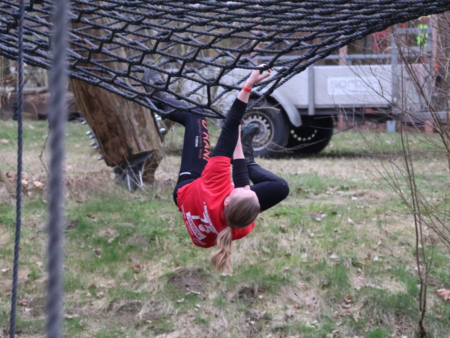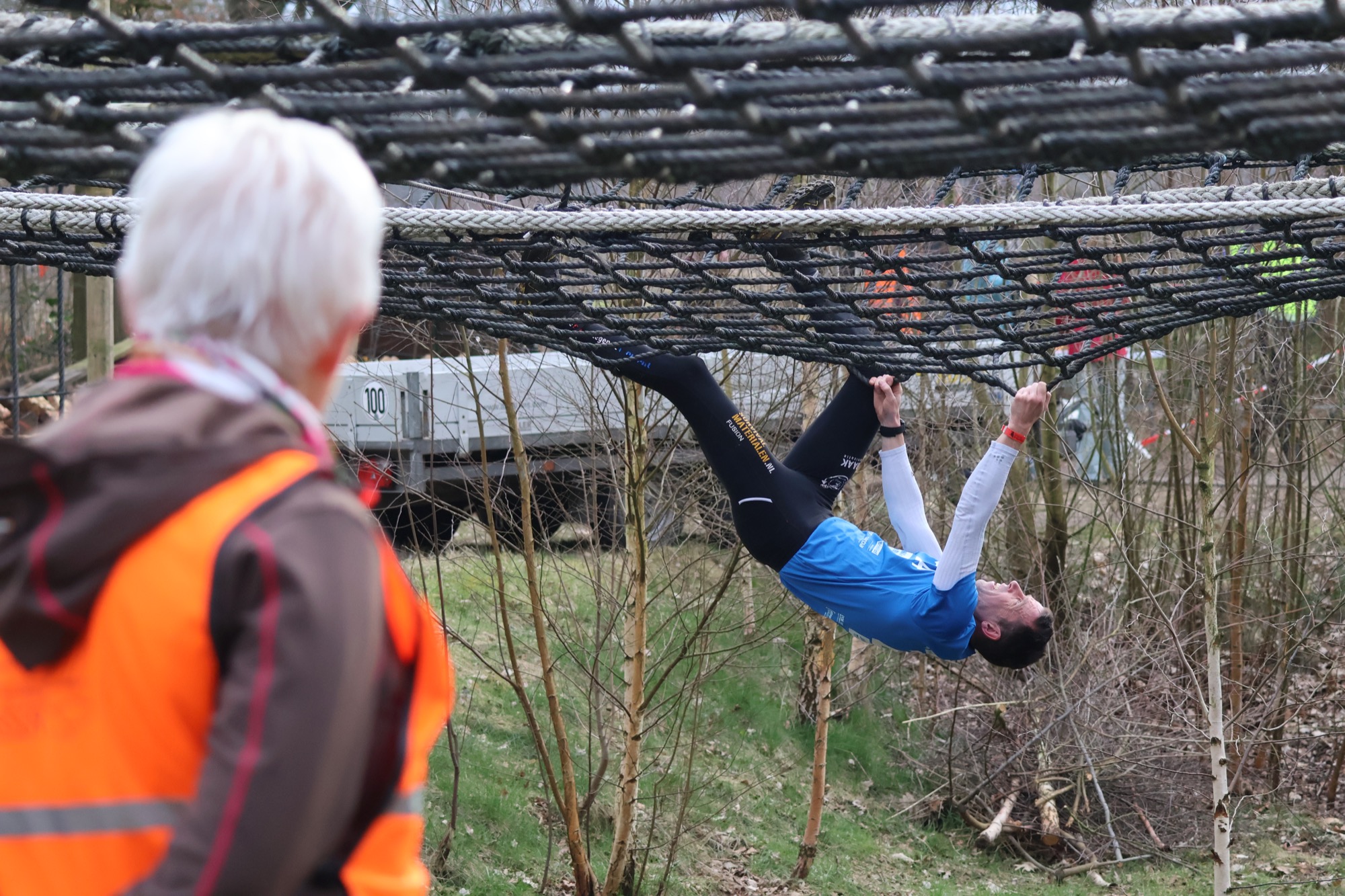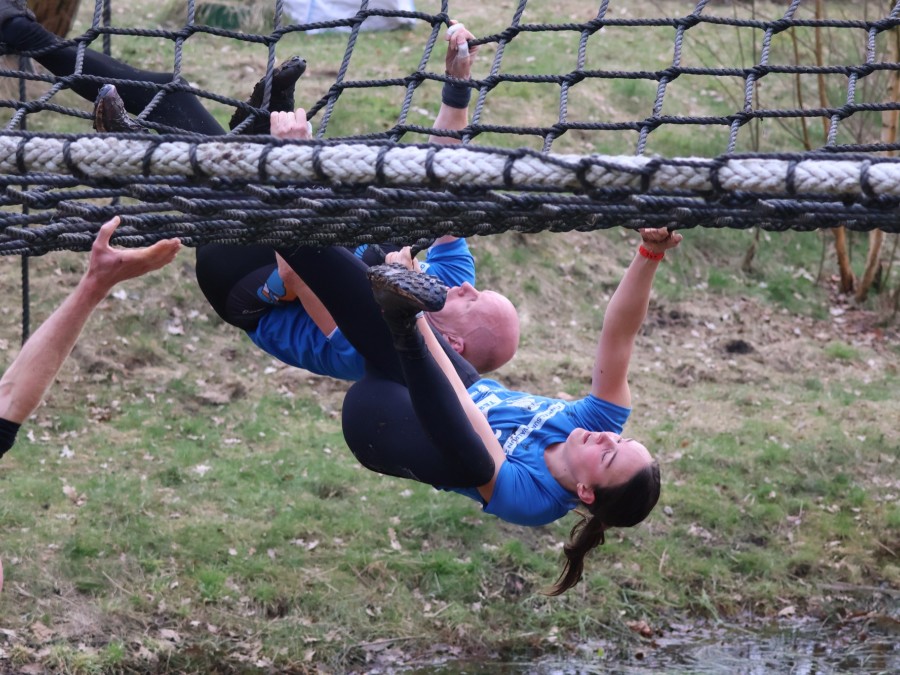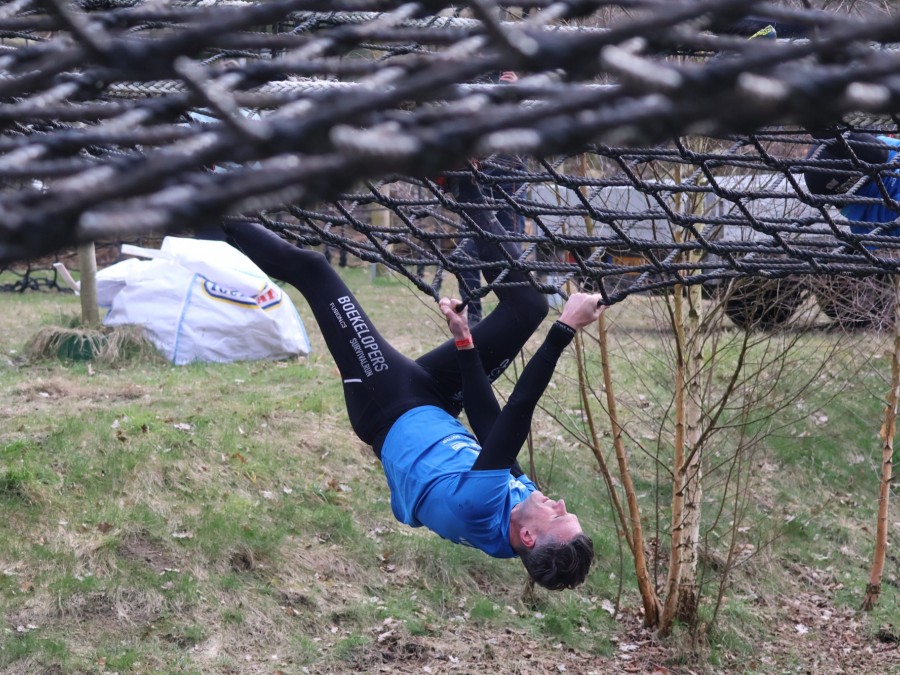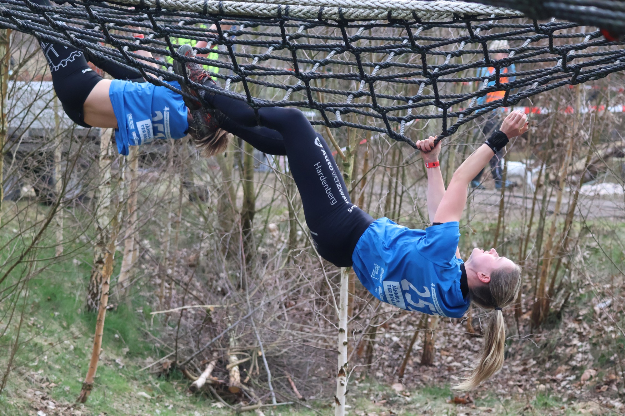 Deelnemers klimmen via het inklimtouw in het horizontale net. Het gehele net klimmen ze bovenlangs.