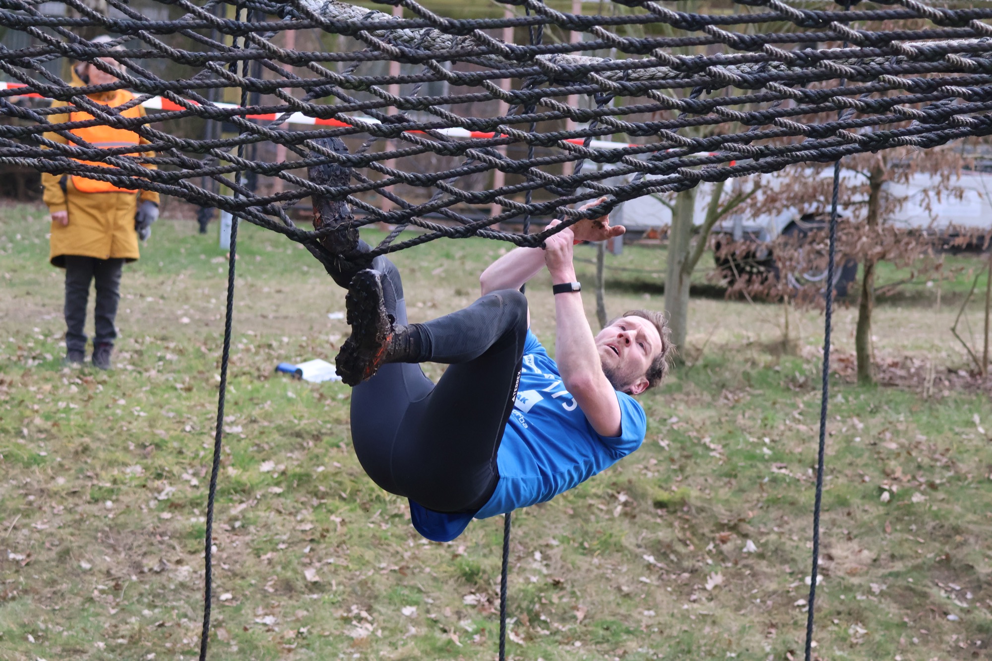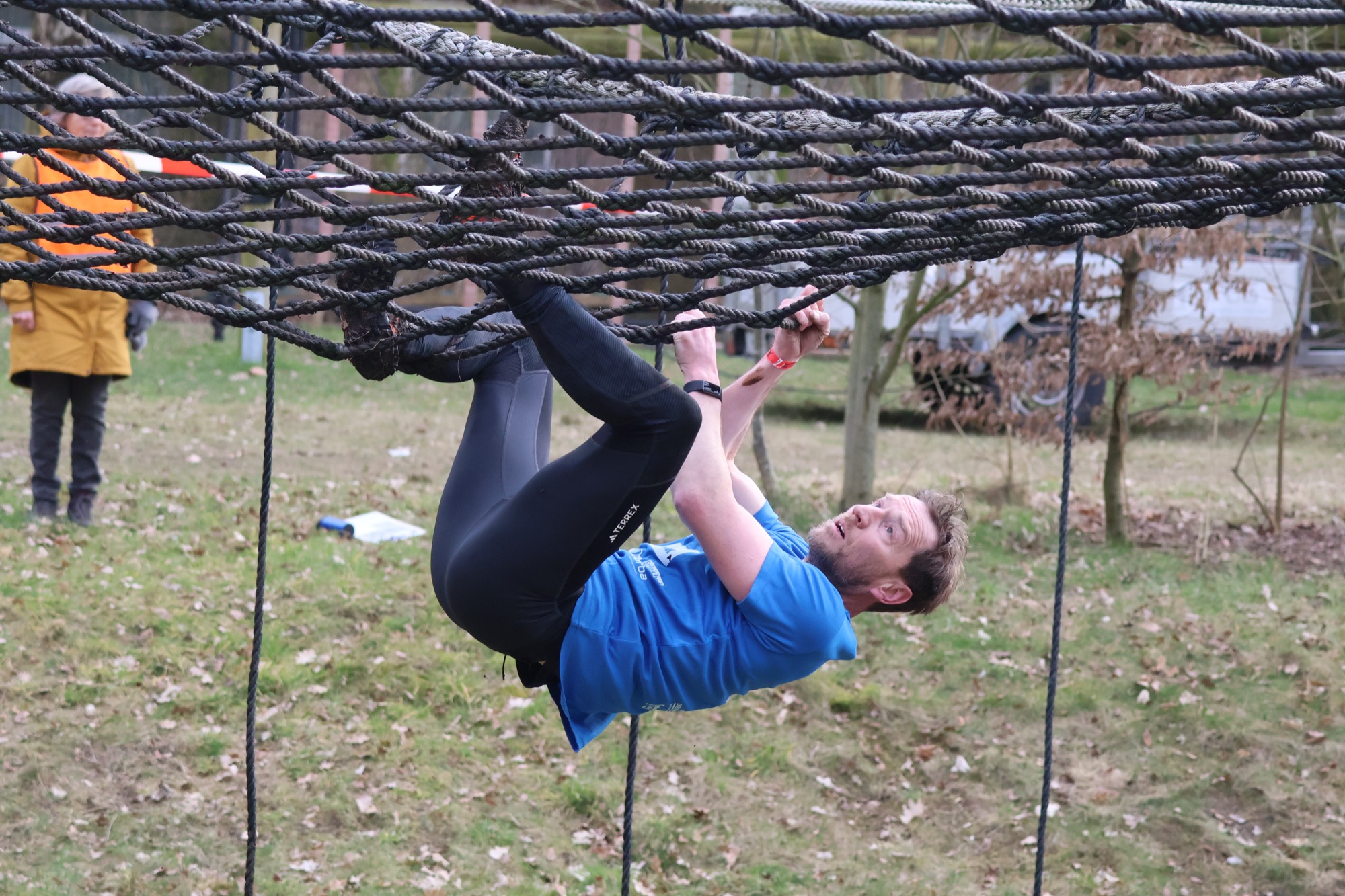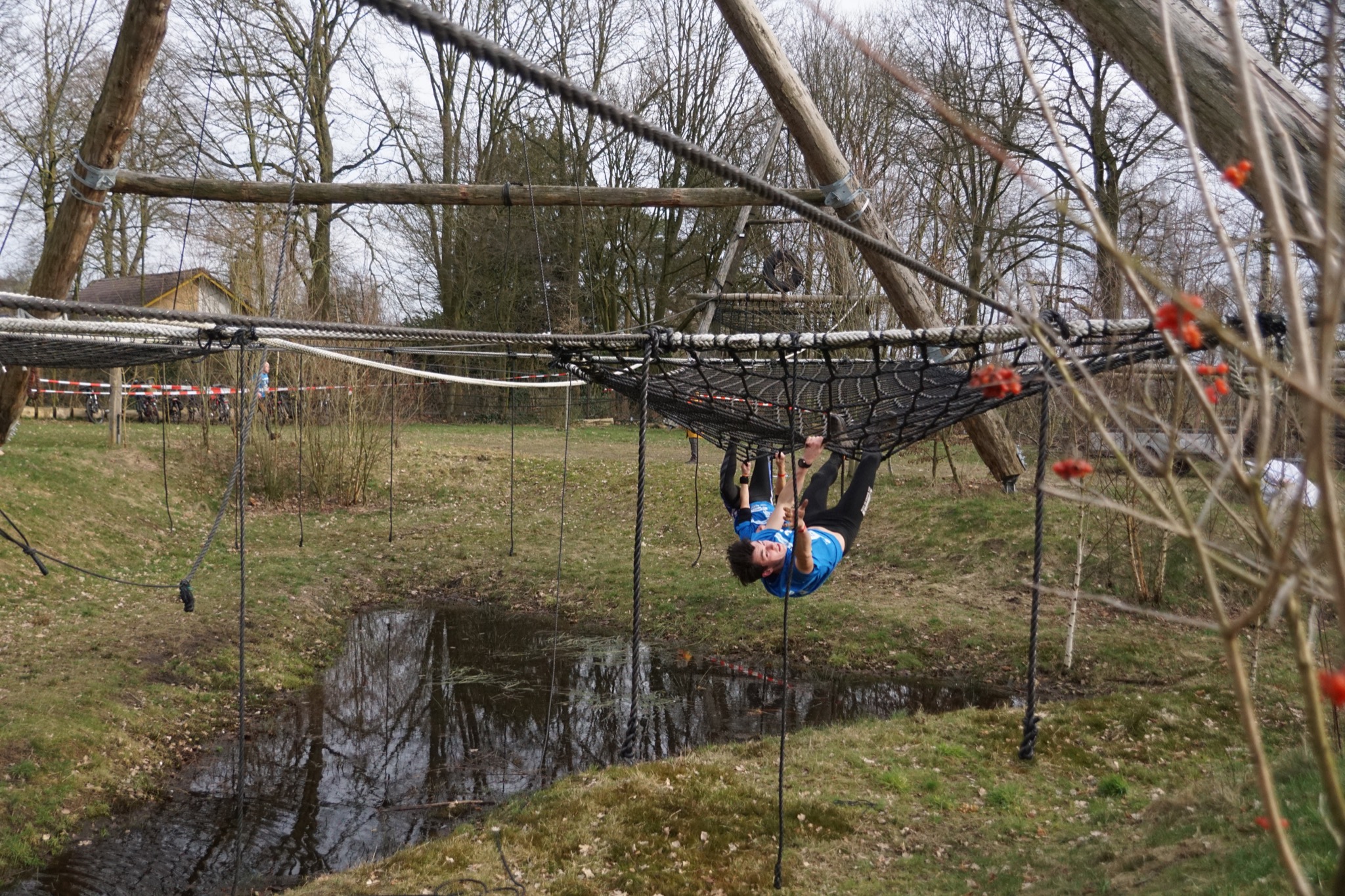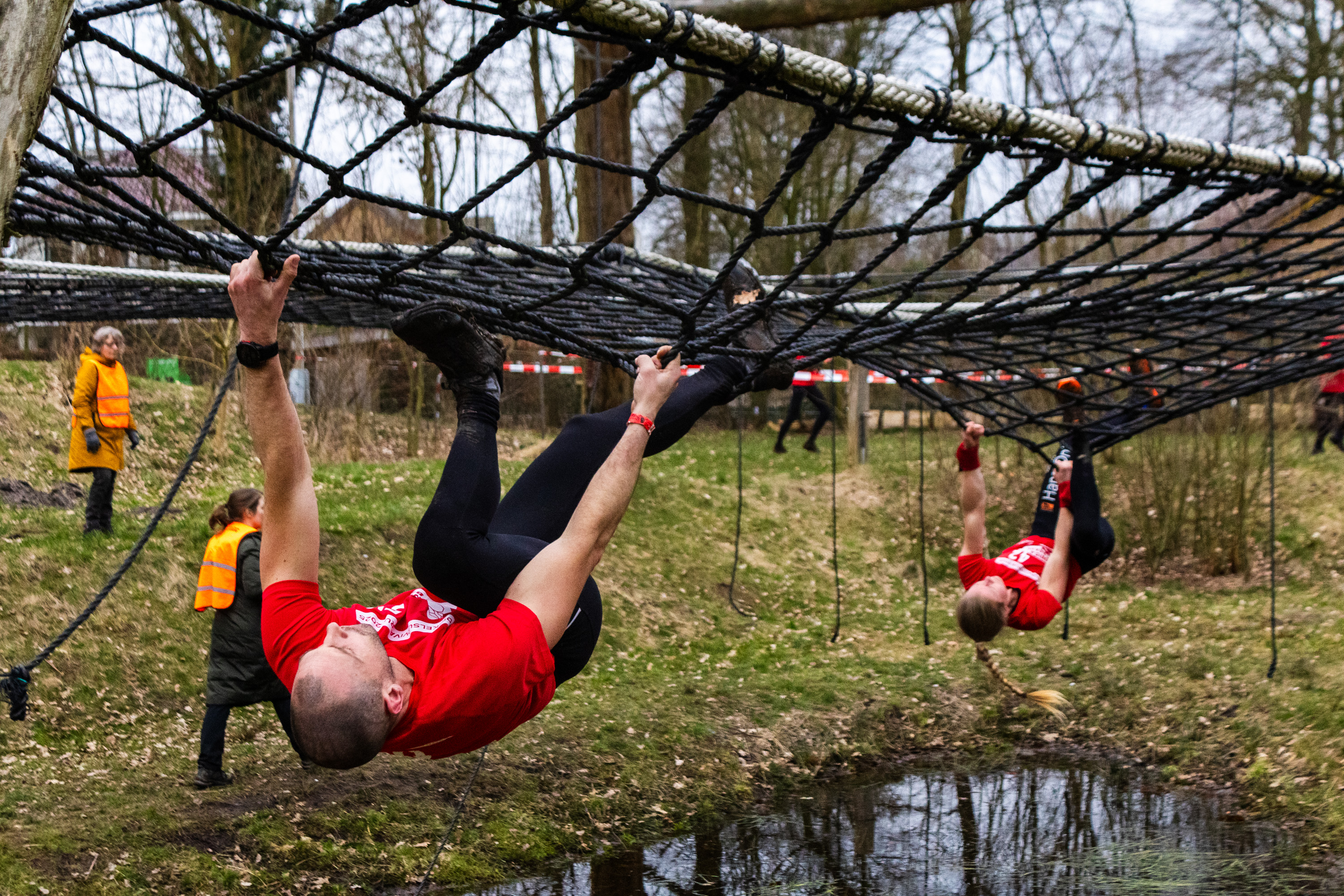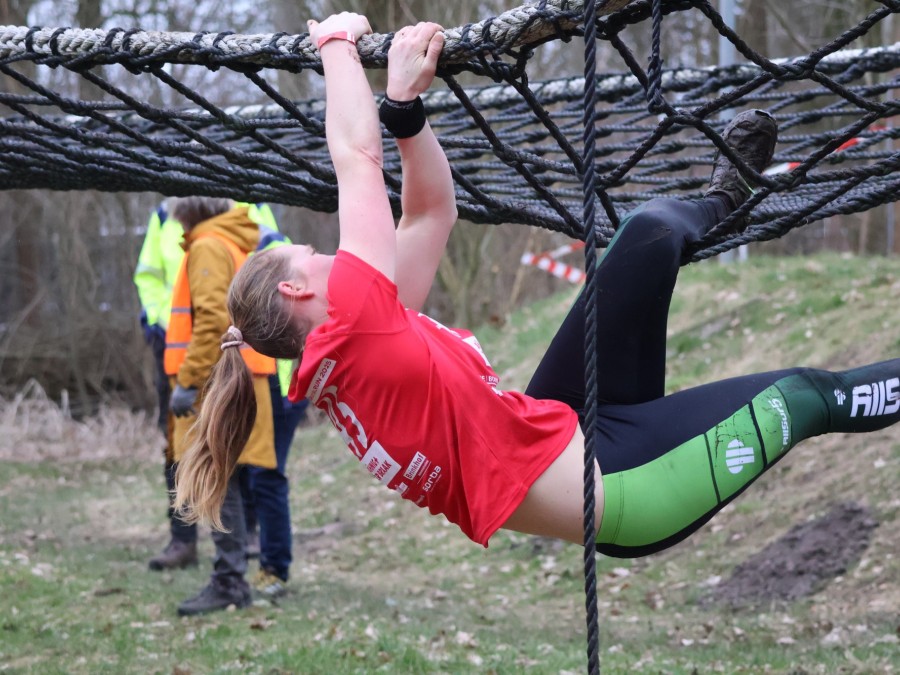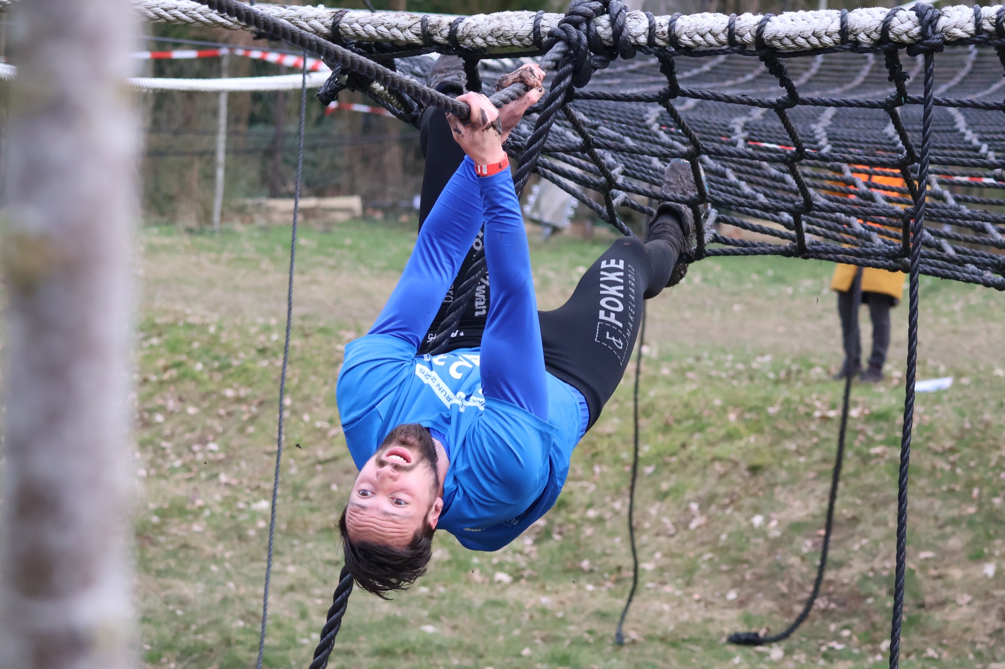 Deelnemers klimmen via het inklimtouw in het horizontale net. Het gehele net klimmen ze bovenlangs.