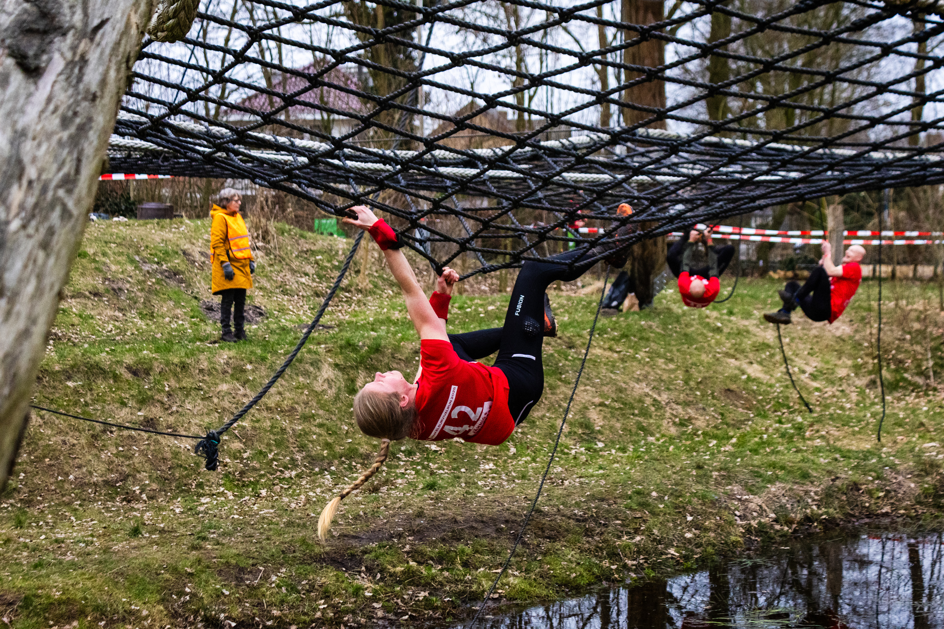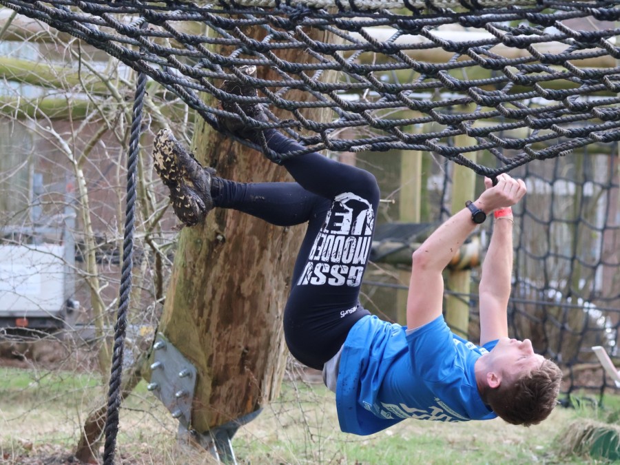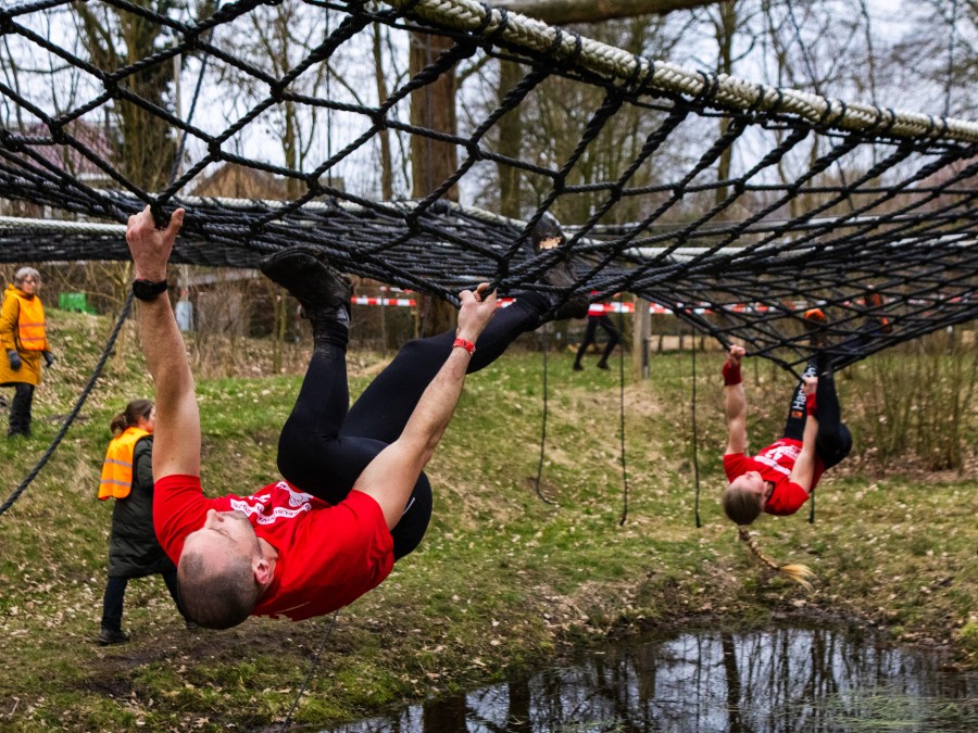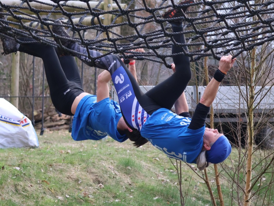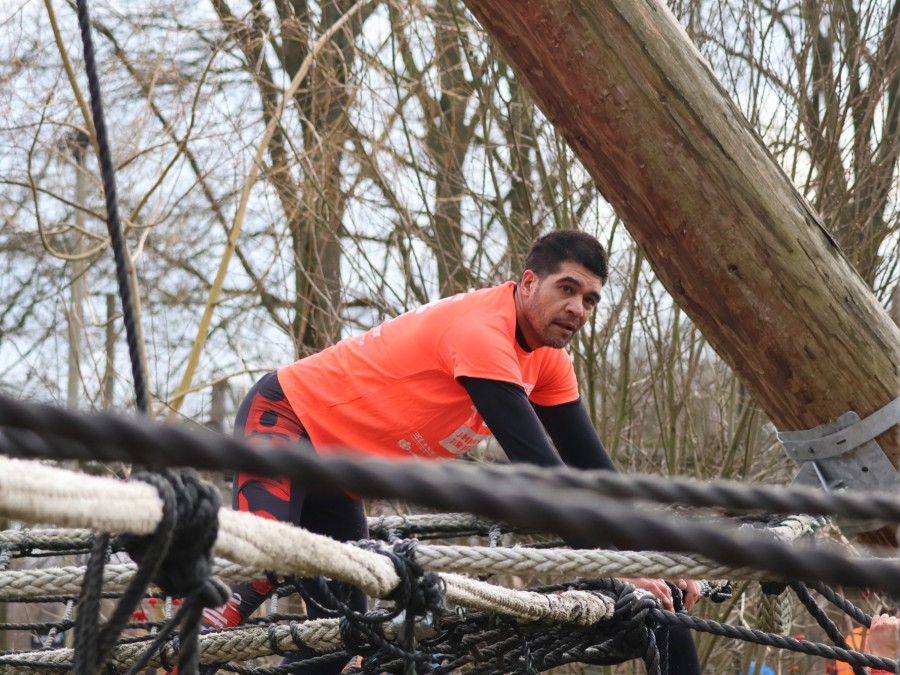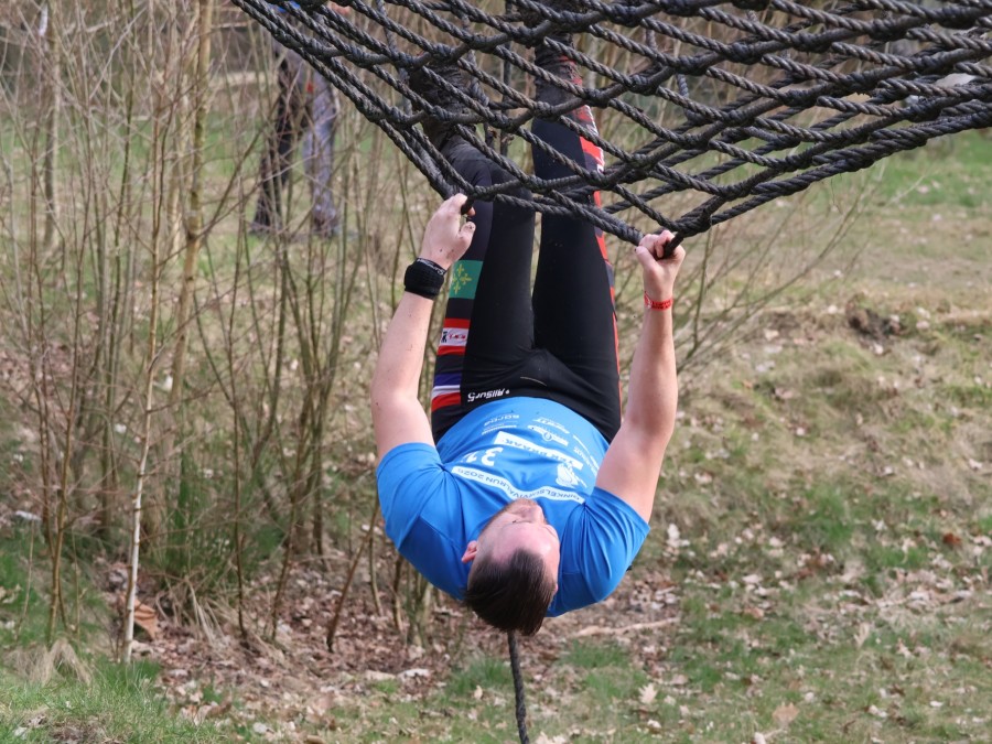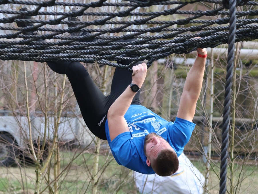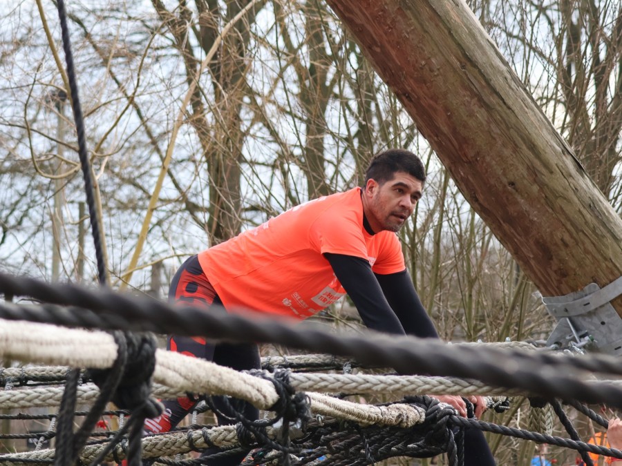 Deelnemers klimmen via het inklimtouw in het horizontale net. Het gehele net klimmen ze bovenlangs.