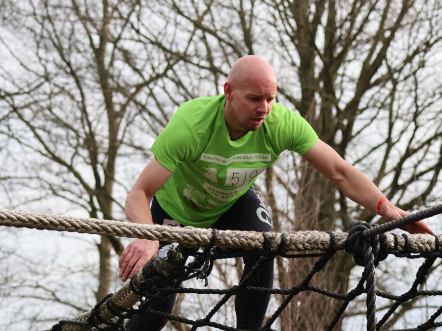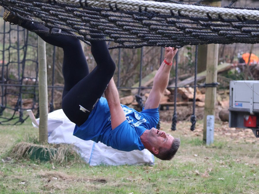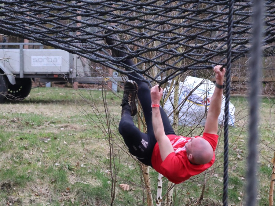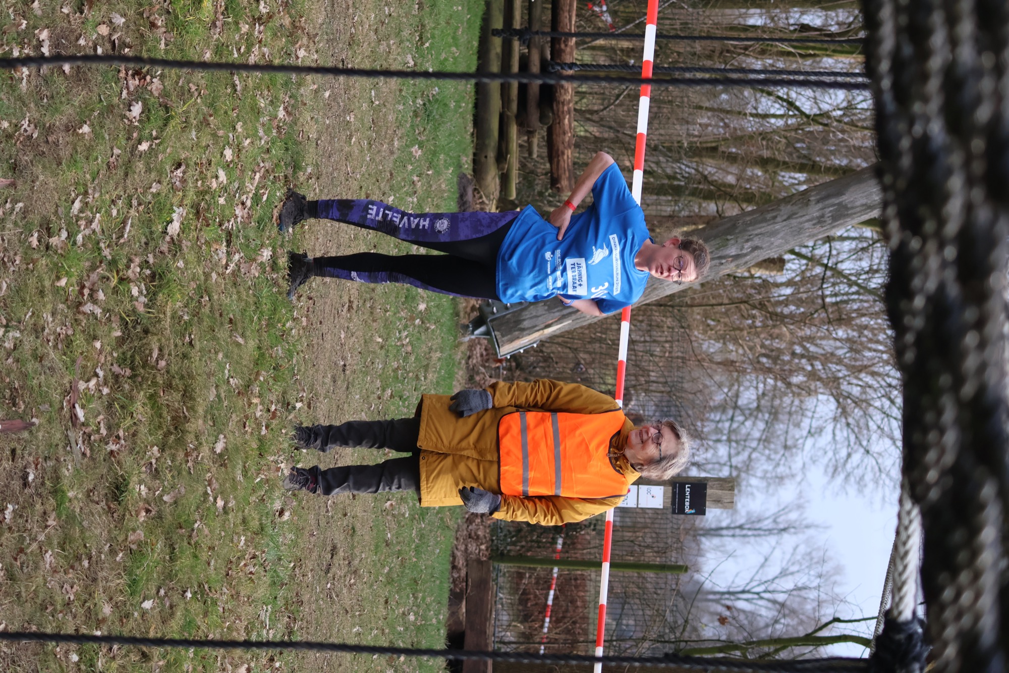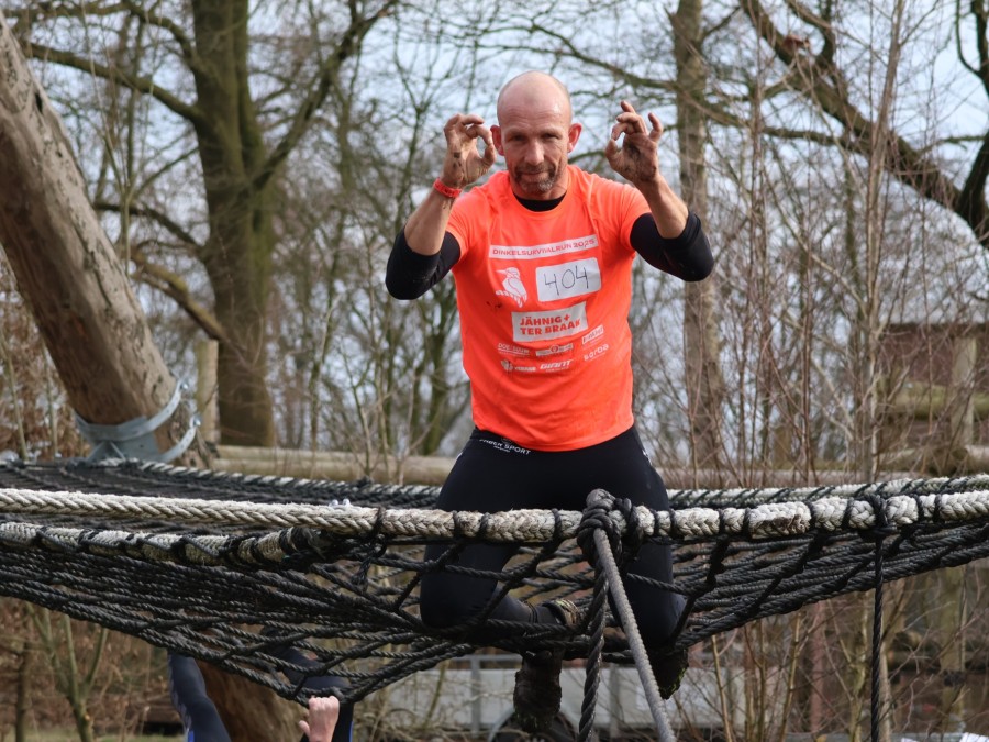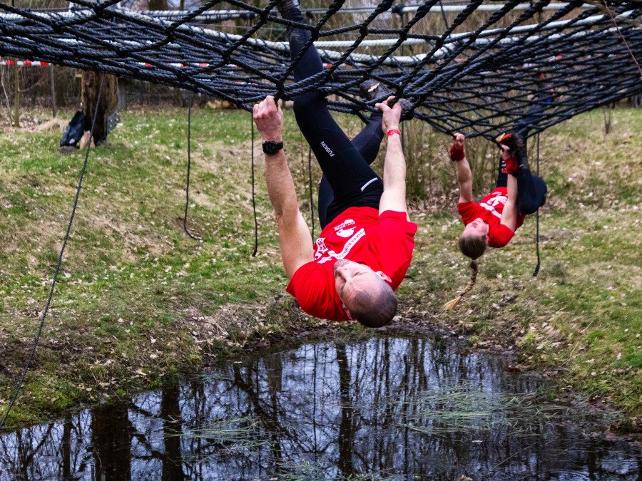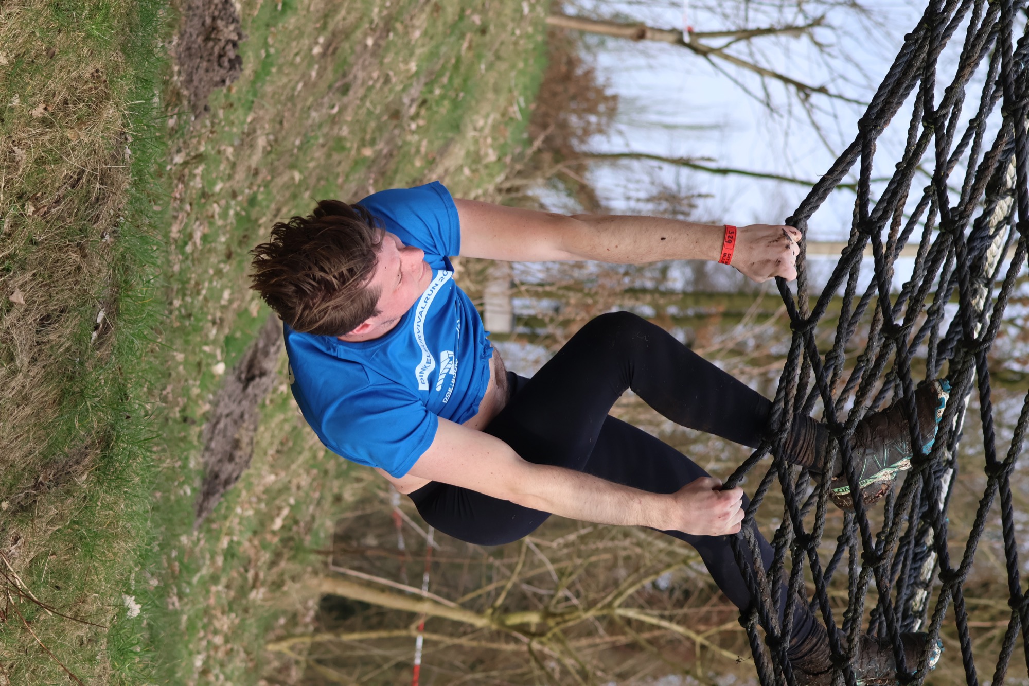 Deelnemers klimmen via het inklimtouw in het horizontale net. Het gehele net klimmen ze bovenlangs.