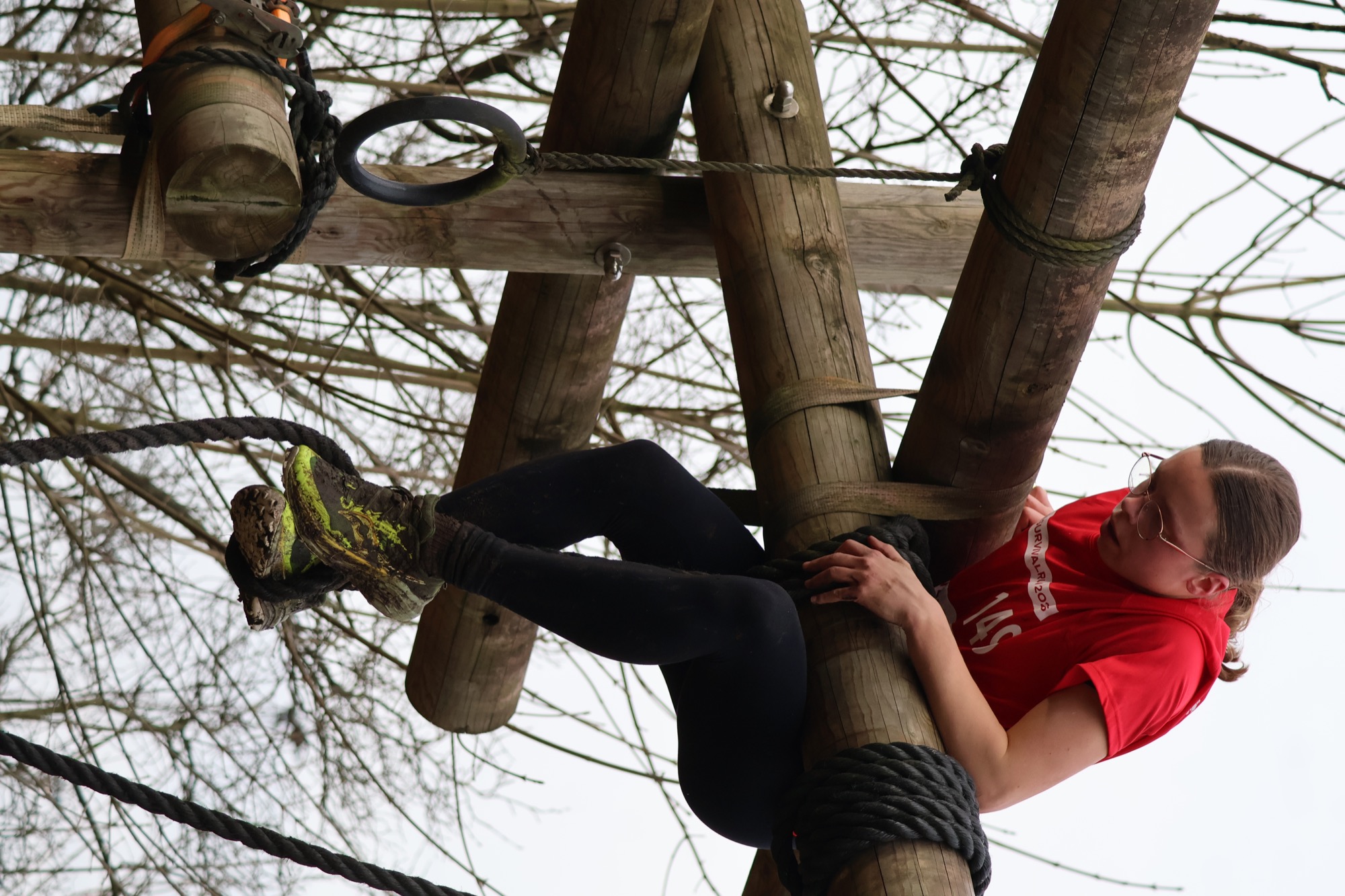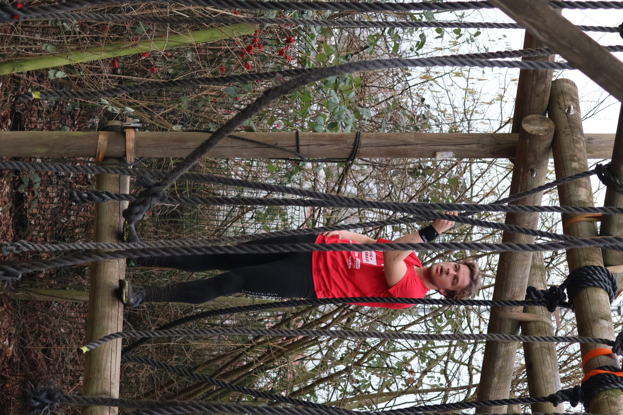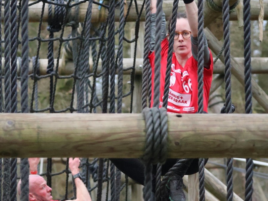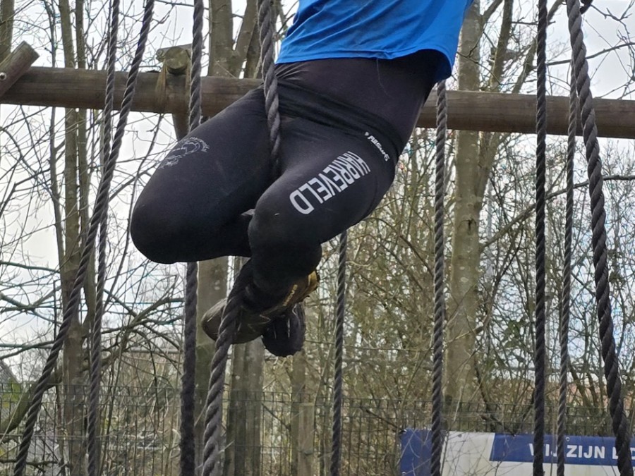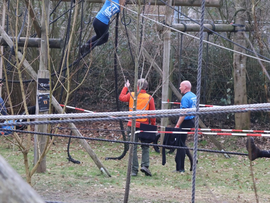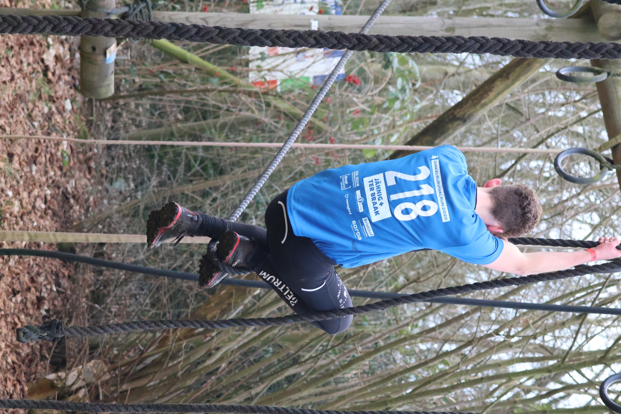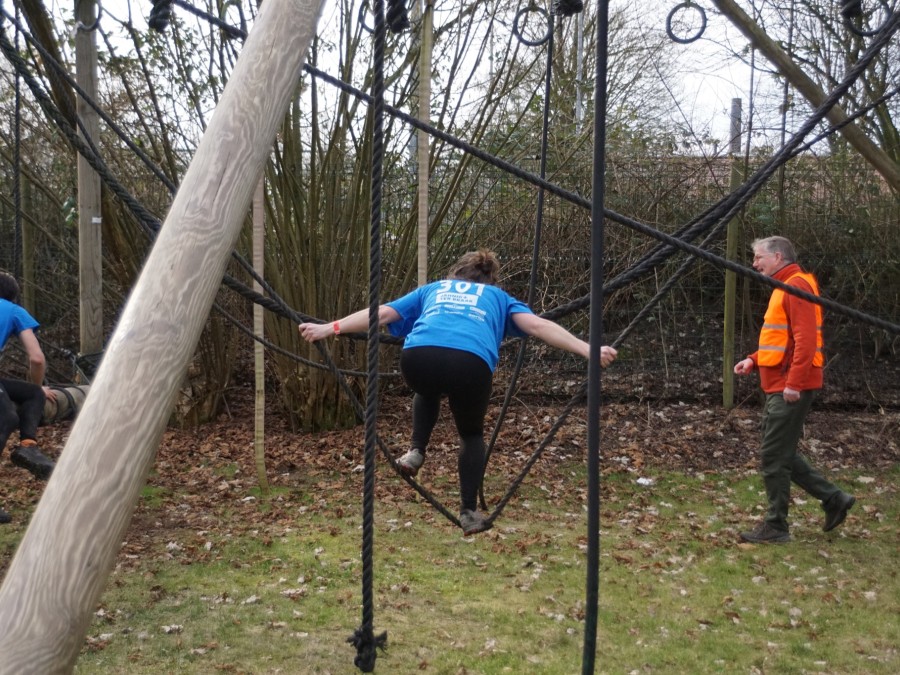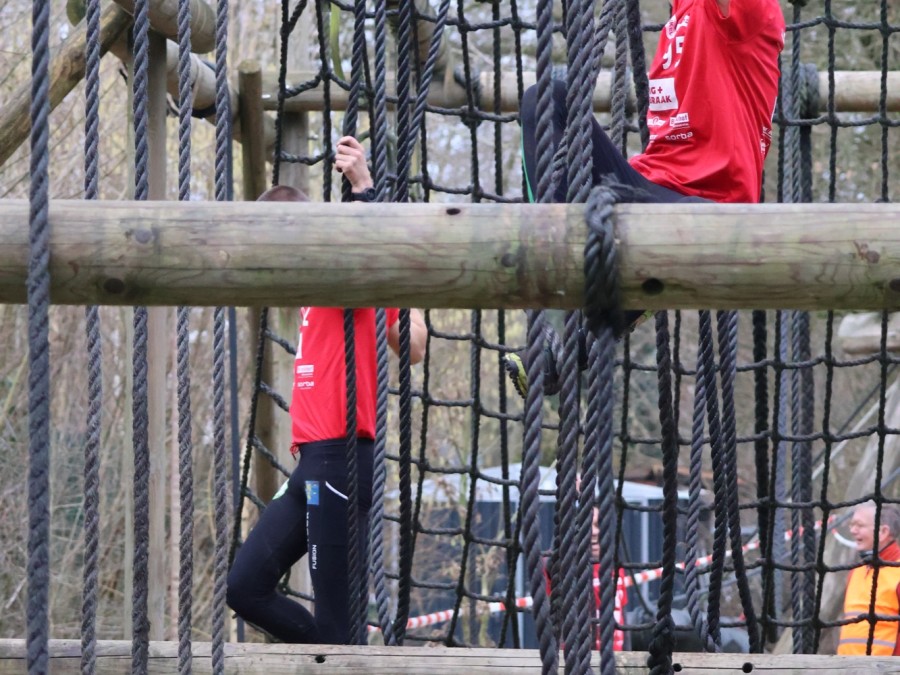 Deelnemers klimmen via het inklimtouw over de balk. Via het slappe touw klimmen ze naar het schuine net. Vervolgens klimmen ze over het schuine net door.