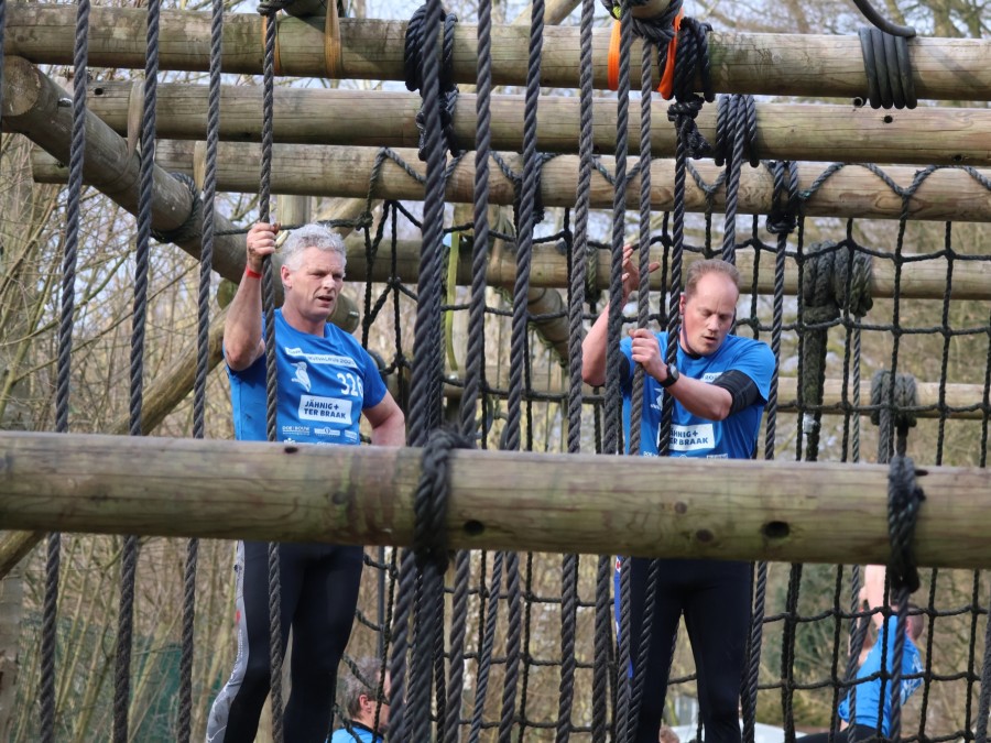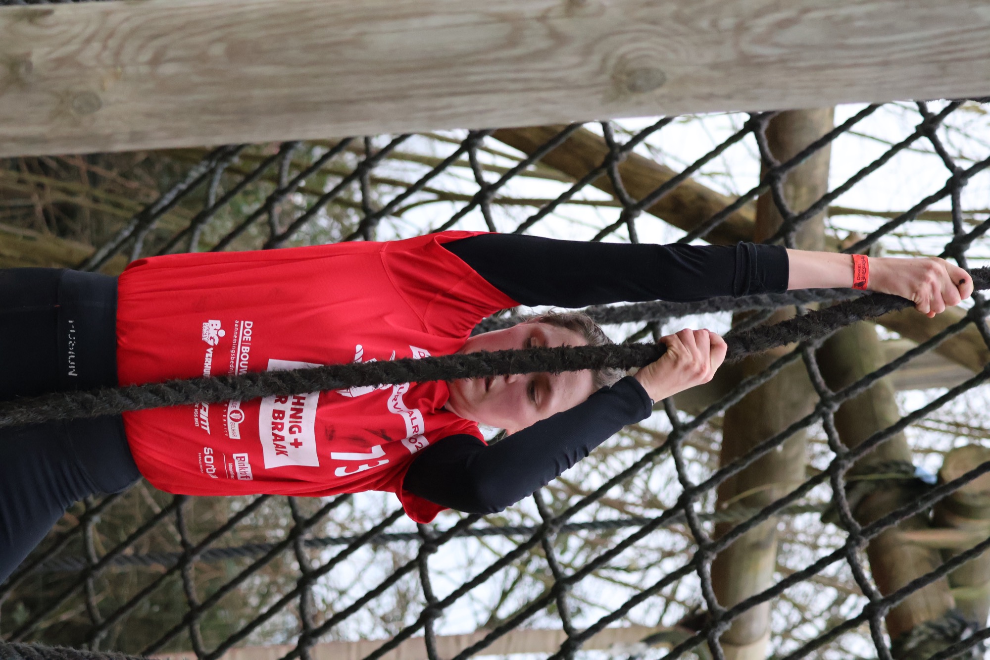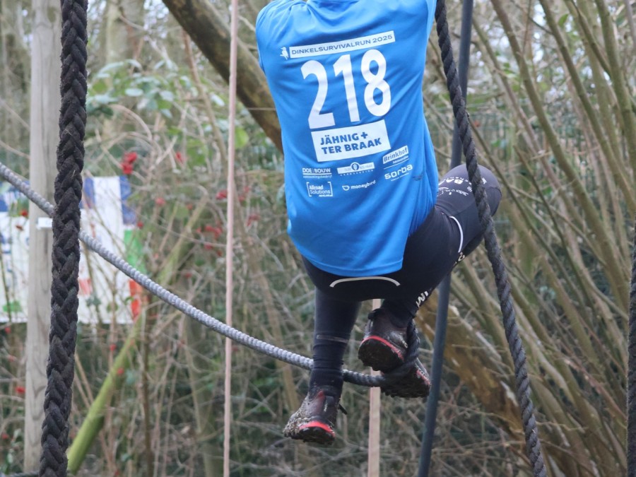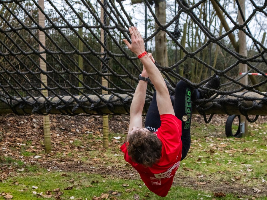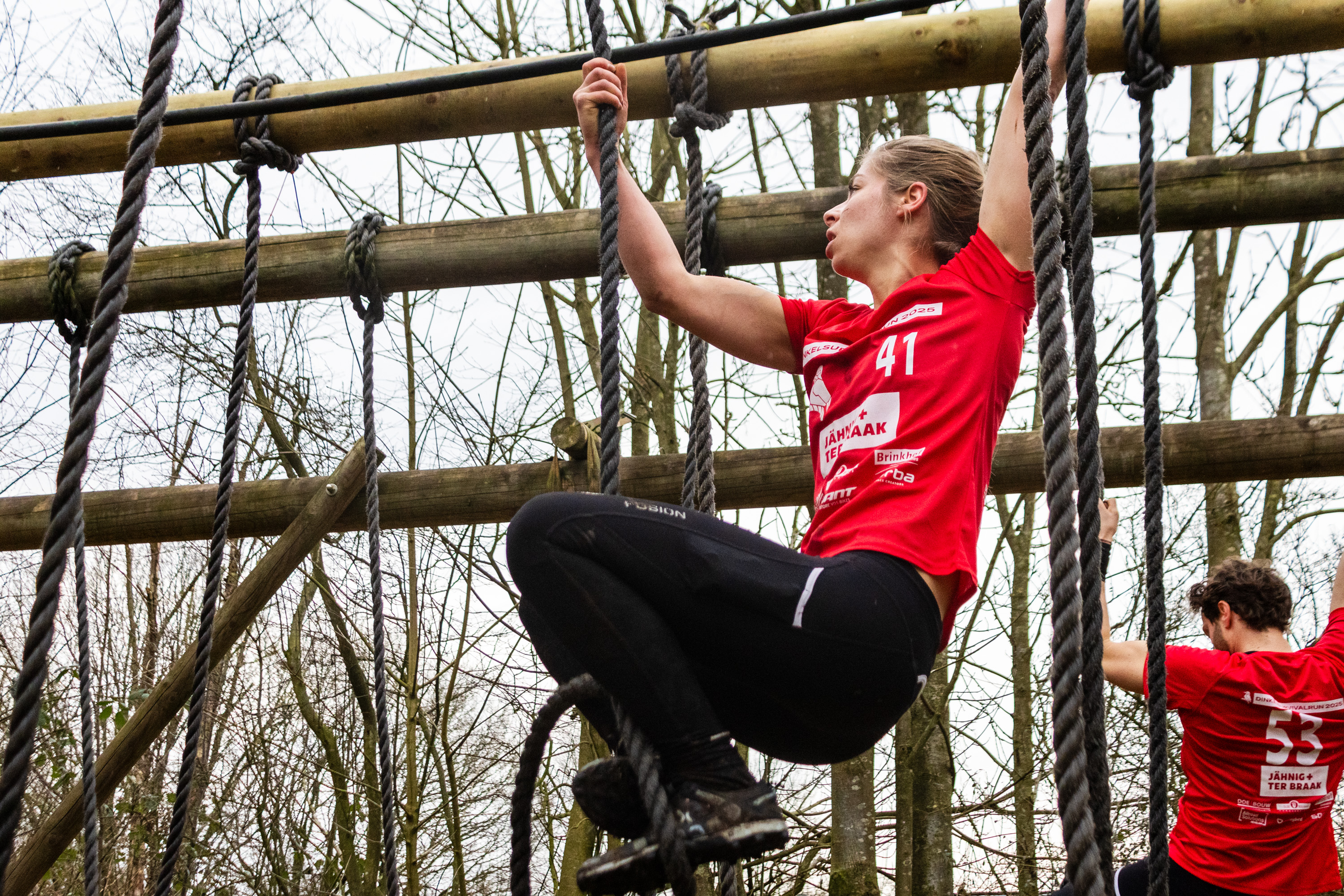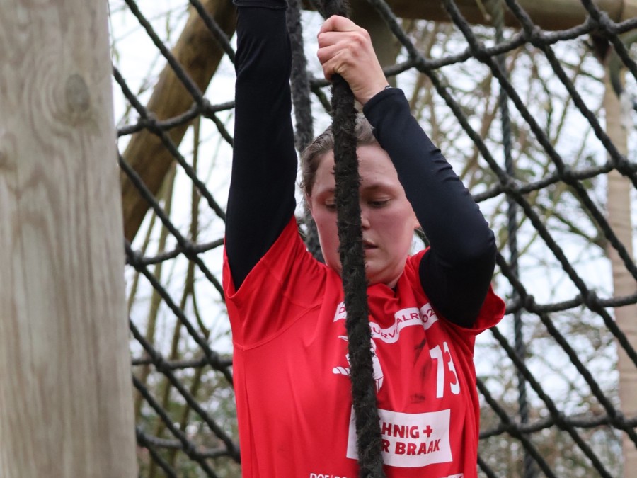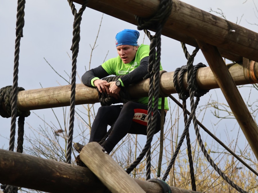 Deelnemers klimmen via het inklimtouw over de balk. Via het slappe touw klimmen ze naar het schuine net. Vervolgens klimmen ze over het schuine net door.
