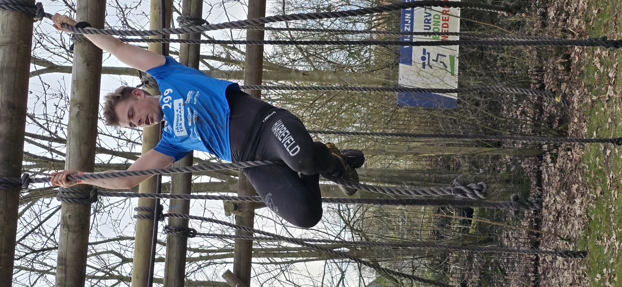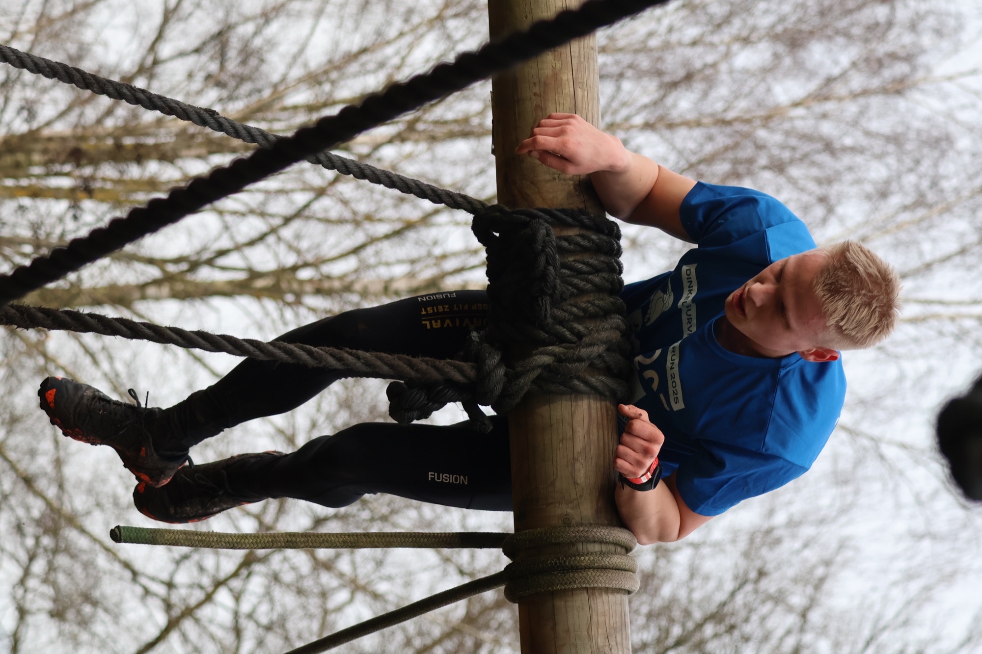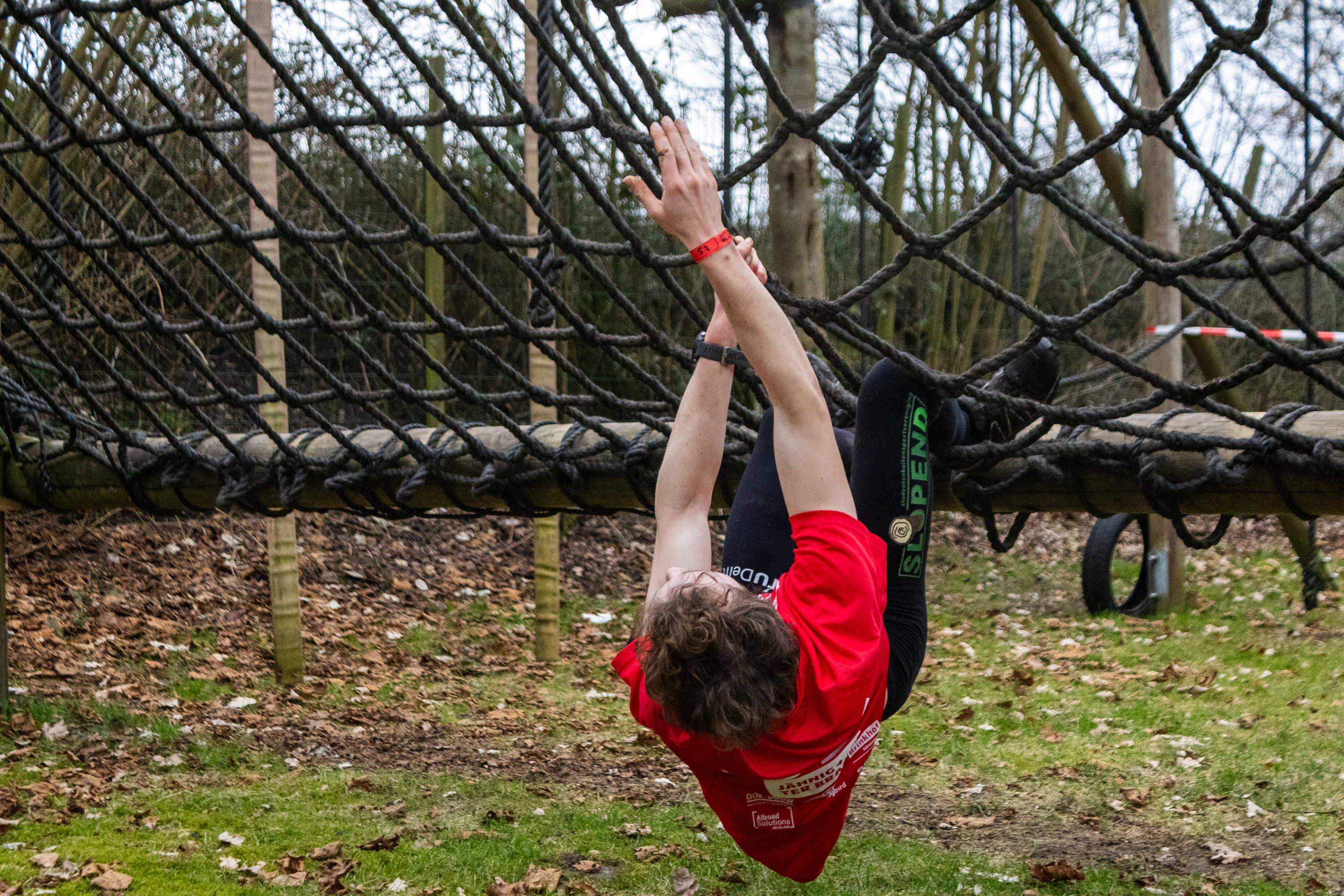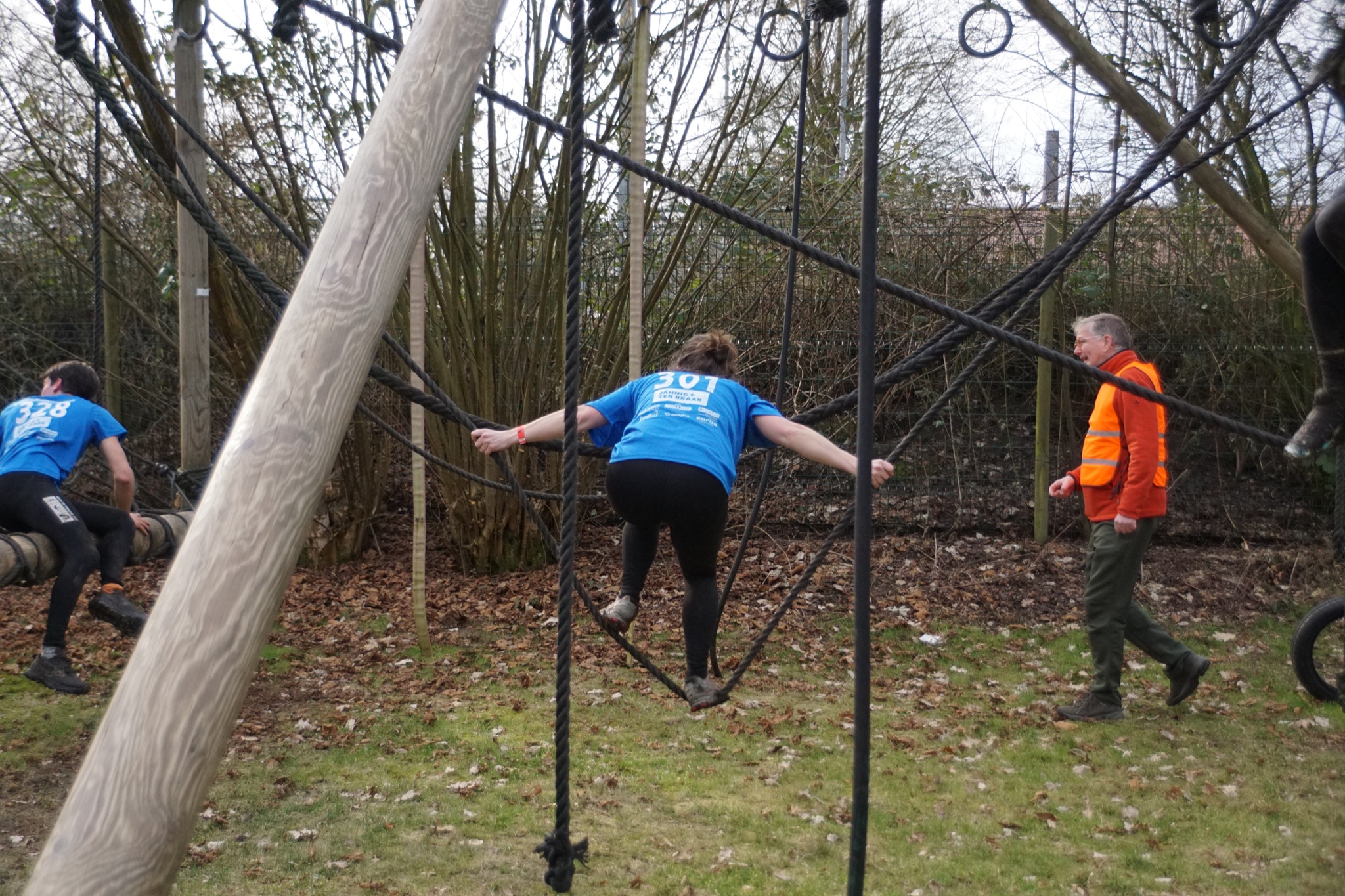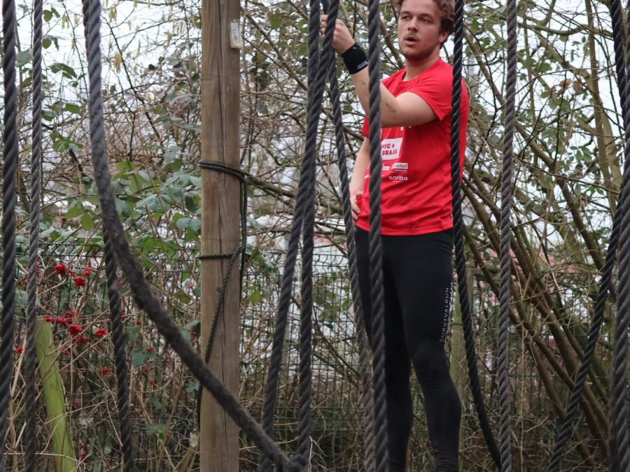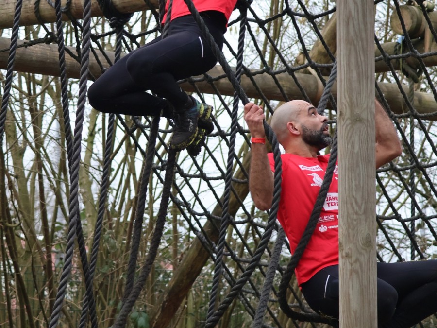 Deelnemers klimmen via het inklimtouw over de balk. Via het slappe touw klimmen ze naar het schuine net. Vervolgens klimmen ze over het schuine net door.