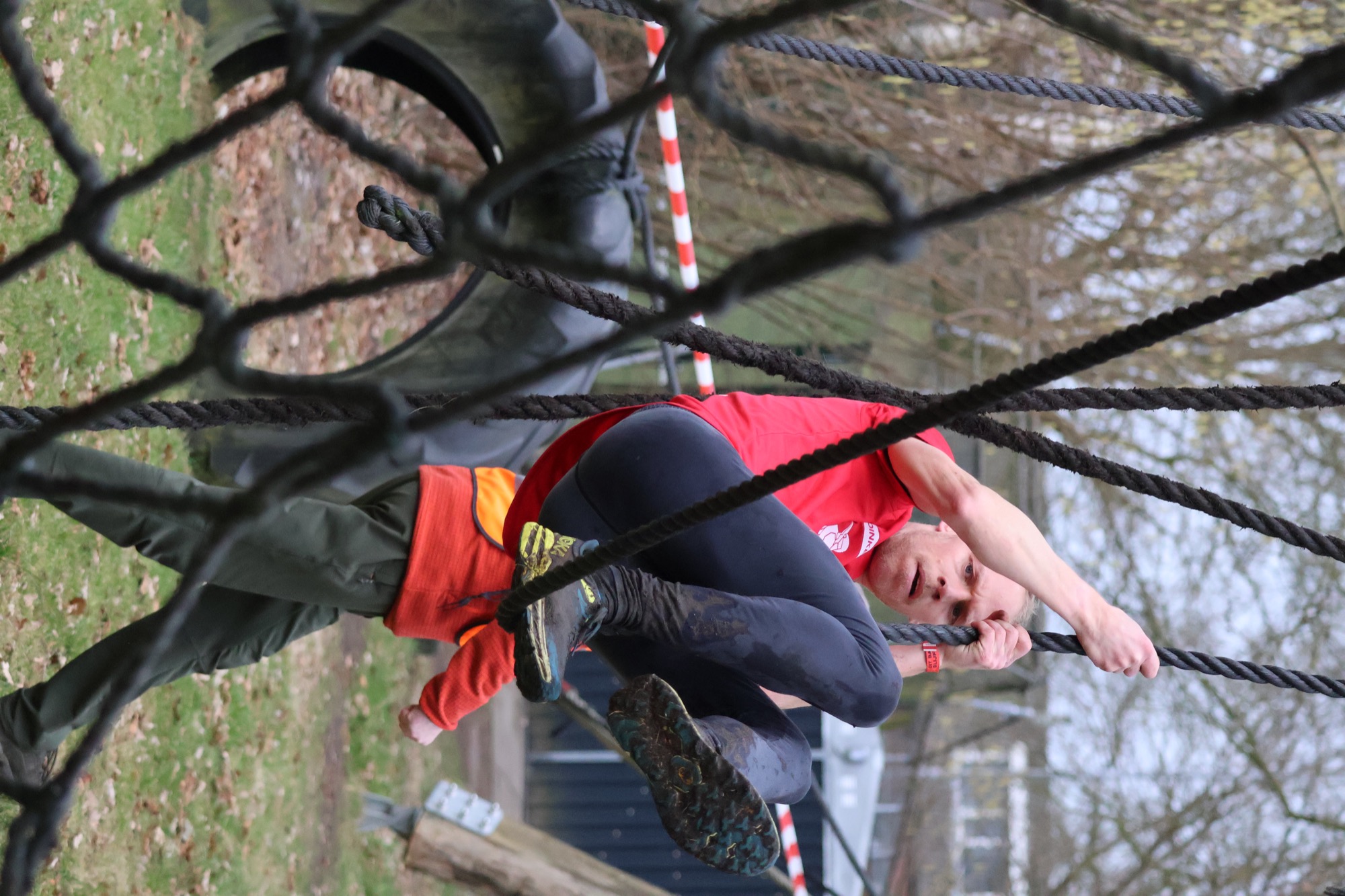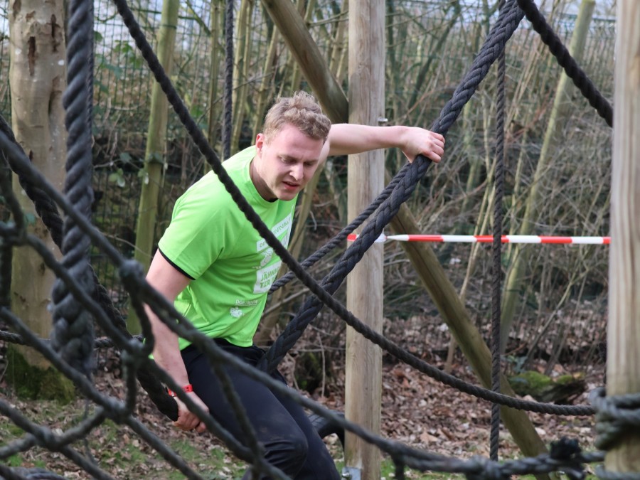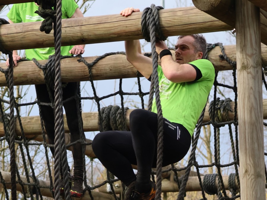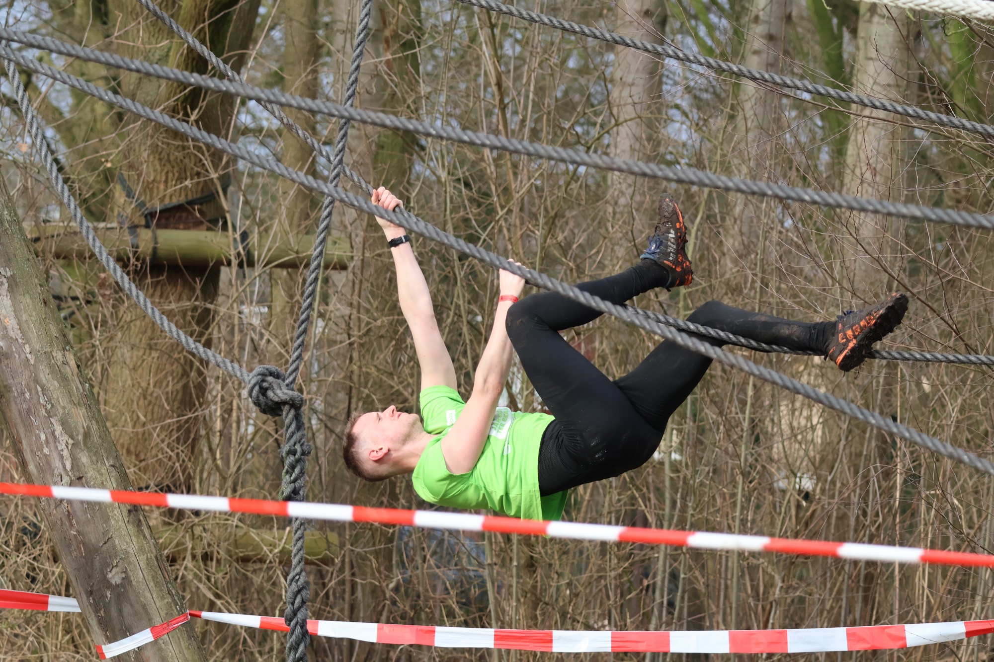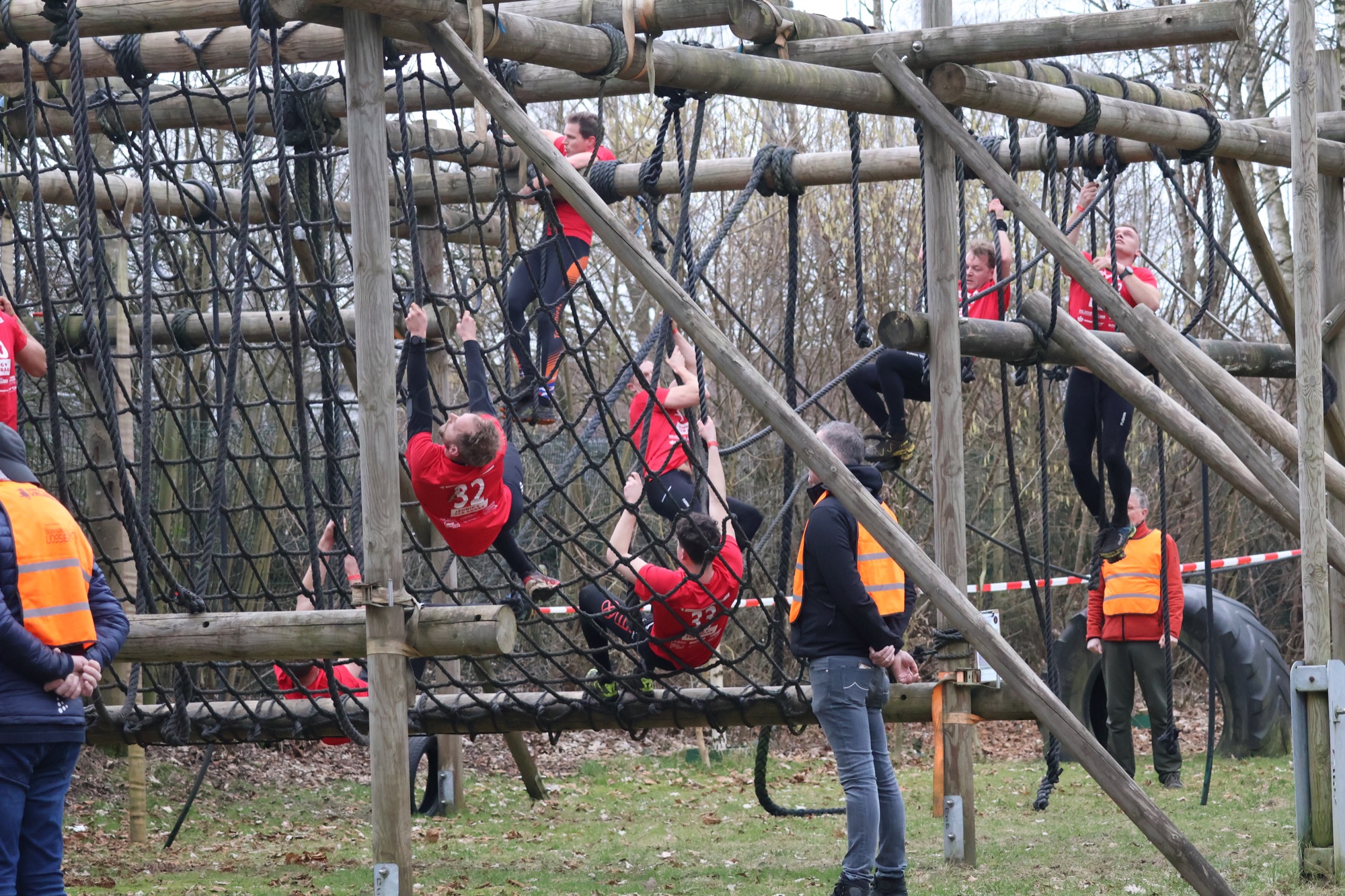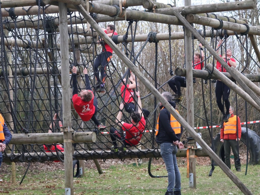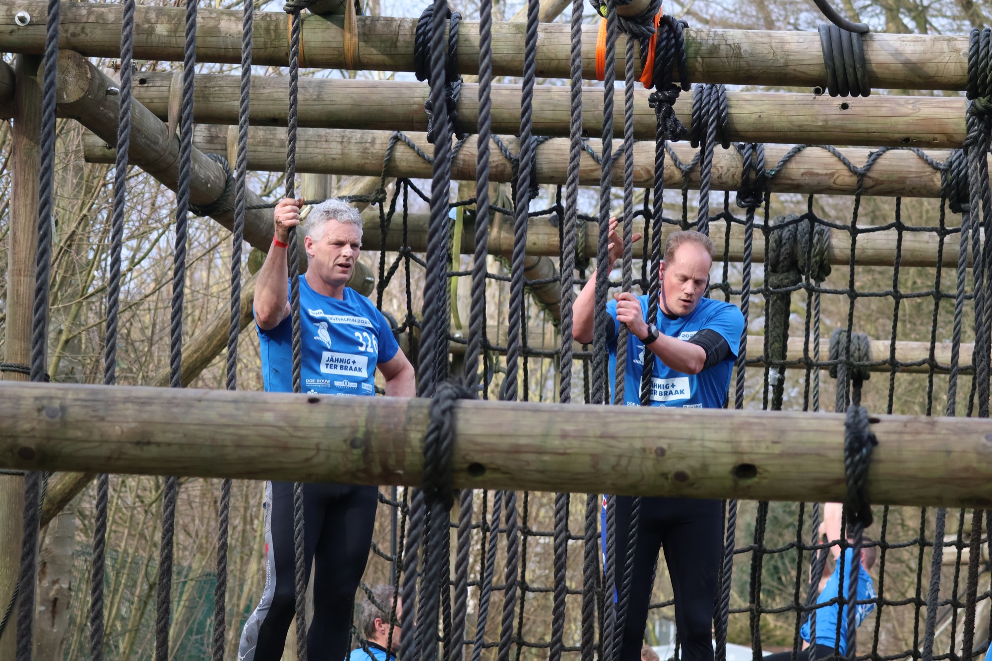Deelnemers klimmen via het inklimtouw over de balk. Via het slappe touw klimmen ze naar het schuine net. Vervolgens klimmen ze over het schuine net door.