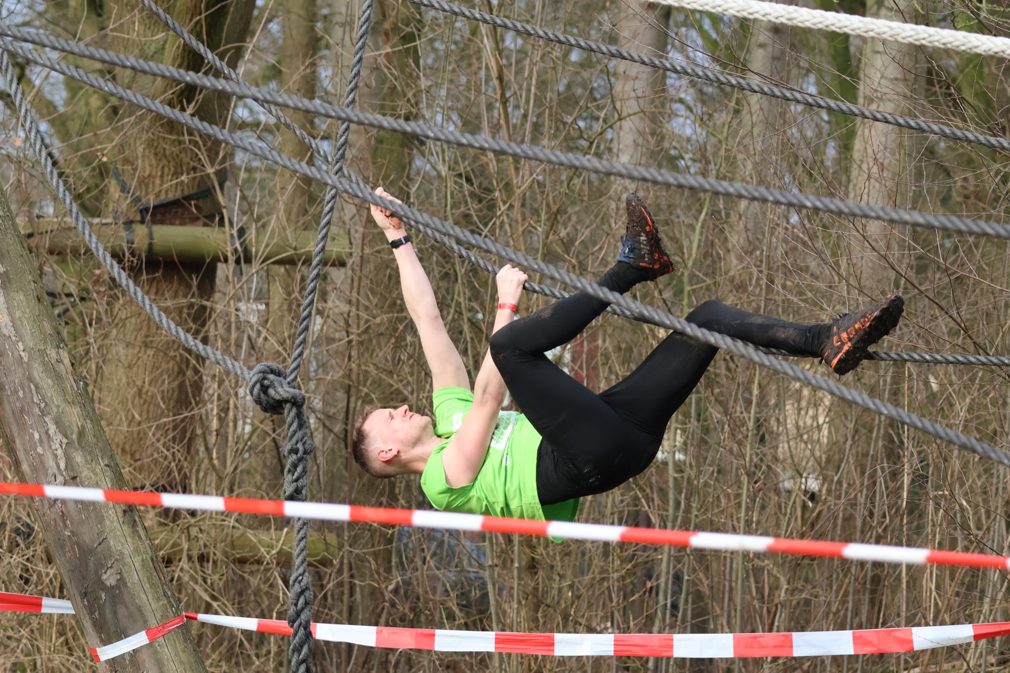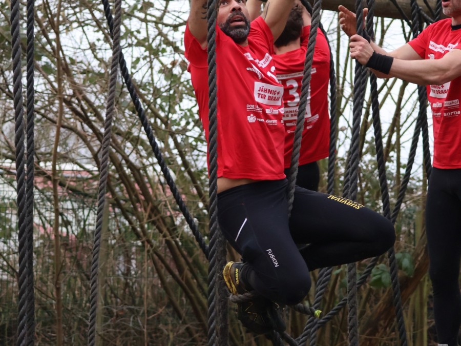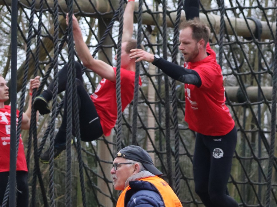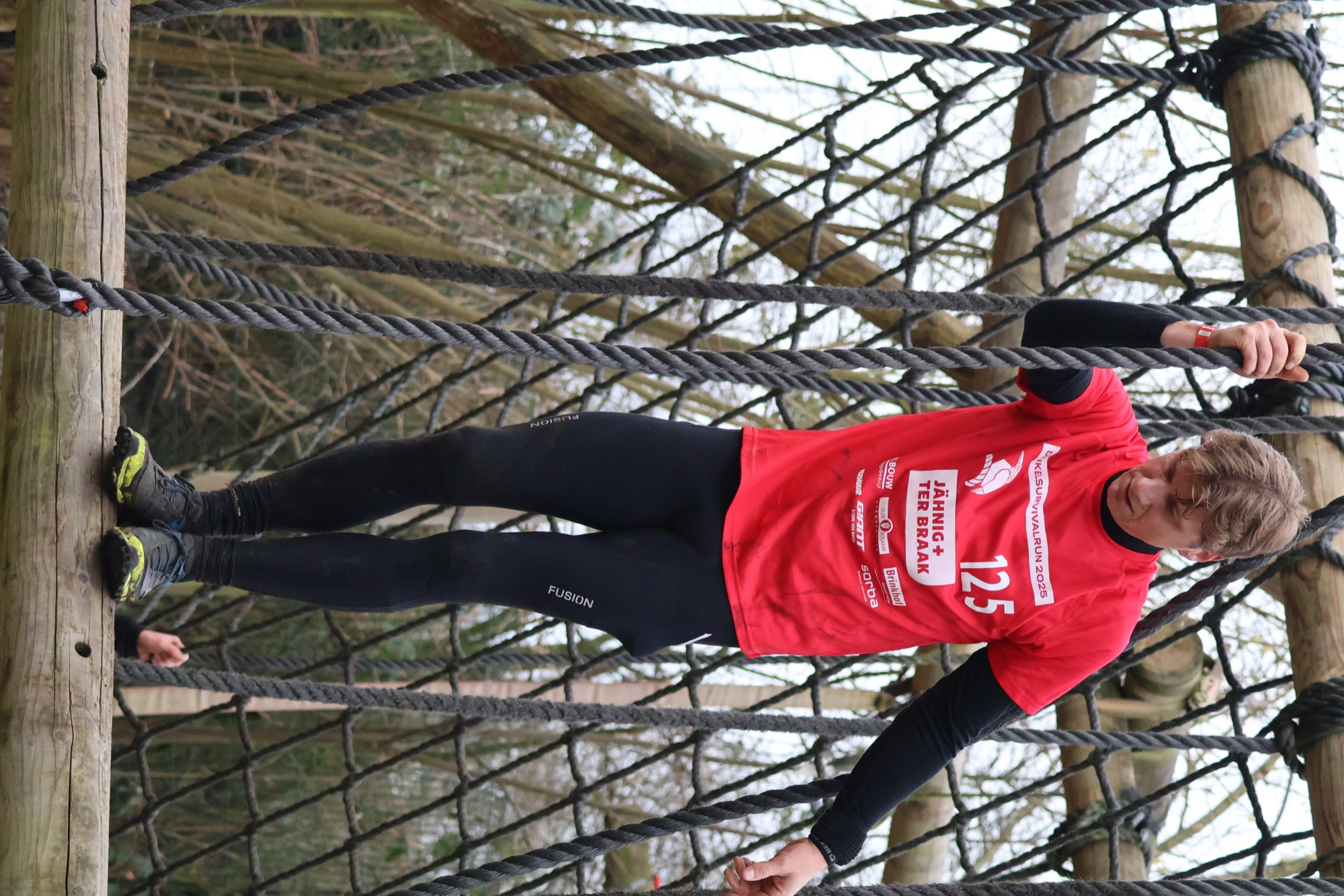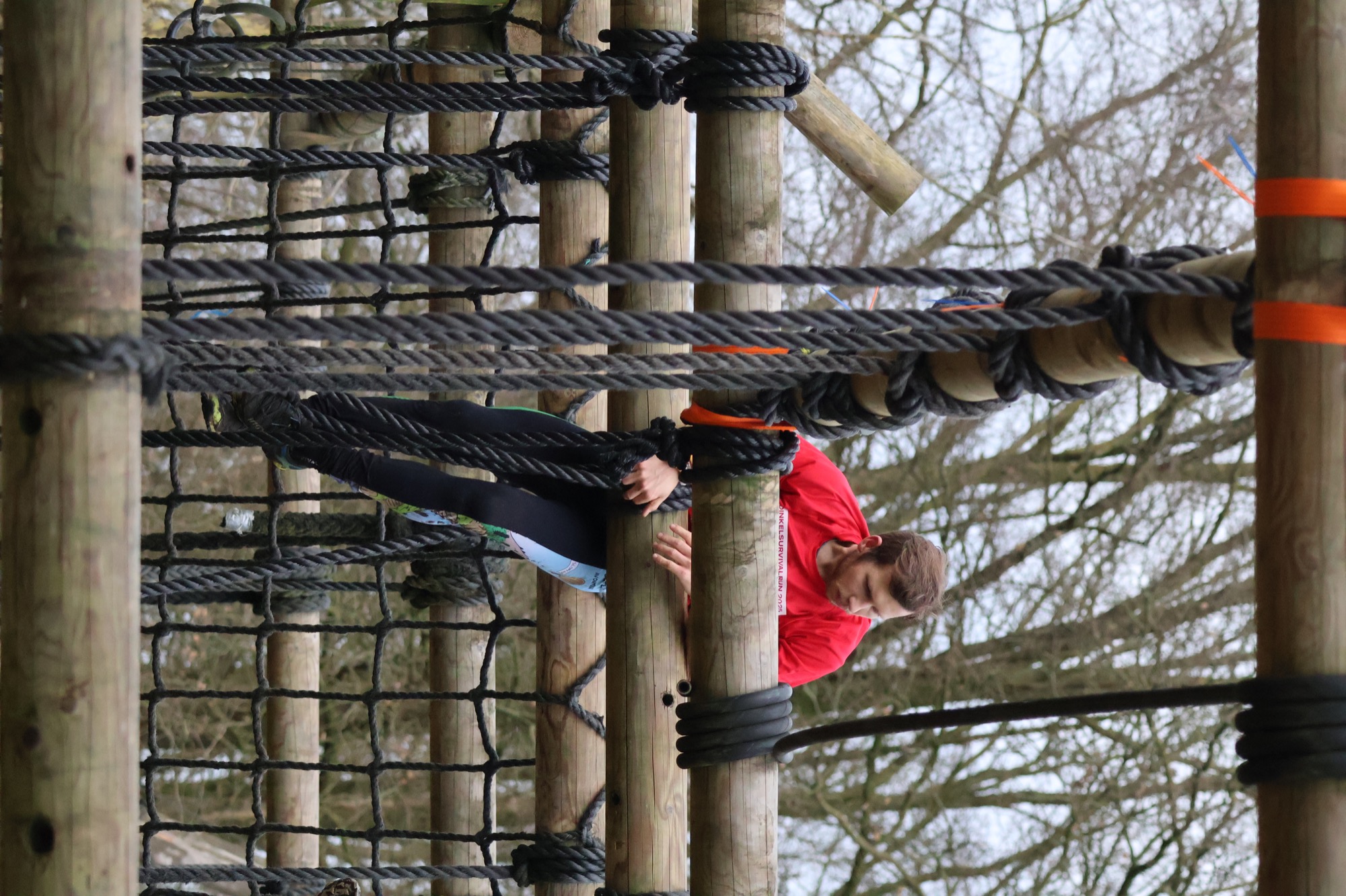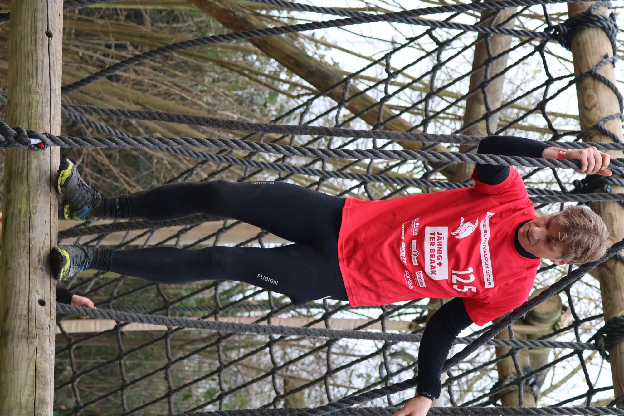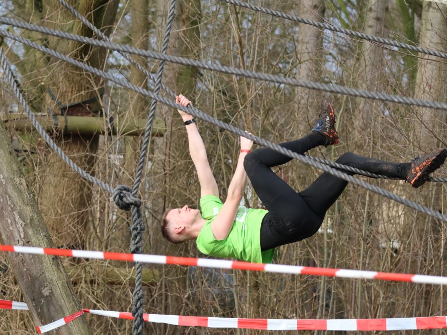 Deelnemers klimmen via het inklimtouw over de balk. Via het slappe touw klimmen ze naar het schuine net. Vervolgens klimmen ze over het schuine net door.