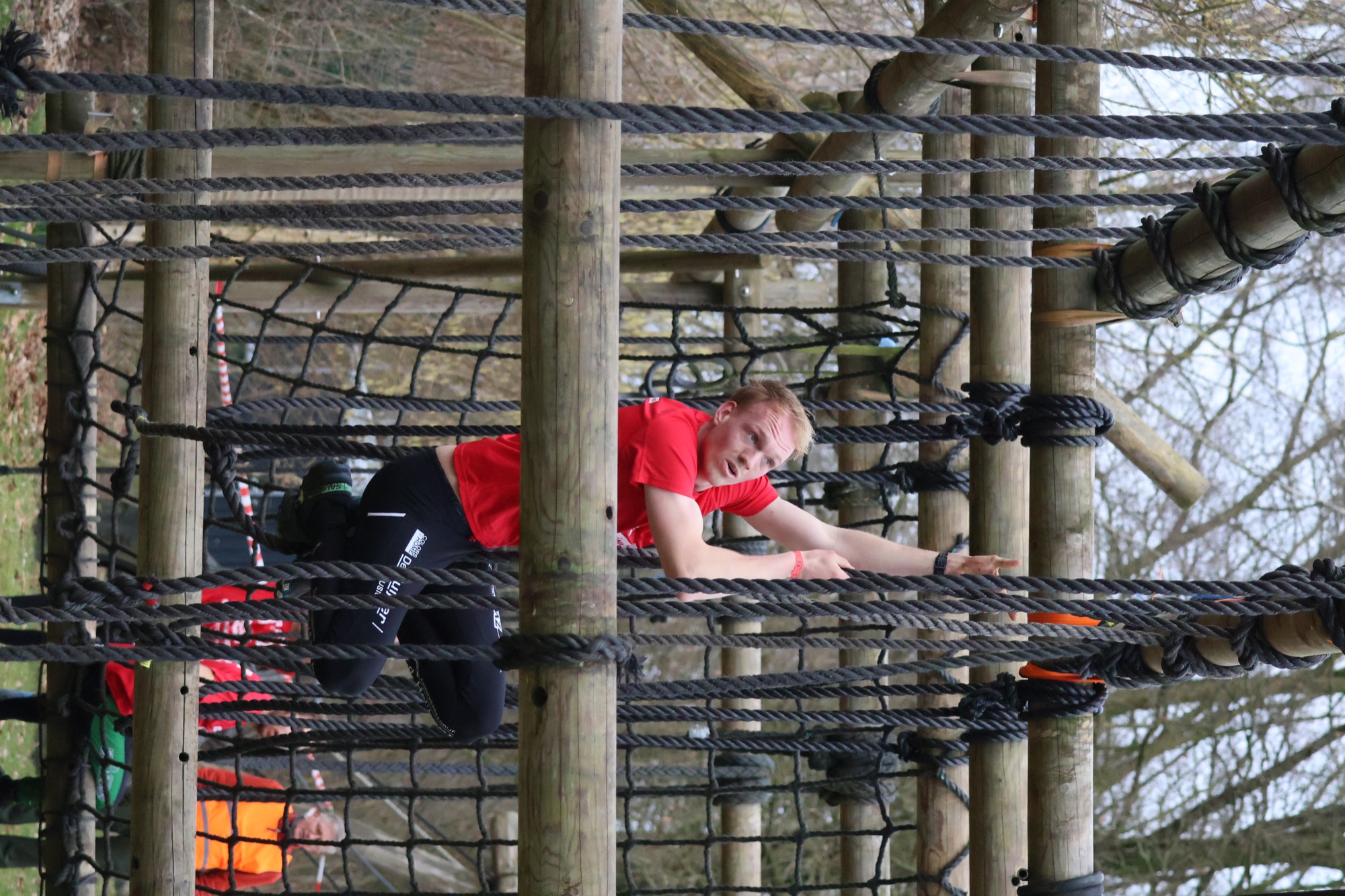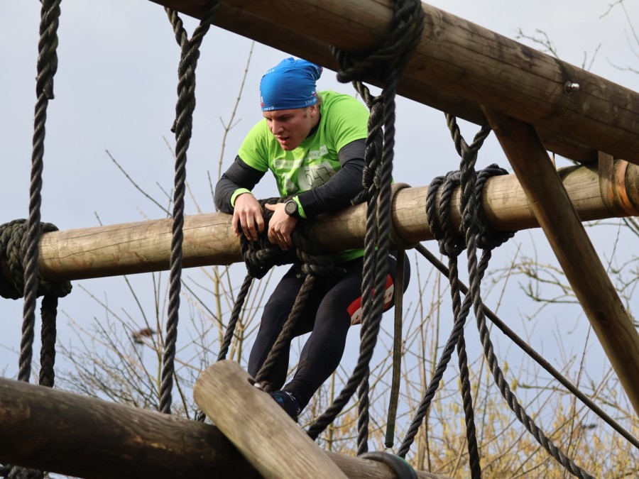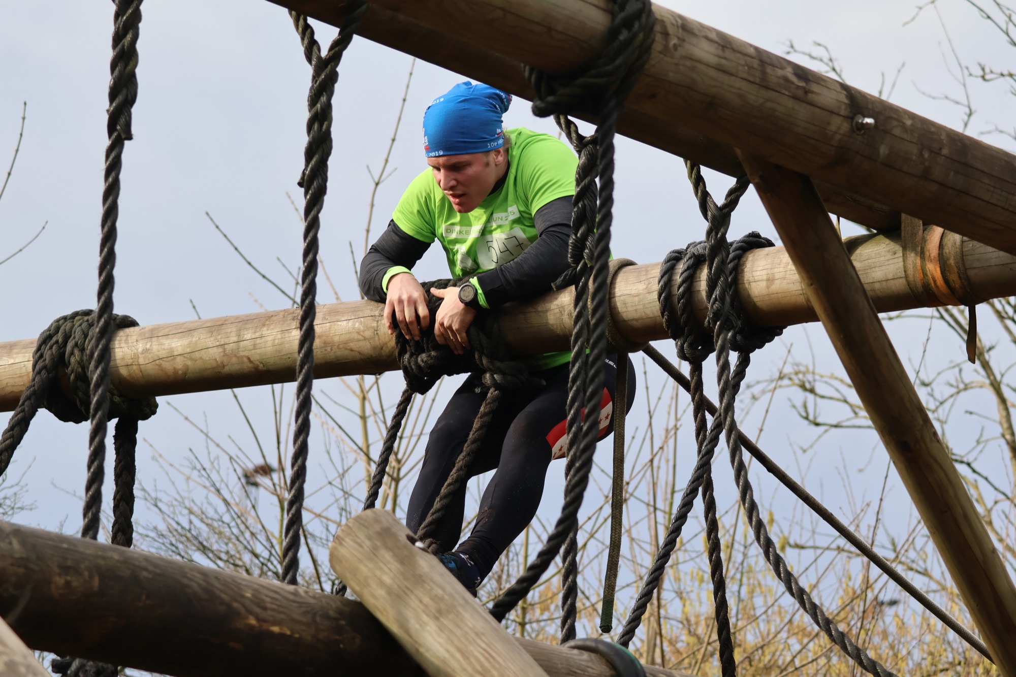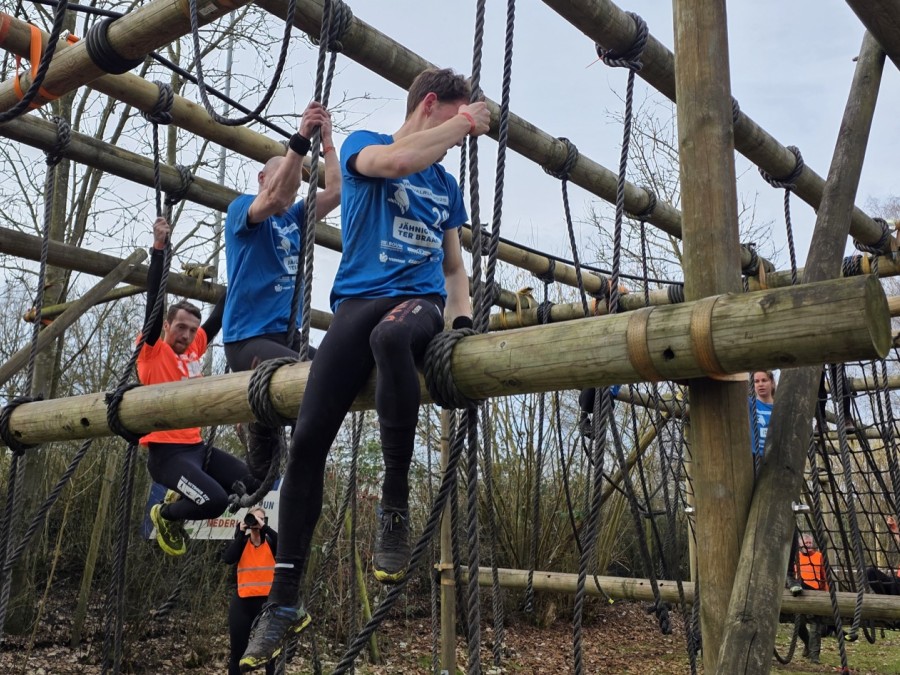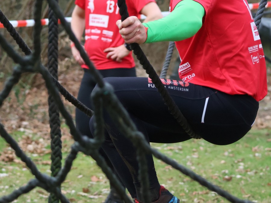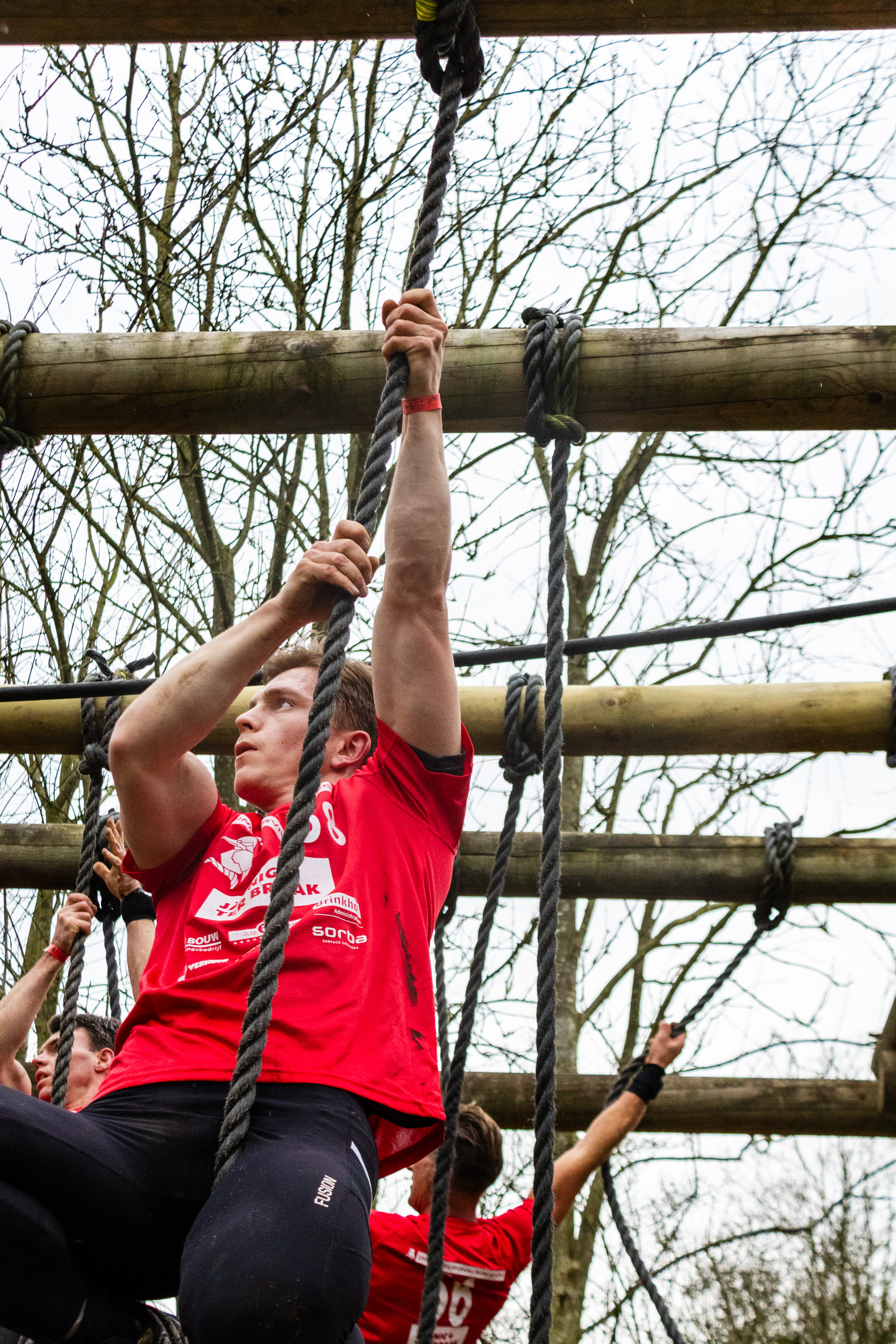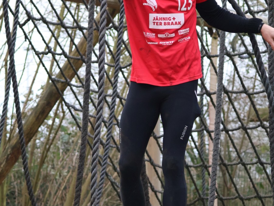 Deelnemers klimmen via het inklimtouw over de balk. Via het slappe touw klimmen ze naar het schuine net. Vervolgens klimmen ze over het schuine net door.