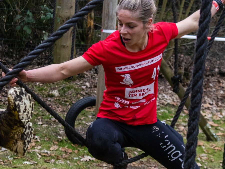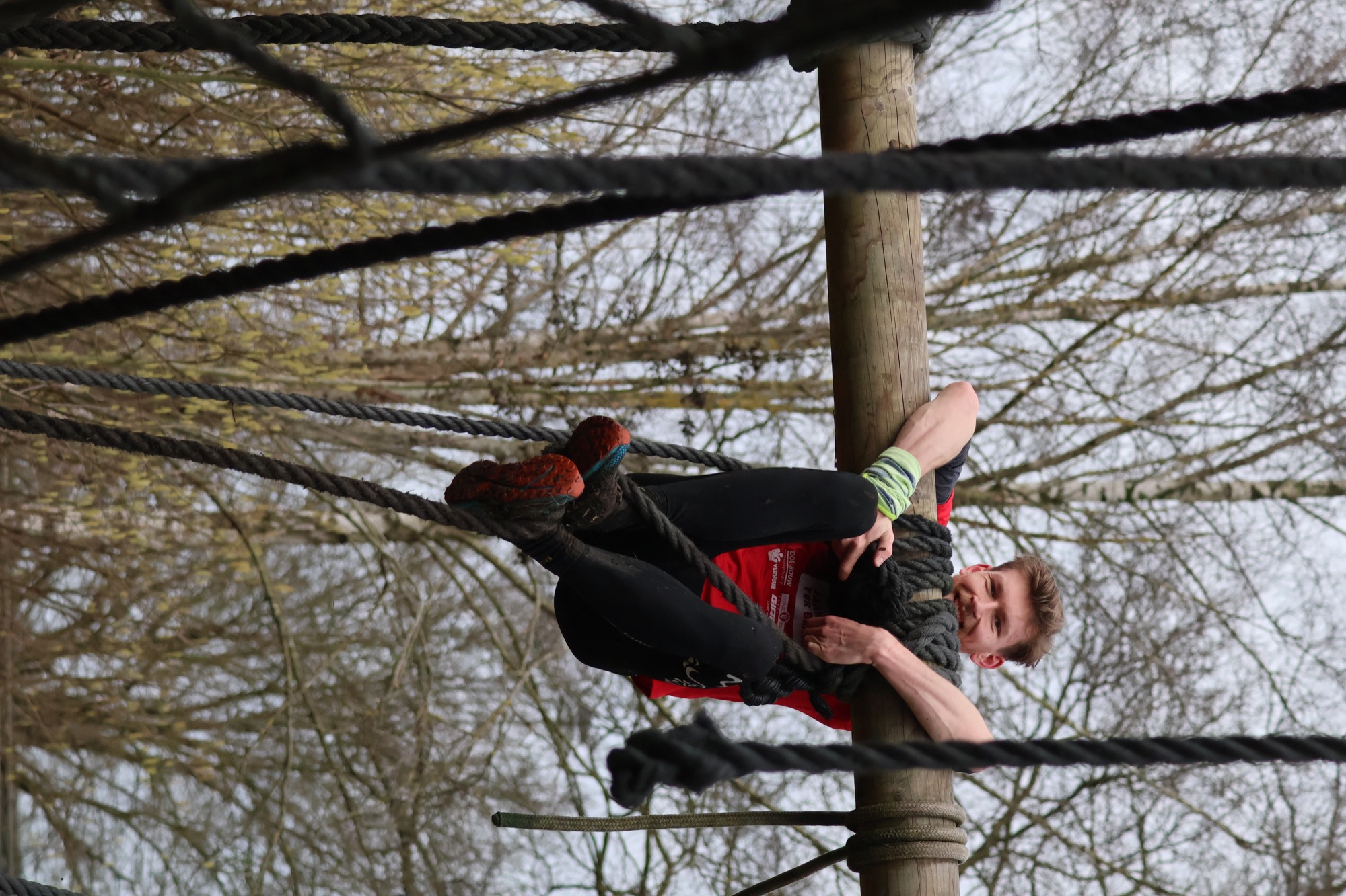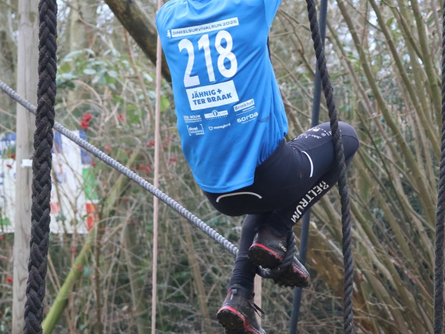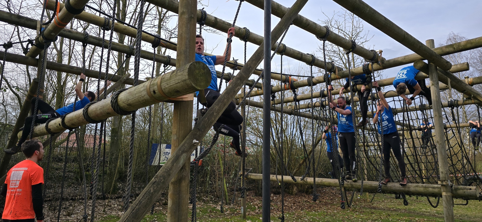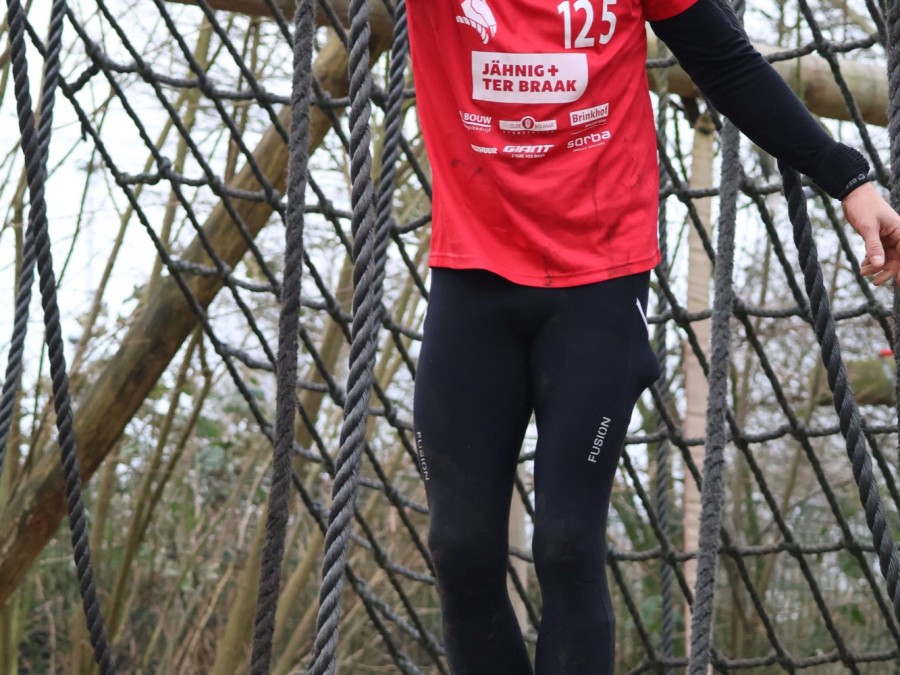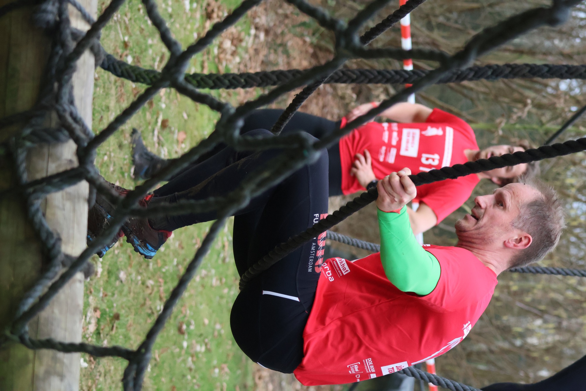 Deelnemers klimmen via het inklimtouw over de balk. Via het slappe touw klimmen ze naar het schuine net. Vervolgens klimmen ze over het schuine net door.