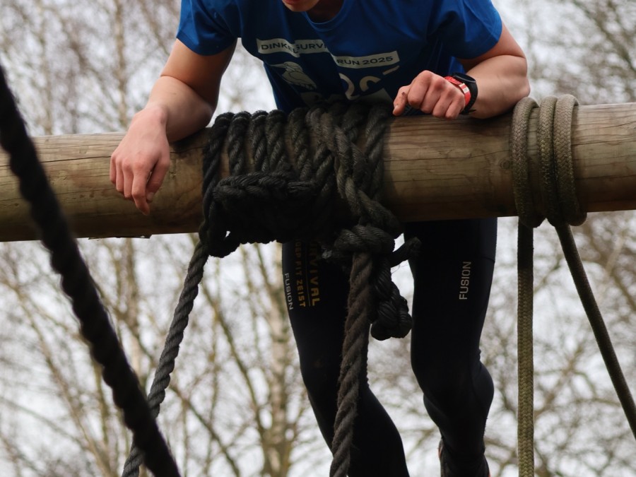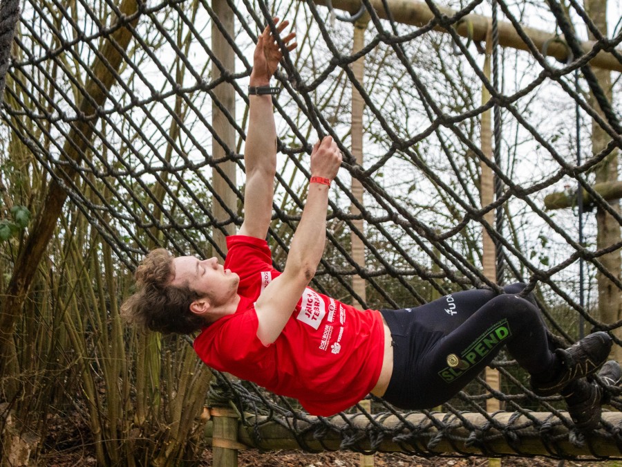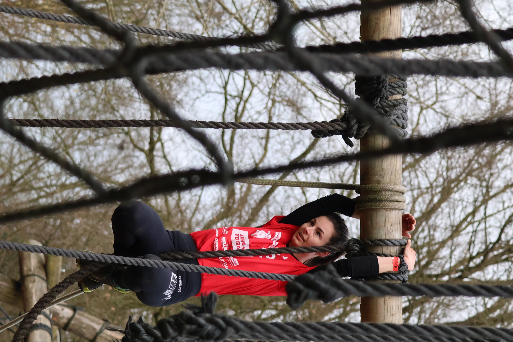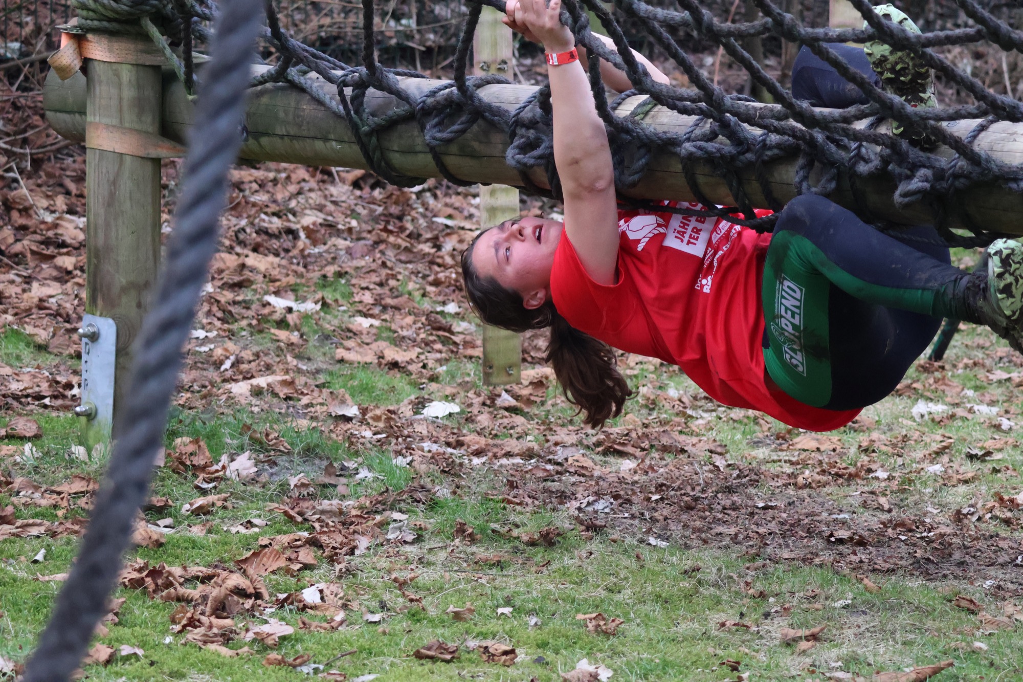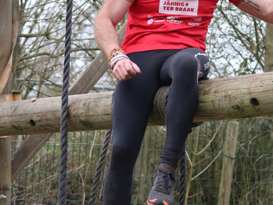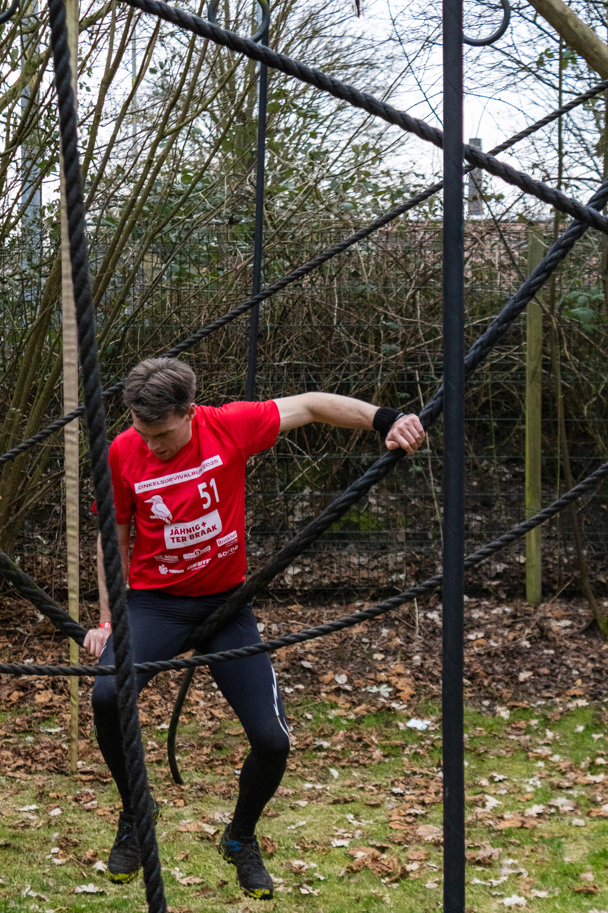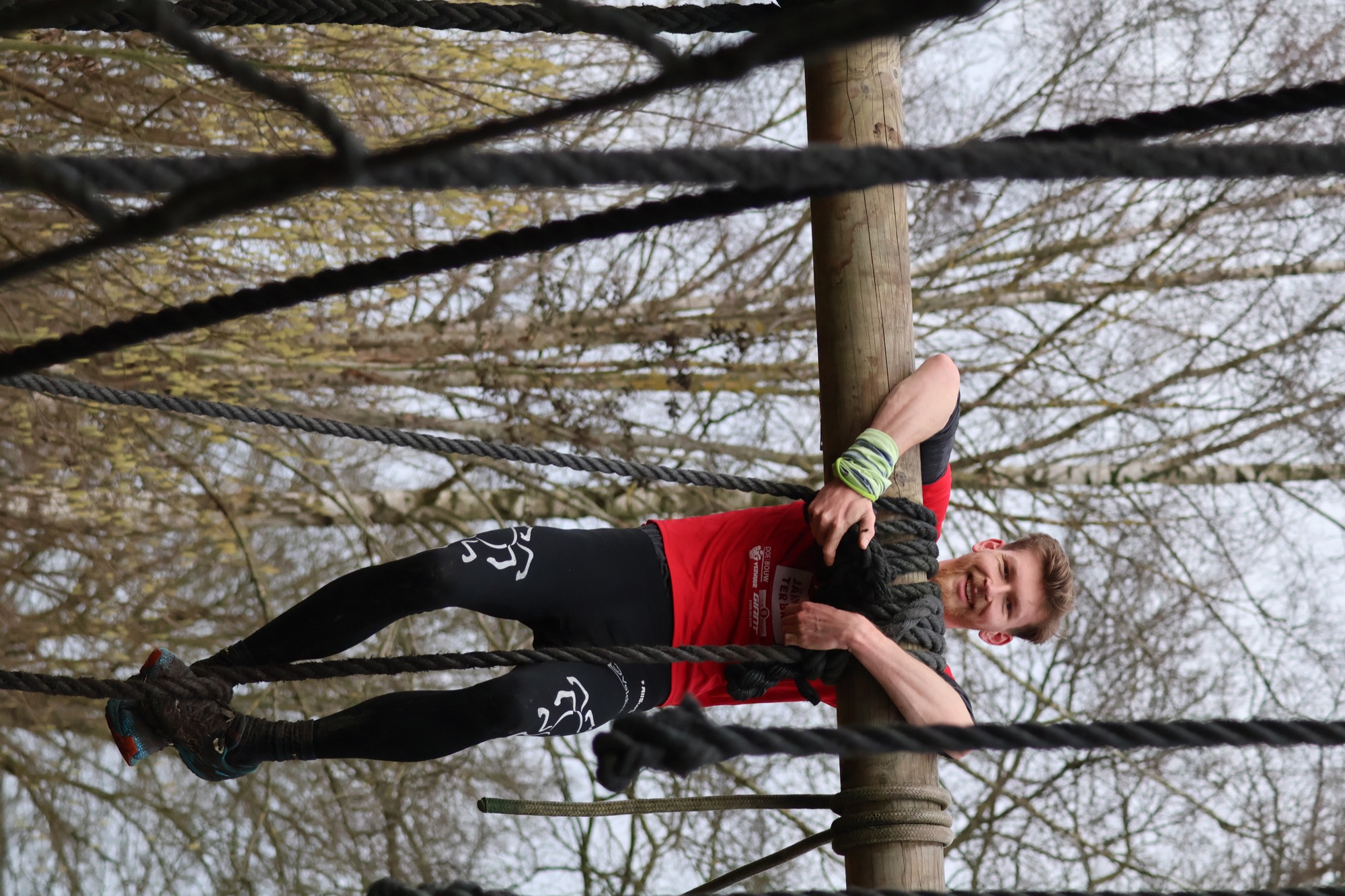 Deelnemers klimmen via het inklimtouw over de balk. Via het slappe touw klimmen ze naar het schuine net. Vervolgens klimmen ze over het schuine net door.