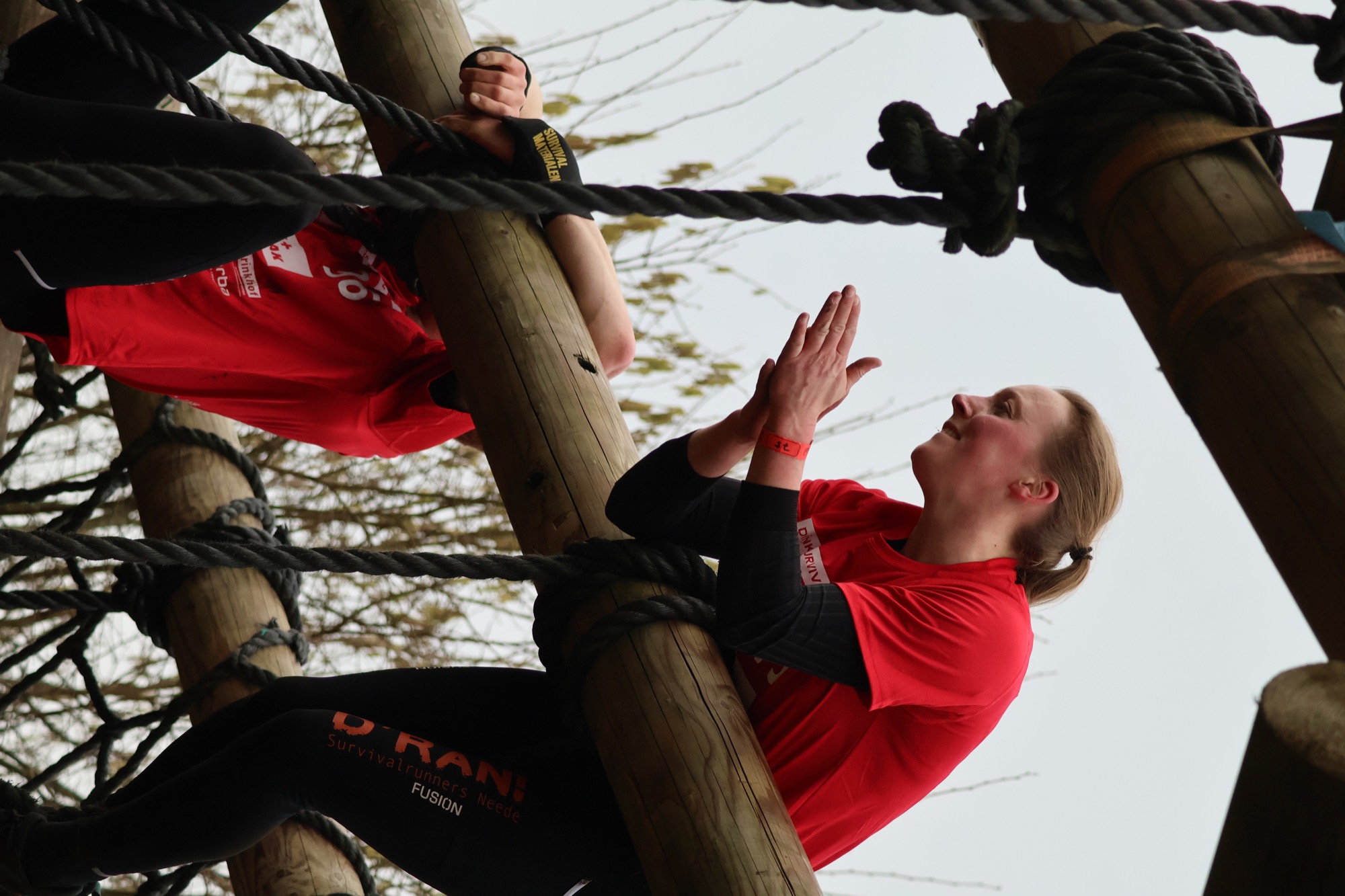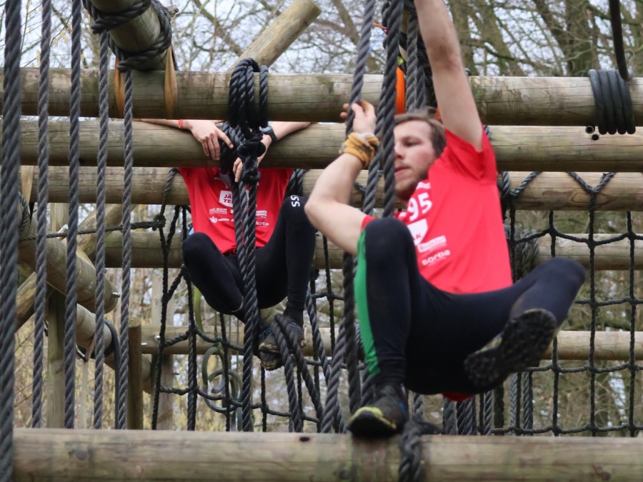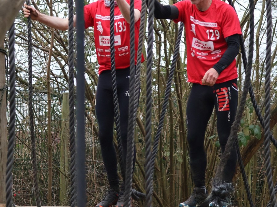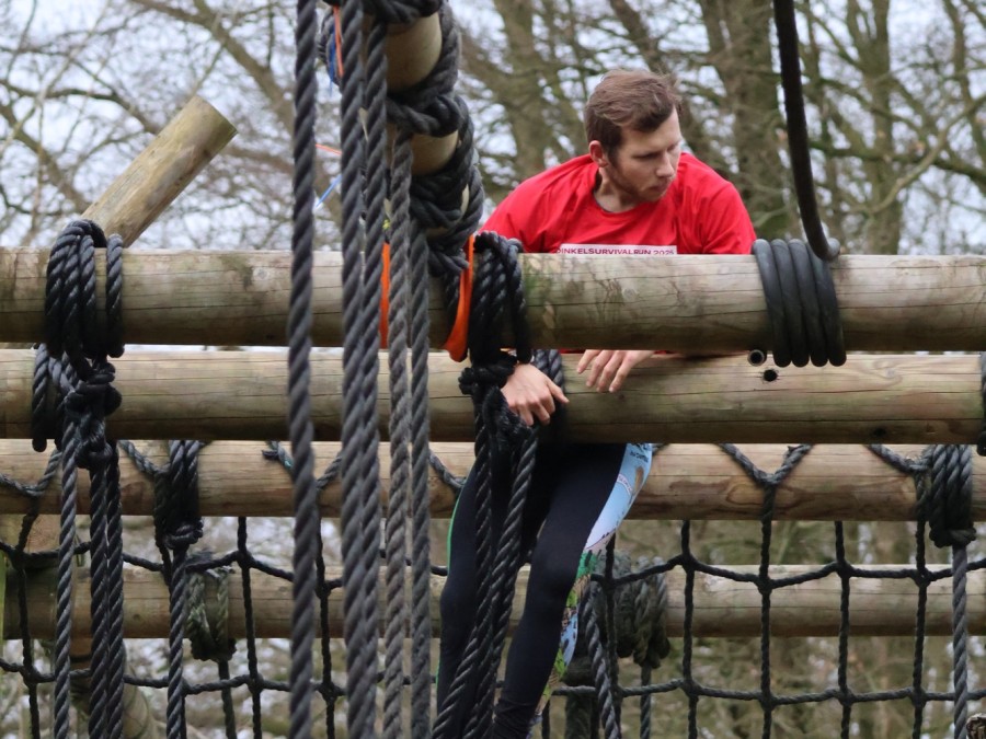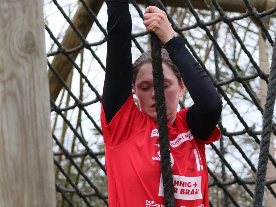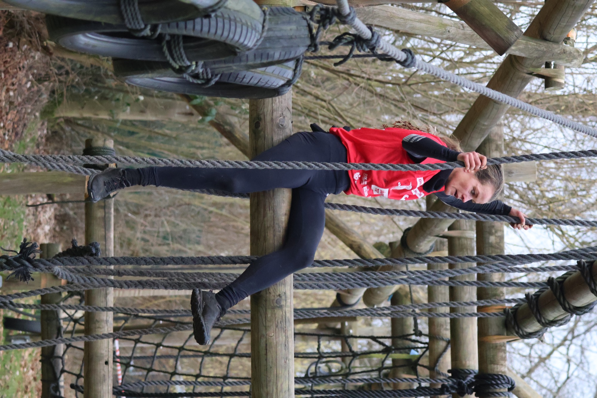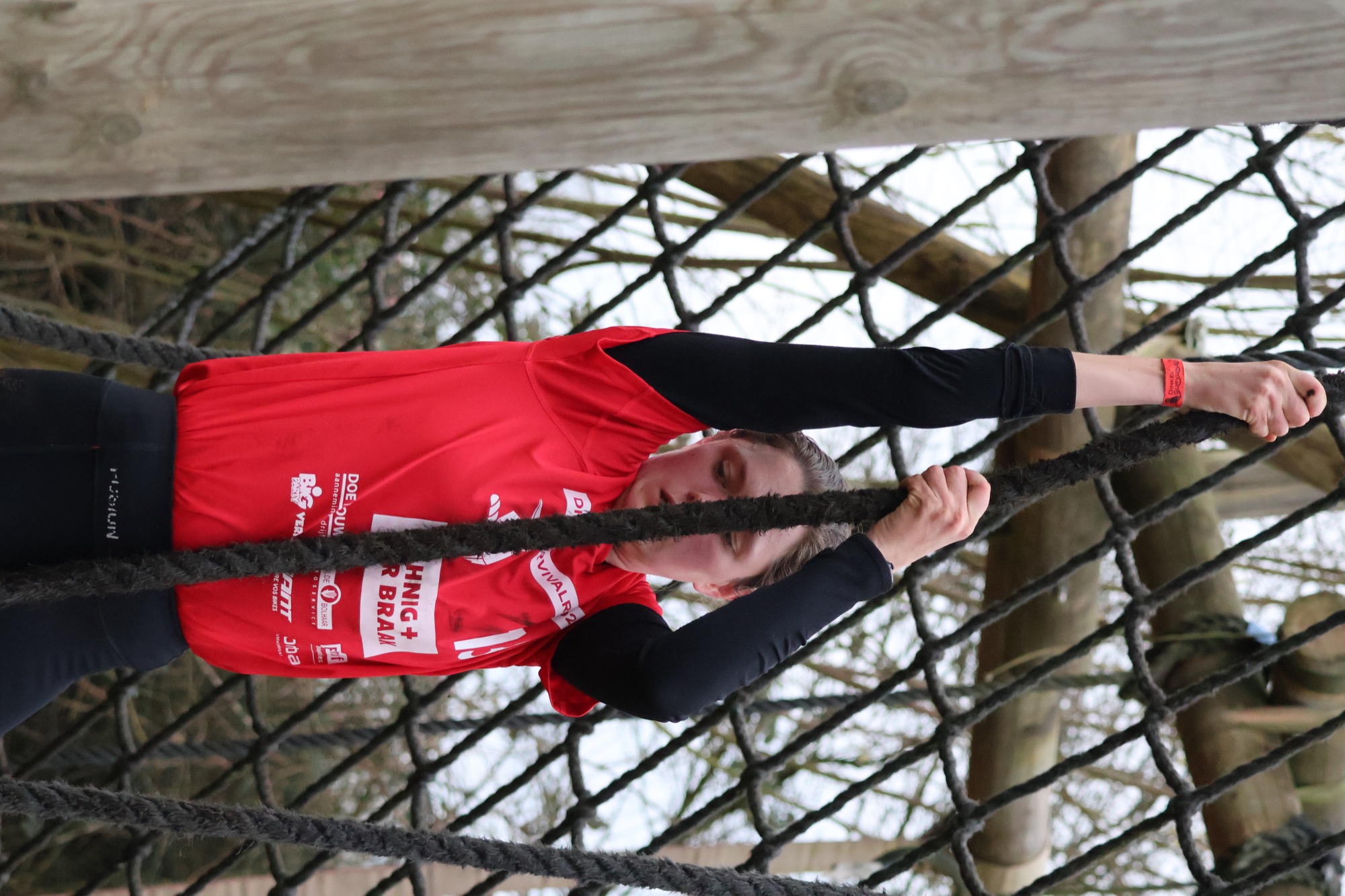 Deelnemers klimmen via het inklimtouw over de balk. Via het slappe touw klimmen ze naar het schuine net. Vervolgens klimmen ze over het schuine net door.