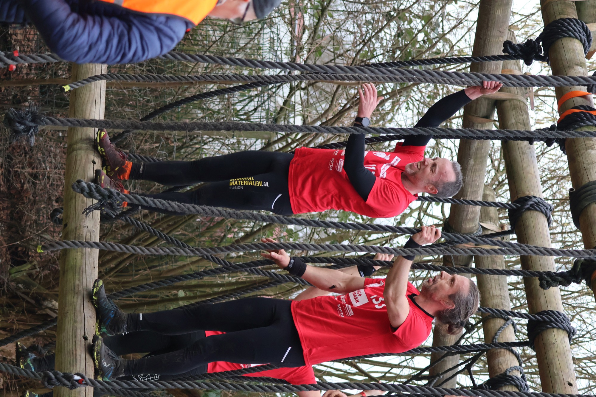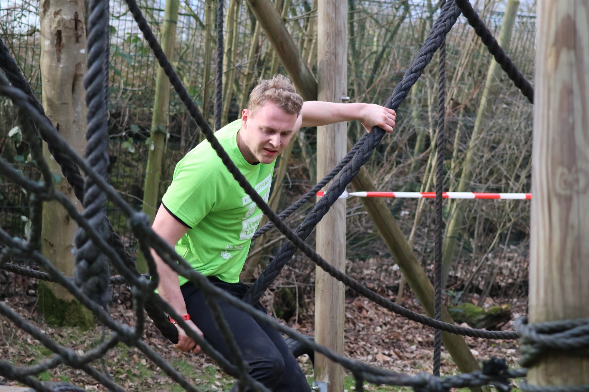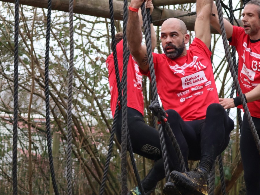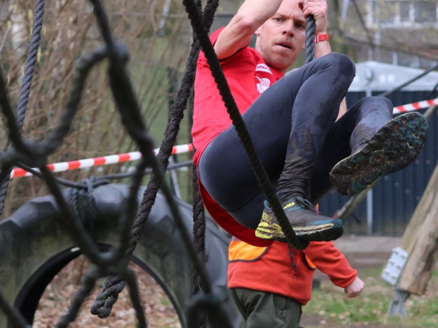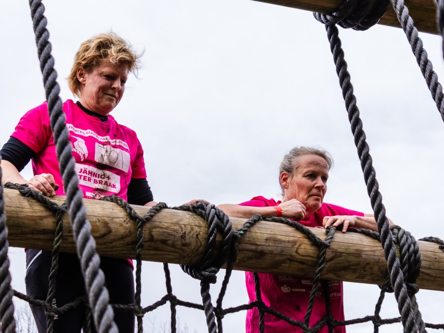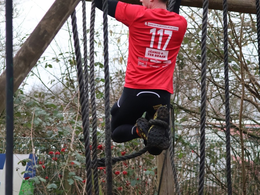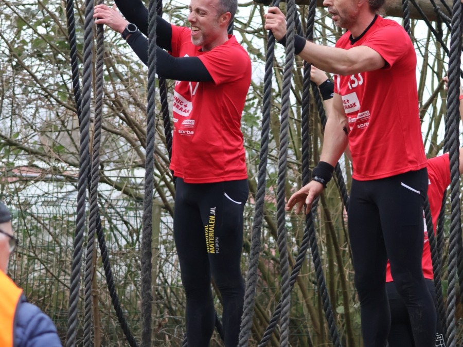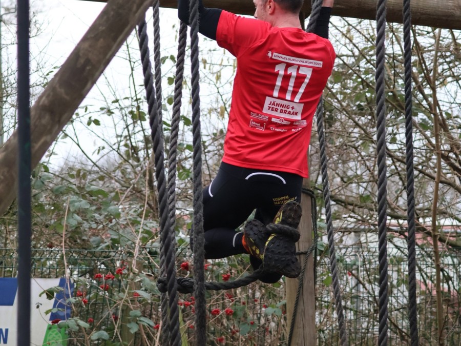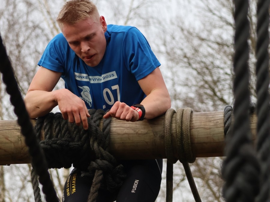 Deelnemers klimmen via het inklimtouw over de balk. Via het slappe touw klimmen ze naar het schuine net. Vervolgens klimmen ze over het schuine net door.